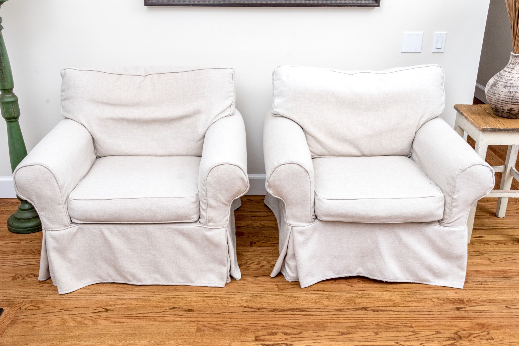 A delightful pair of Mitchell Gold for Pottery Barn slipcovered club chairs sporting comfortable, oversized forms with wide, straight backs, rolled arms, and skirts lending a touch of elegance to the designs. Features loose back and seat cushions in a wonderfully neutral light taupe-gray fabric perfect for incorporating into a variety of interior aesthetics.