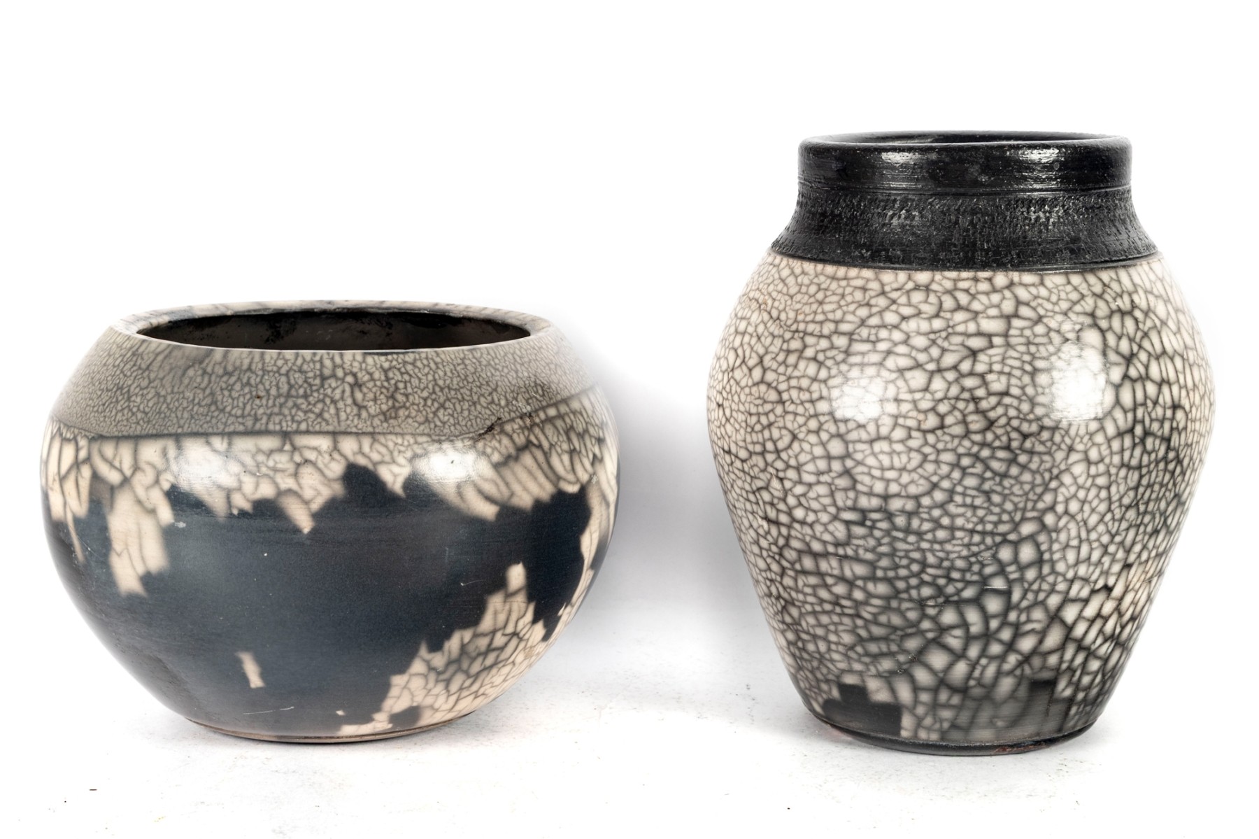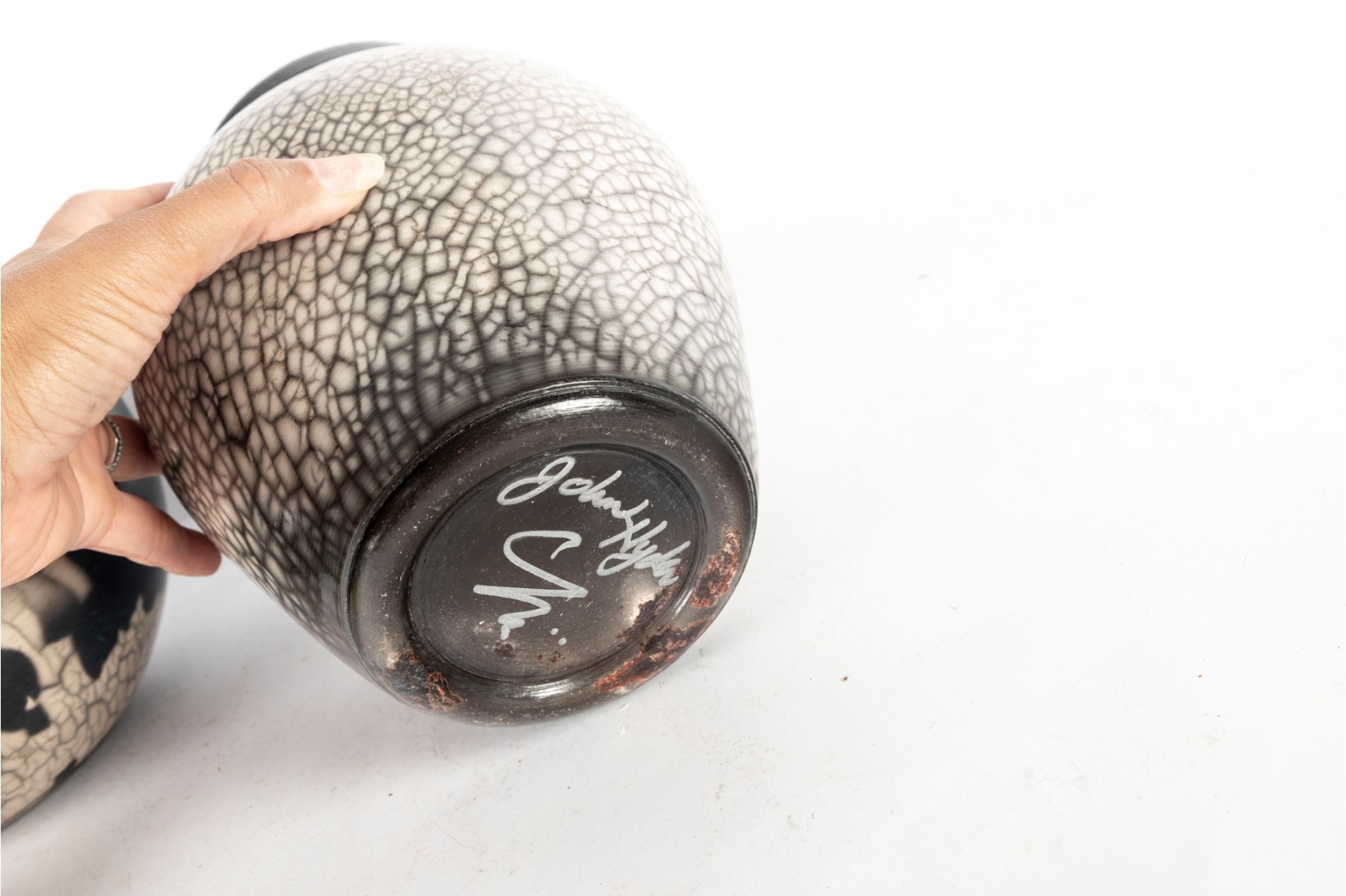 A striking pair of hand-thrown stoneware vases executed in the naked raku technique, characterized by their softly burnished surfaces and delicate smoke patterns. Each piece is individually signed by the artist on the base.
