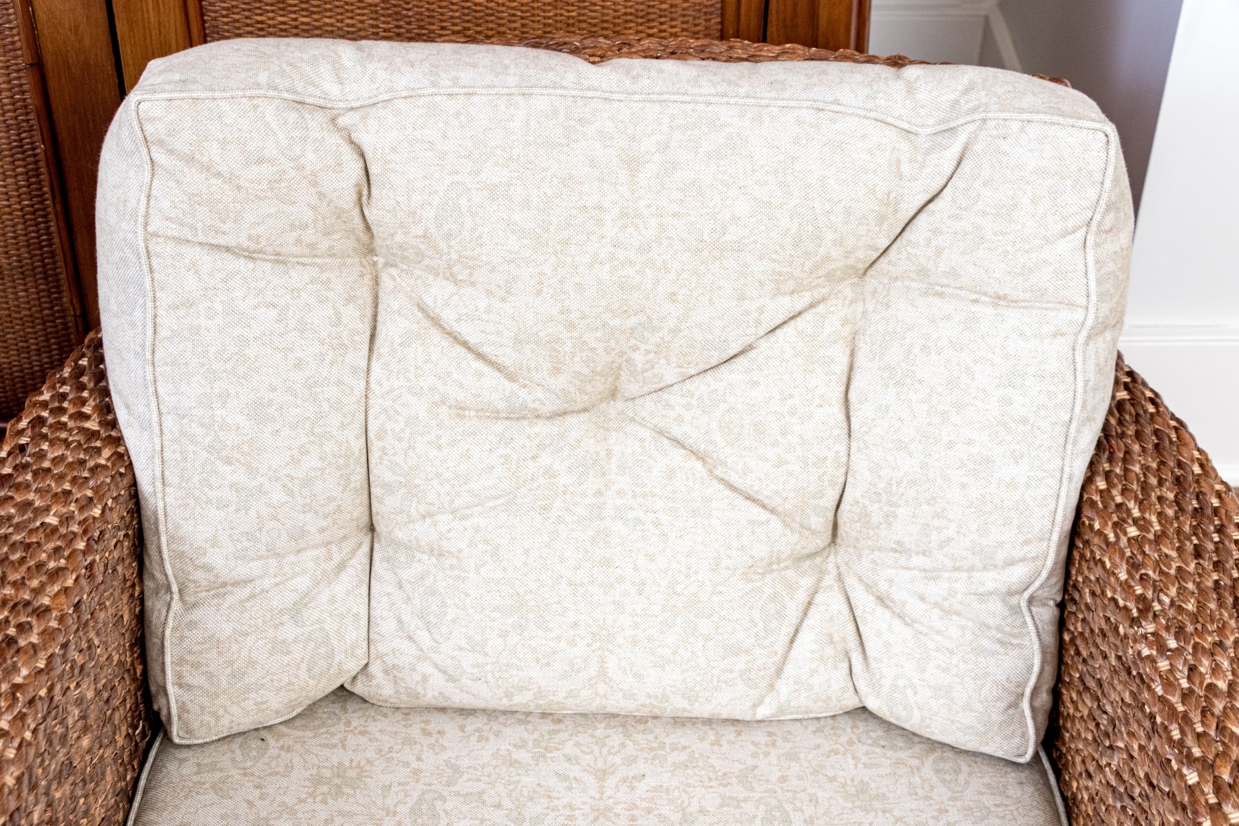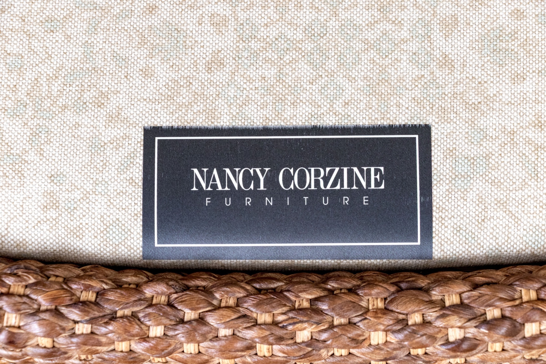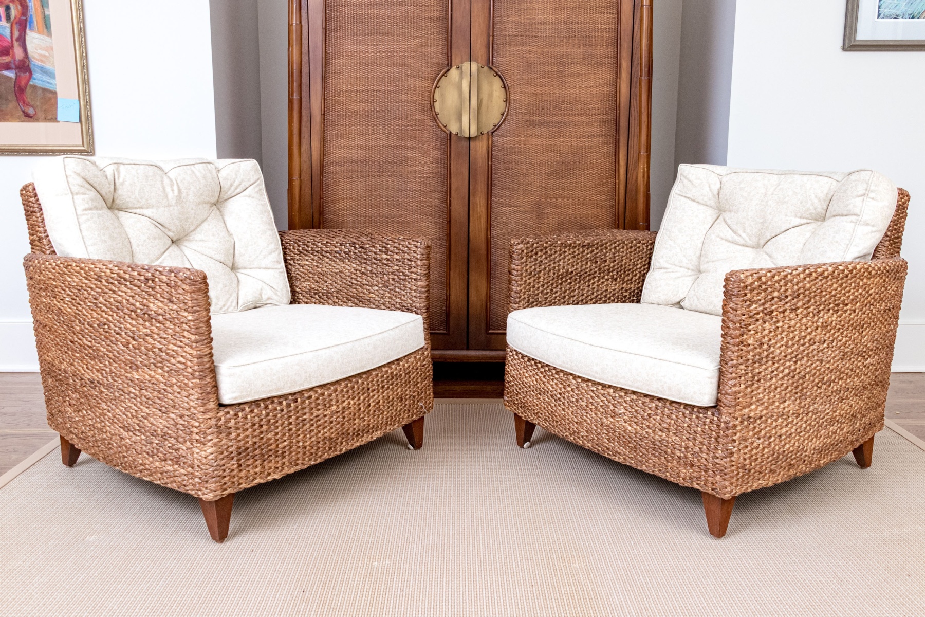 A fabulous pair of Nancy Corzine armchairs each standing on four carved and nicely stained legs with chic woven rattan frames including arms and seat backs. The chairs each have fitted, loose upholstered seat cushions and loose upholstered seat back cushions with button tufting to seat backs.