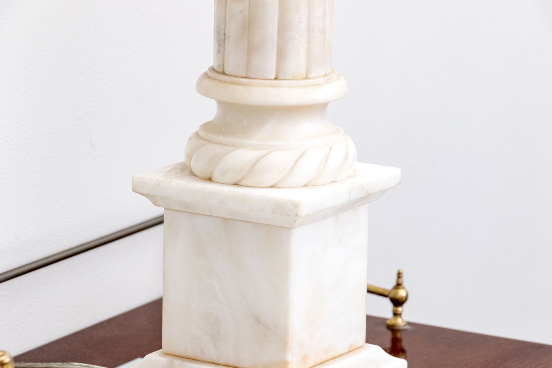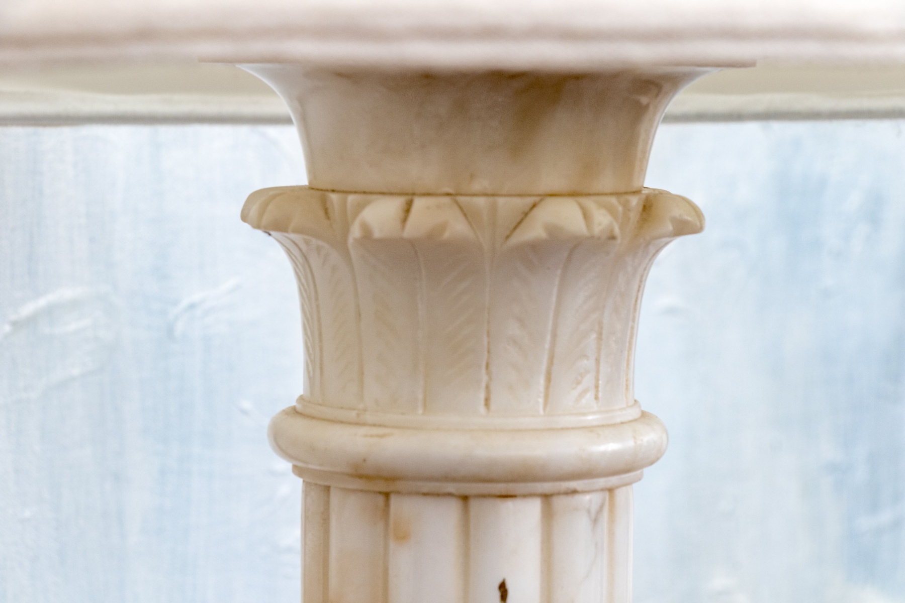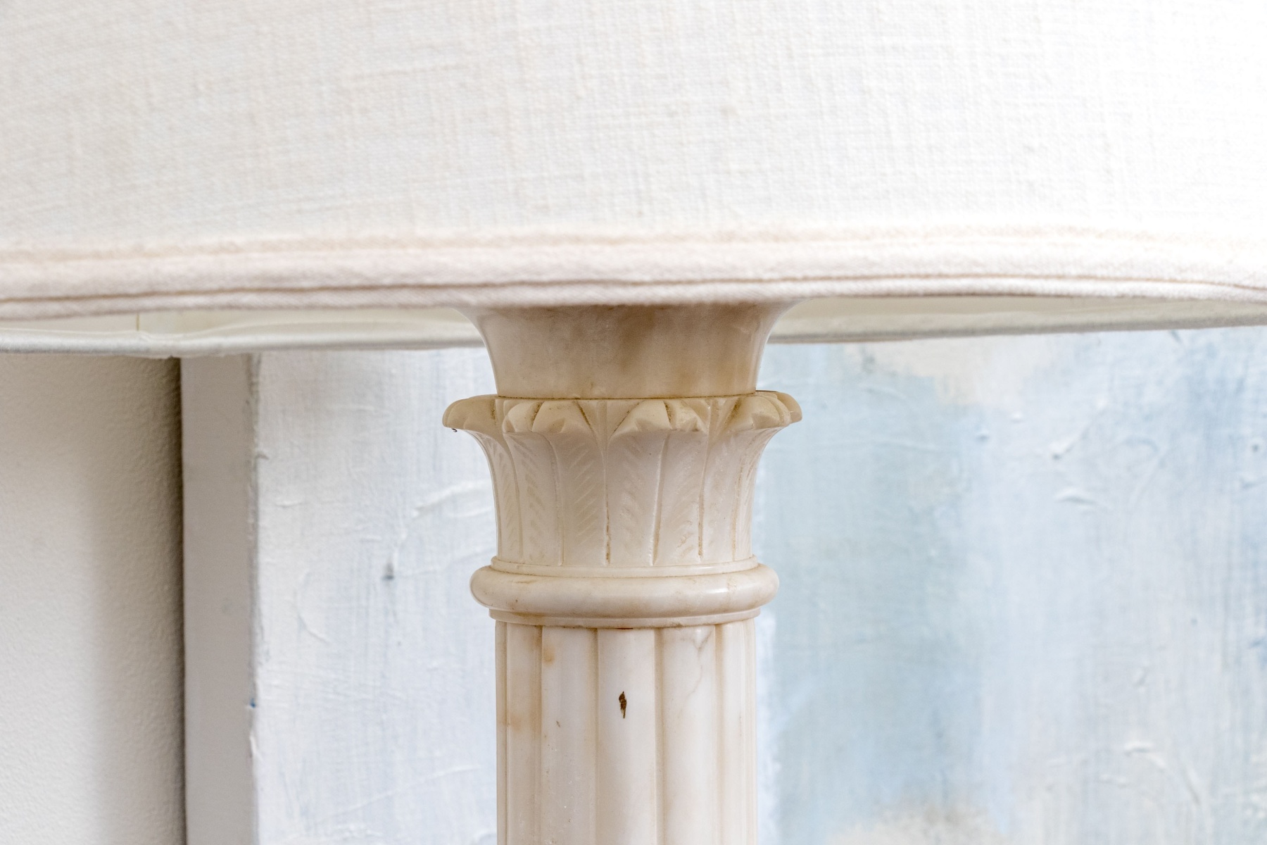 A stately pair of table lamps showcasing carved white alabaster columns. The columns feature petaled capitals and fluted shafts, leading to circular feet with braided trims before finishing with elegant square plinths. Surmounted by white empire/drum shades.