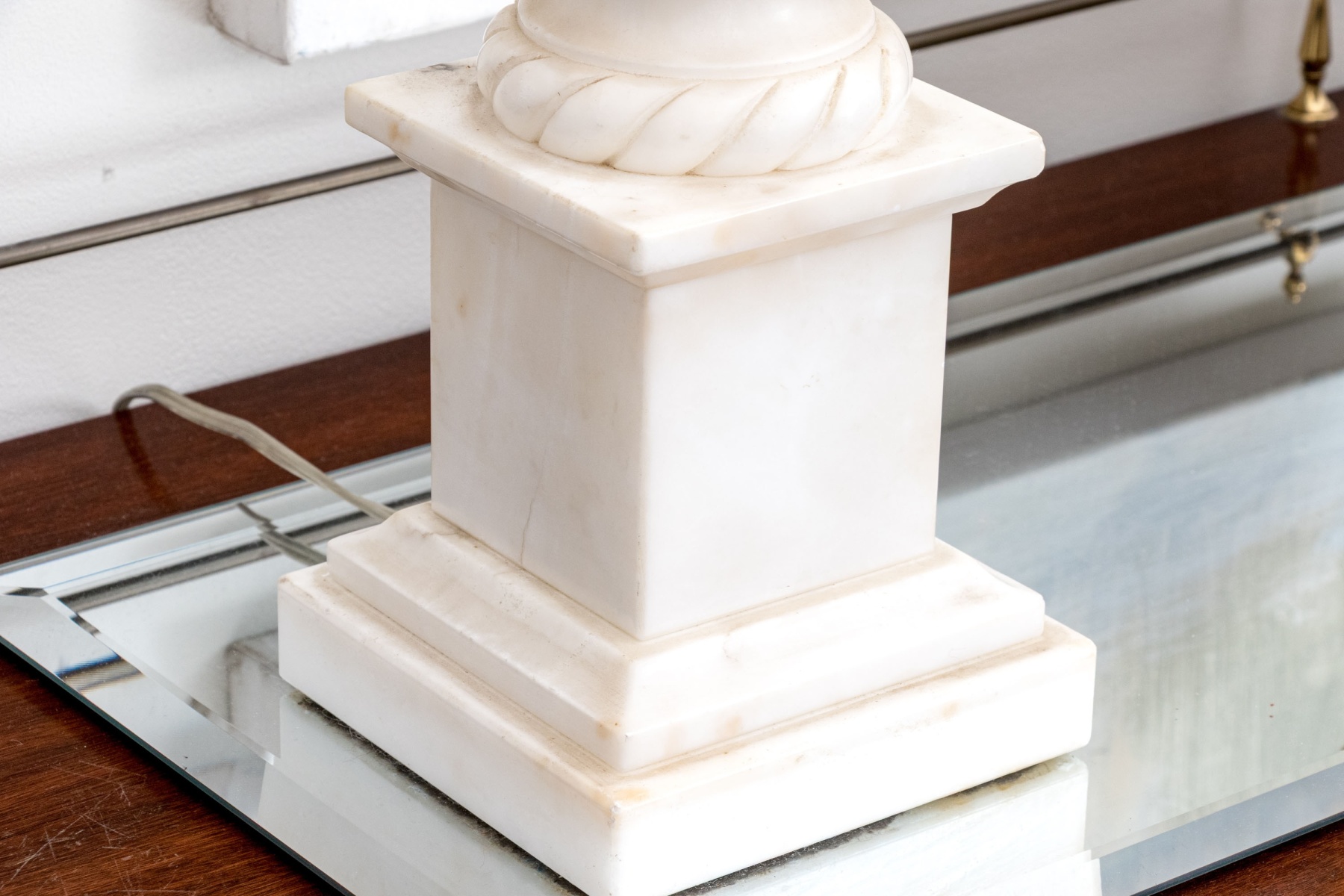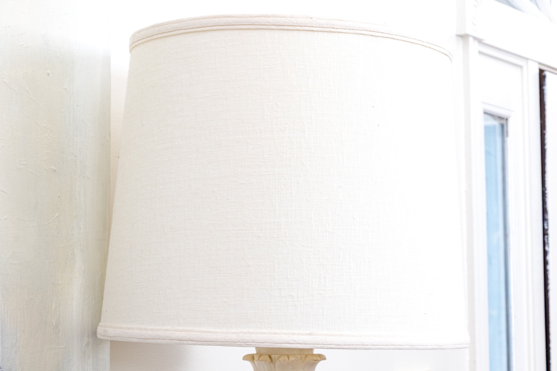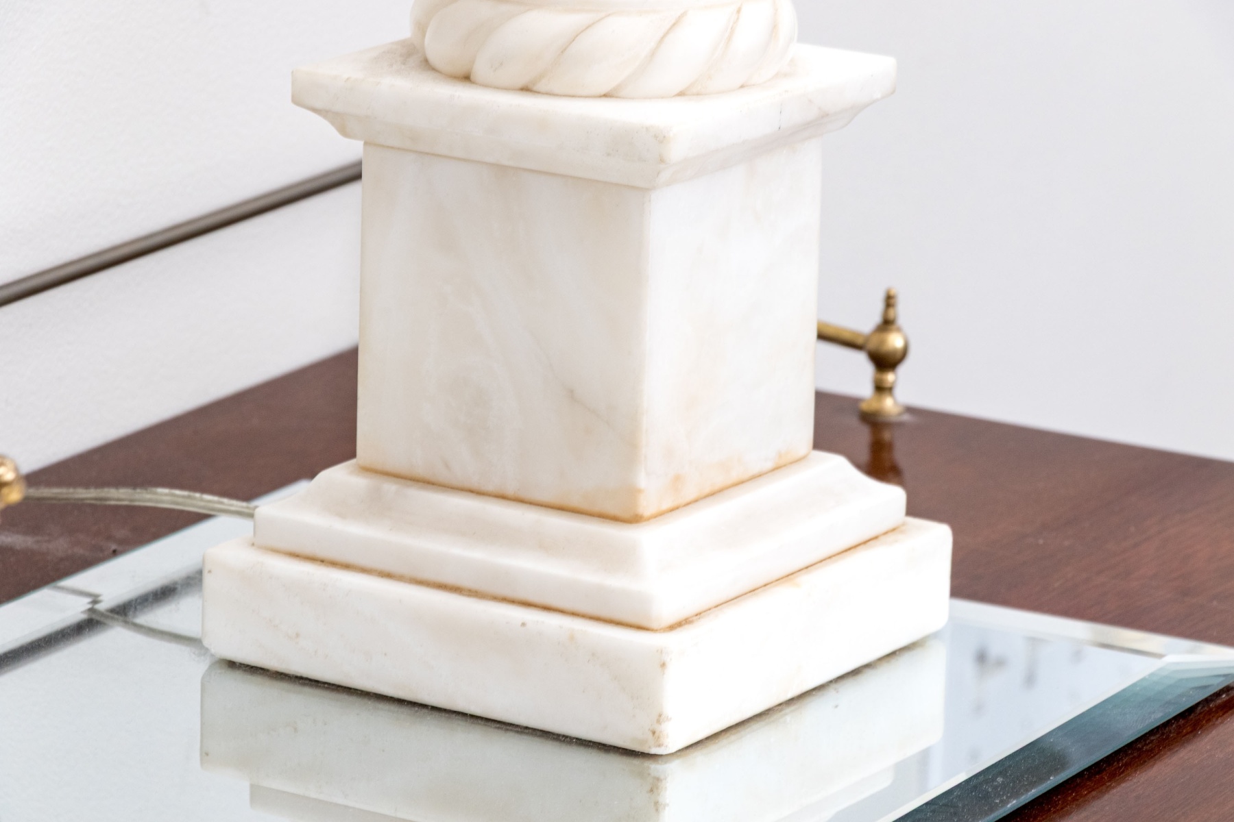 A stately pair of table lamps showcasing carved white alabaster columns. The columns feature petaled capitals and fluted shafts, leading to circular feet with braided trims before finishing with elegant square plinths. Surmounted by white empire/drum shades.