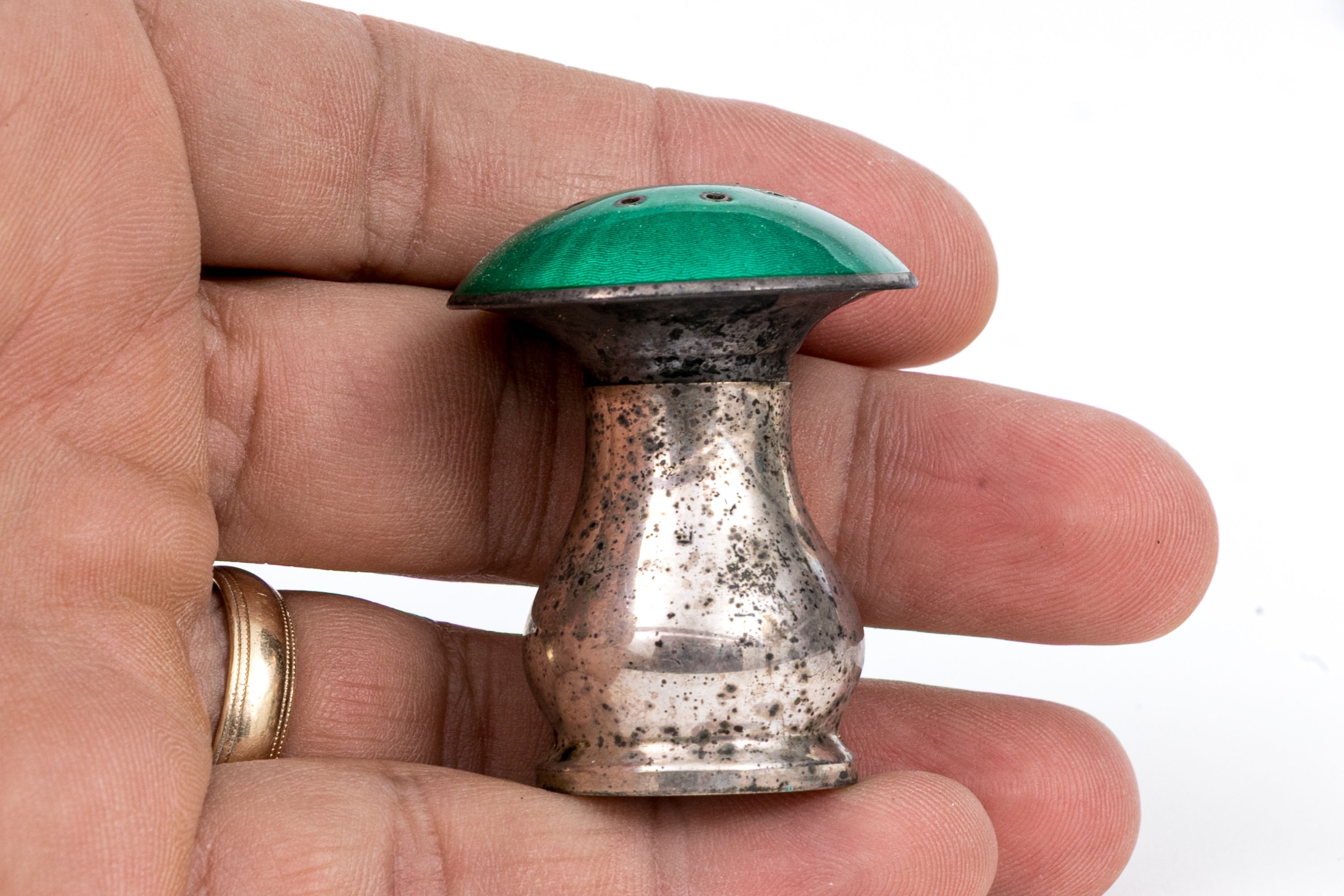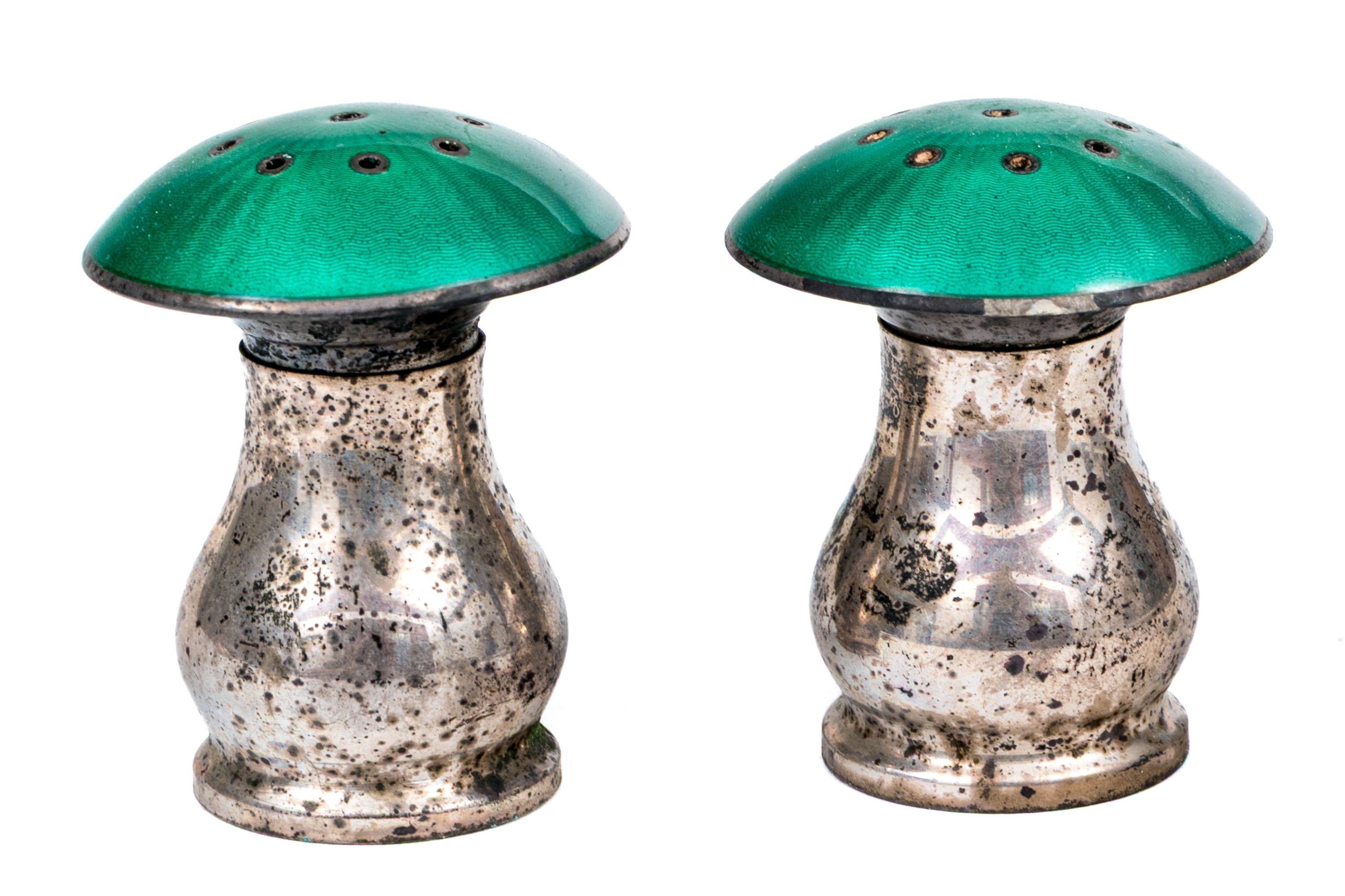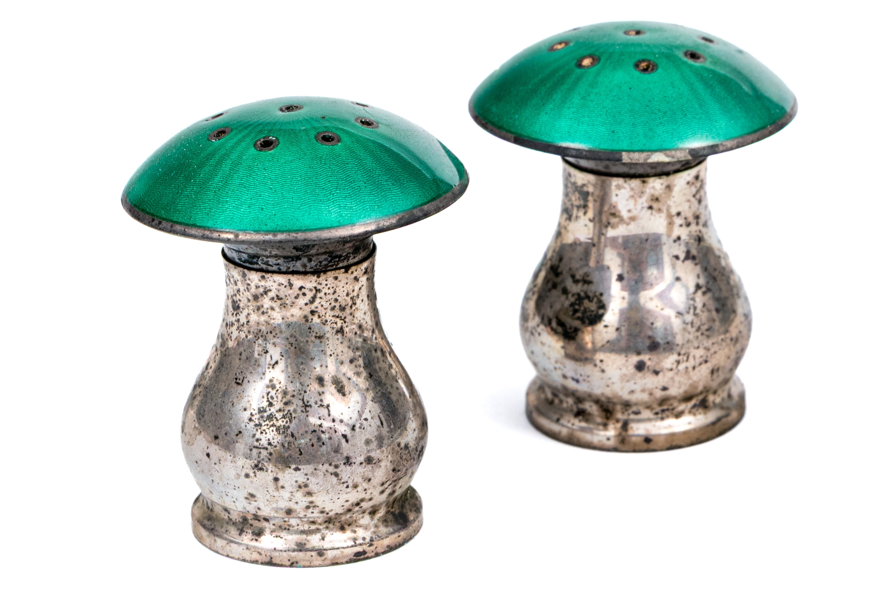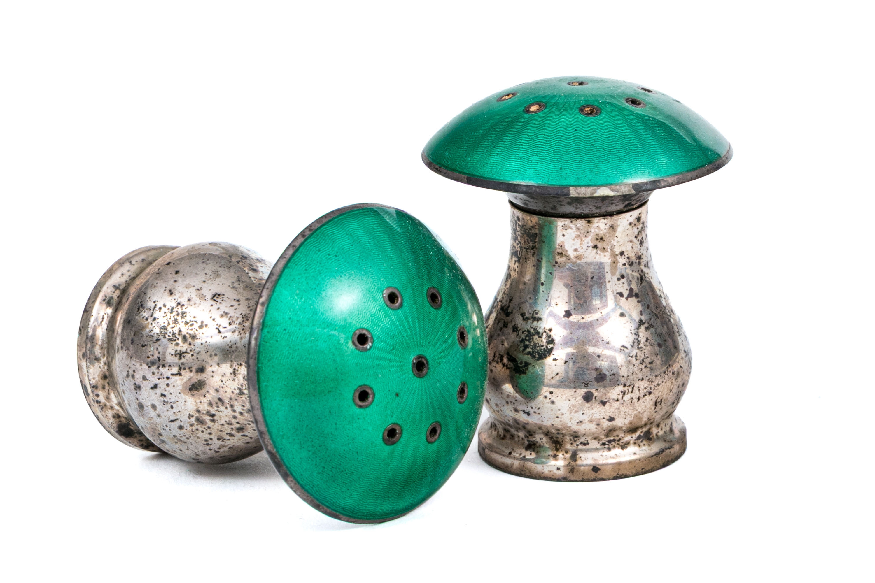 A delightful pair of Norwegian sterling silver mushroom form salt and pepper casters with rich teal green enameled caps over pear form bodies on round feet. Marked underfoot.