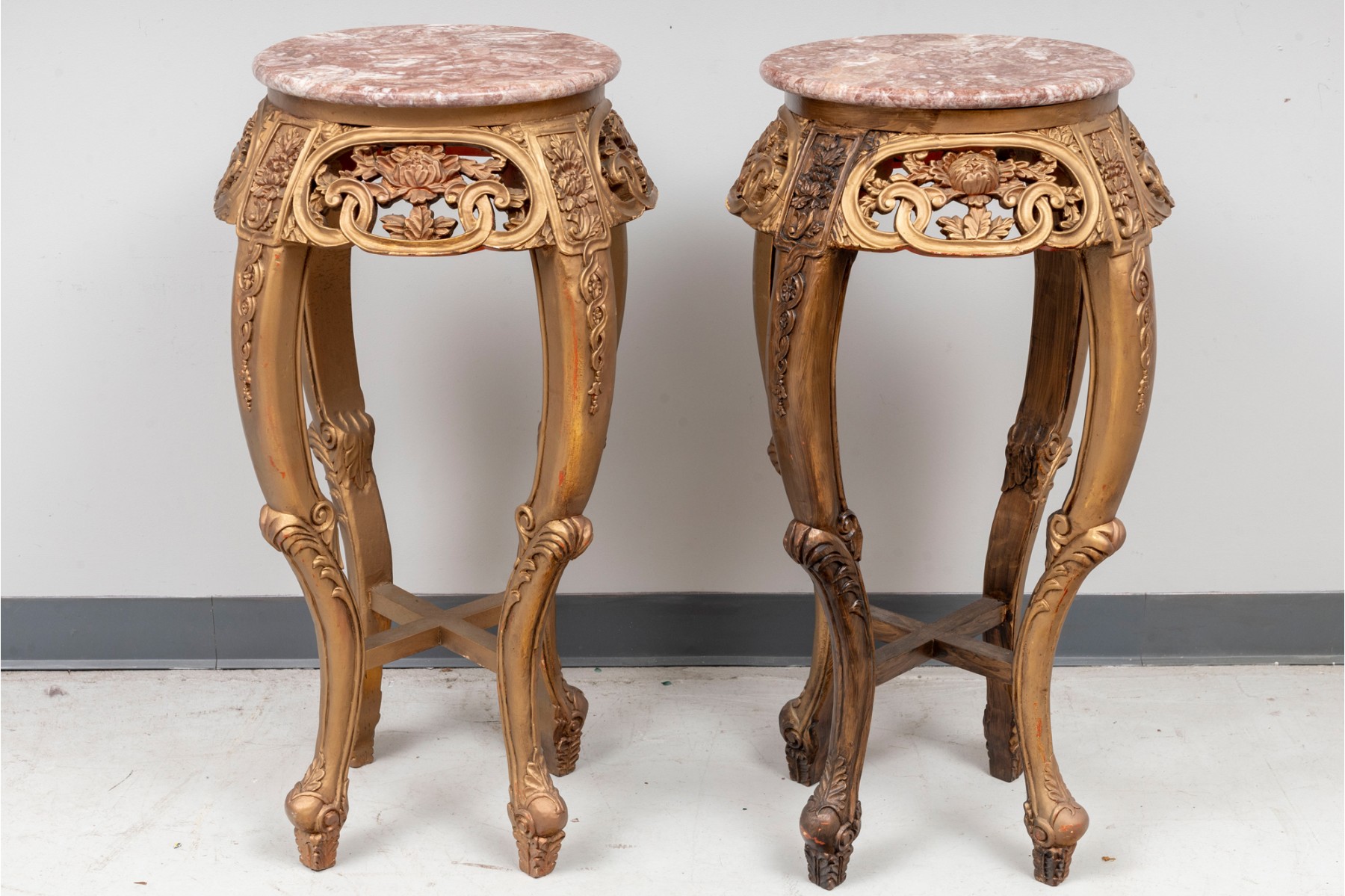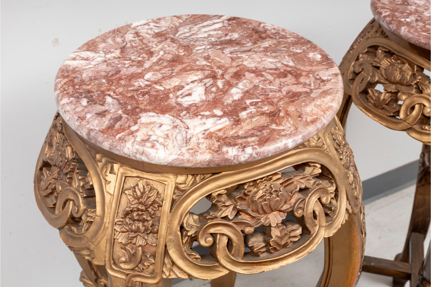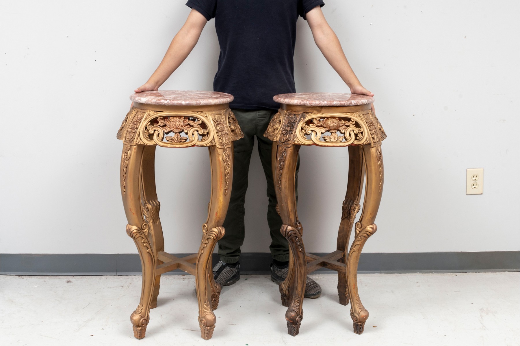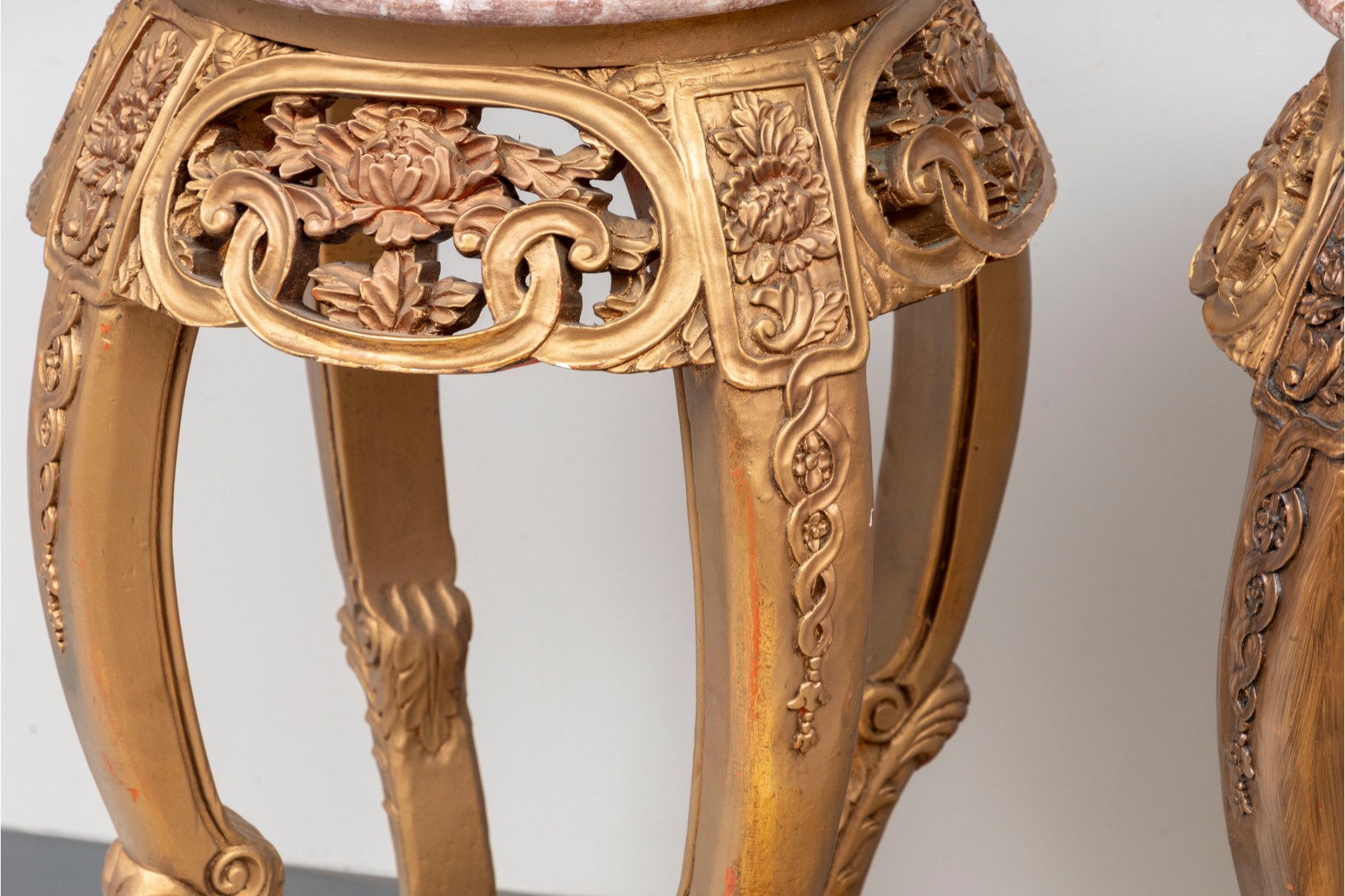 Two hand-carved wood pedestal stands with removable marble surface tops. The frieze and apron are carved in leaf and floral motifs, as are the legs which are bound via cross stretchers.