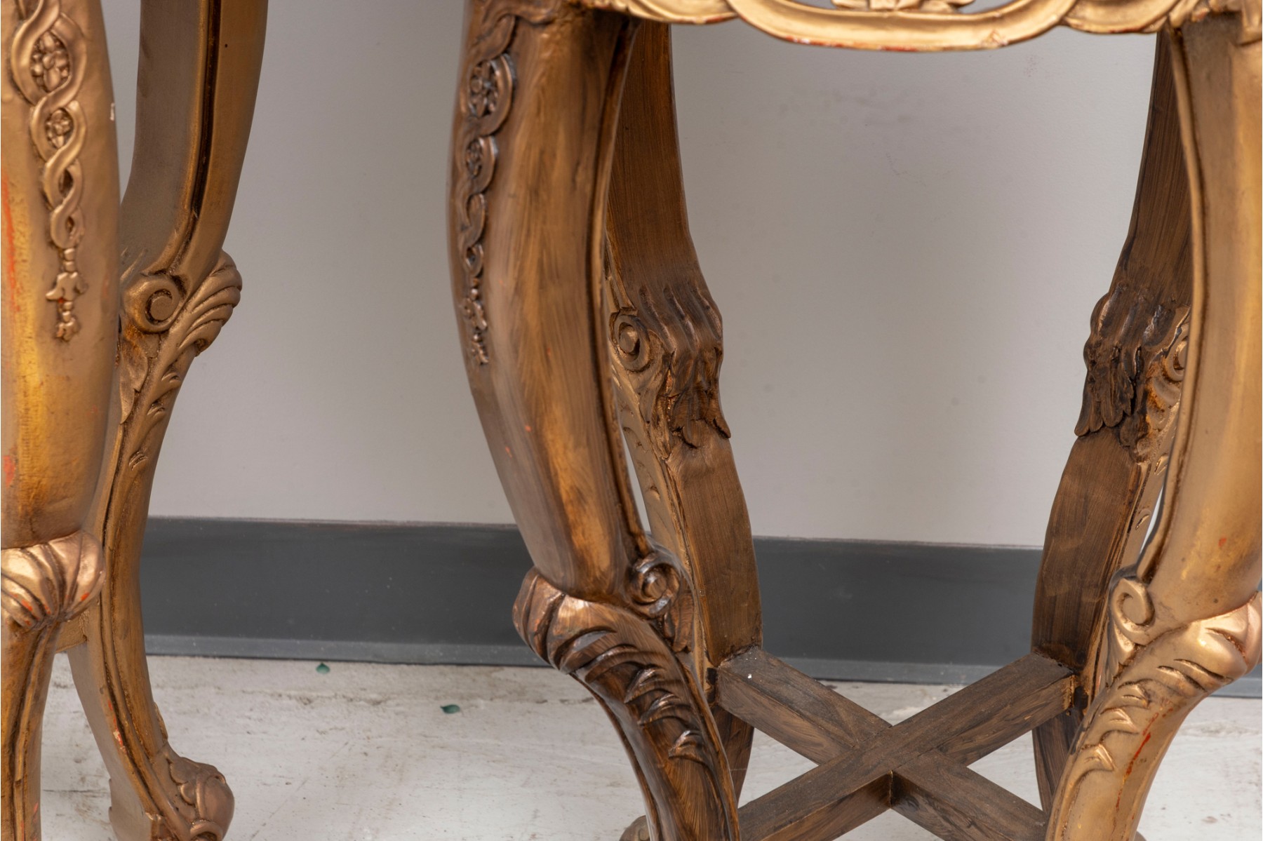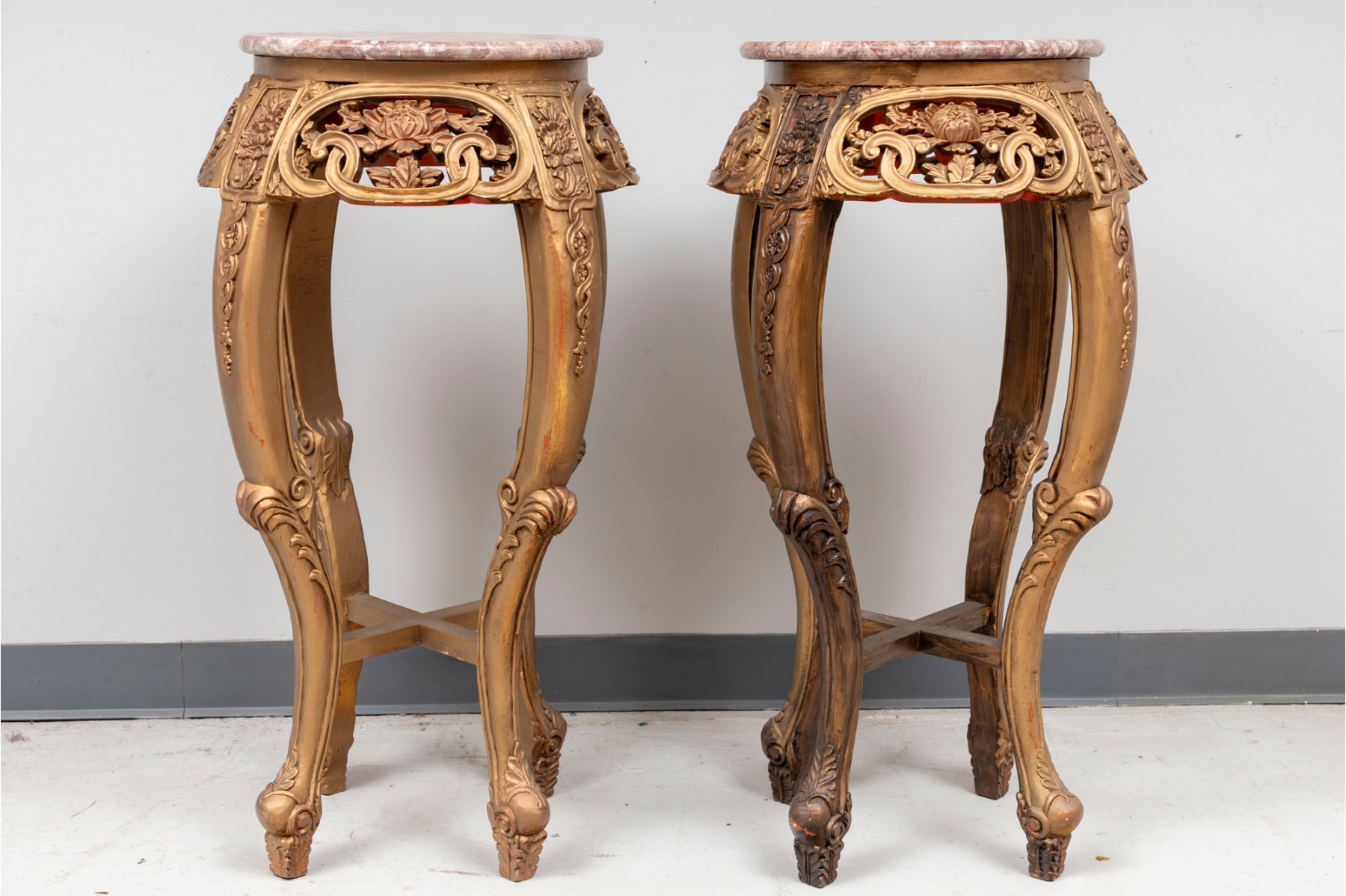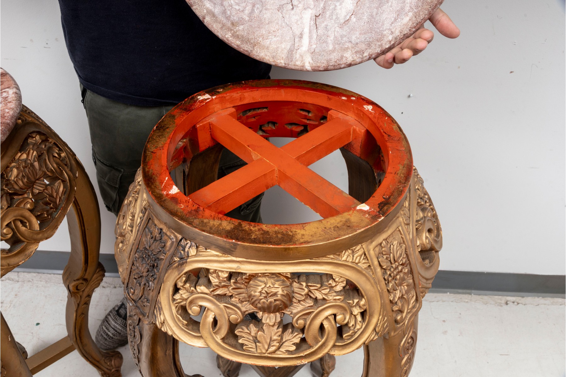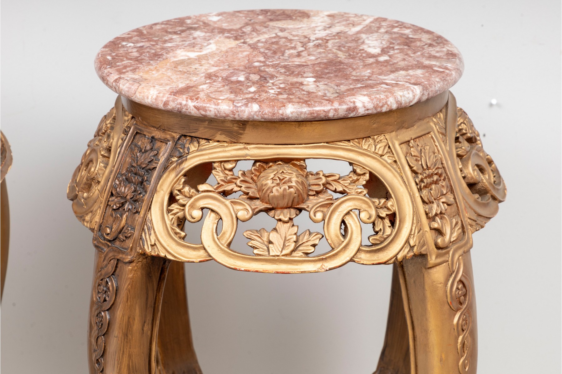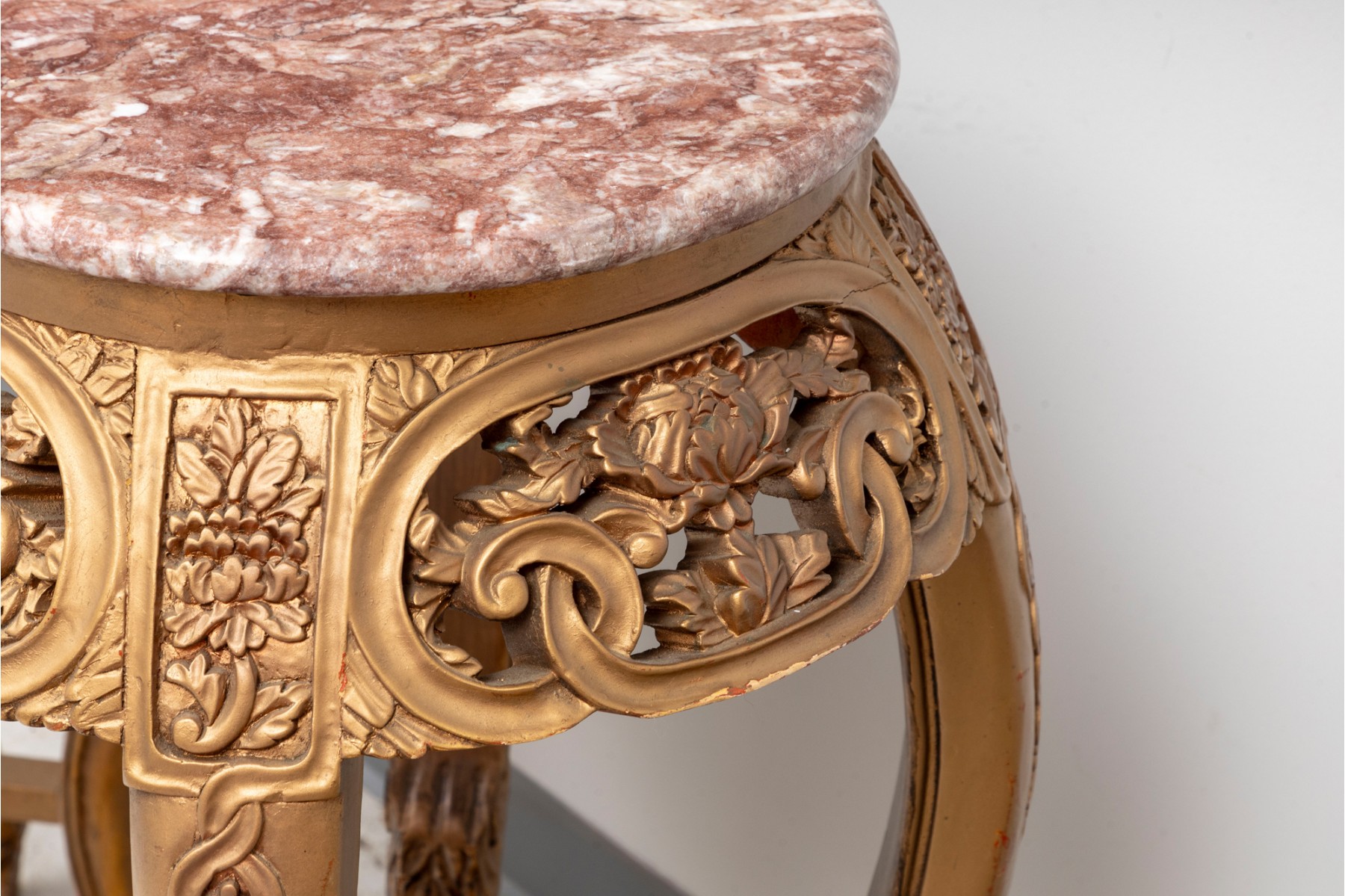 Two hand-carved wood pedestal stands with removable marble surface tops. The frieze and apron are carved in leaf and floral motifs, as are the legs which are bound via cross stretchers.