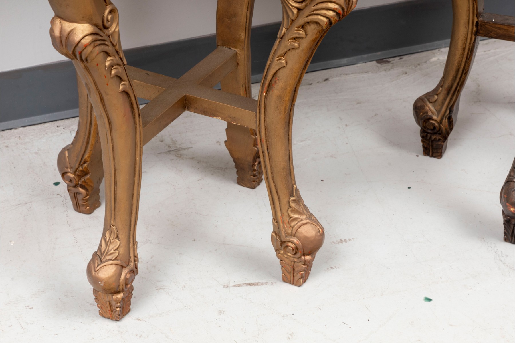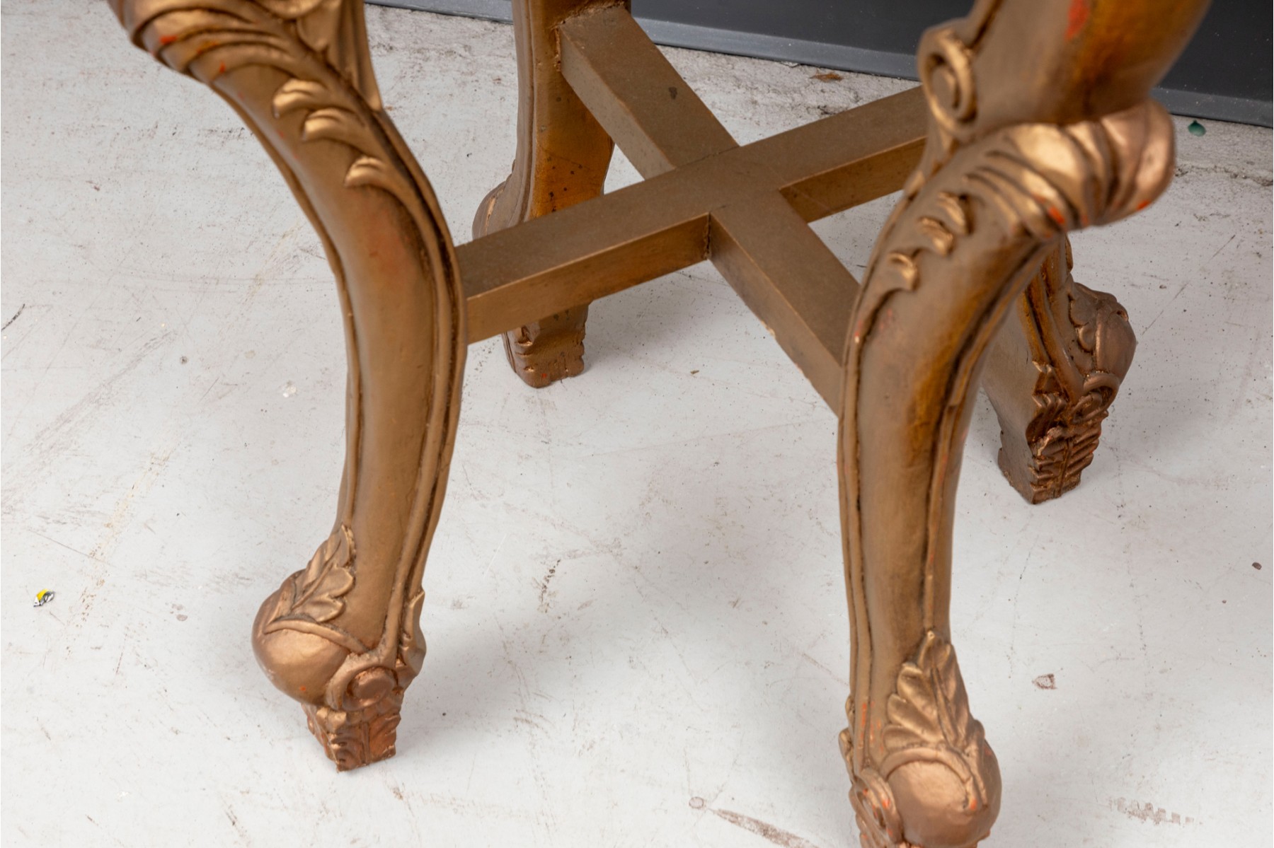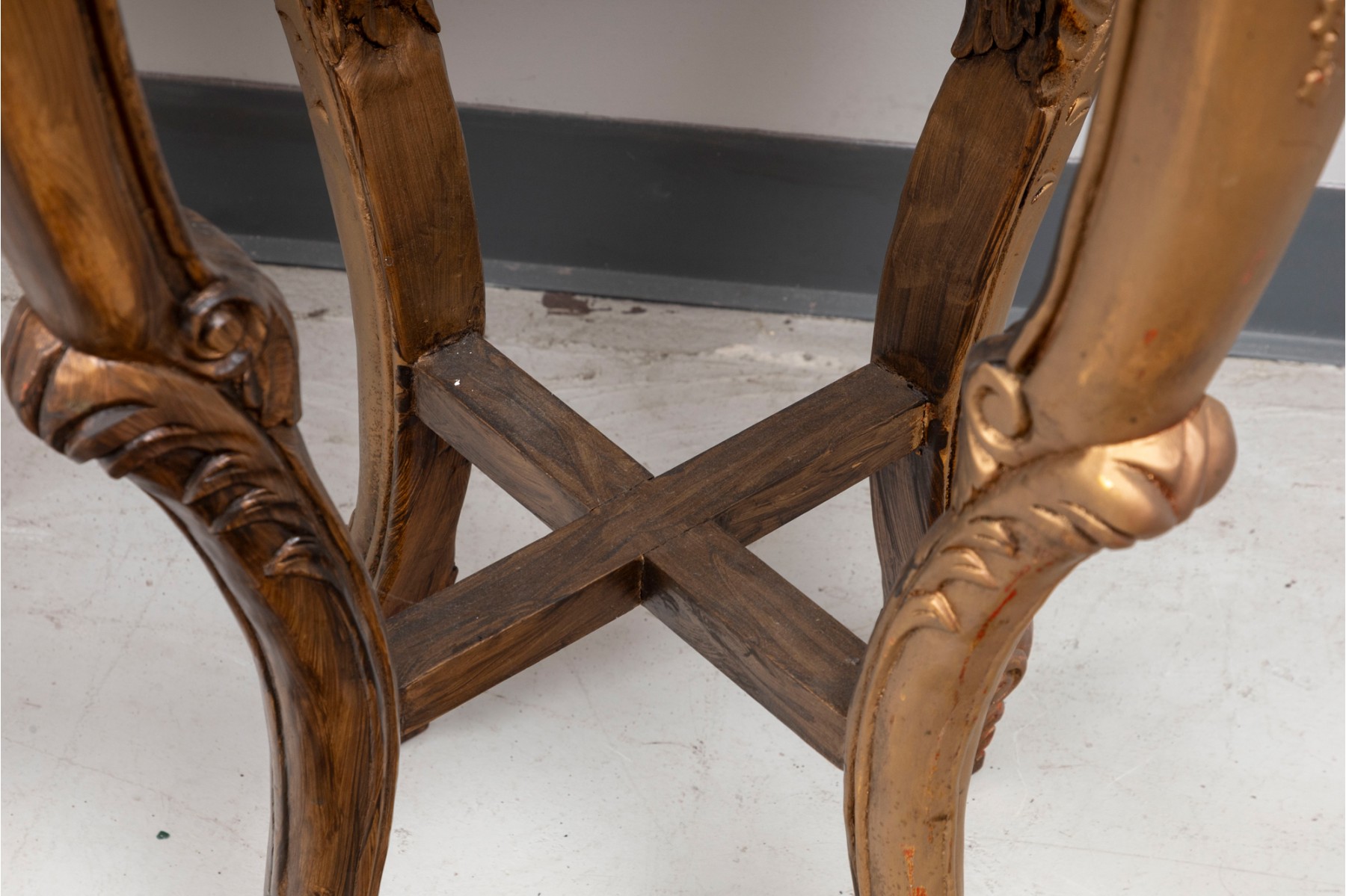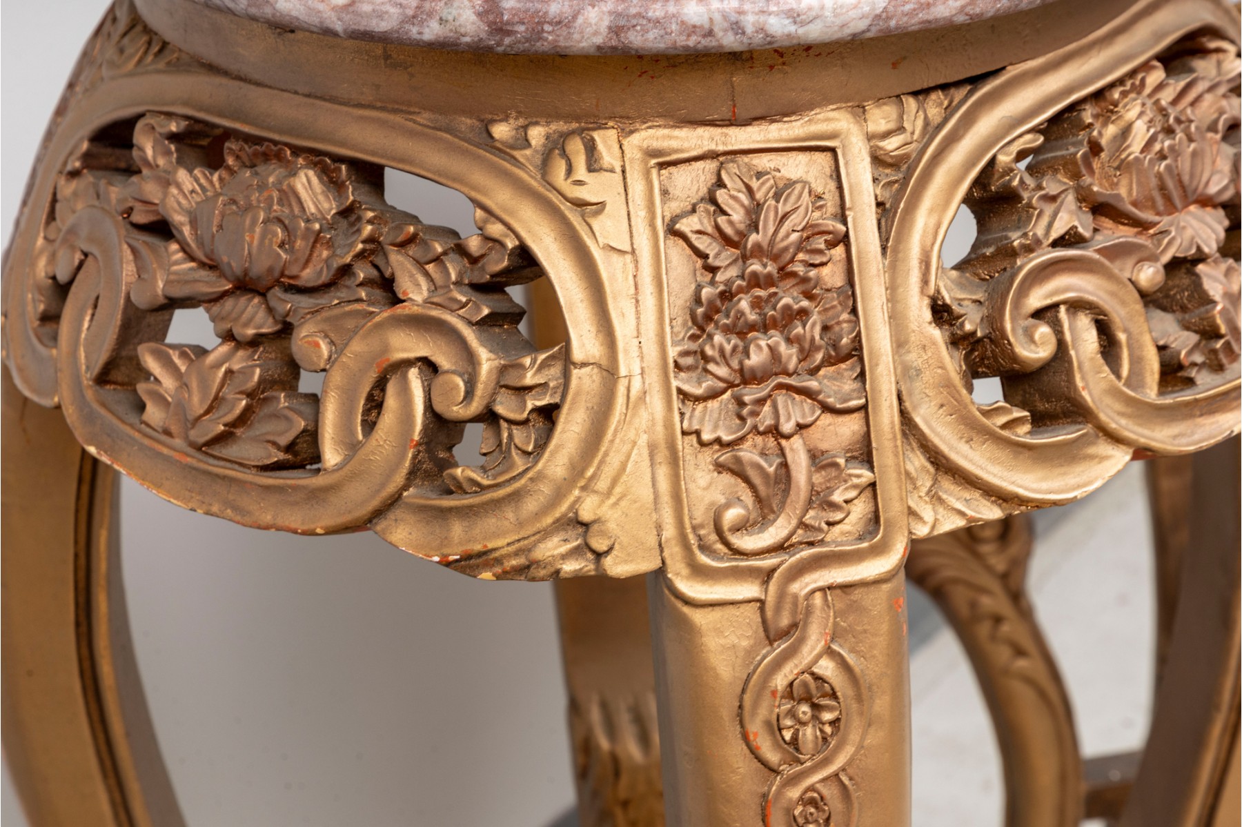 Two hand-carved wood pedestal stands with removable marble surface tops. The frieze and apron are carved in leaf and floral motifs, as are the legs which are bound via cross stretchers.