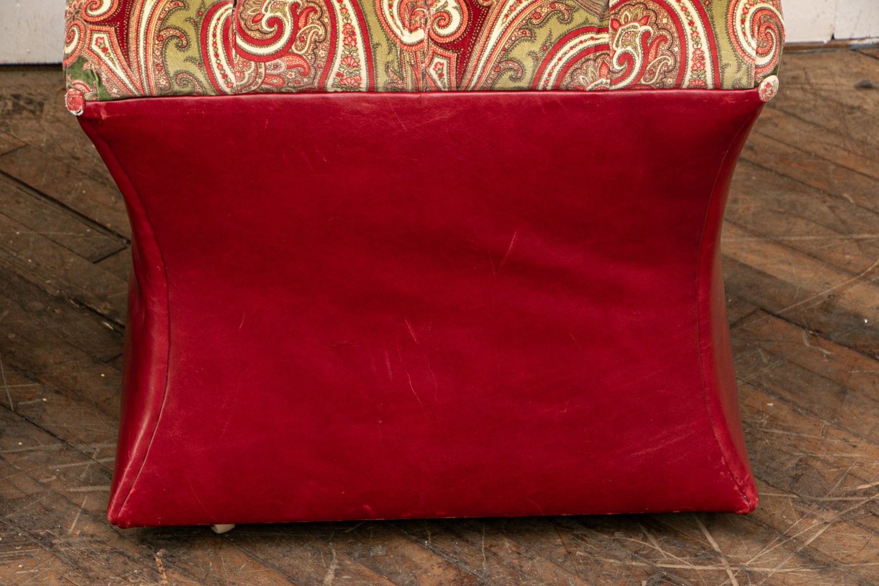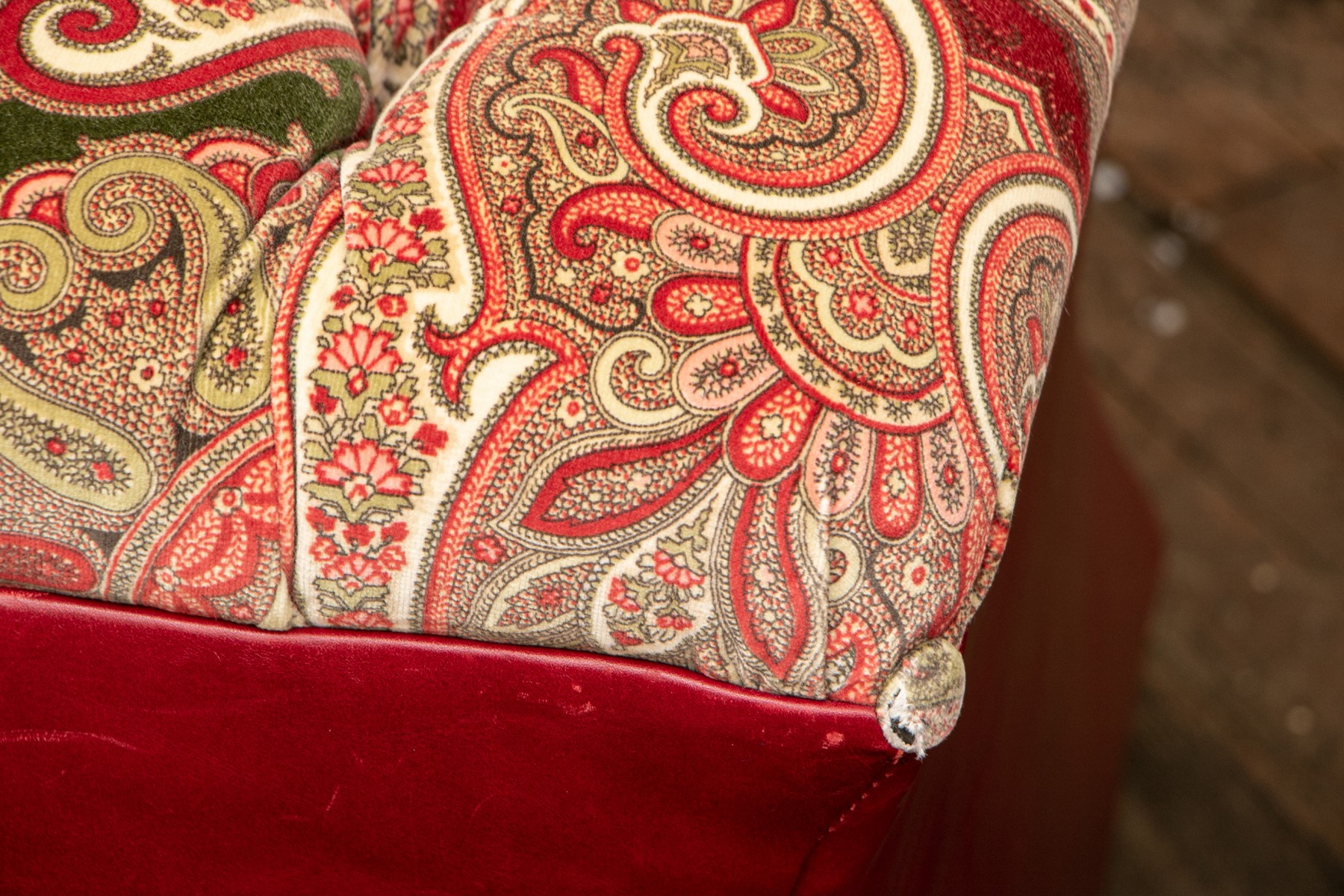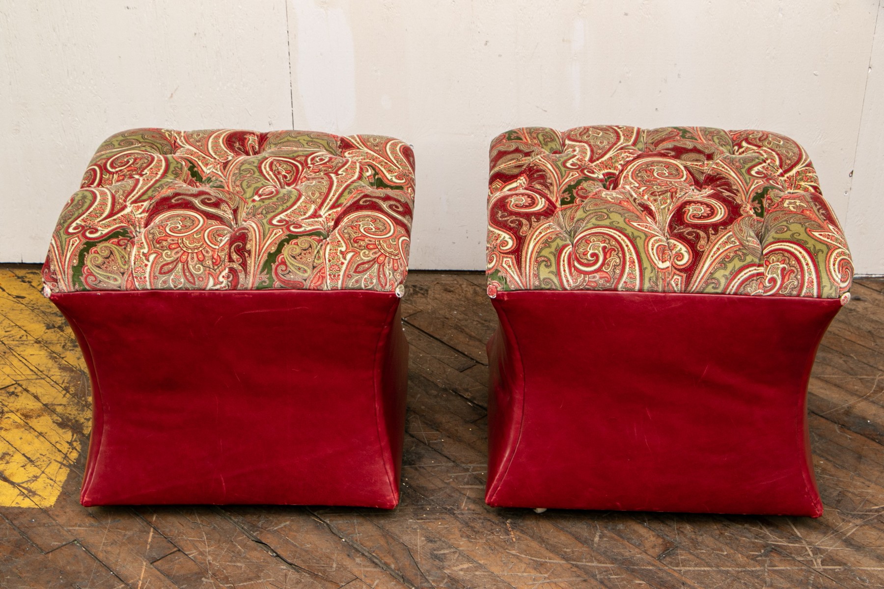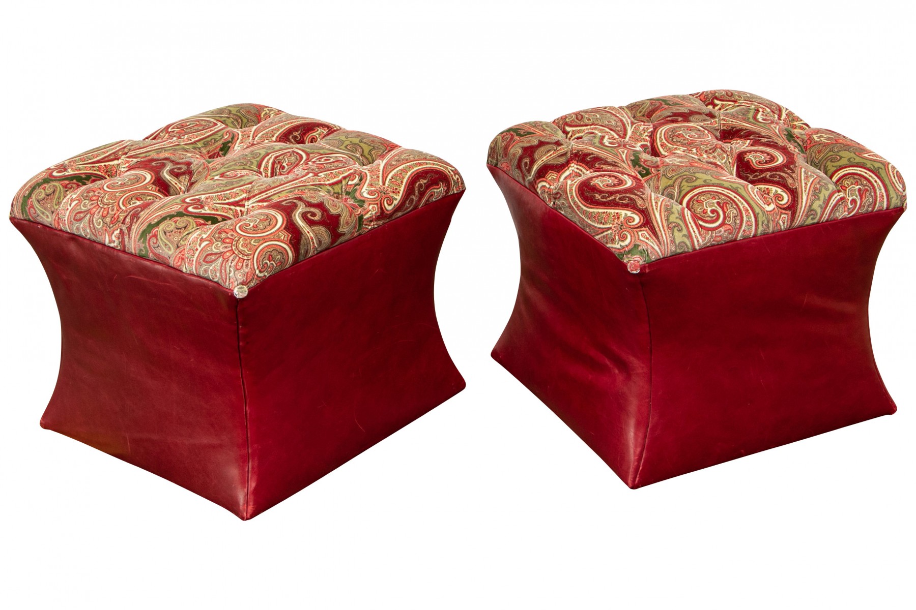 Shaped red leather ottomans with paisley print velveteen button tufted tops and buttons on the corners. Raised on Castors. . One castor is missing and requires replacement.