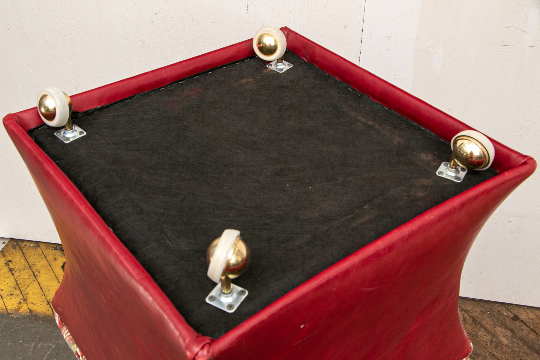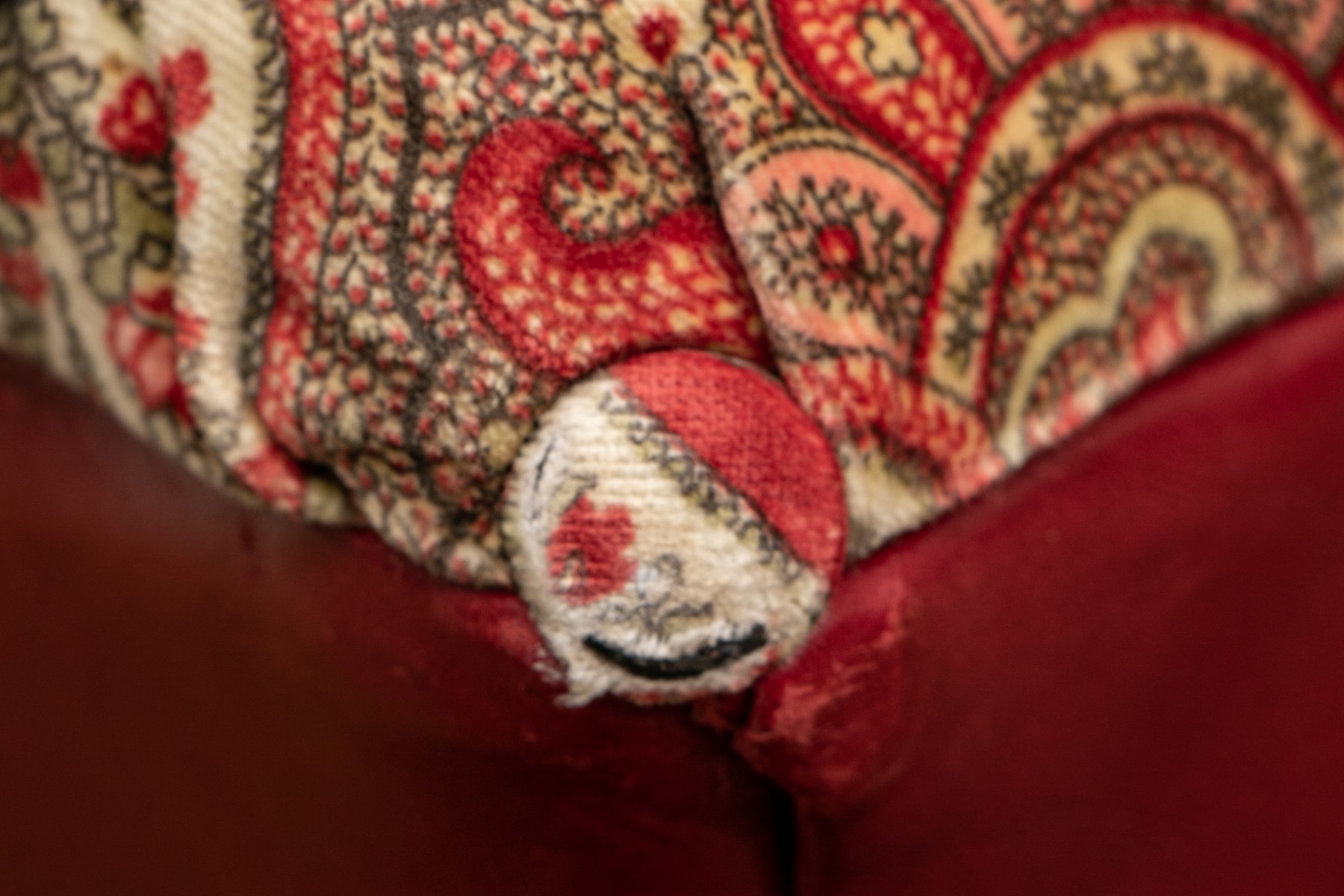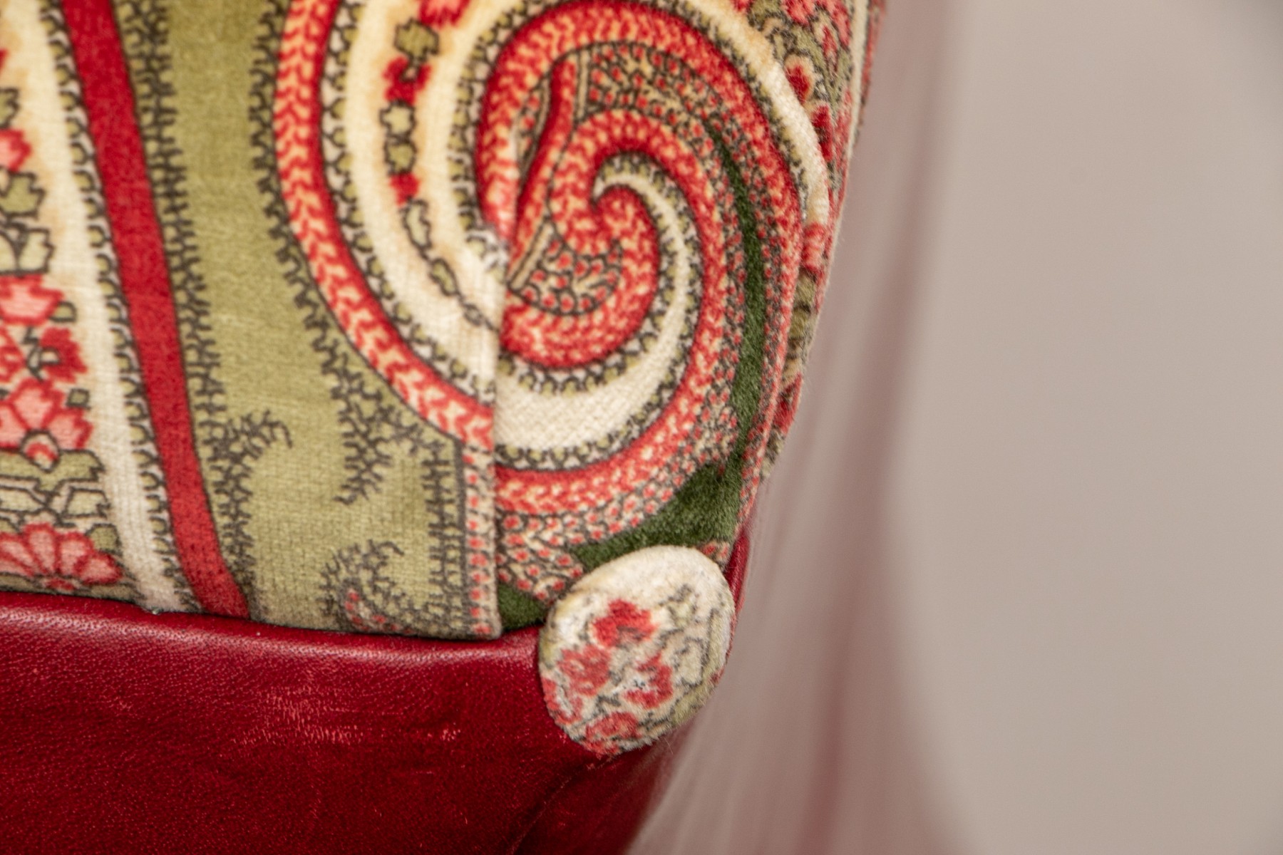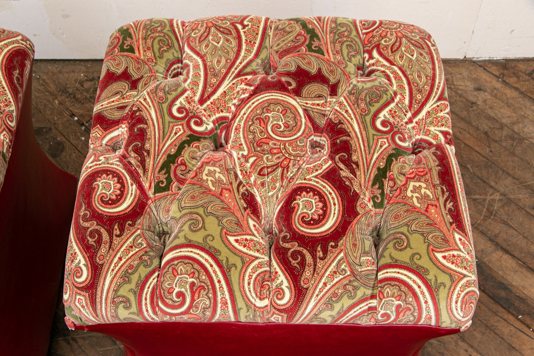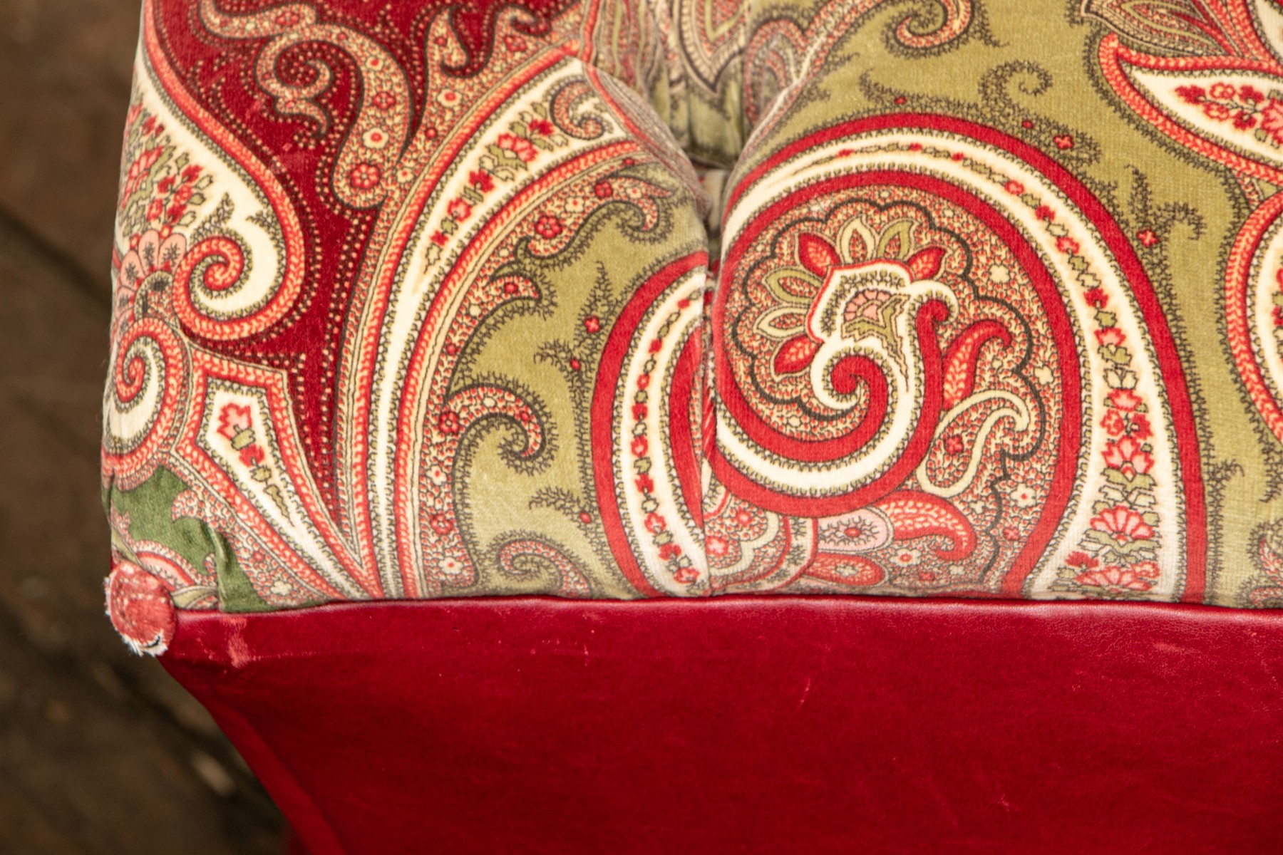 Shaped red leather ottomans with paisley print velveteen button tufted tops and buttons on the corners. Raised on Castors. . One castor is missing and requires replacement.