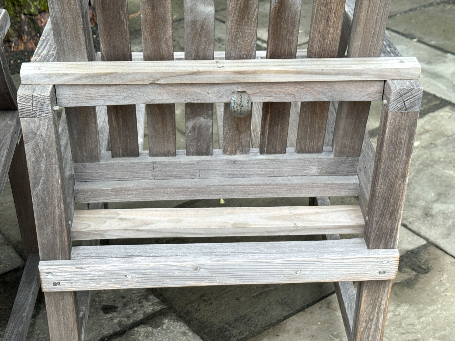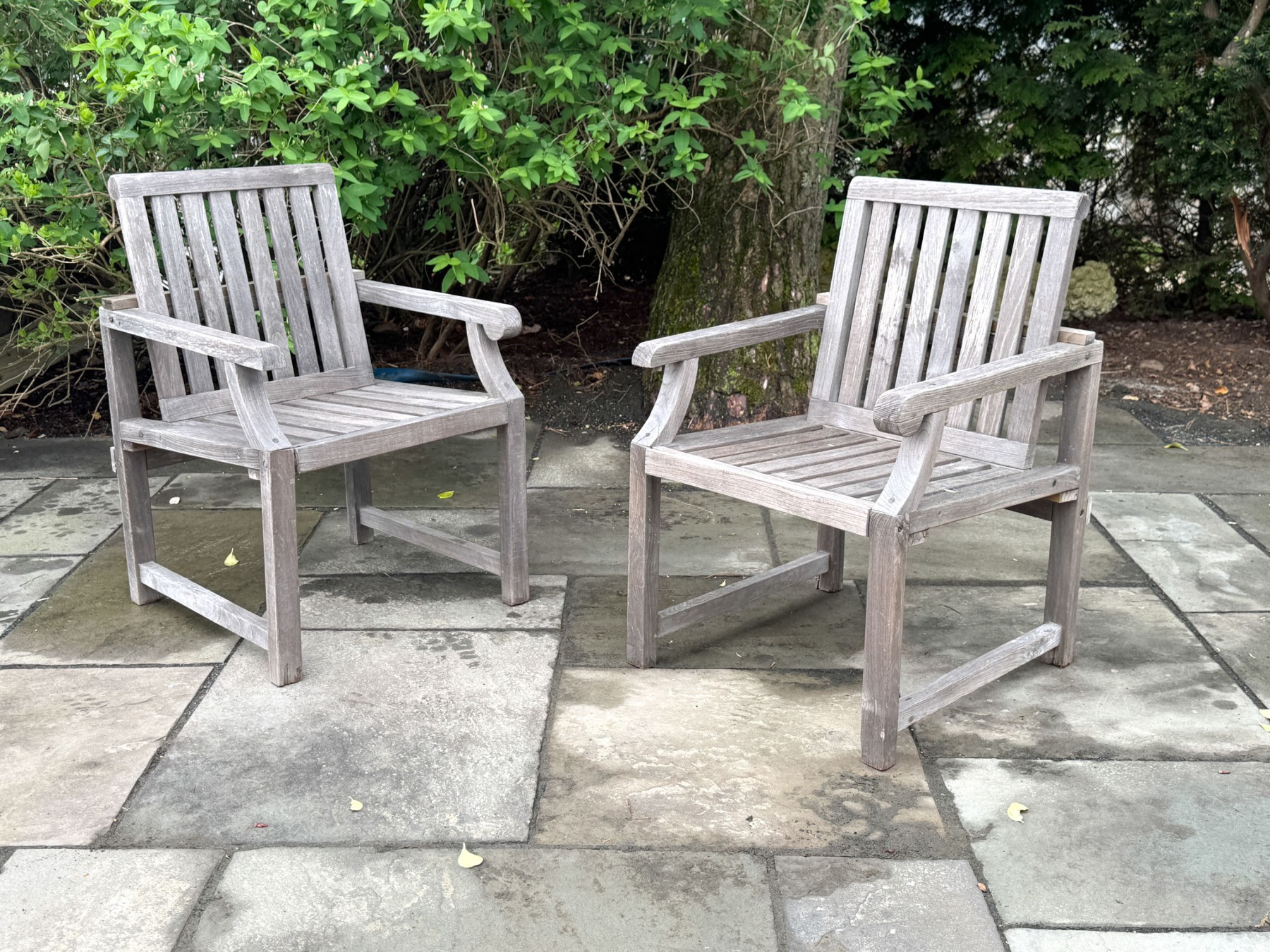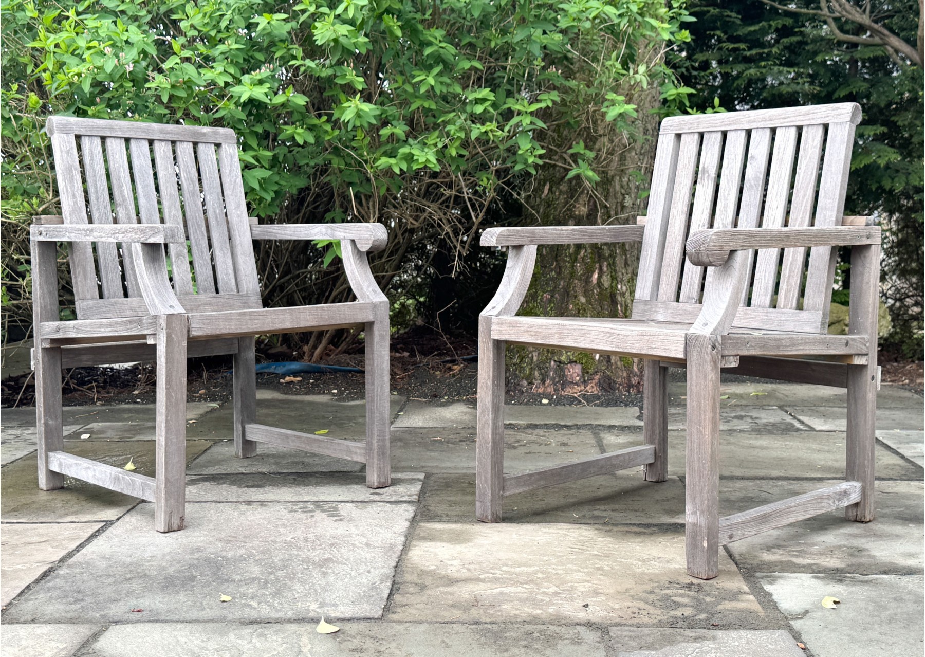 A wonderful pair of Outdoor Classics outdoor armchairs in traditional gray-hued teak wood. The chairs feature vertically slatted backs, straight arms with rolled arm profiles, and straight rectangular legs.