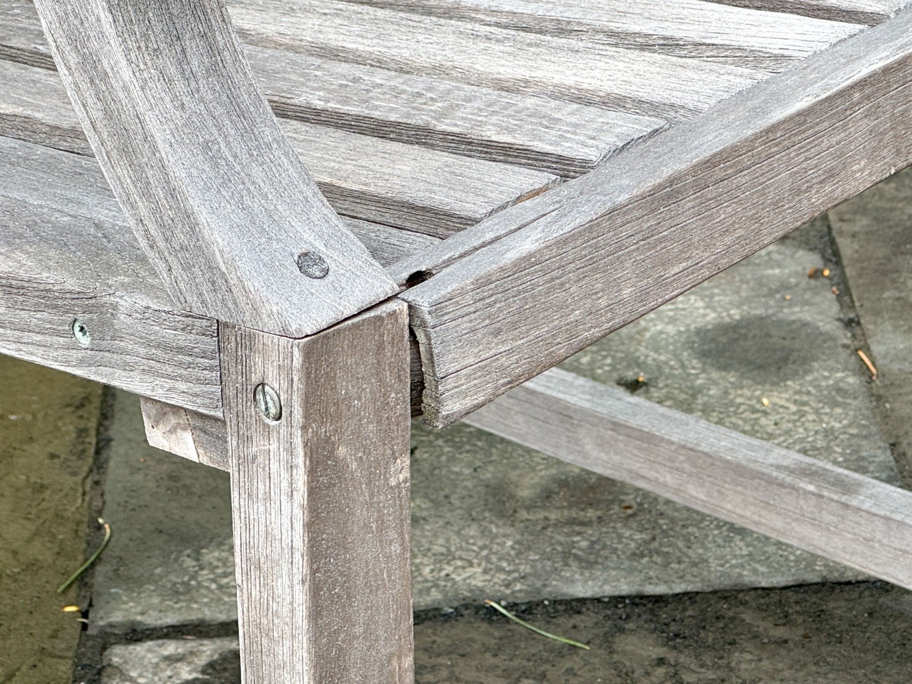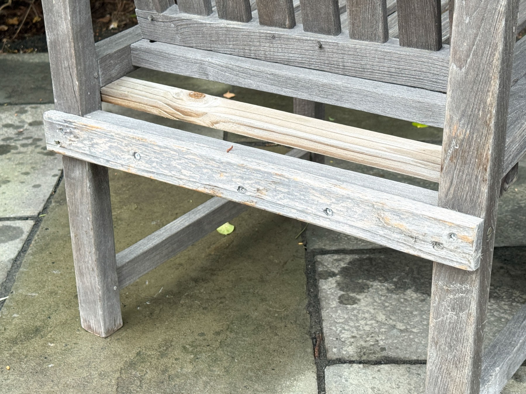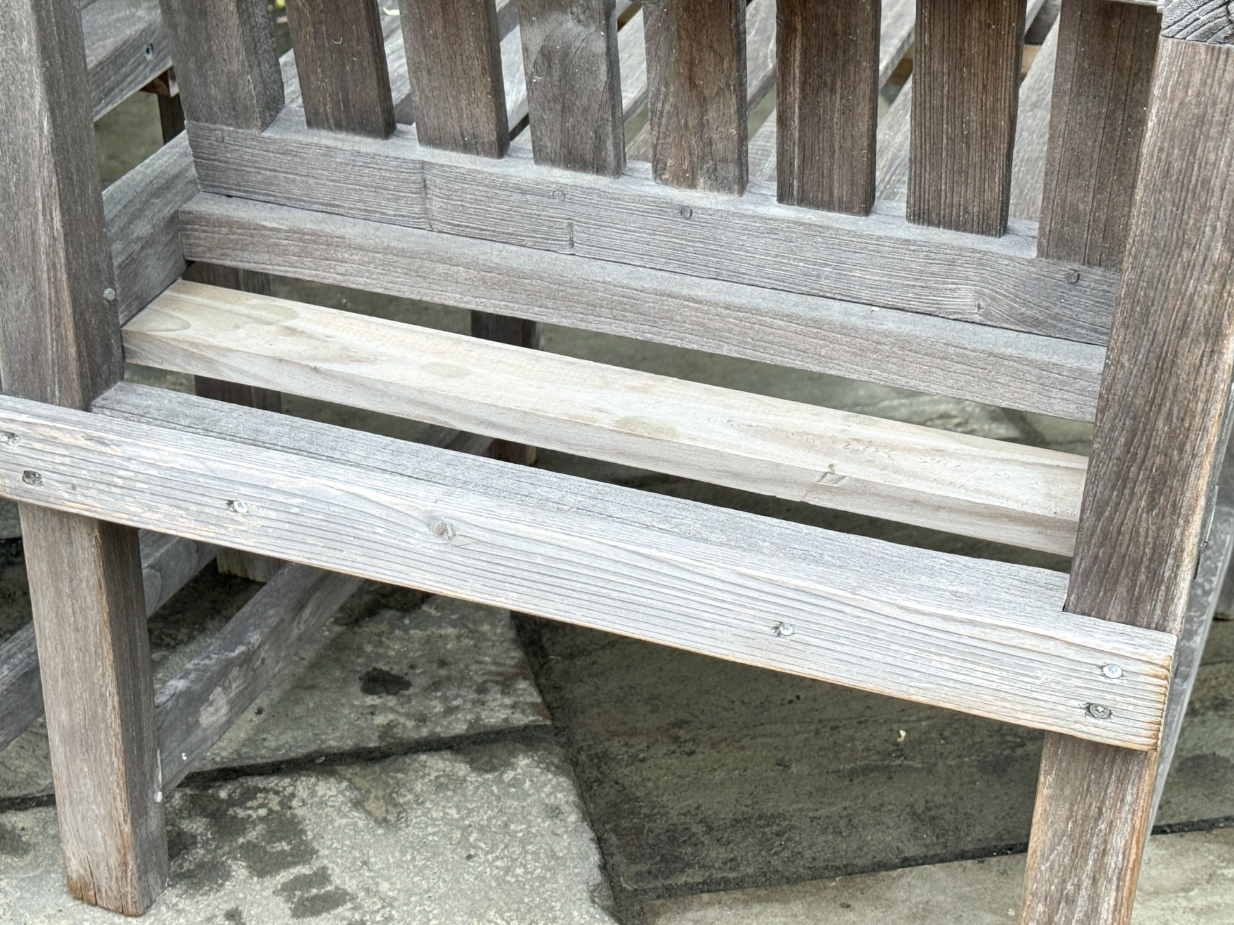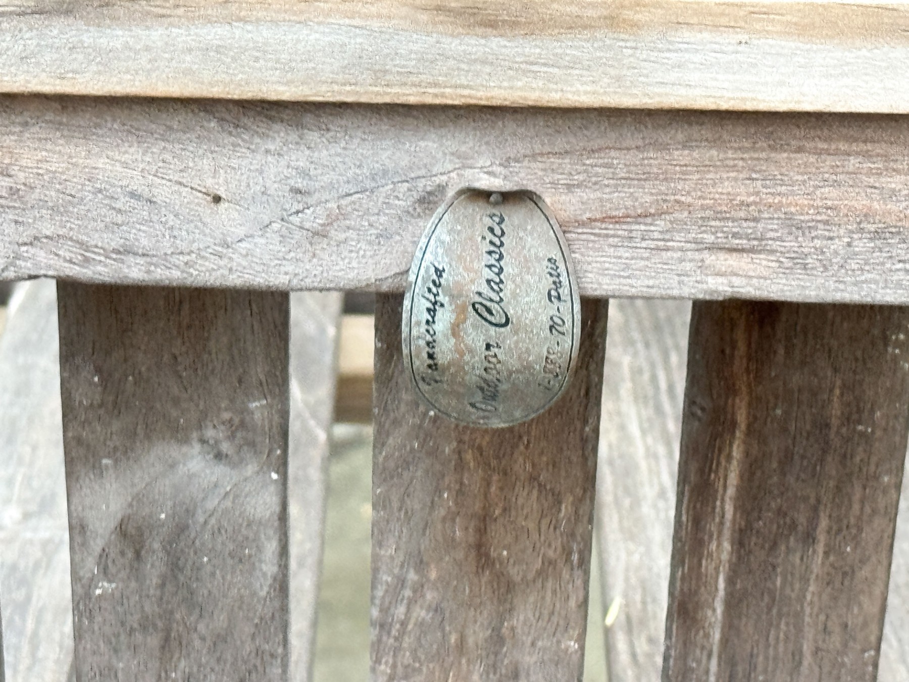 A wonderful pair of Outdoor Classics outdoor armchairs in traditional gray-hued teak wood. The chairs feature vertically slatted backs, straight arms with rolled arm profiles, and straight rectangular legs.