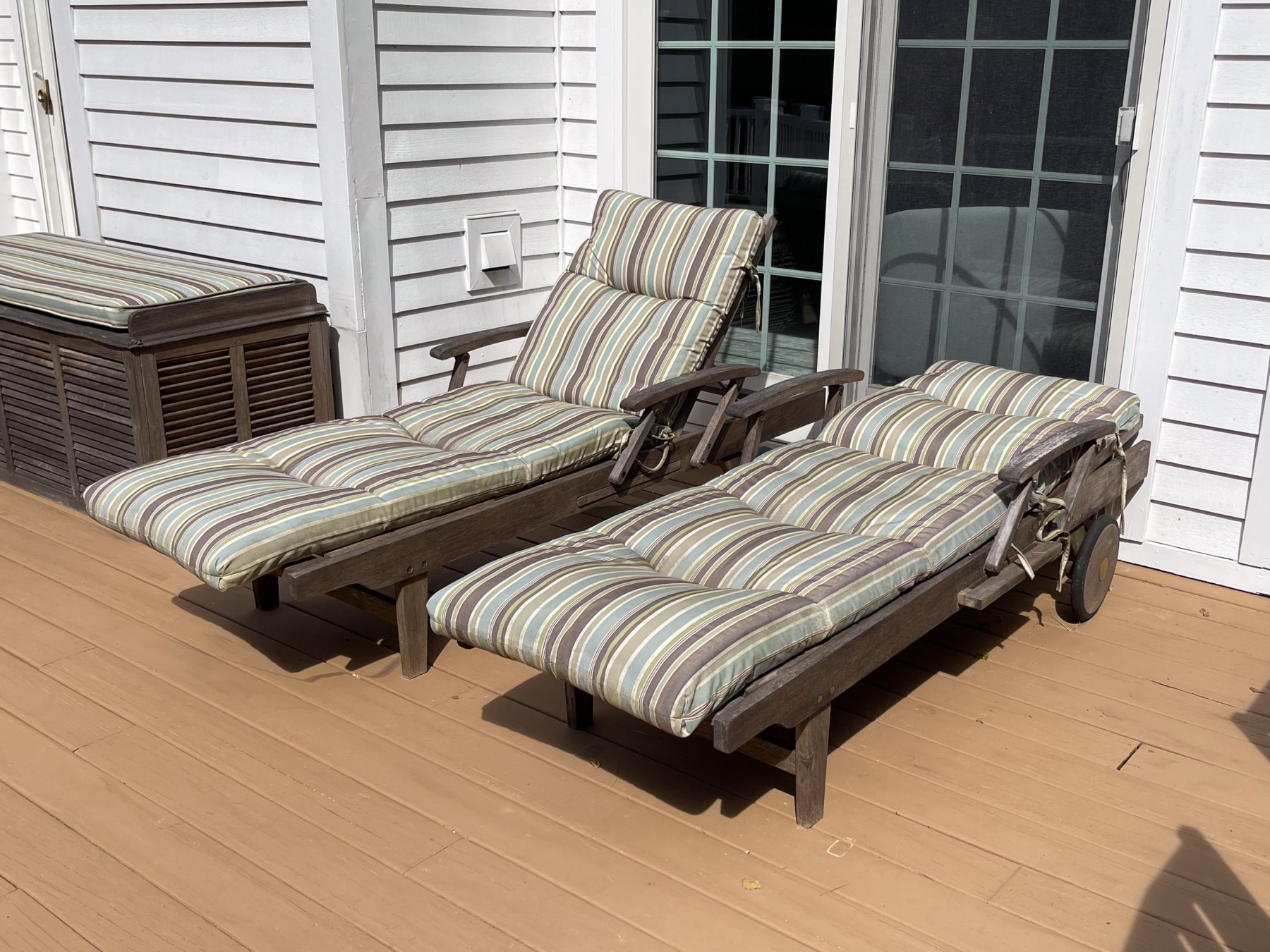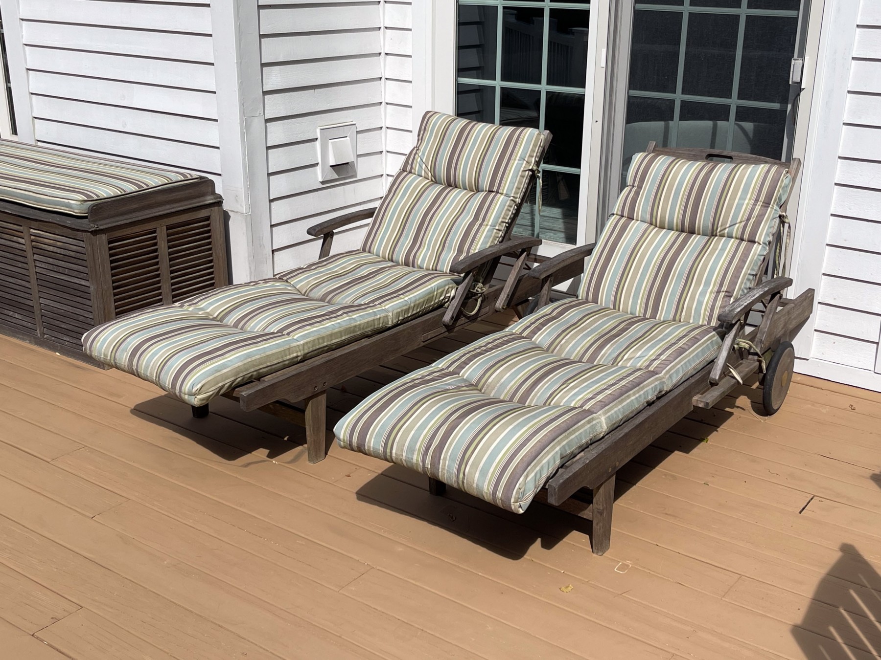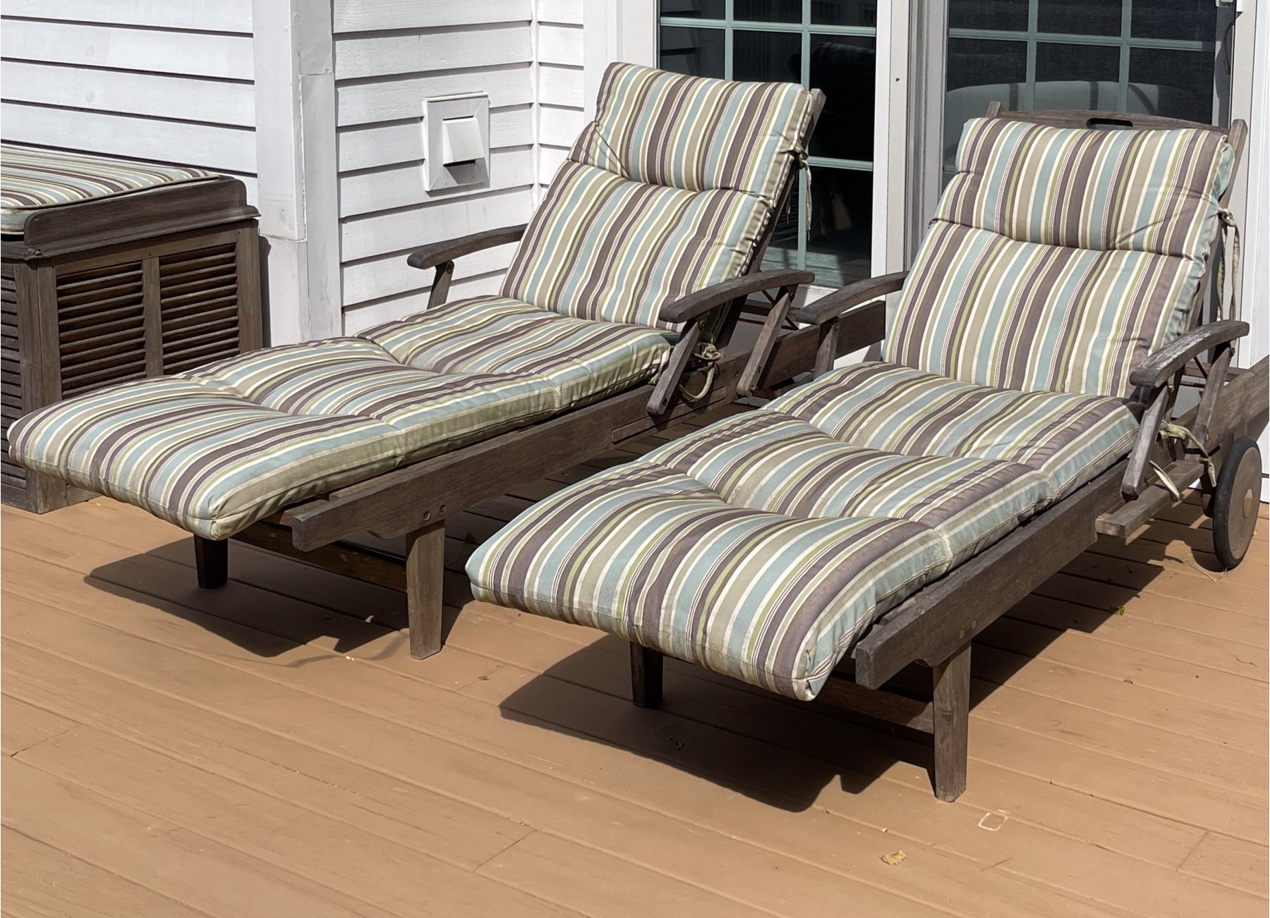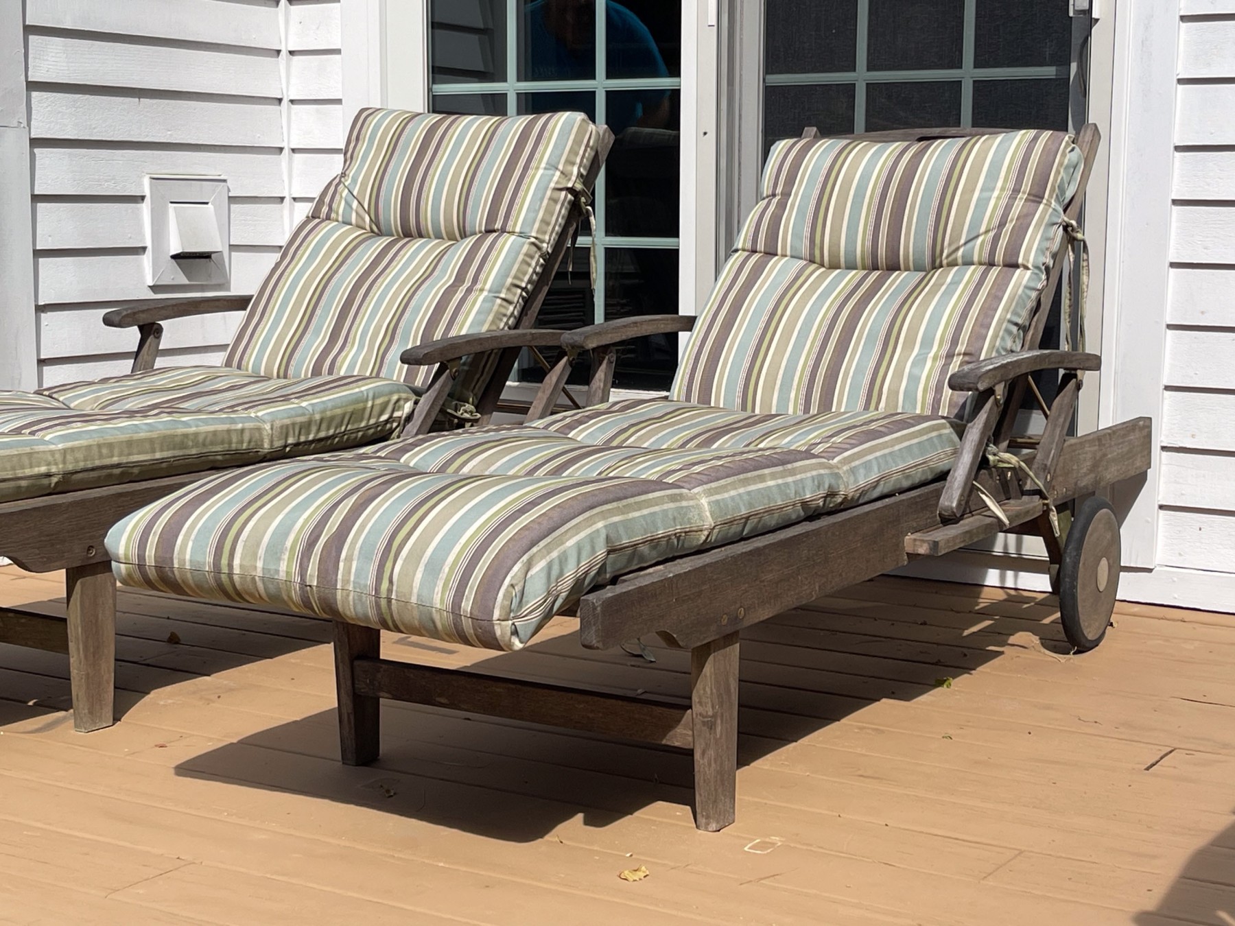 Pair of Outdoor Classics teak chaise lounges with two large wheels on the rear for moving ease. Includes cushions.
