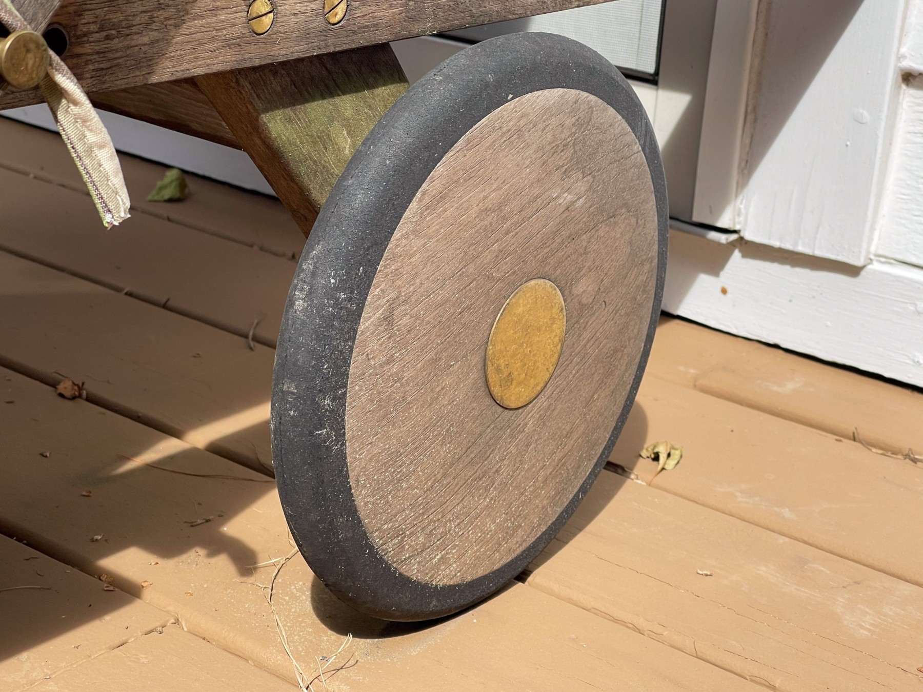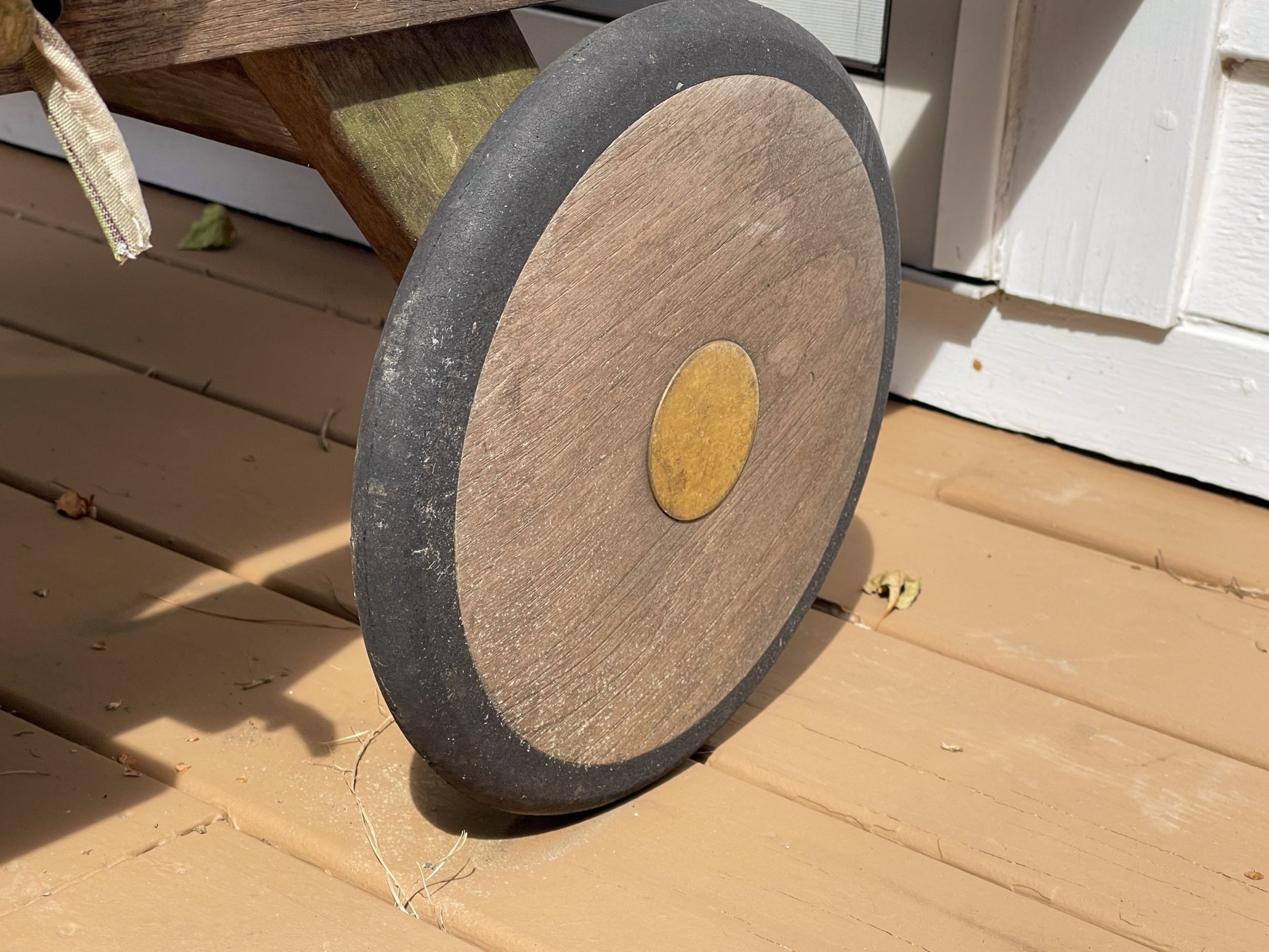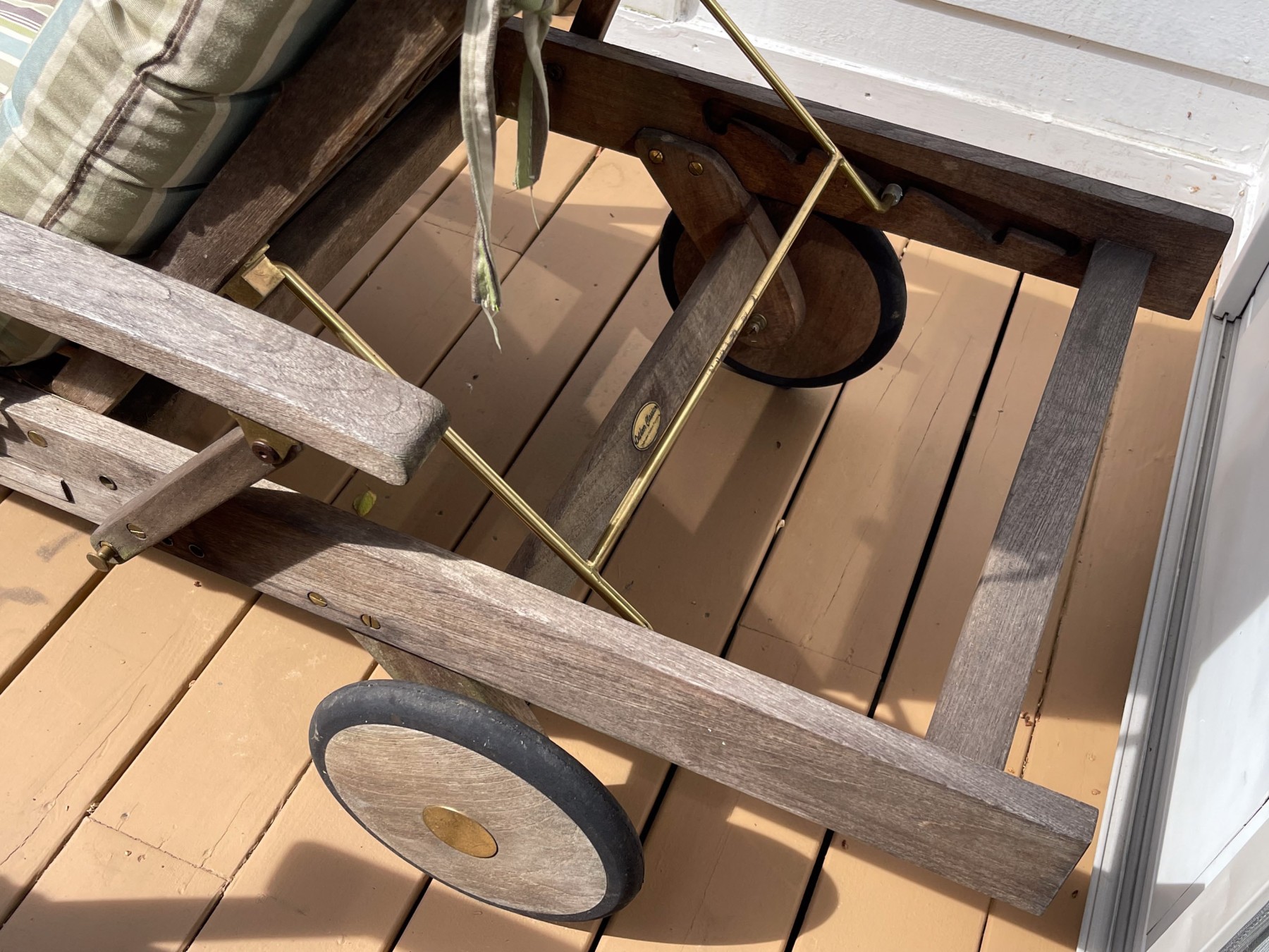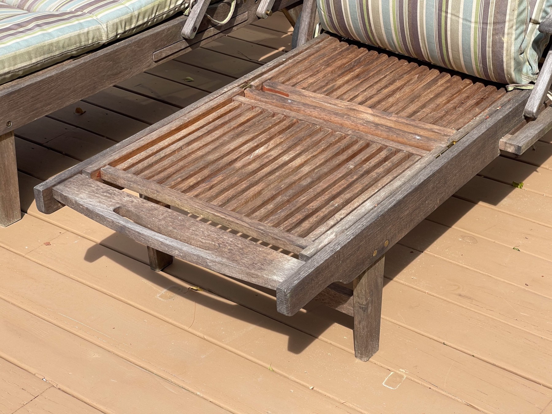 Pair of Outdoor Classics teak chaise lounges with two large wheels on the rear for moving ease. Includes cushions.