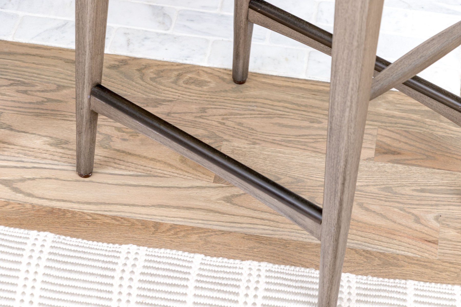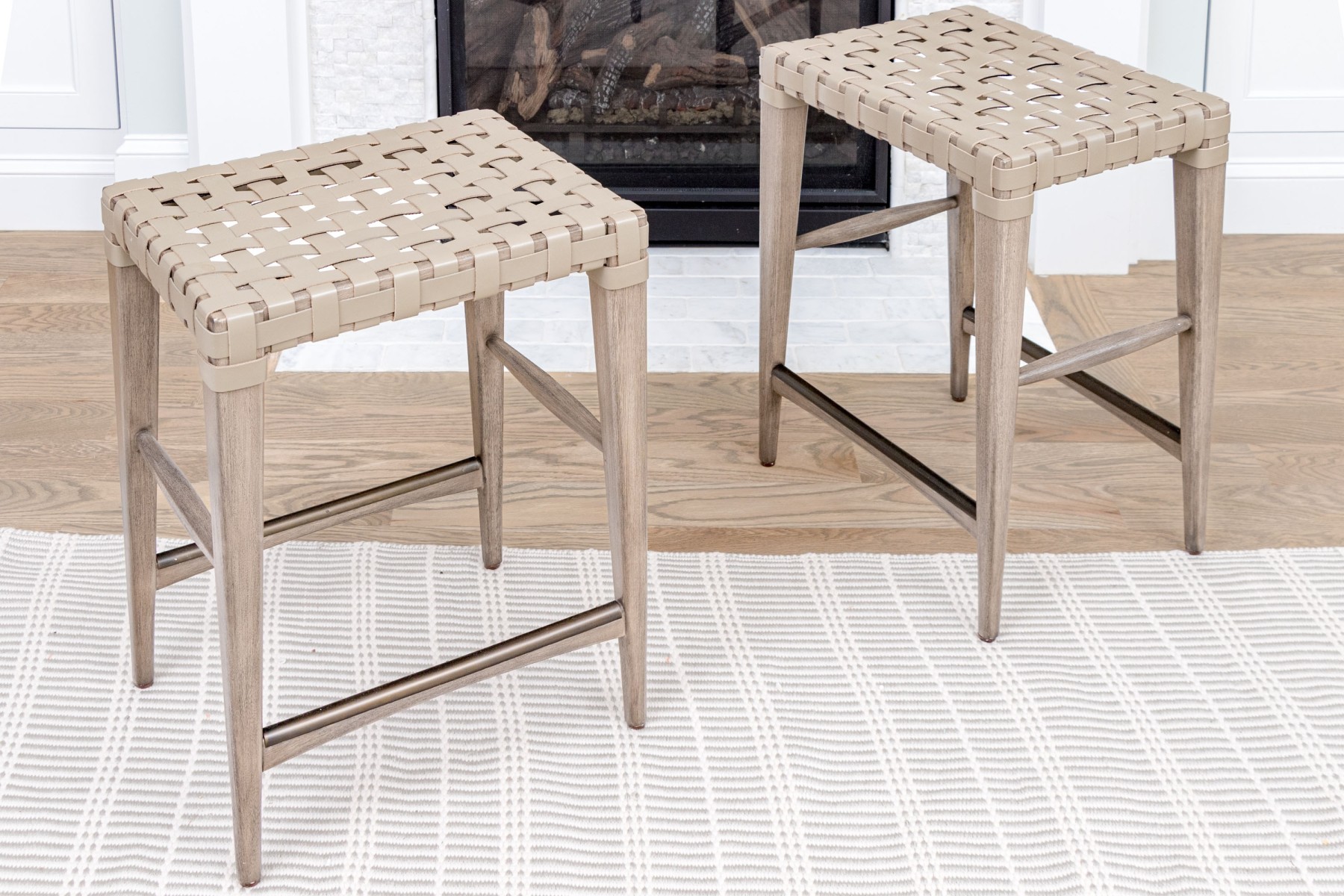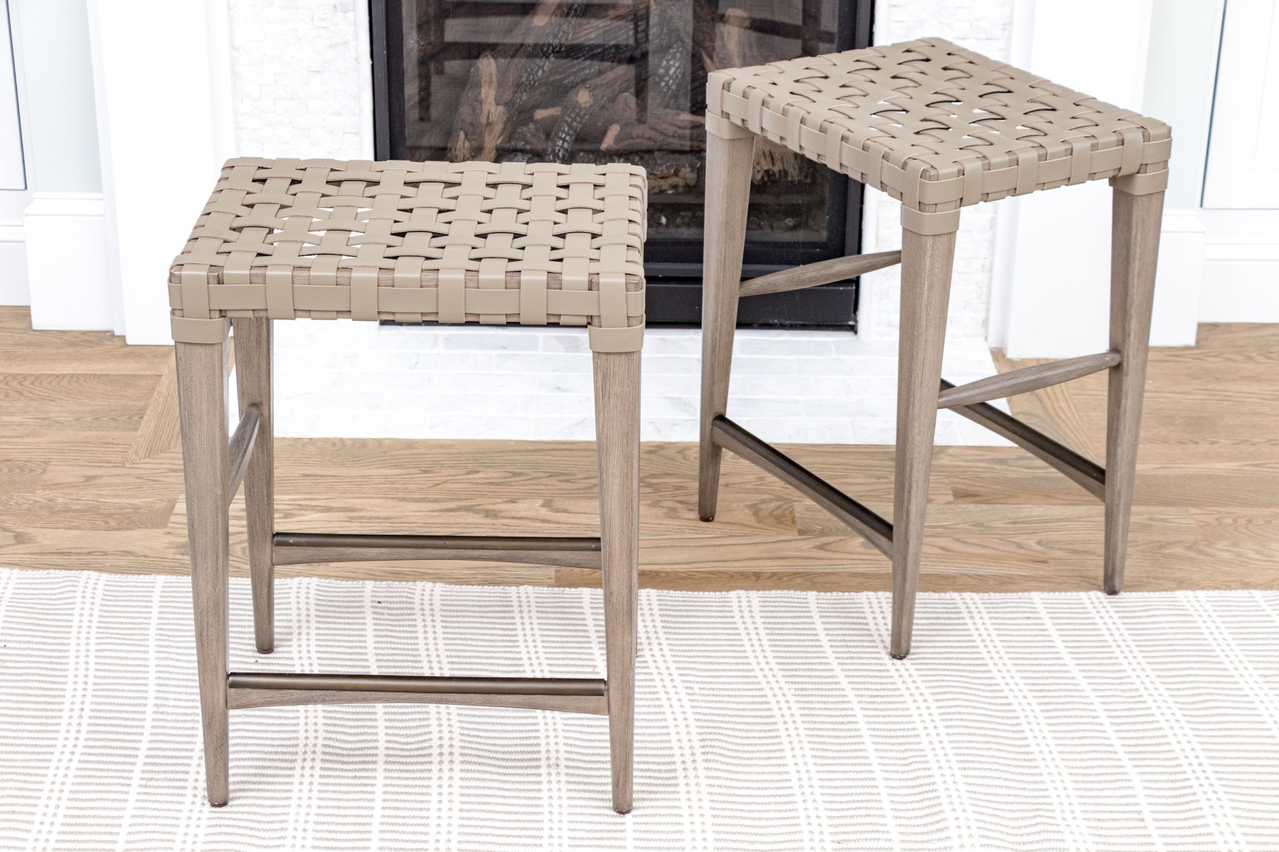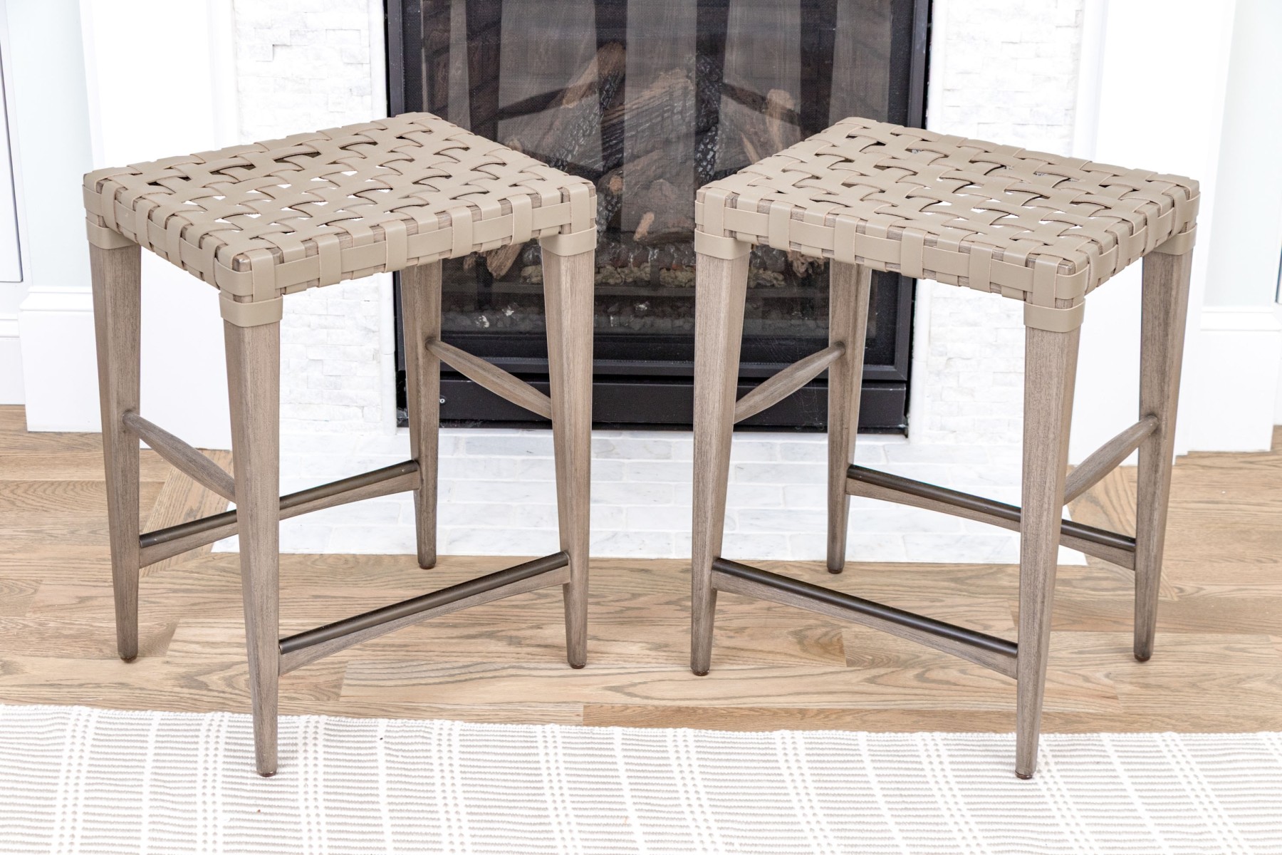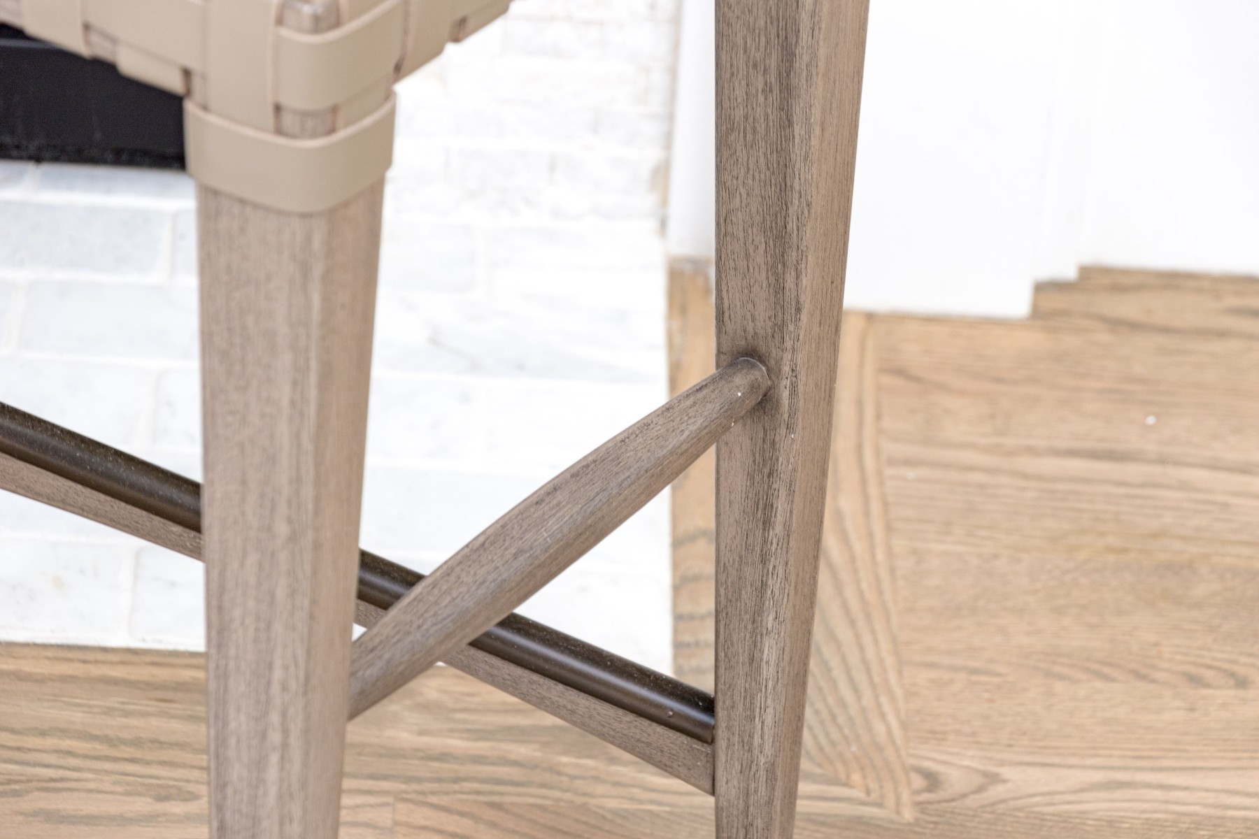 A wonderful pair of counter stools raise on four square tapered legs with stretcher supports which can double as foot rests. Detailed with rustic finished and leather straps that have chic, aesthetic appeal.