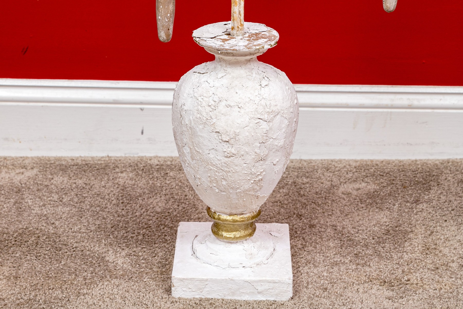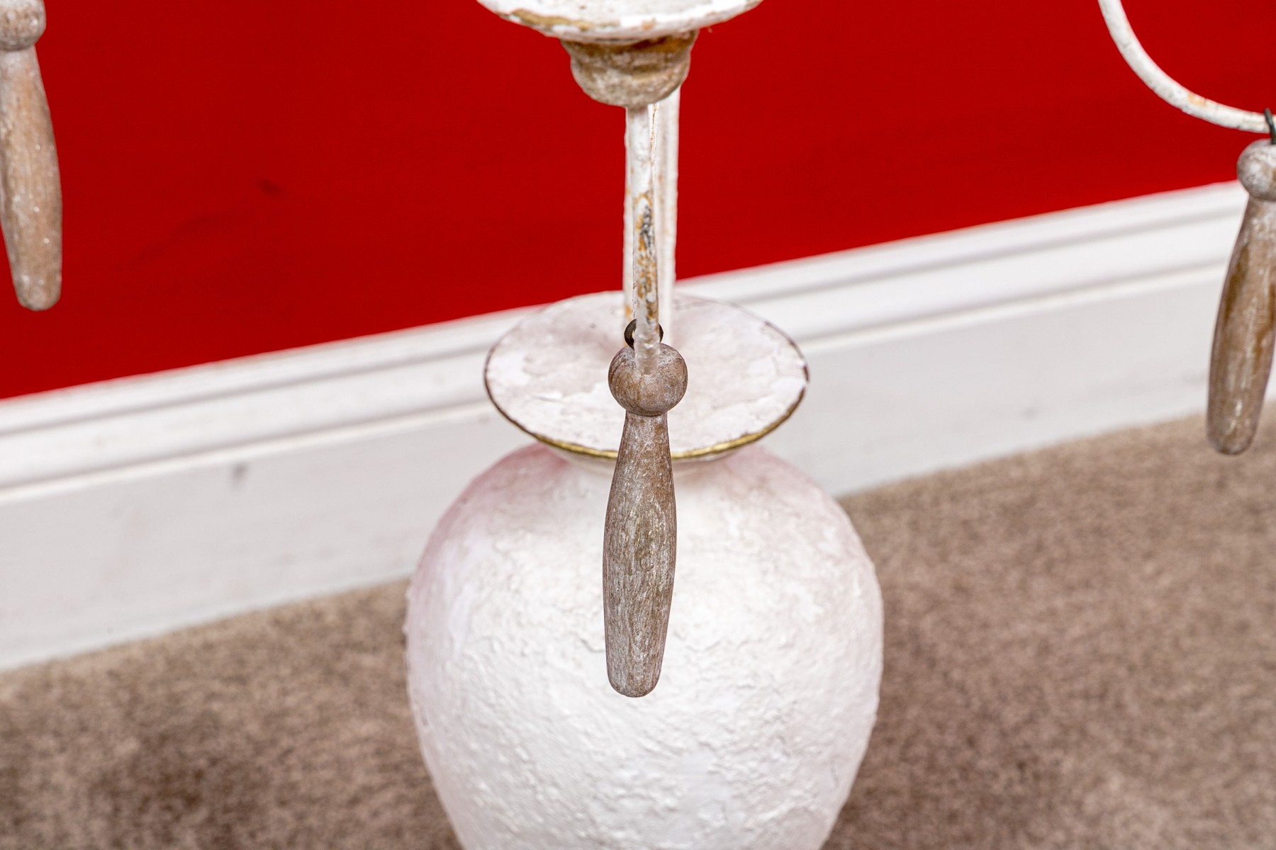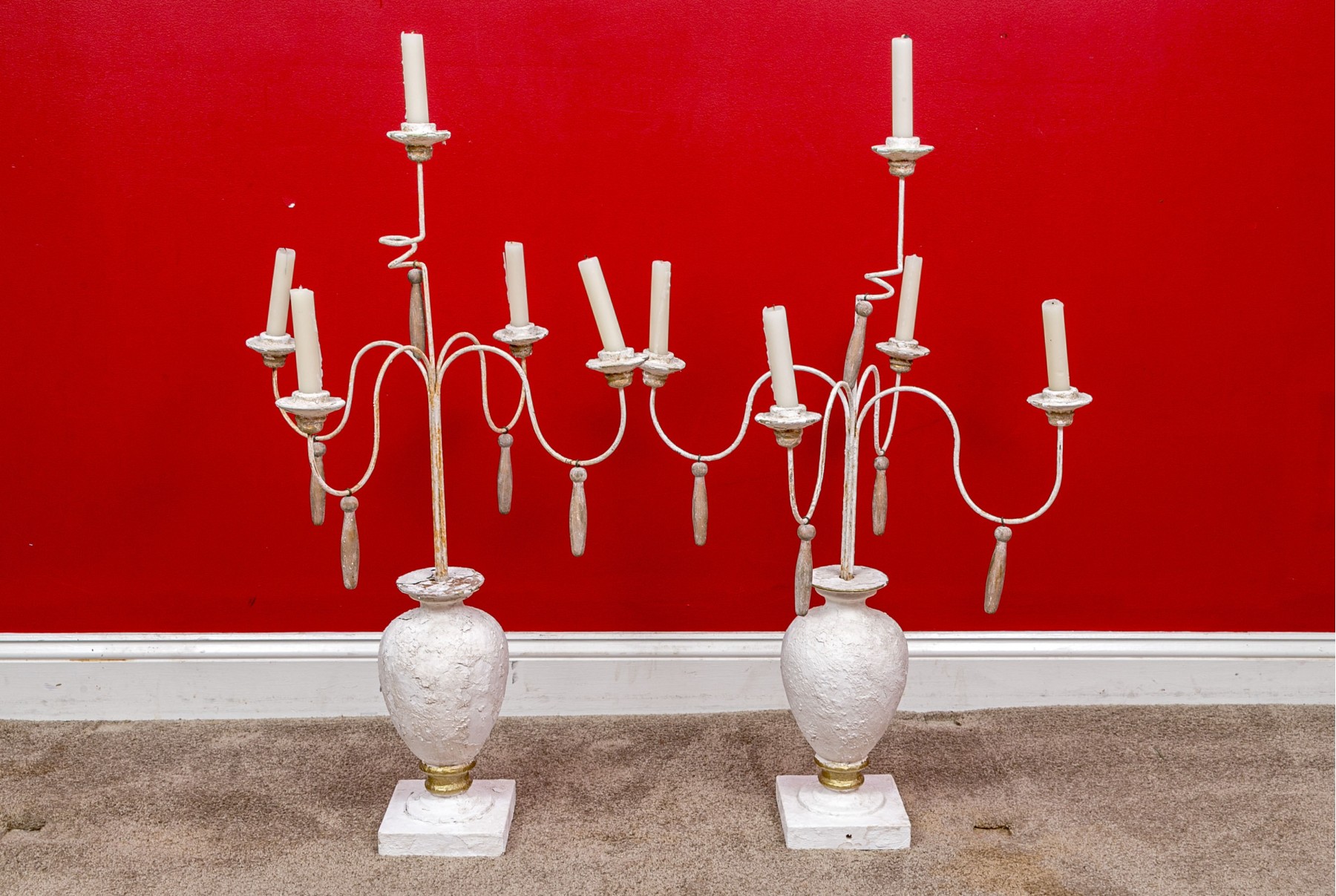 A delightful pair of candelabras in Flemish design, sporting rustic white plastic vasaform bodies with gilt knops and square bases supporting eye-catching candelabras with dramatic S-curved white iron arms accented with bowling pin form prisms. The central arms are spiraled for a fun, impressive display.
