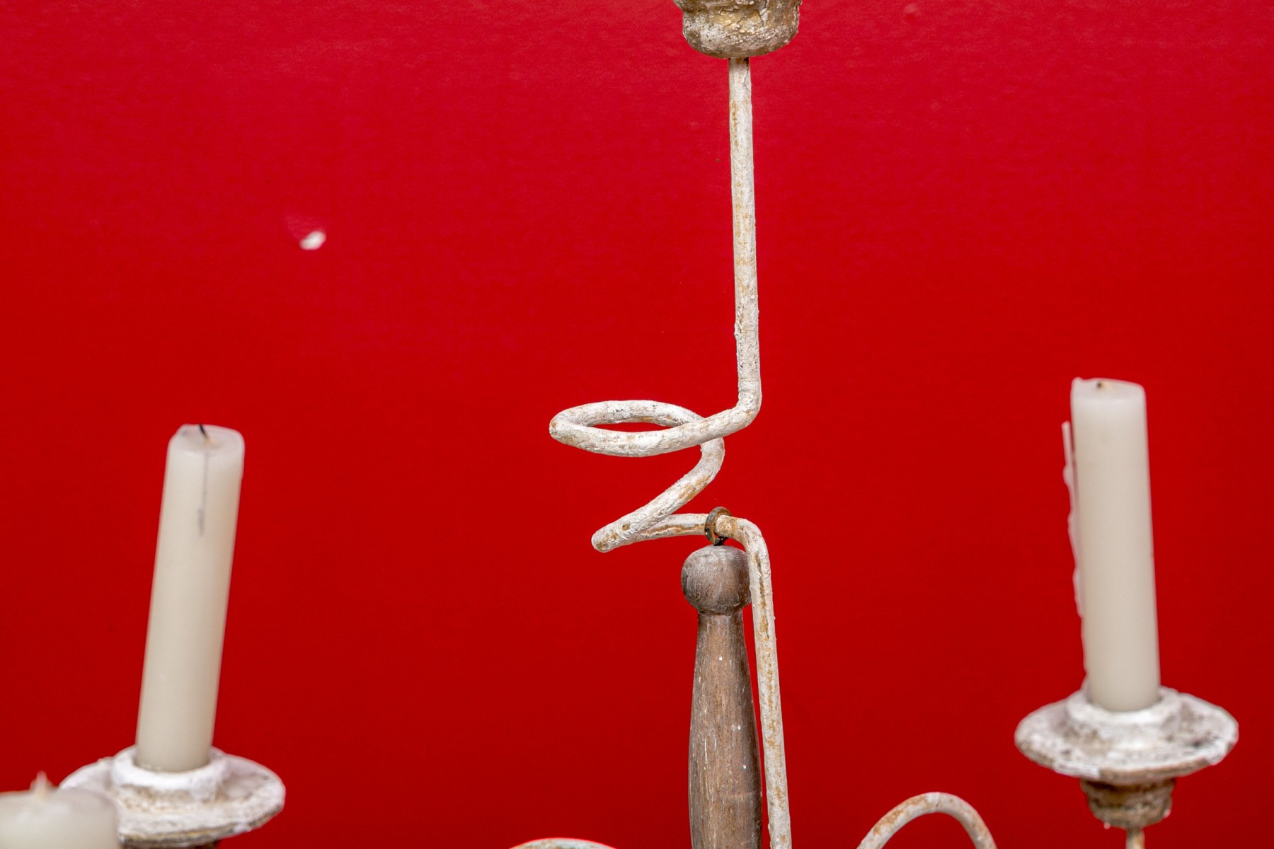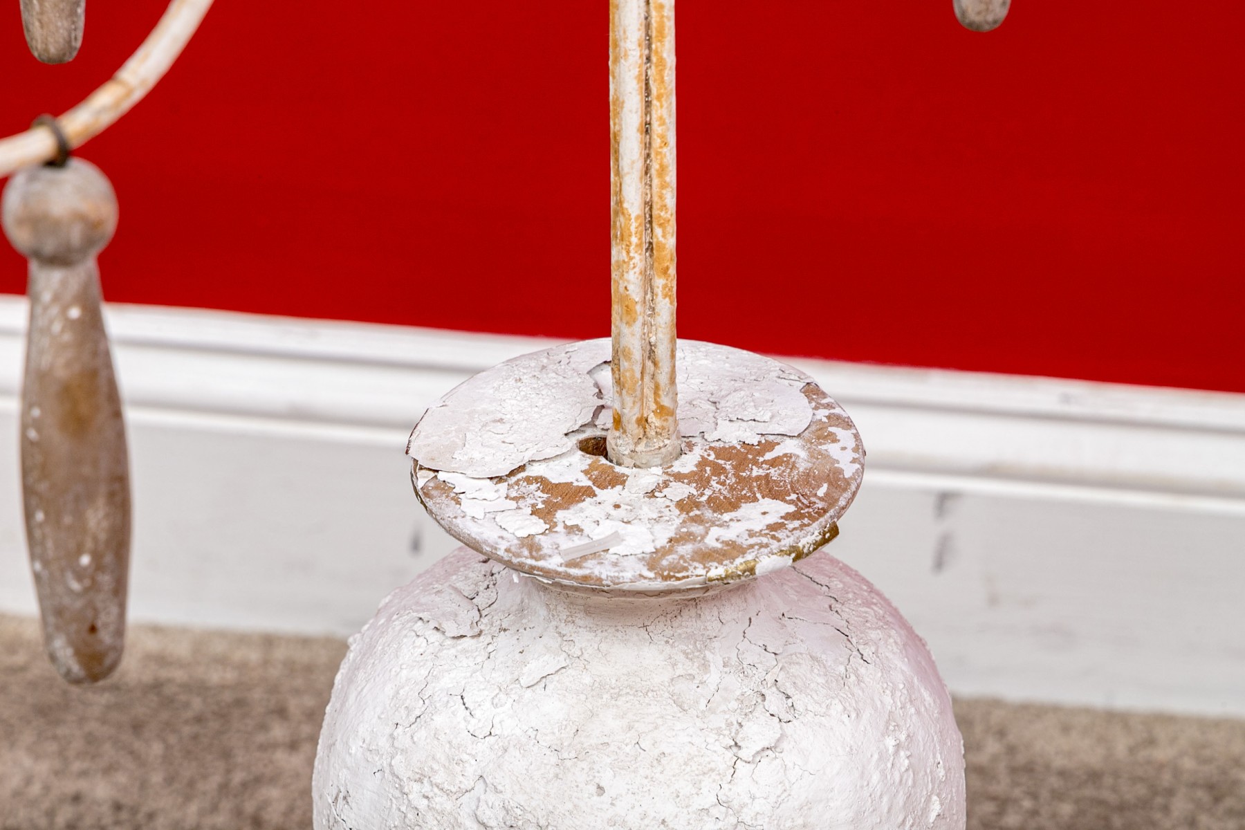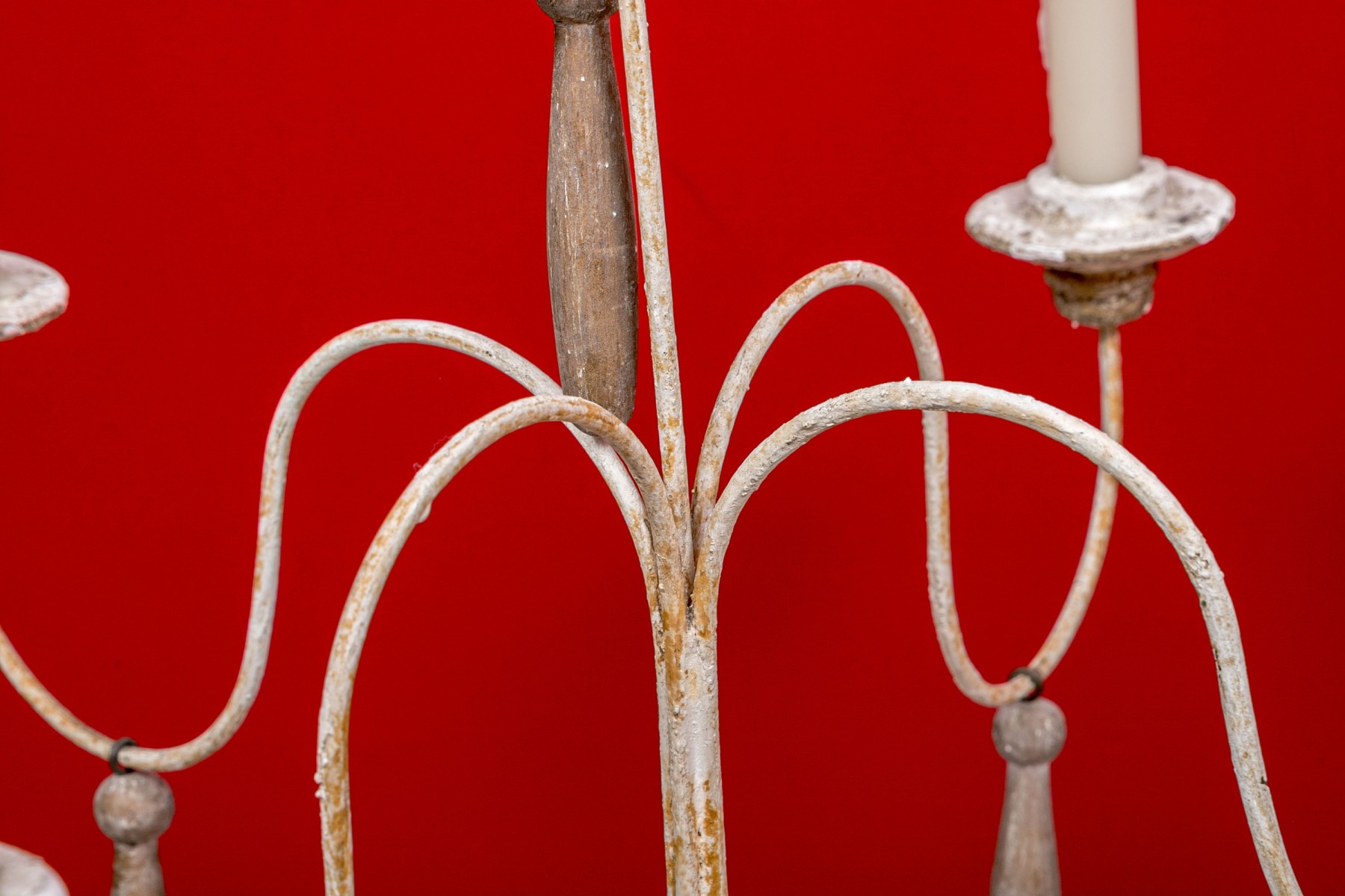 A delightful pair of candelabras in Flemish design, sporting rustic white plastic vasaform bodies with gilt knops and square bases supporting eye-catching candelabras with dramatic S-curved white iron arms accented with bowling pin form prisms. The central arms are spiraled for a fun, impressive display.