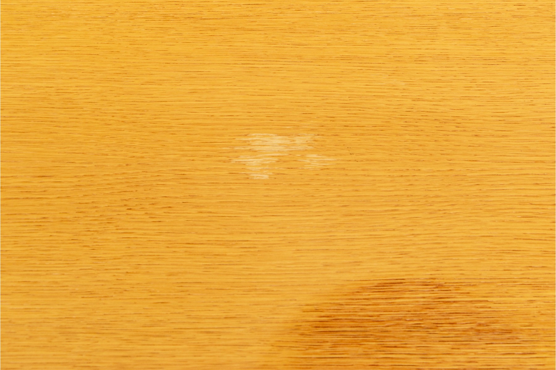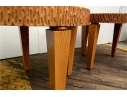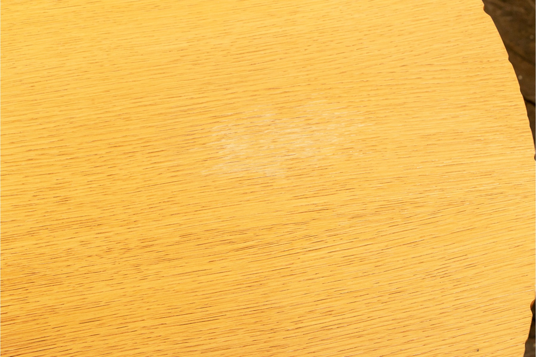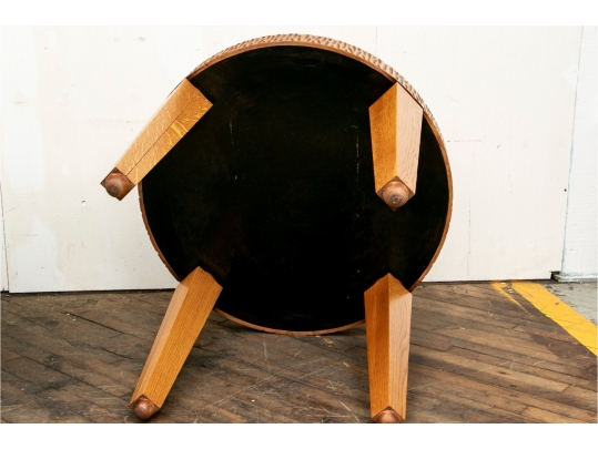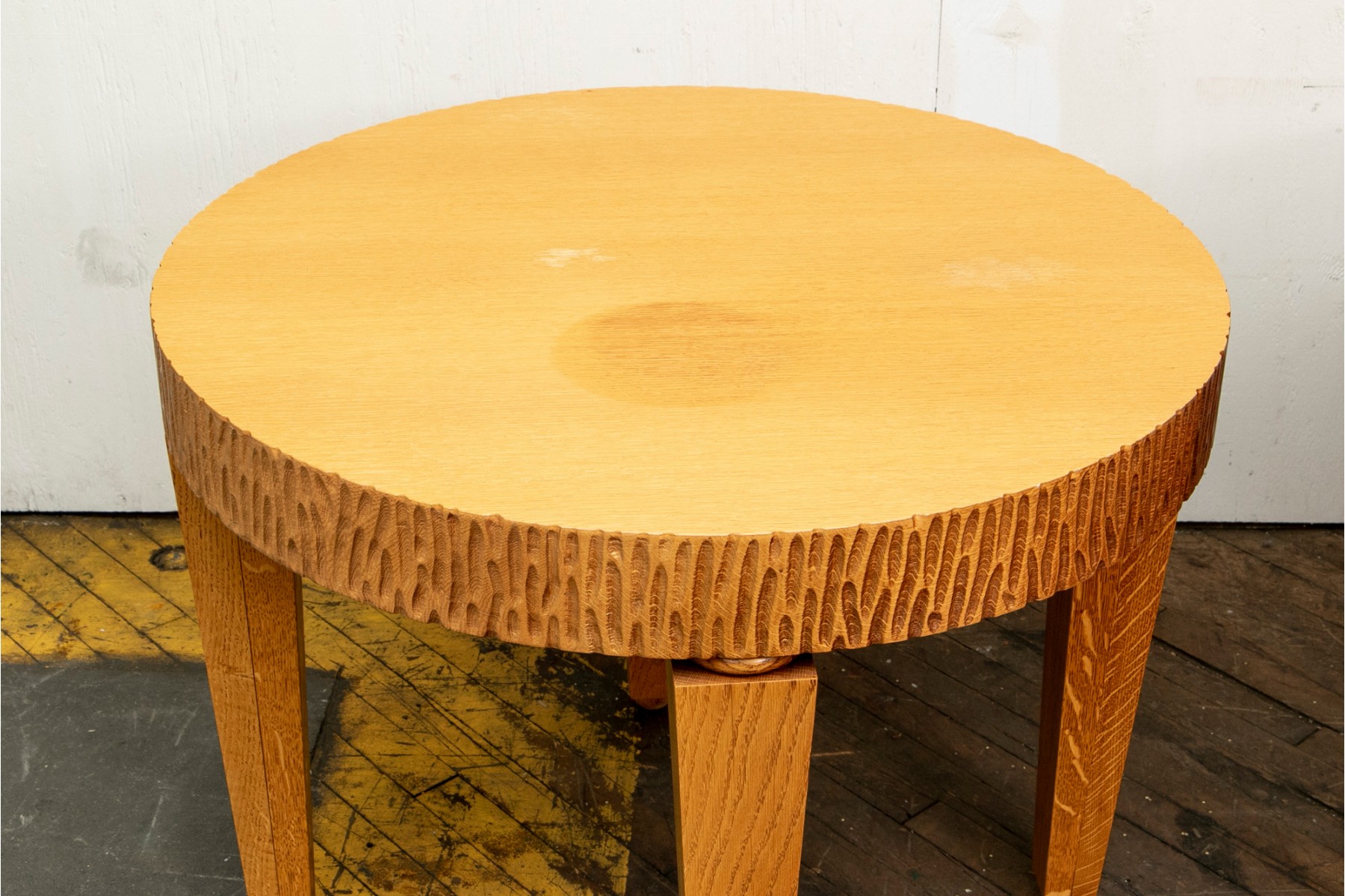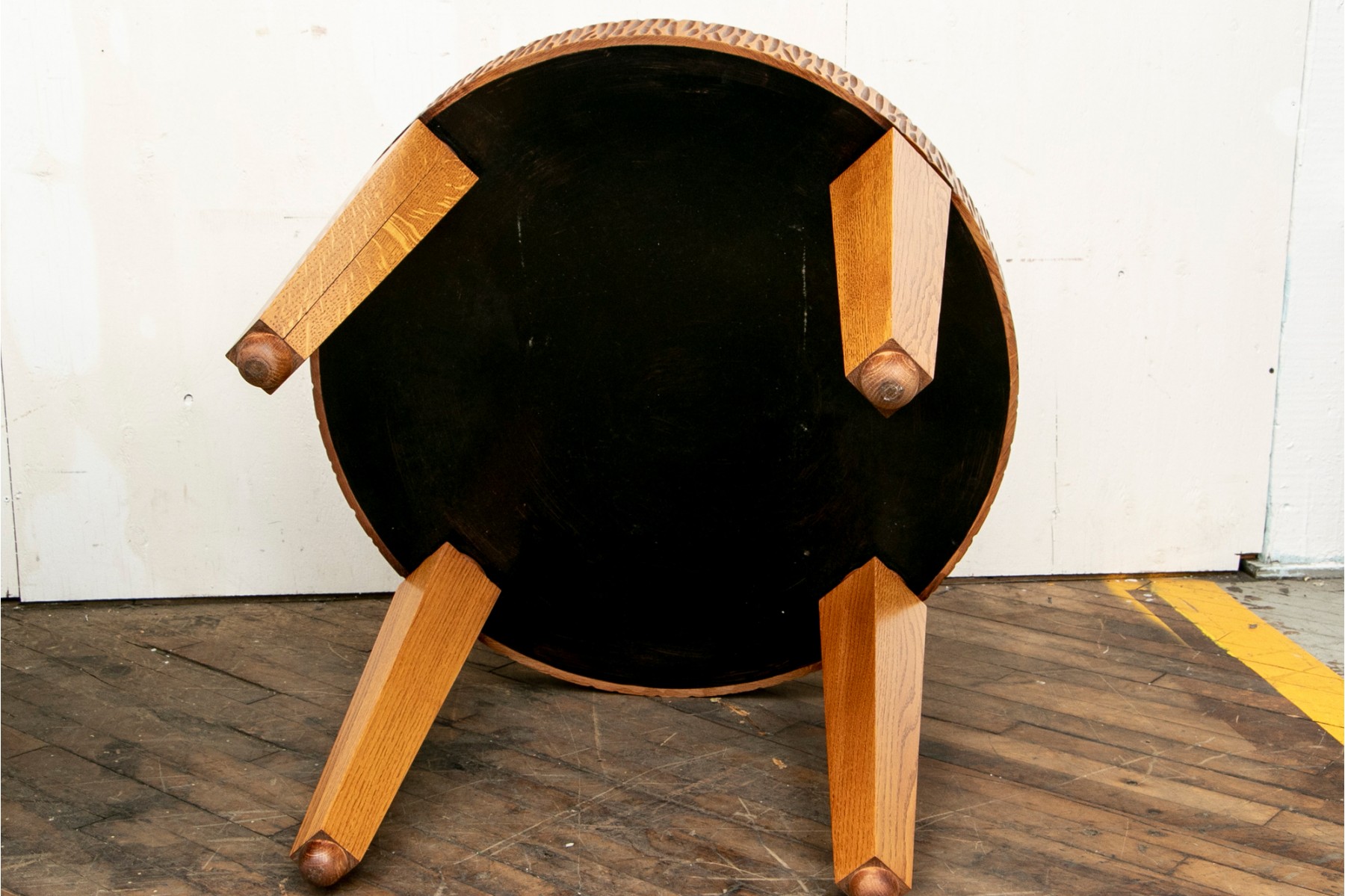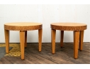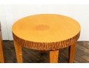 Condition: Please see detail photos. Various signs of age and wear include tables are sun struck dark circle from placement of lamp, some minor white stains, rough finish. While some level of restoration may be desired, the tables retain a Modern and desirable presentation.