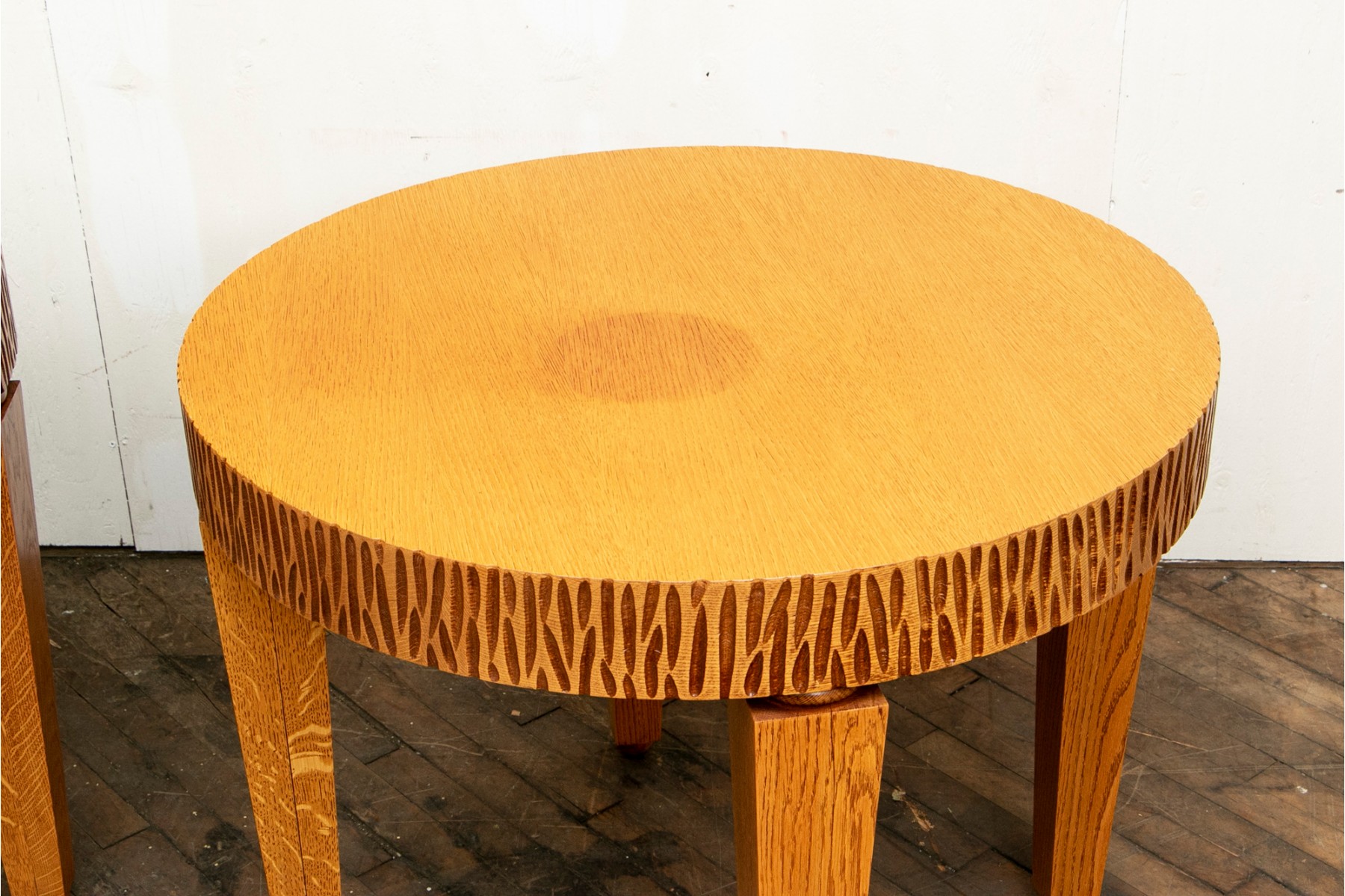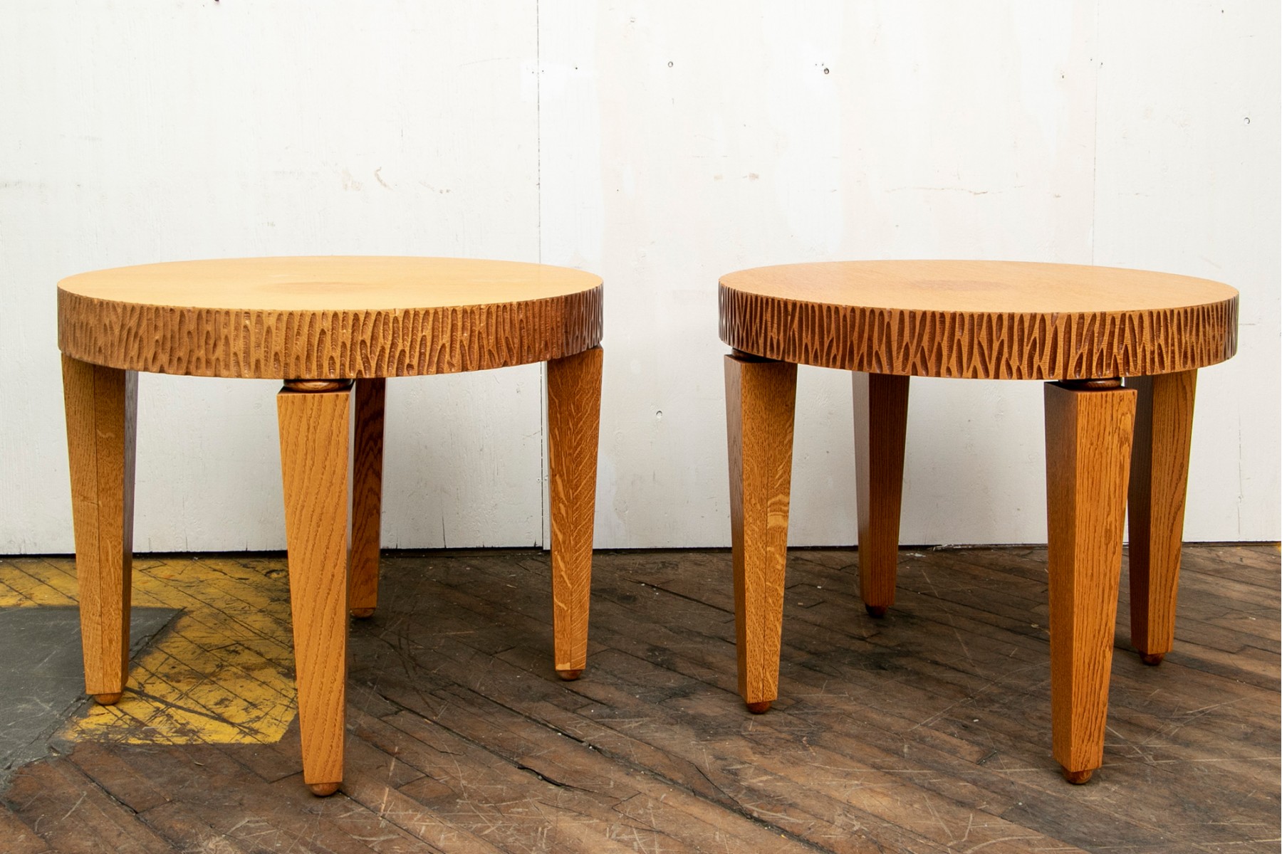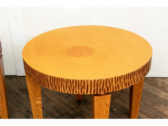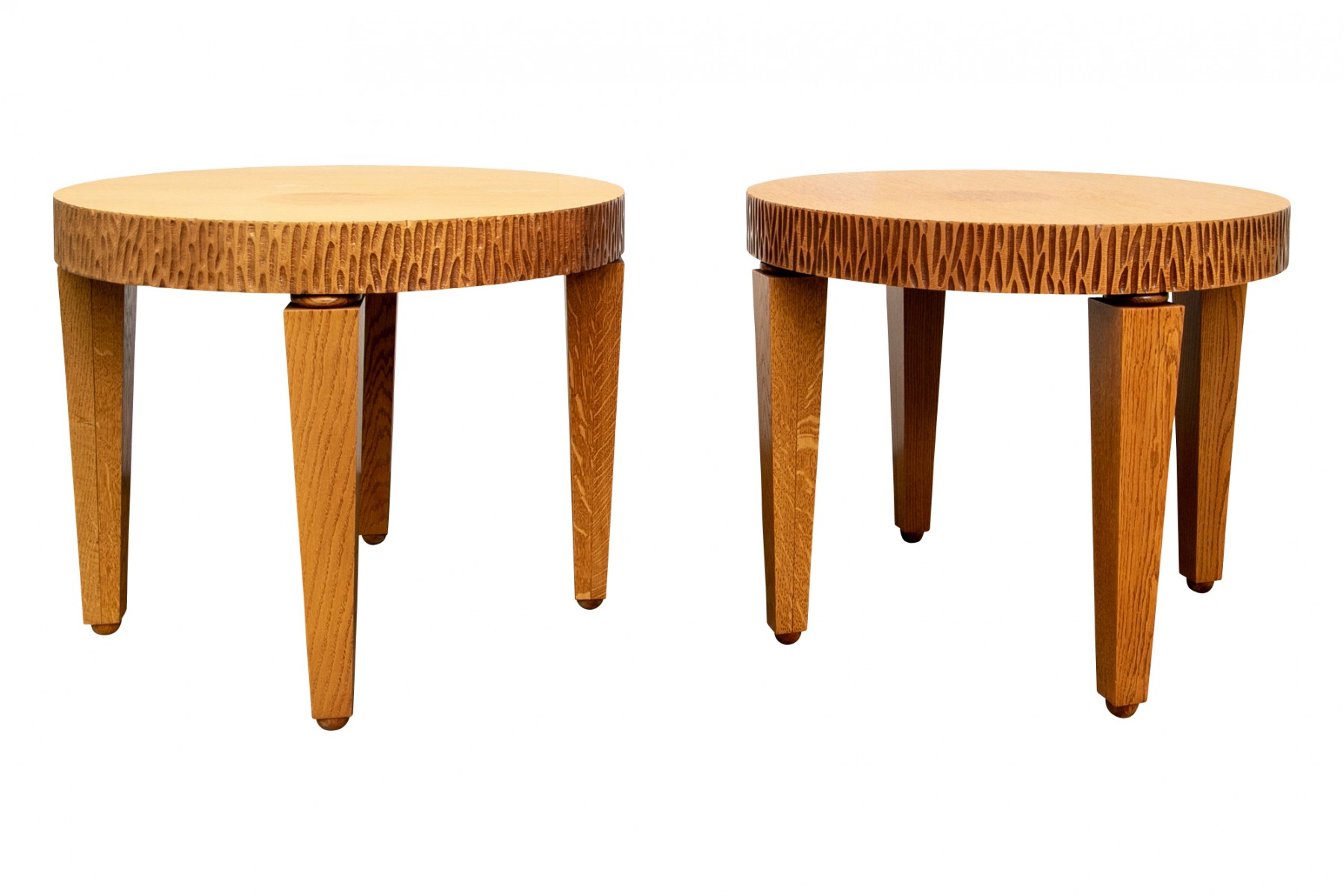 A Rustic and stylish Pair of round oak simulated bark edge side tables with tapering legs.