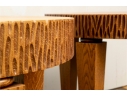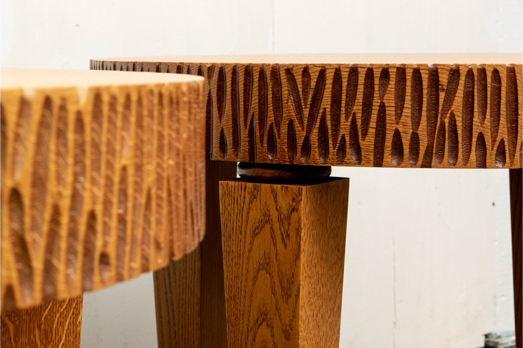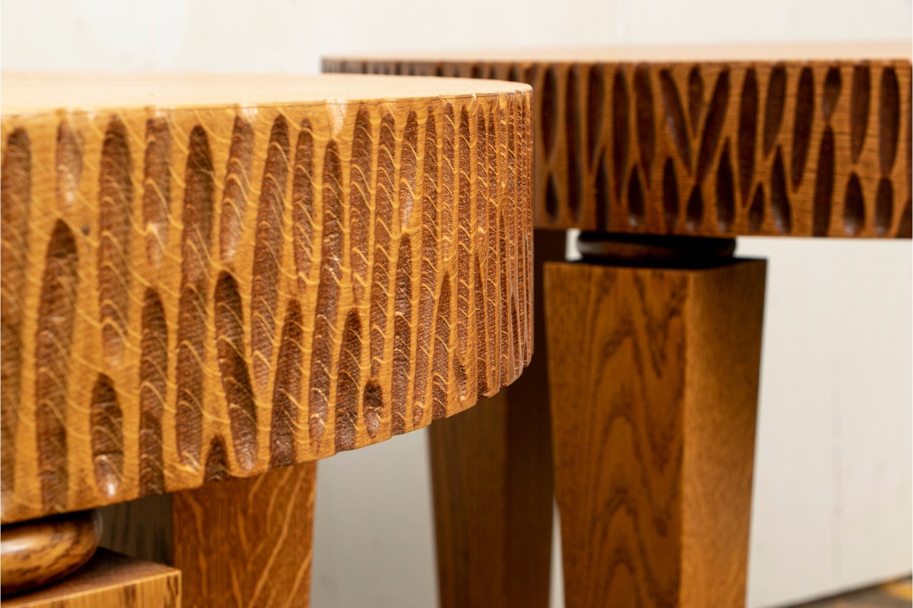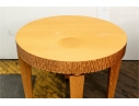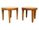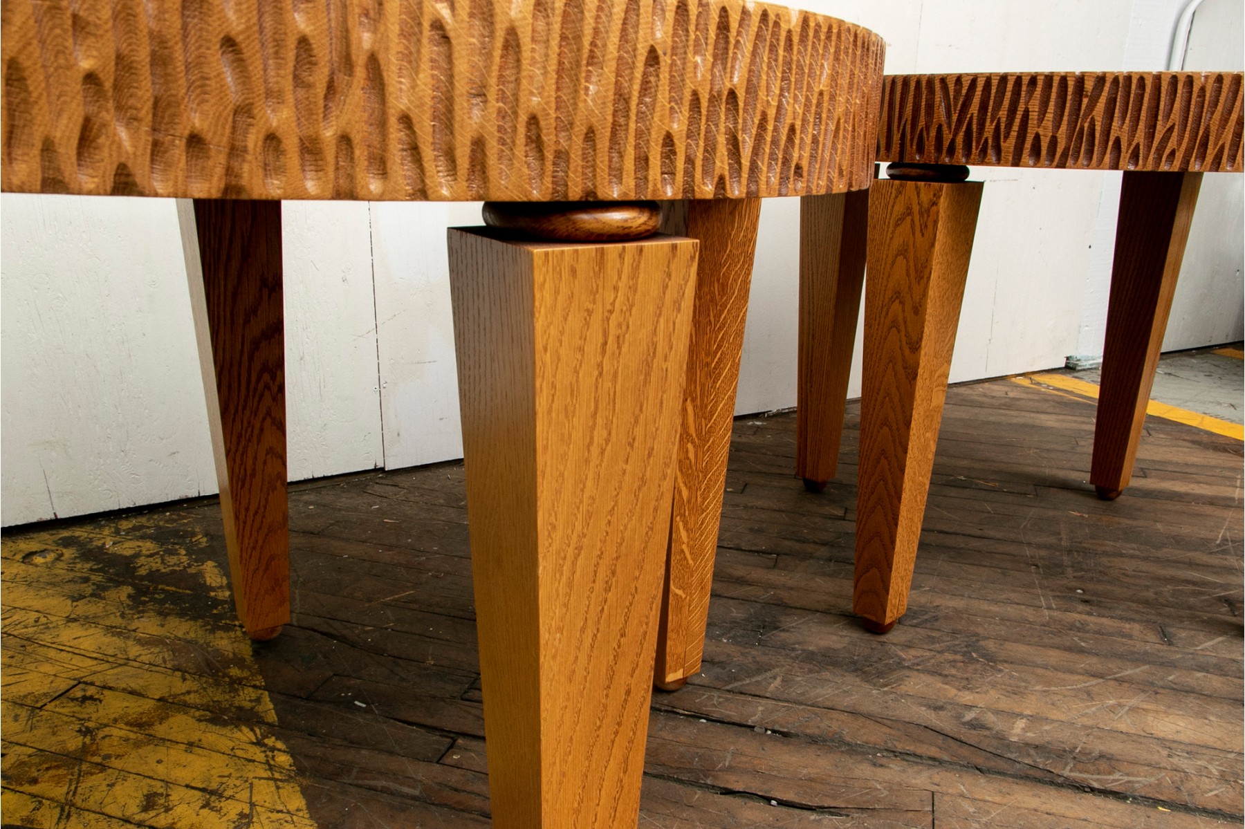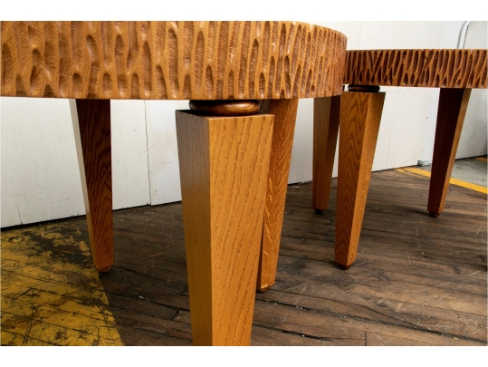 A Rustic and stylish Pair of round oak simulated bark edge side tables with tapering legs.