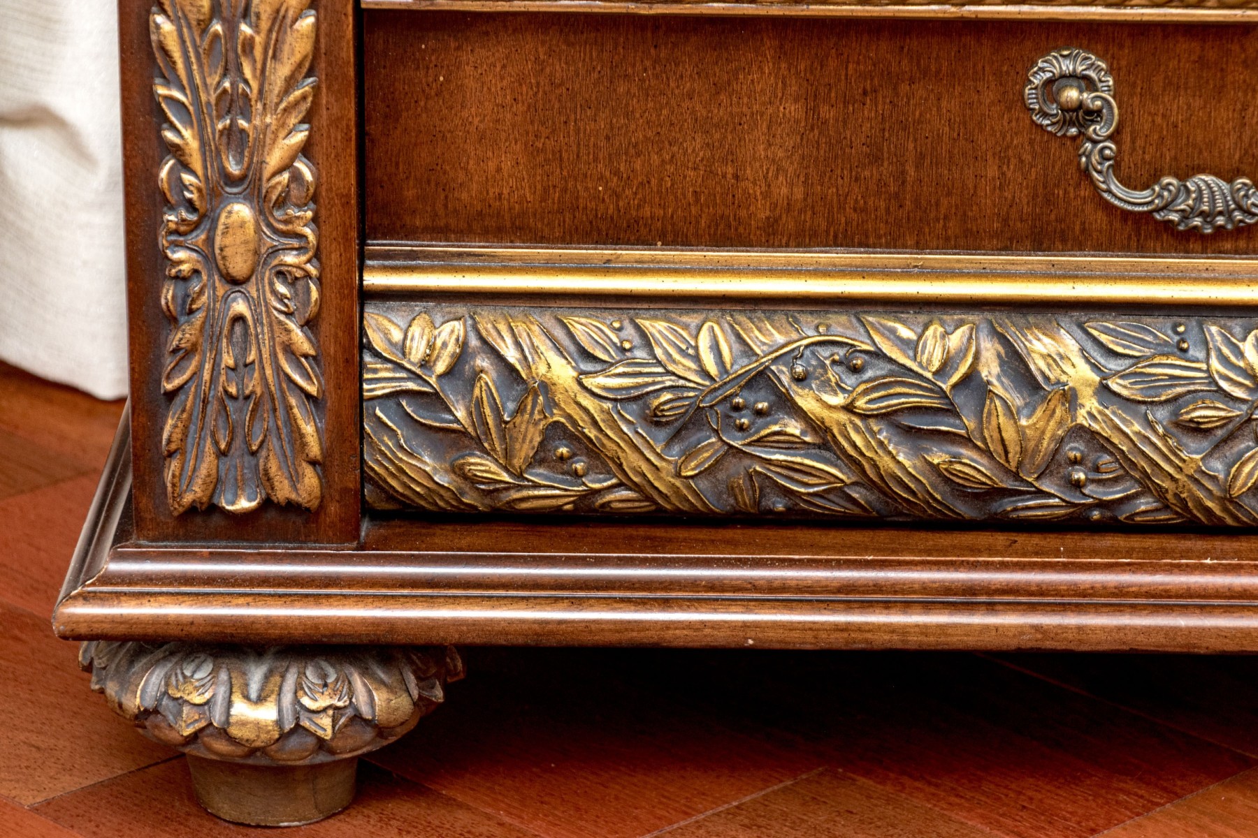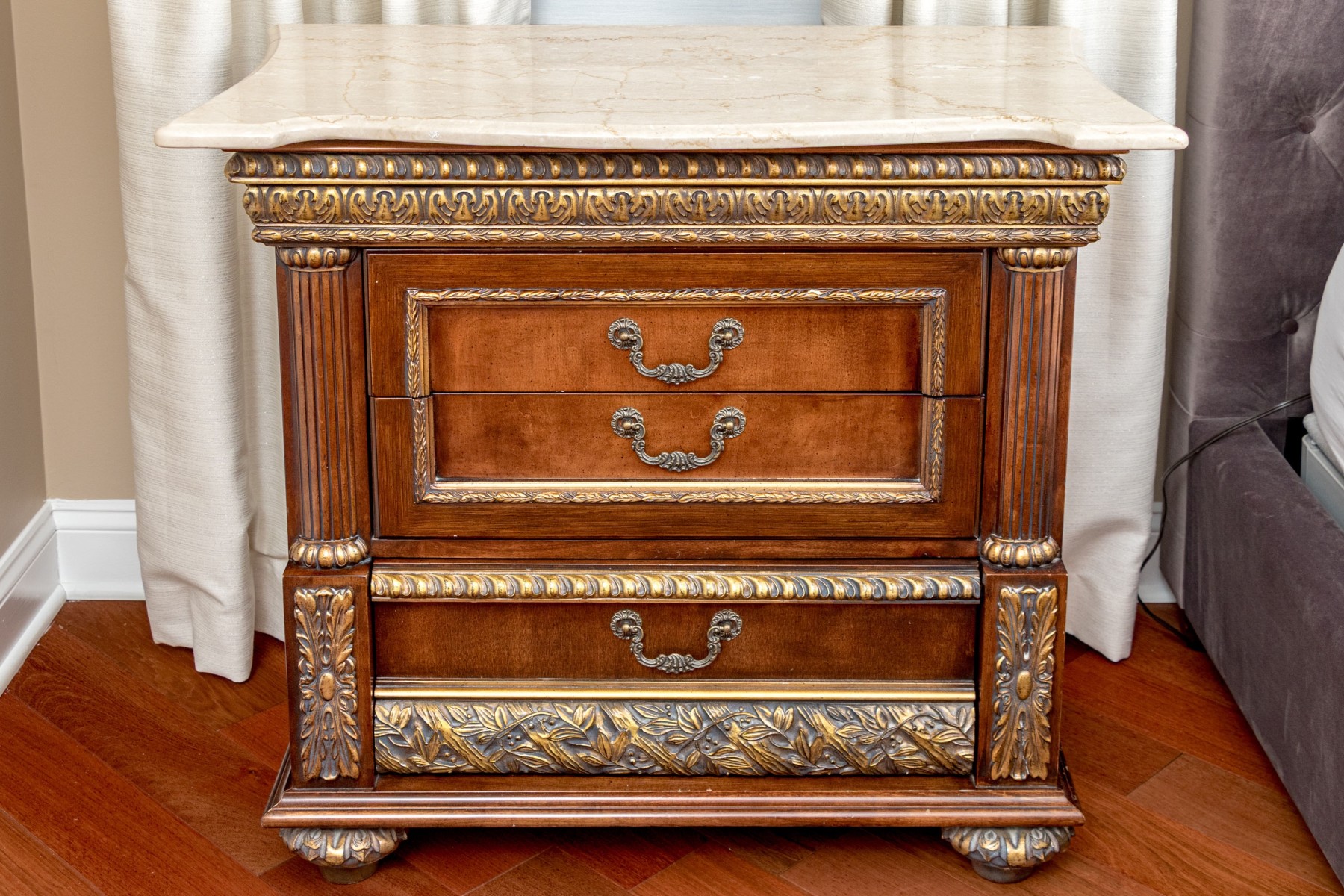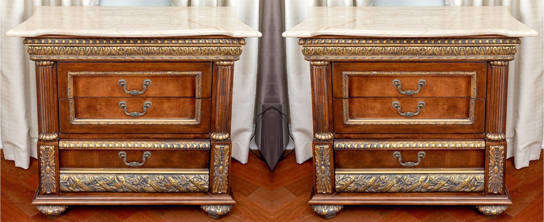 A lavishly decorated pair of Pulaski "Bellissimo" end table or nightstands designed with ornate Renaissance and Baroque influence. The end tables sport sleek white marble tops with fine gray and orange veining, set over two beautifully paneled with opulent gilt carved relief borders. The drawers are flanked by fluted column motifs leading down to additional single drawers below, raised over gilt bun on peg feet.