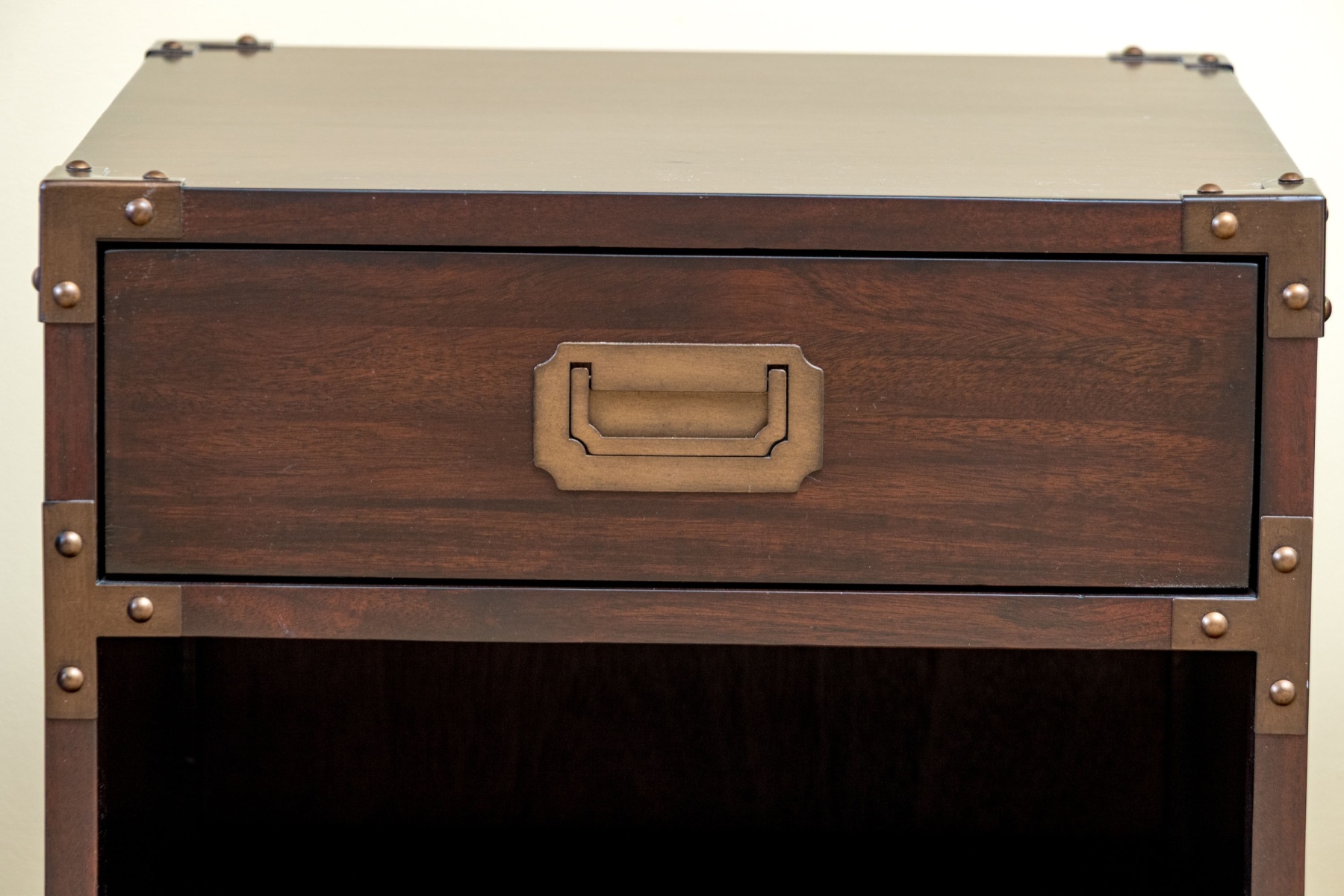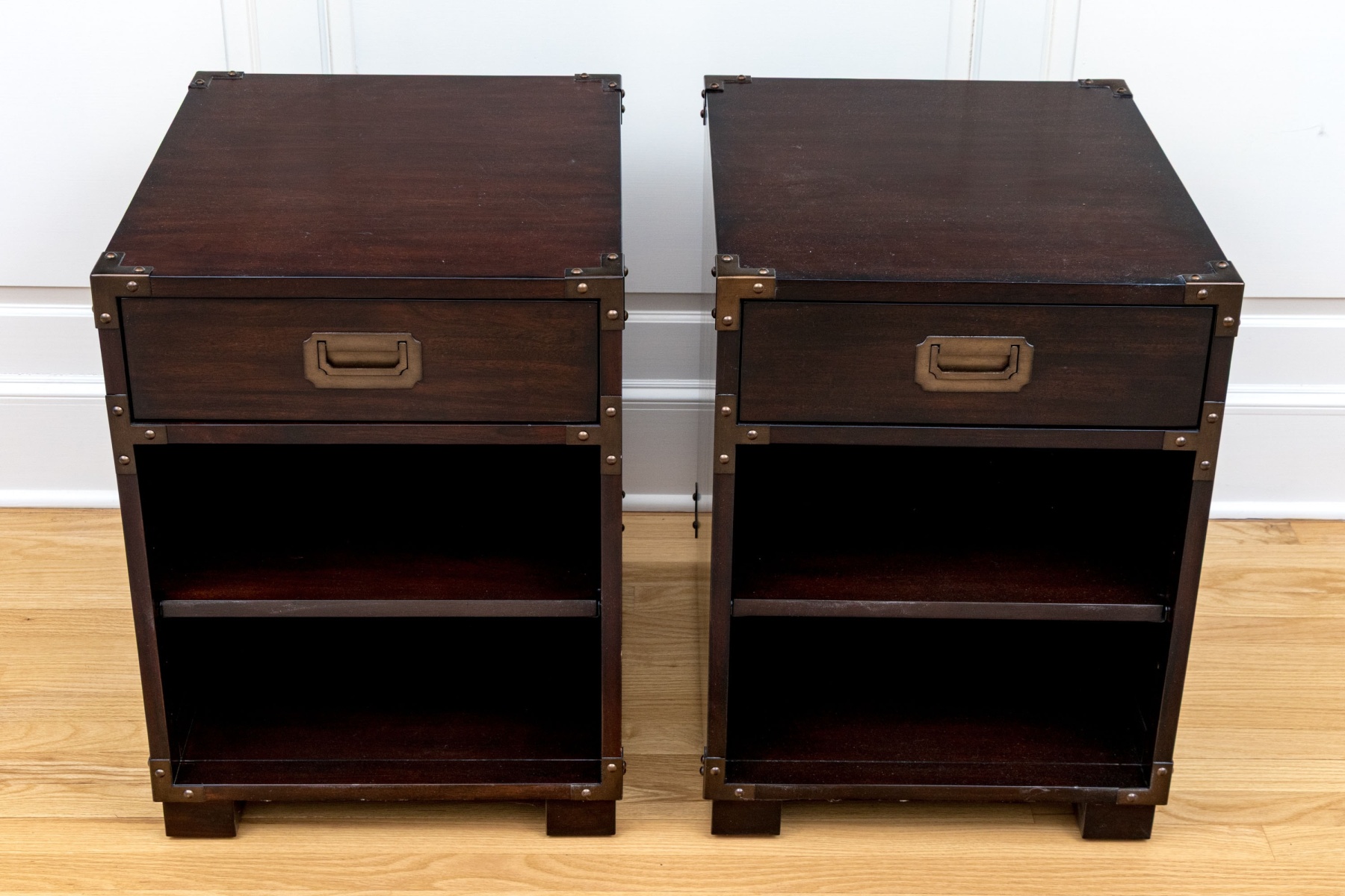 A high quality pair of end tables with traditional campaign style, well crafted in warm-toned dark brown wood with brass brackets at the corners of rectangular tabletops. Below, single drawers are adorned with brass flush handles over two-tier compartments raise on simple block feet.
