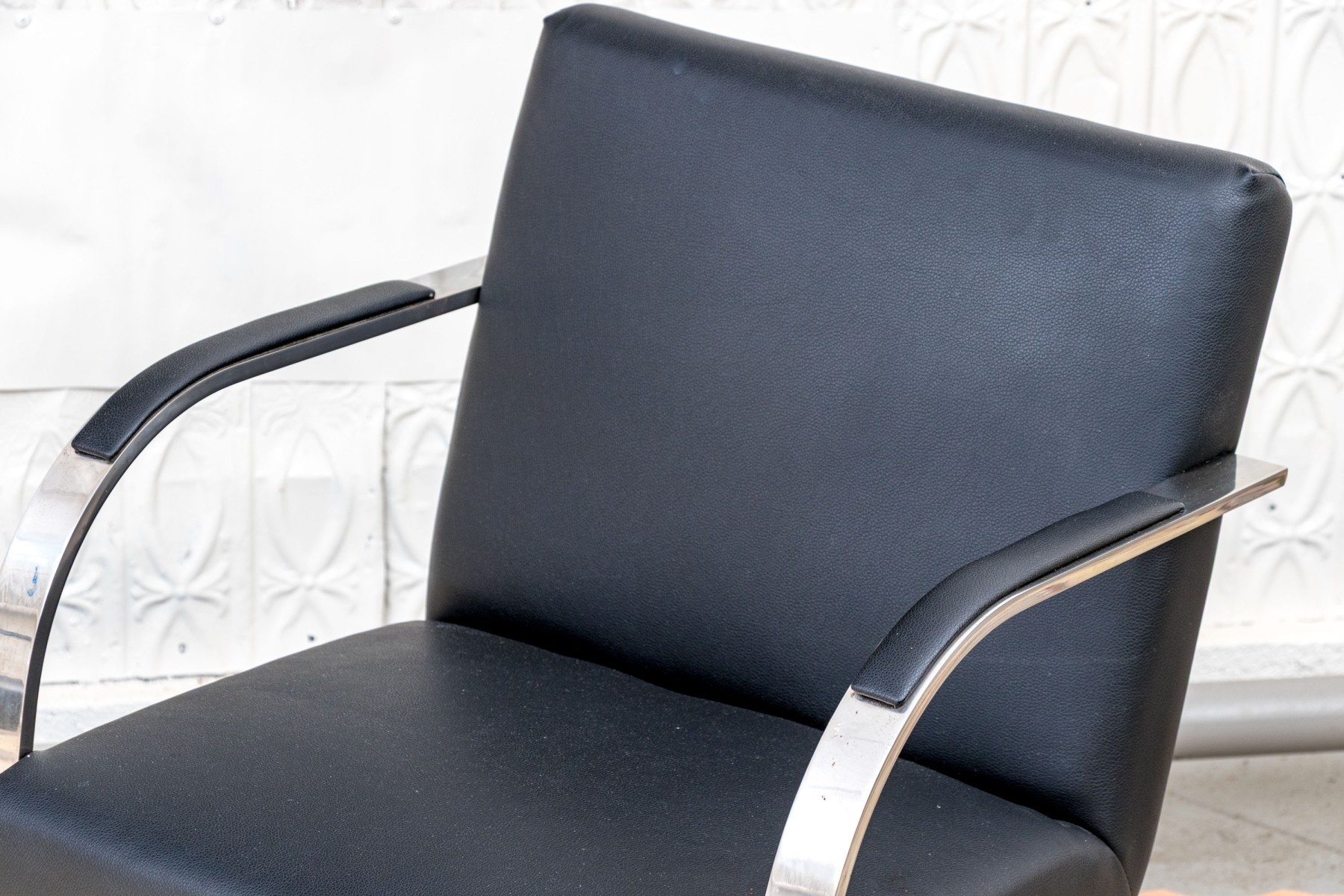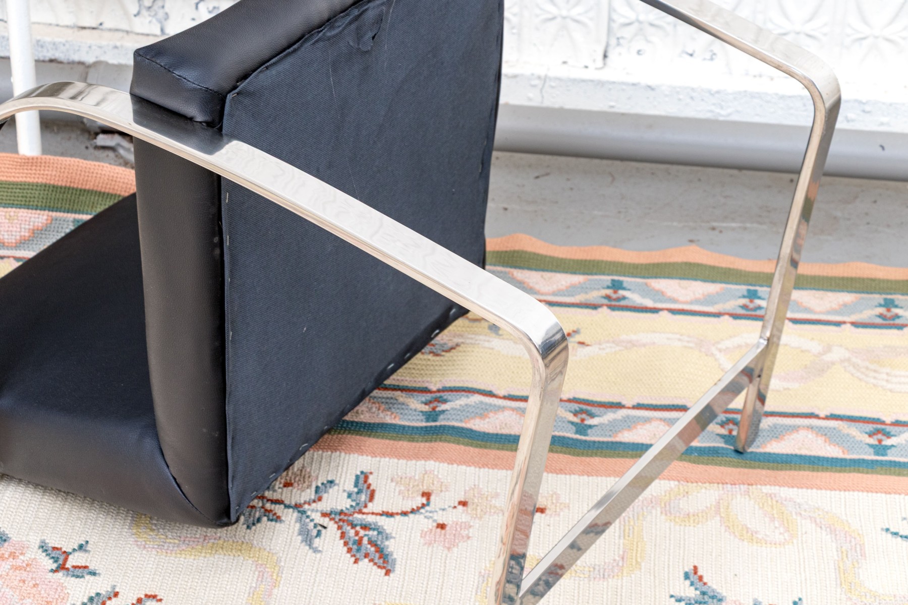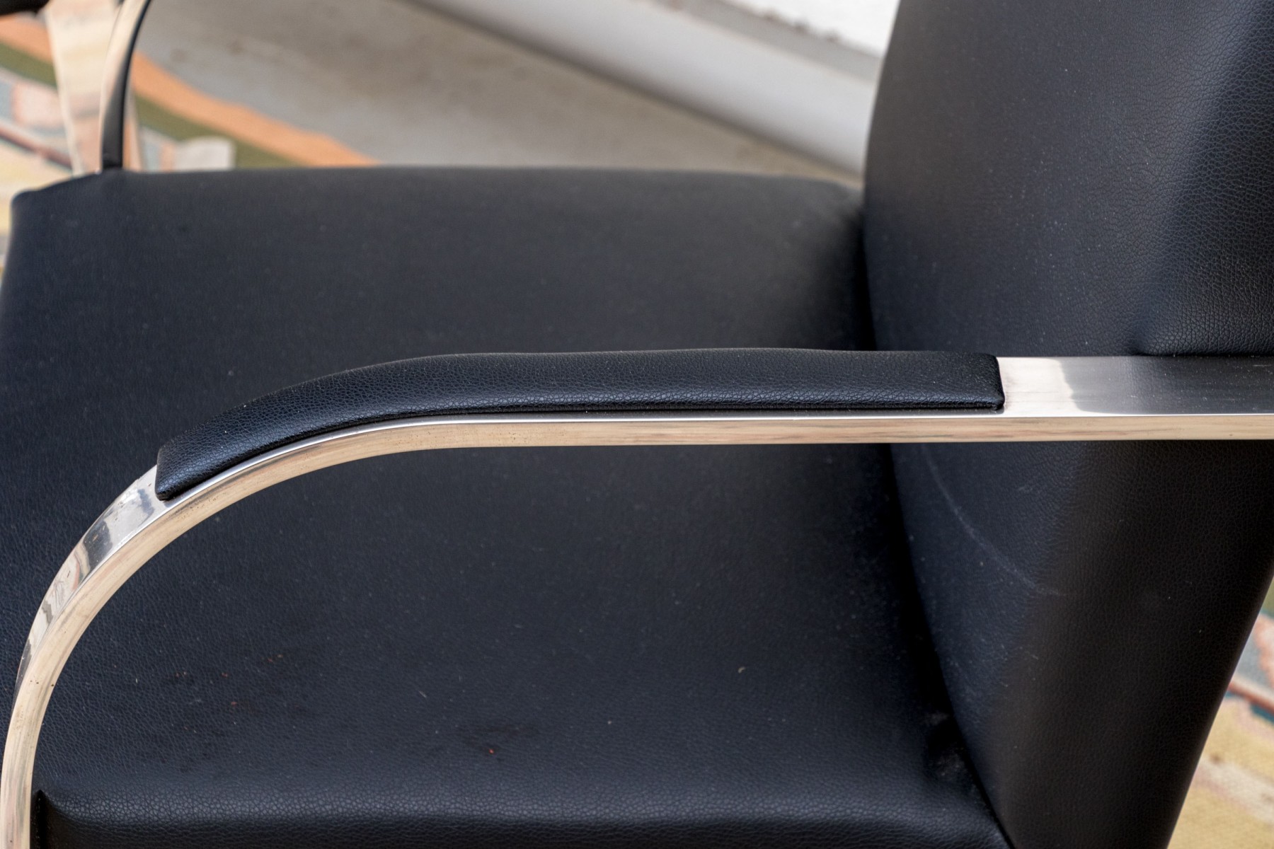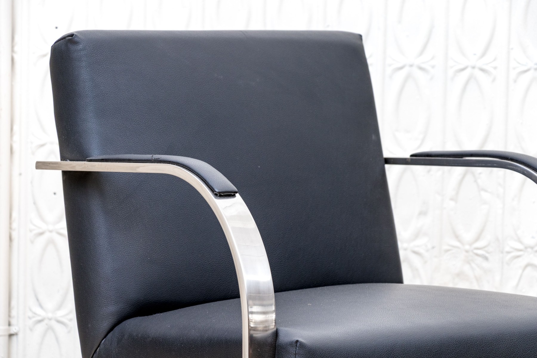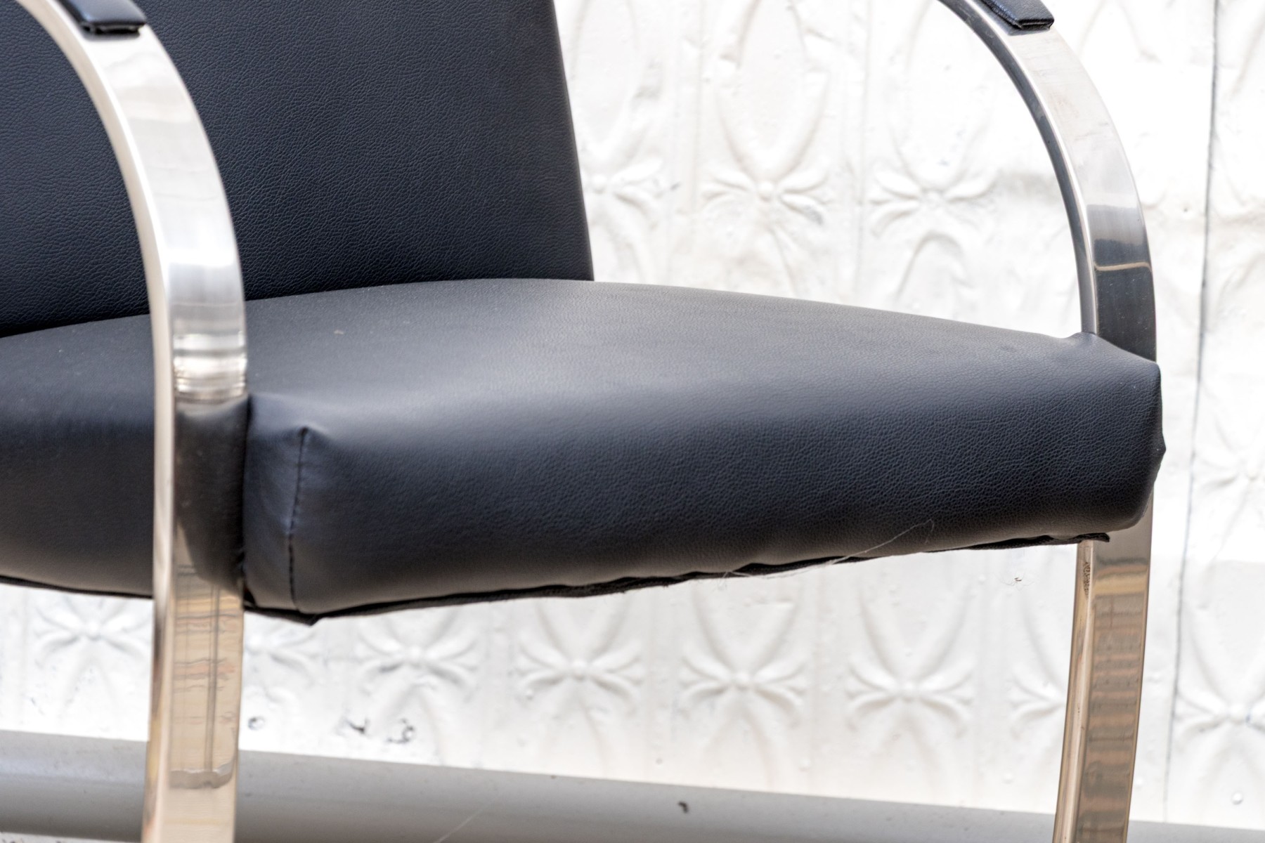 A fine pair of high quality armchairs in the manner of Mies Van der Rohe for Knoll "Brno" showcasing rectangular backs and seats upholstered in black leatherette with chrome waterfall arm leading into cantilever frame with H-stretchers.