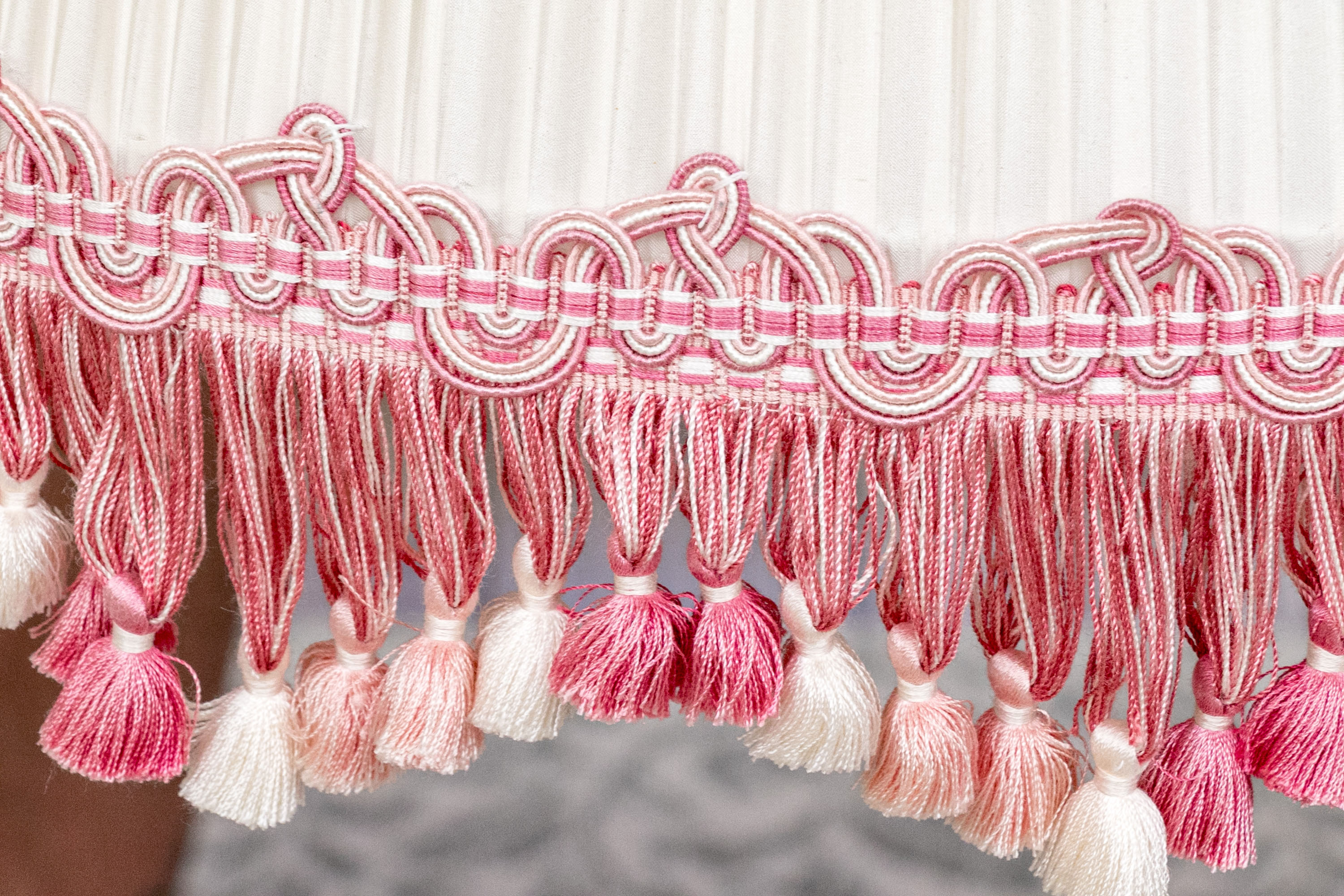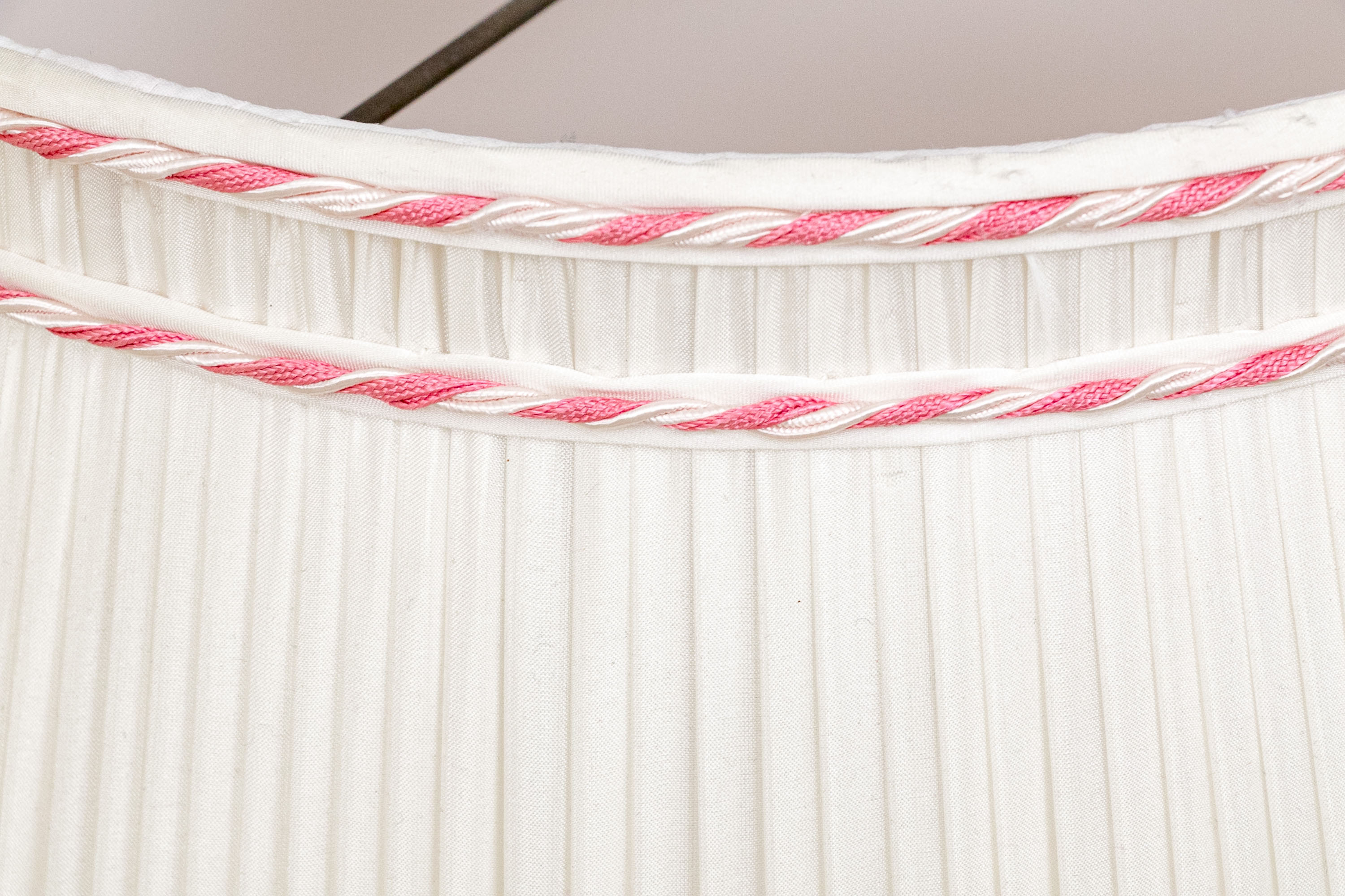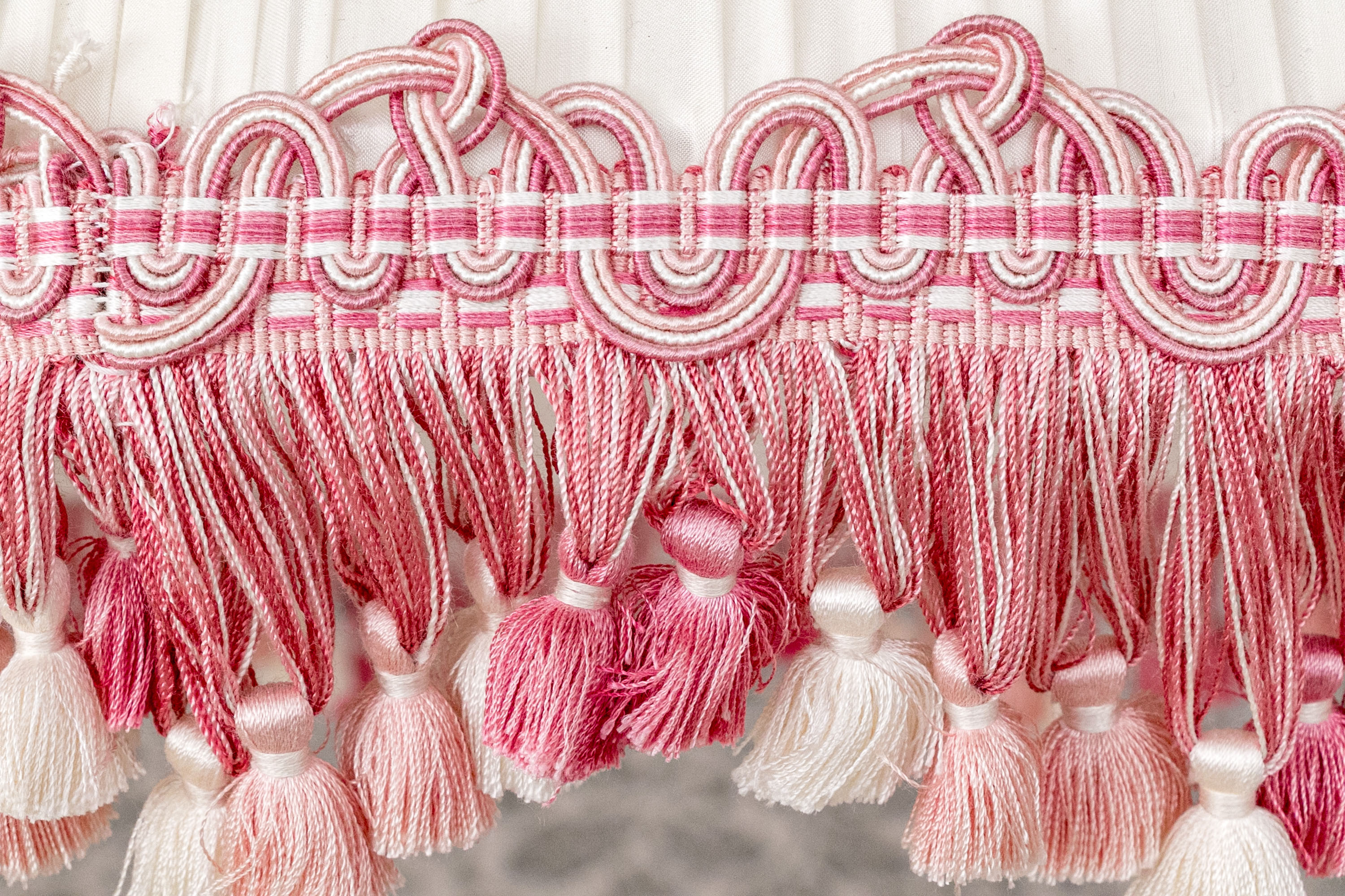 A chic pair of high quality empire lamp shades in finely plated white fabric detailed with white and pink textural twist ropes around the top and a gorgeous trim of white and pink tassel fringe sporting excellent texture.
