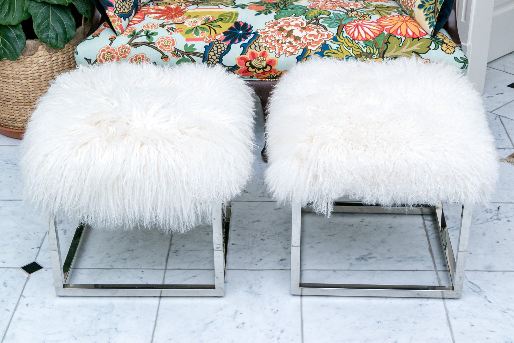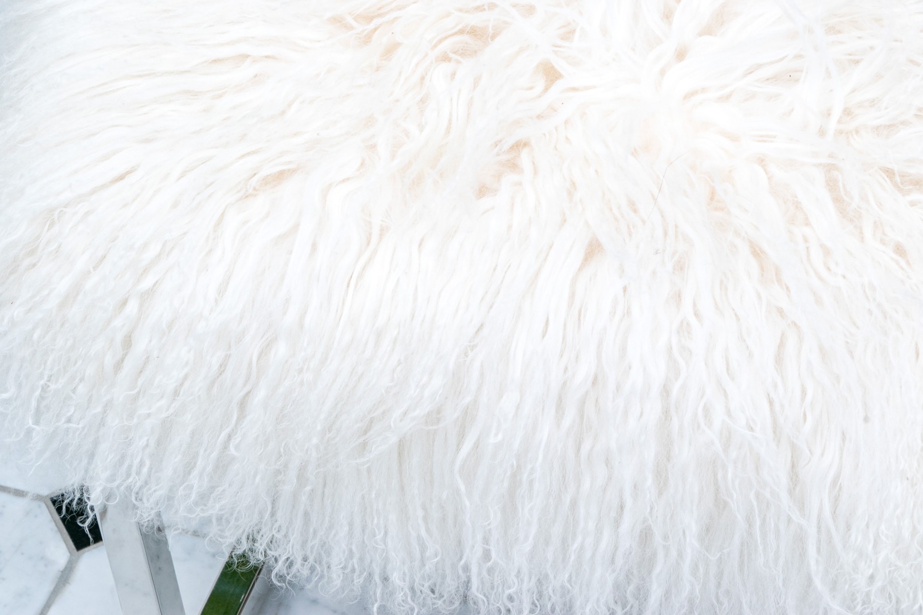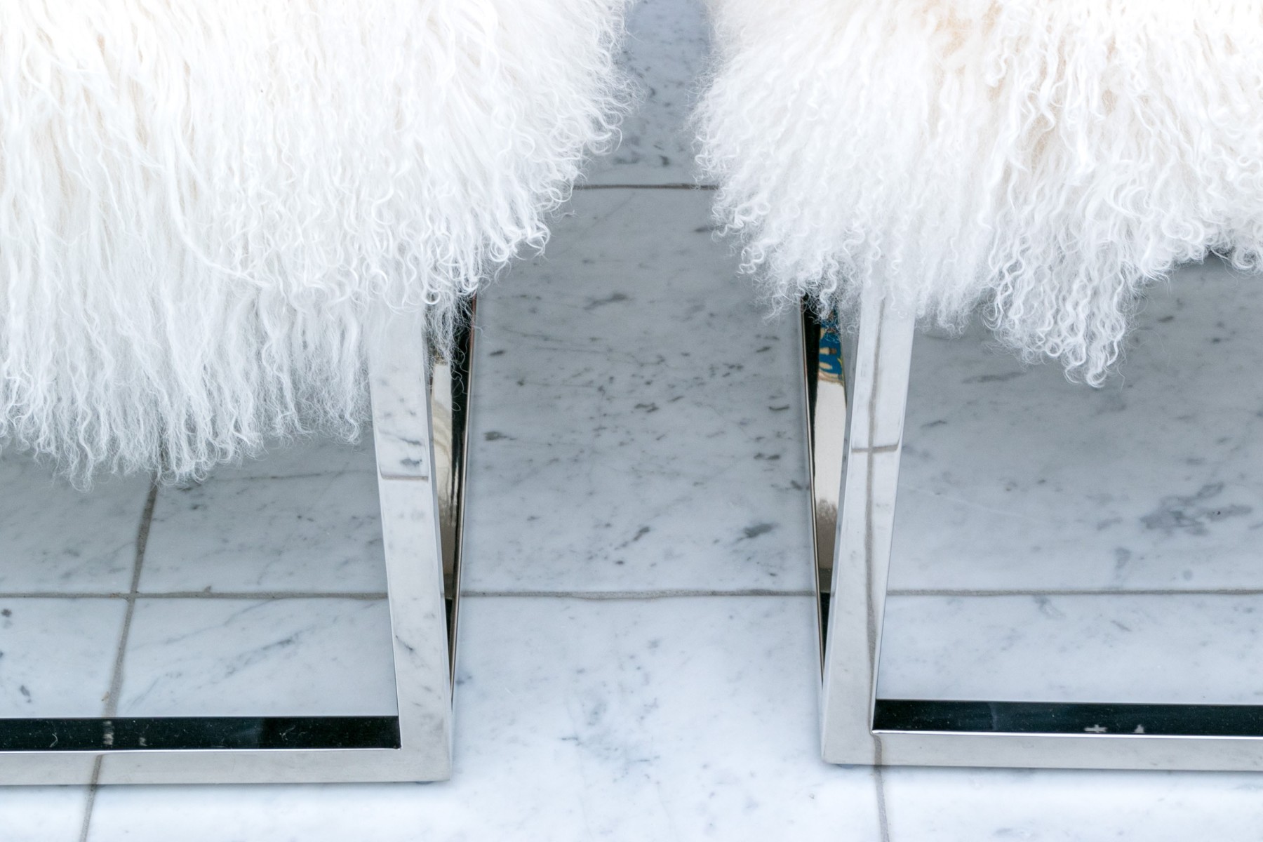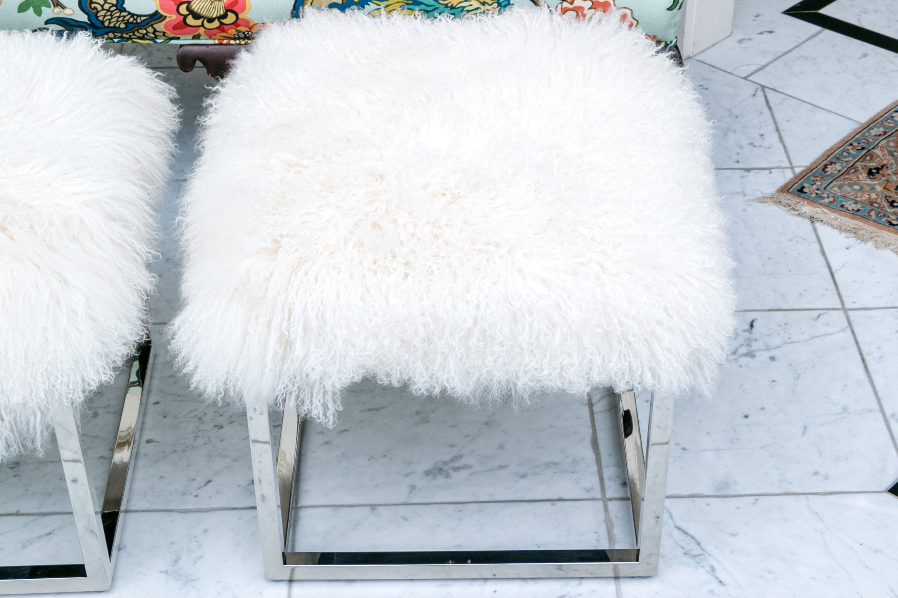 A quality pair of stools showcasing luxuriously plush, white Mongolian lambswool seats over chic, minimalistic chrome frames.