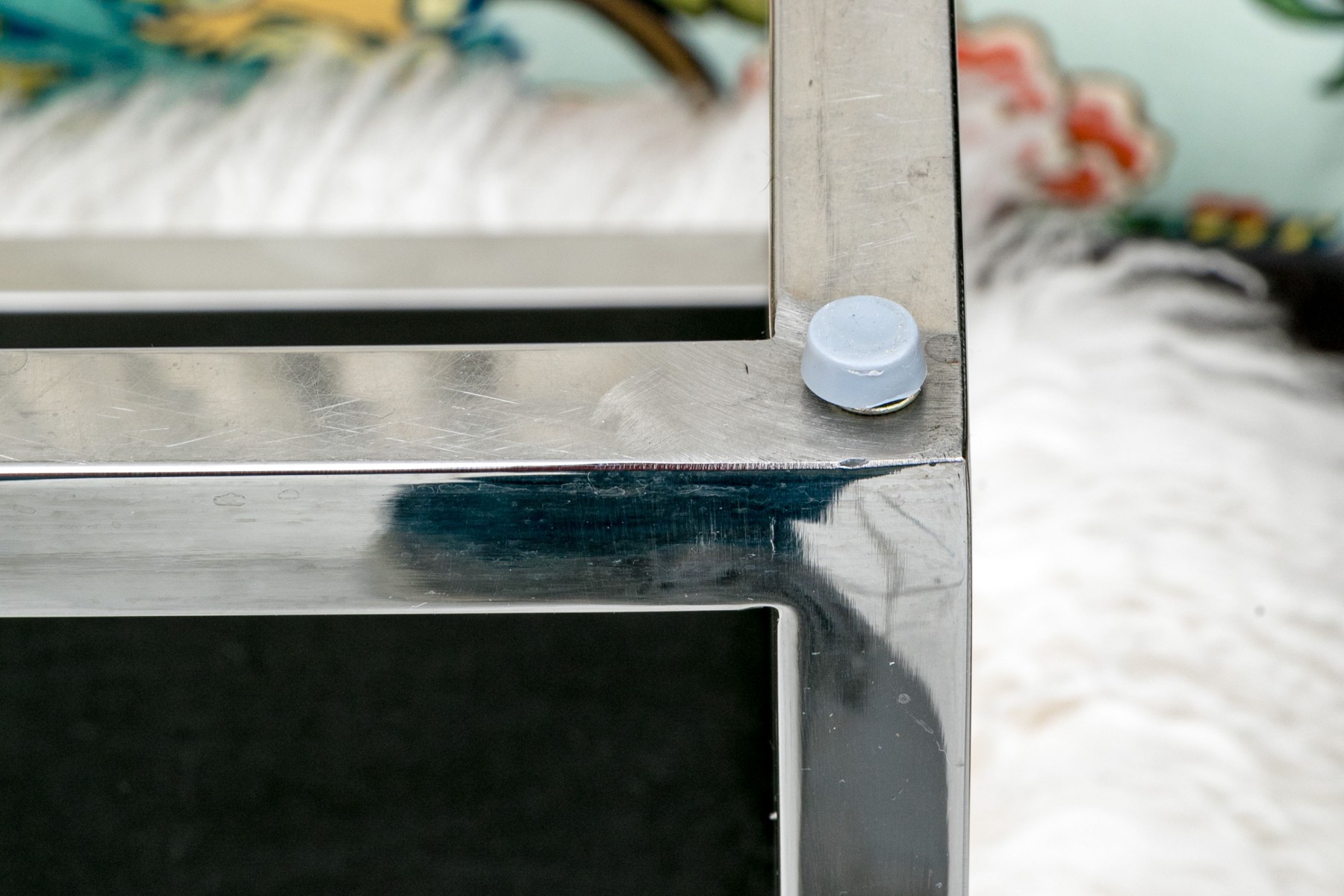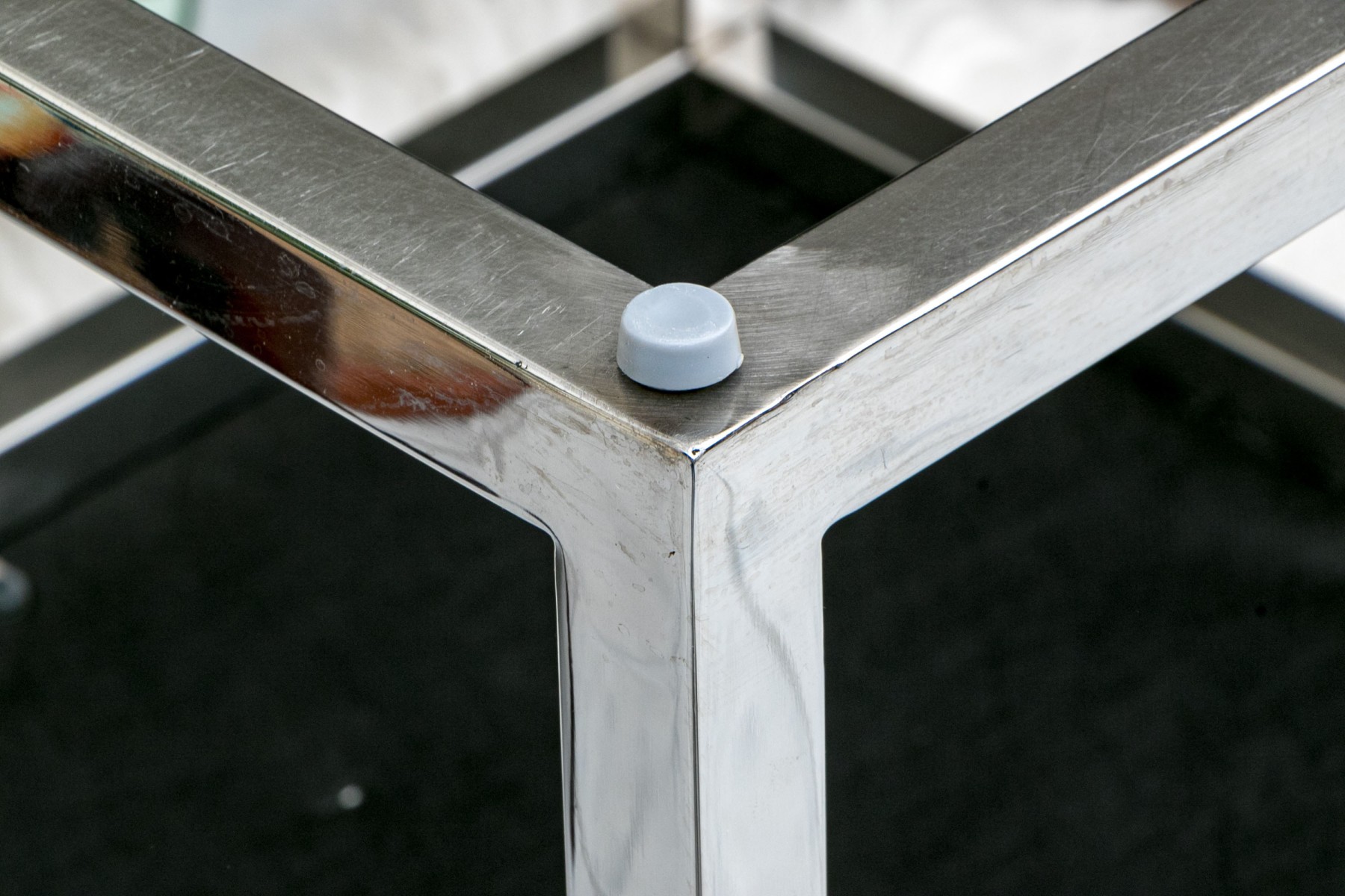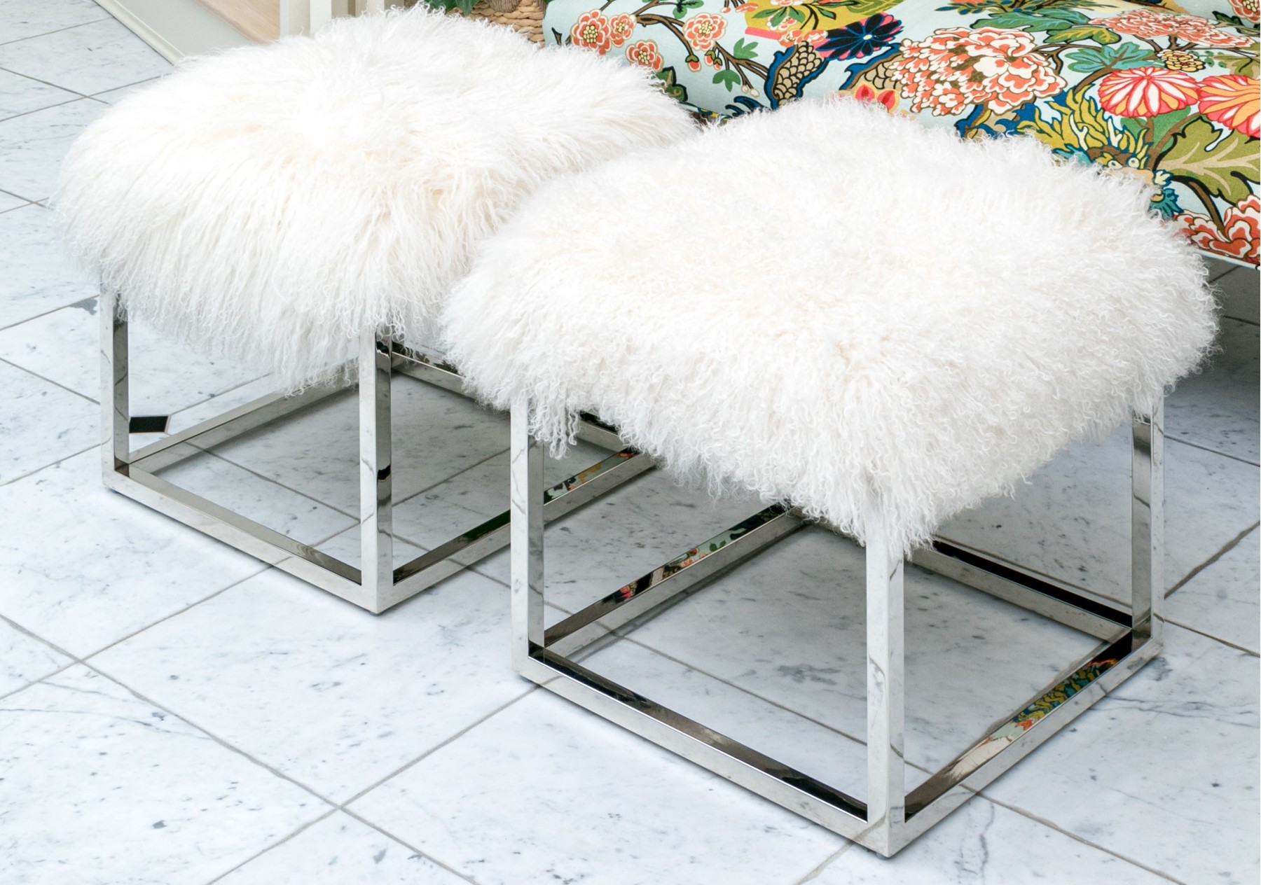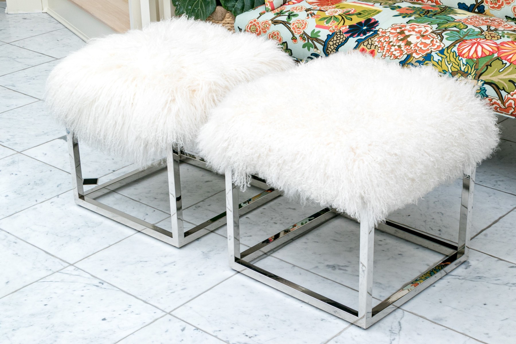 A quality pair of stools showcasing luxuriously plush, white Mongolian lambswool seats over chic, minimalistic chrome frames.