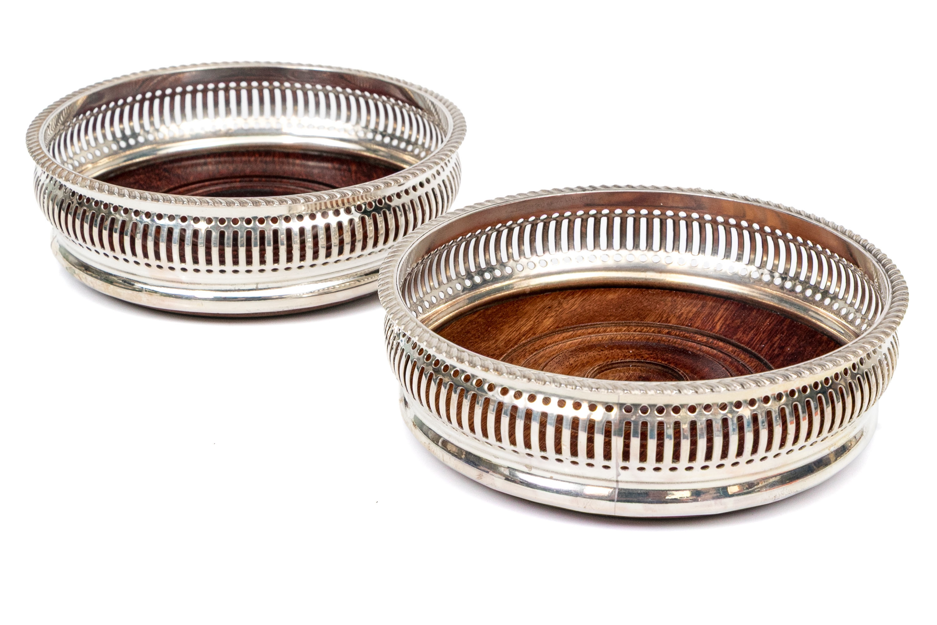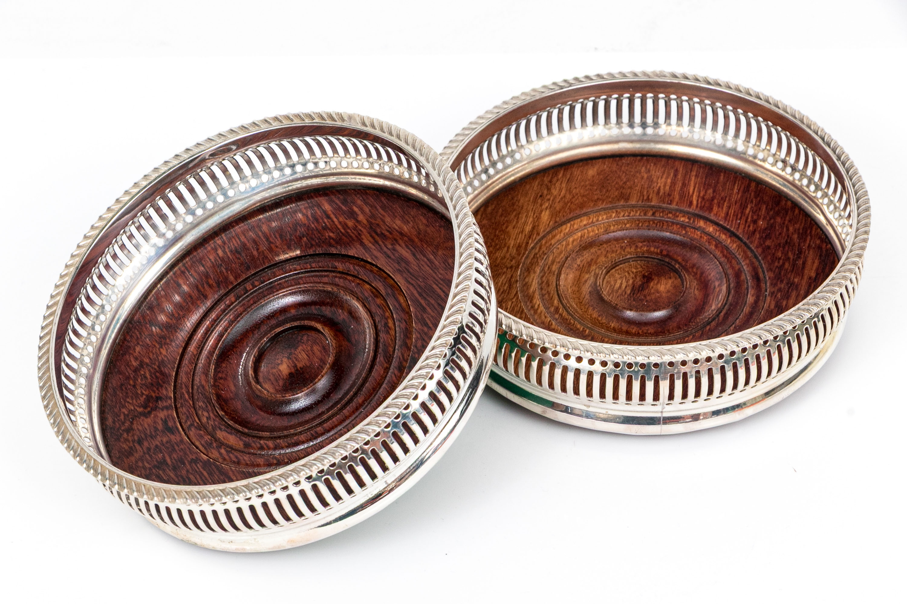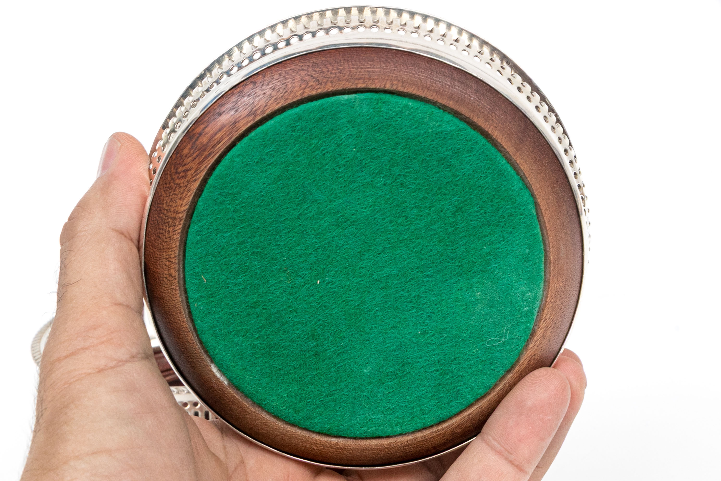 Openwork silverplate frames for the wood bases with green felt on the bottom.