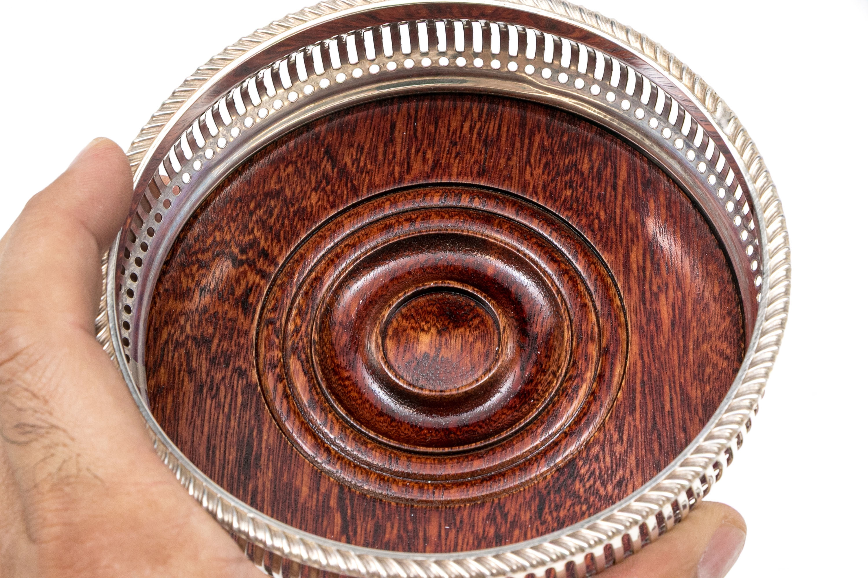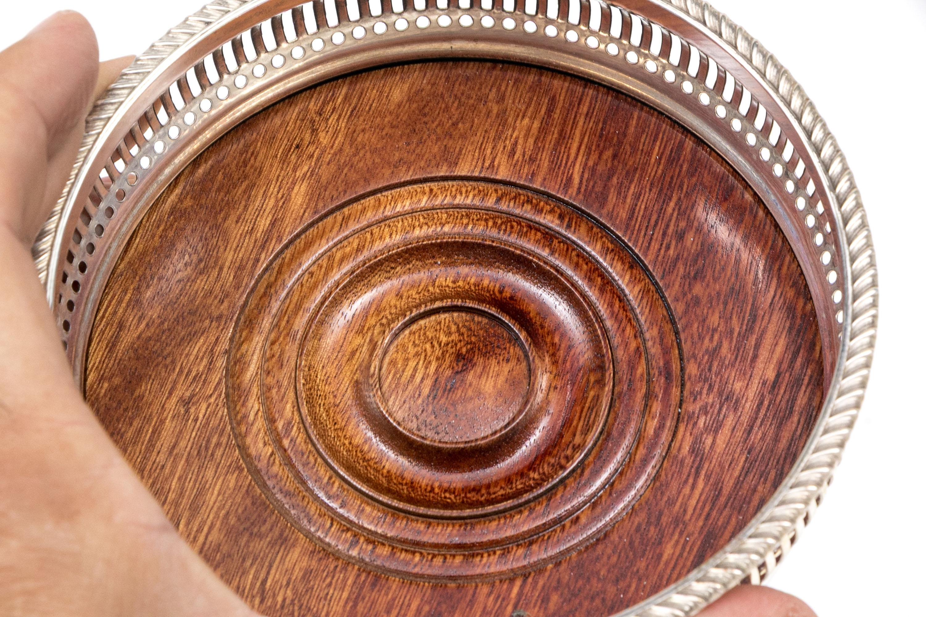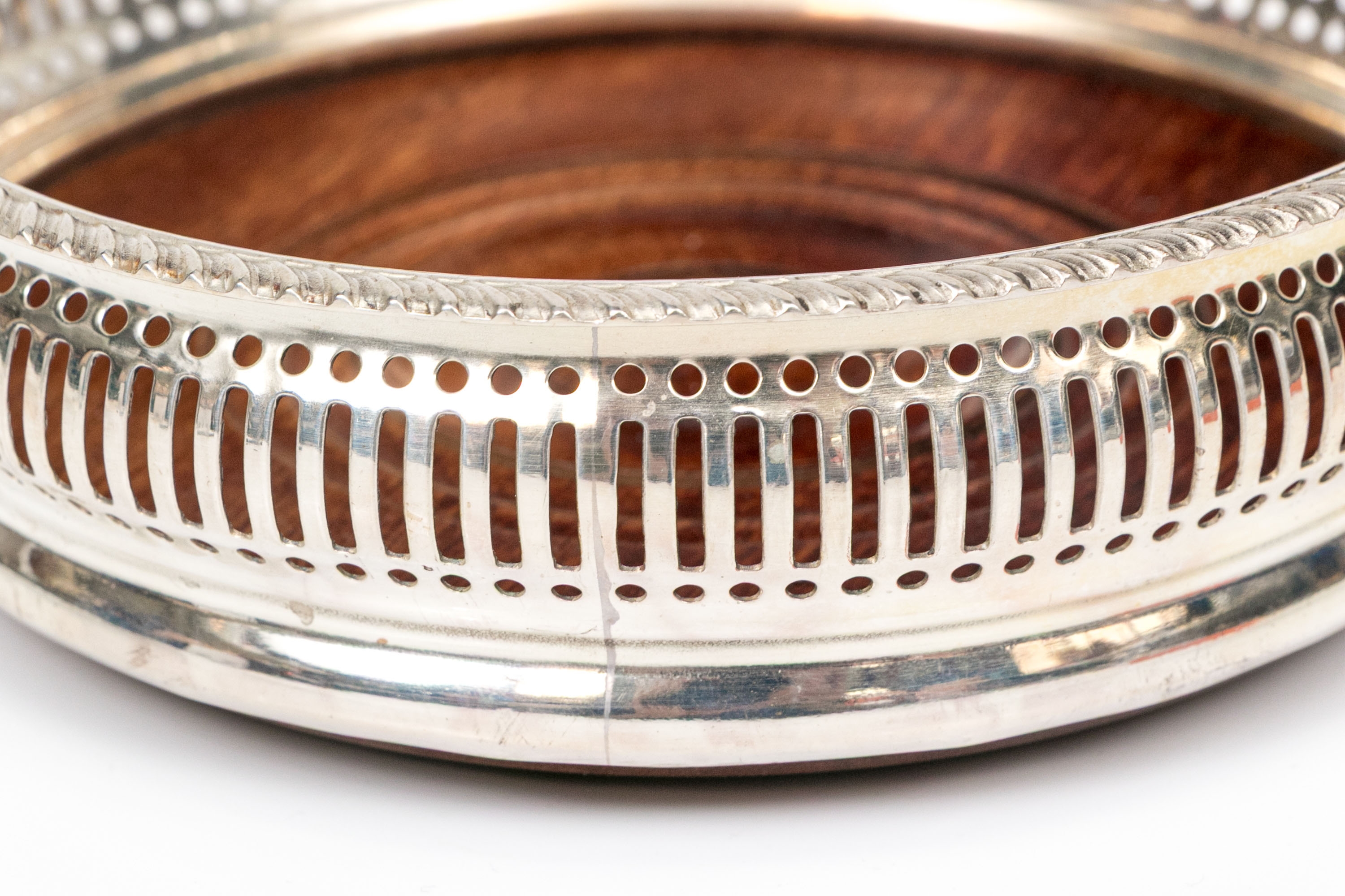 Openwork silverplate frames for the wood bases with green felt on the bottom.