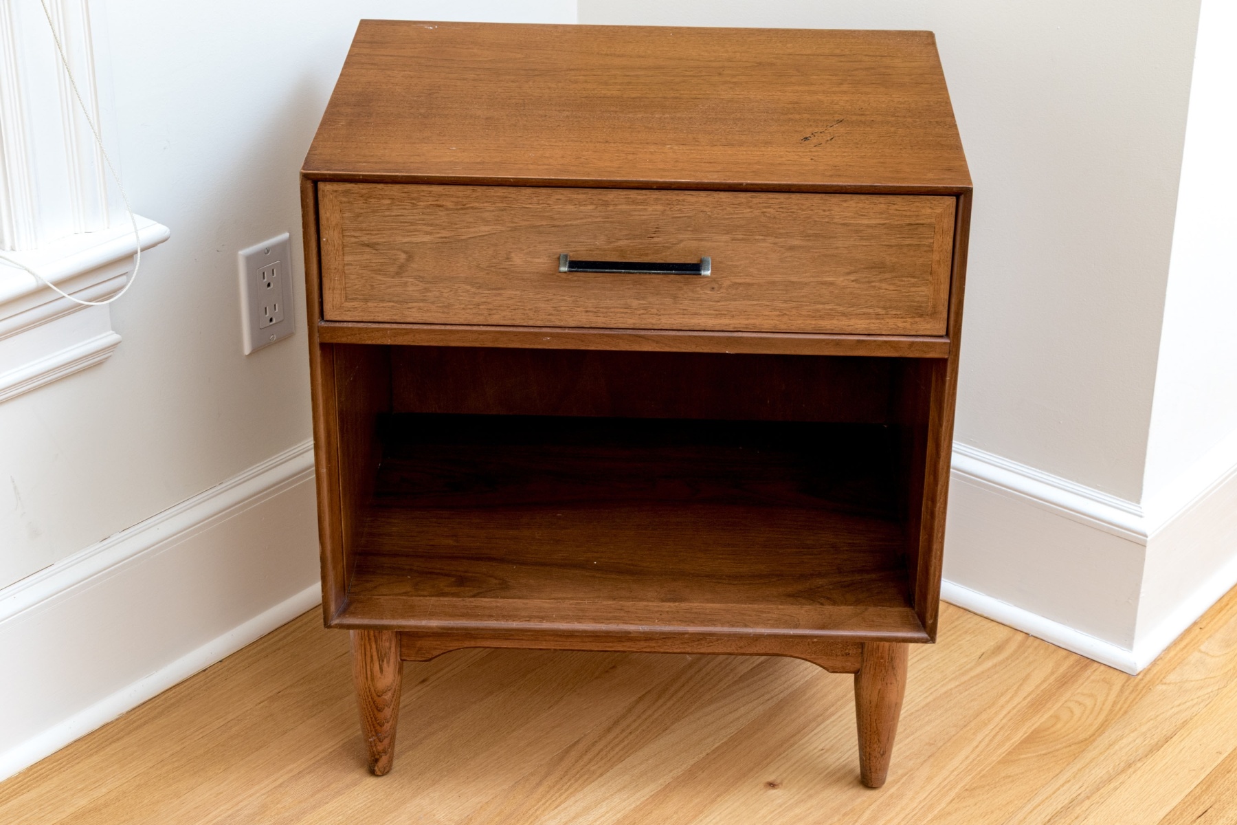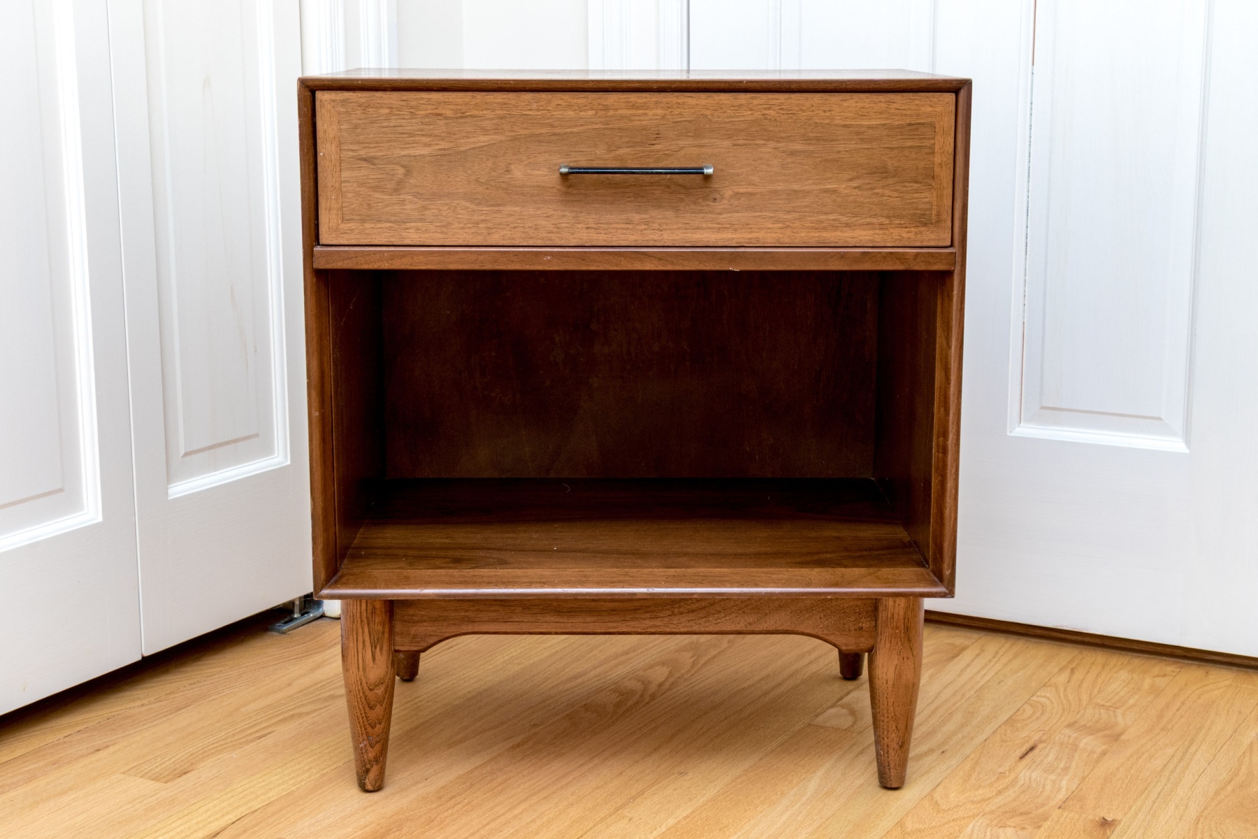 A high quality pair of Ramseur Furniture Co. nightstands with great mid-century modern appeal, each raised on cylindrical tapered legs with case having an open shelf below a single drawer with handle.