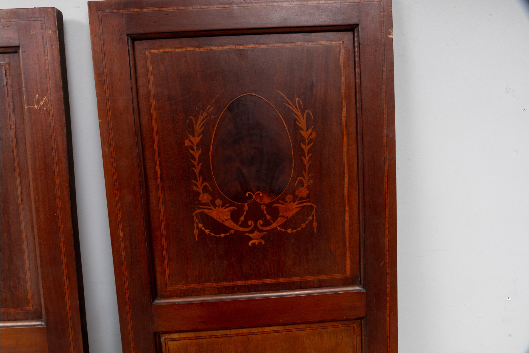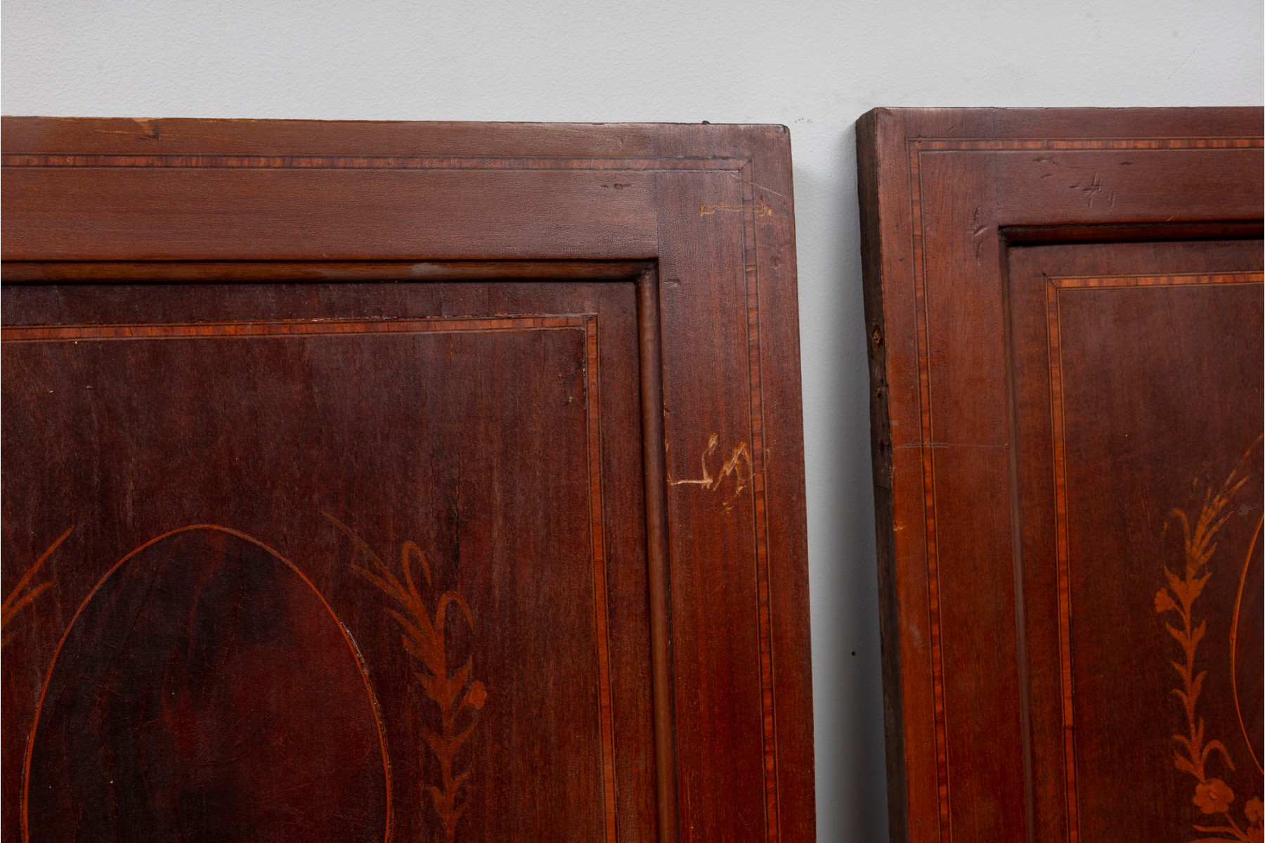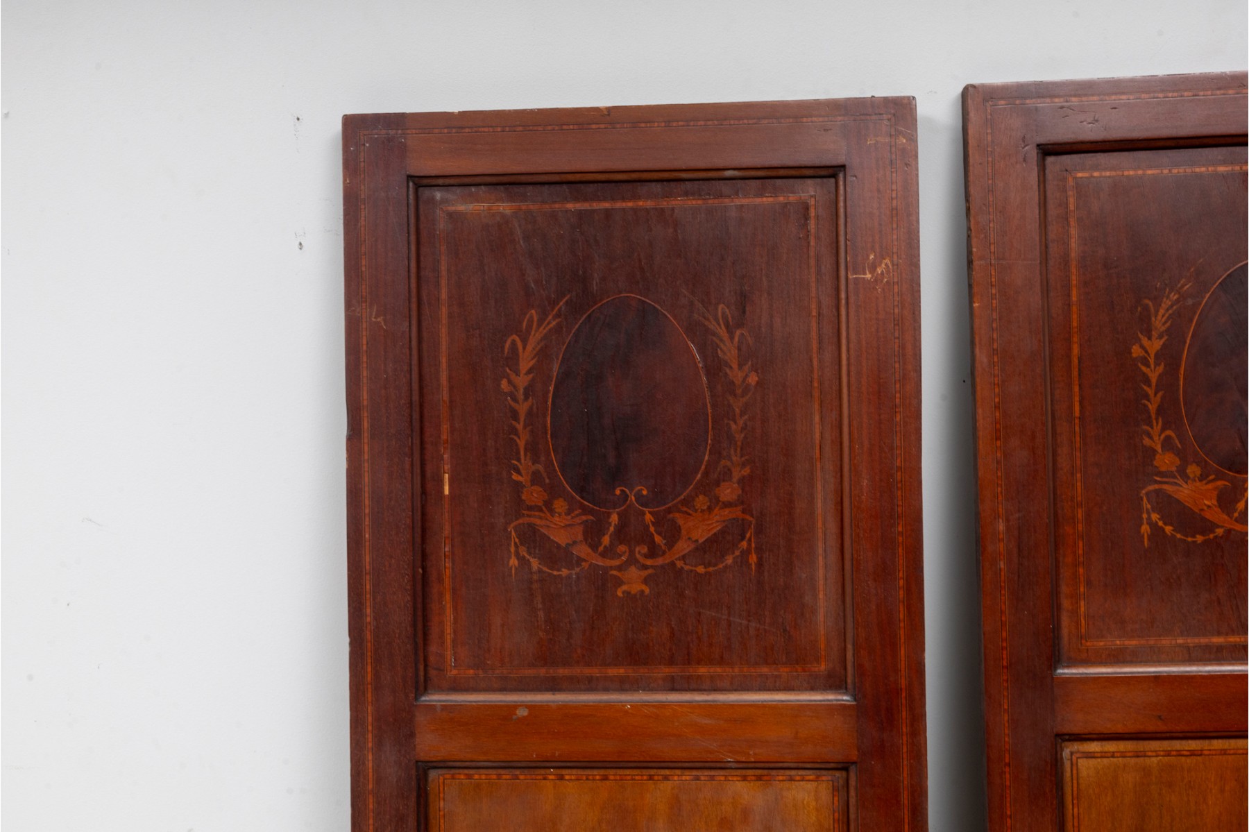 A pair of reclaimed vintage cabinet doors with marquetry details inlaid into solid wood finished in mahogany.