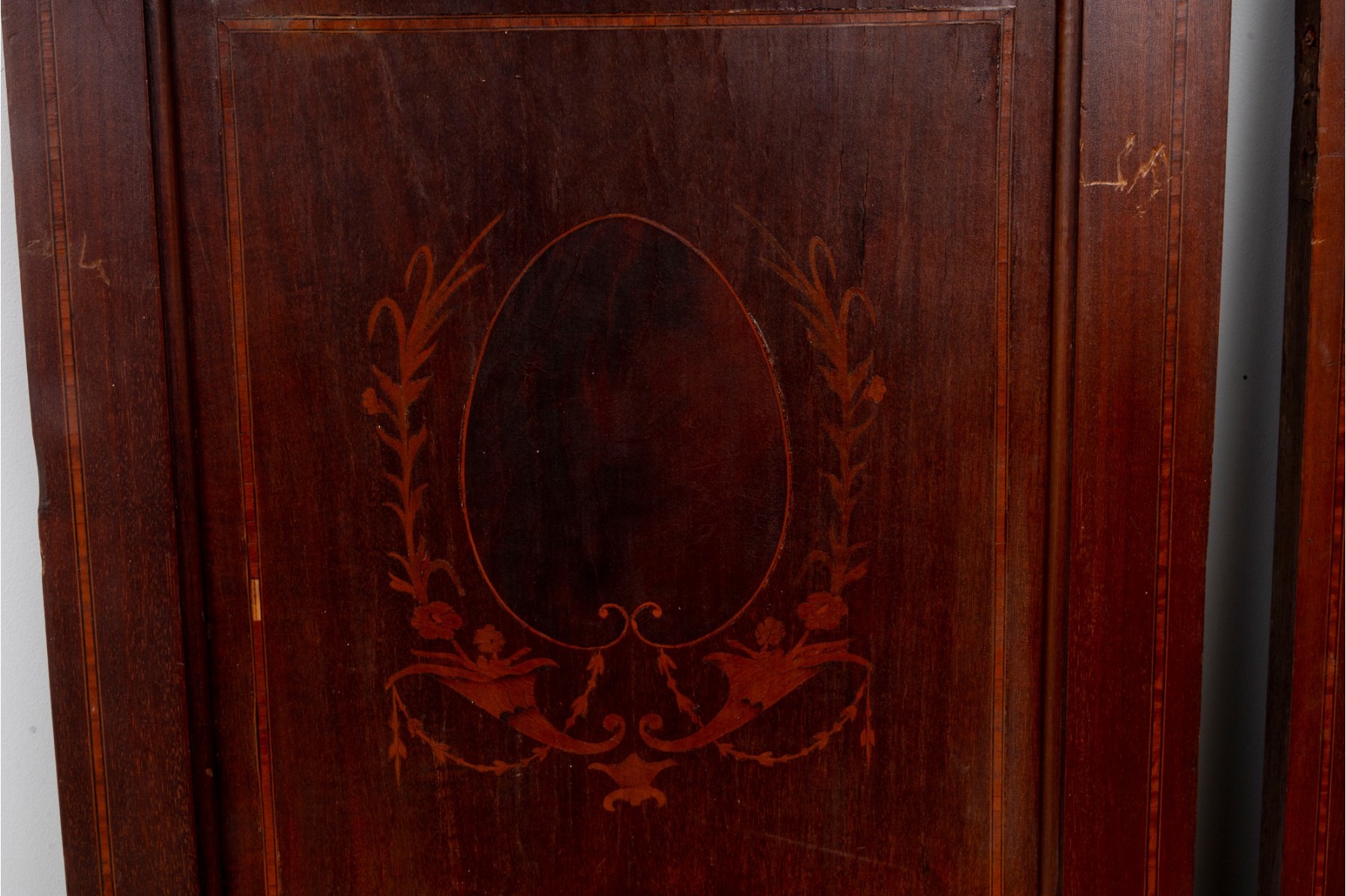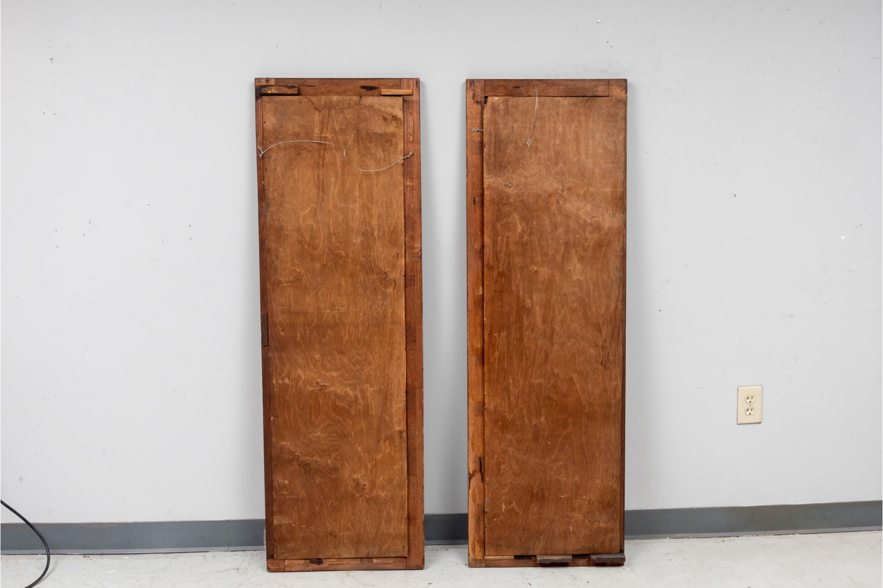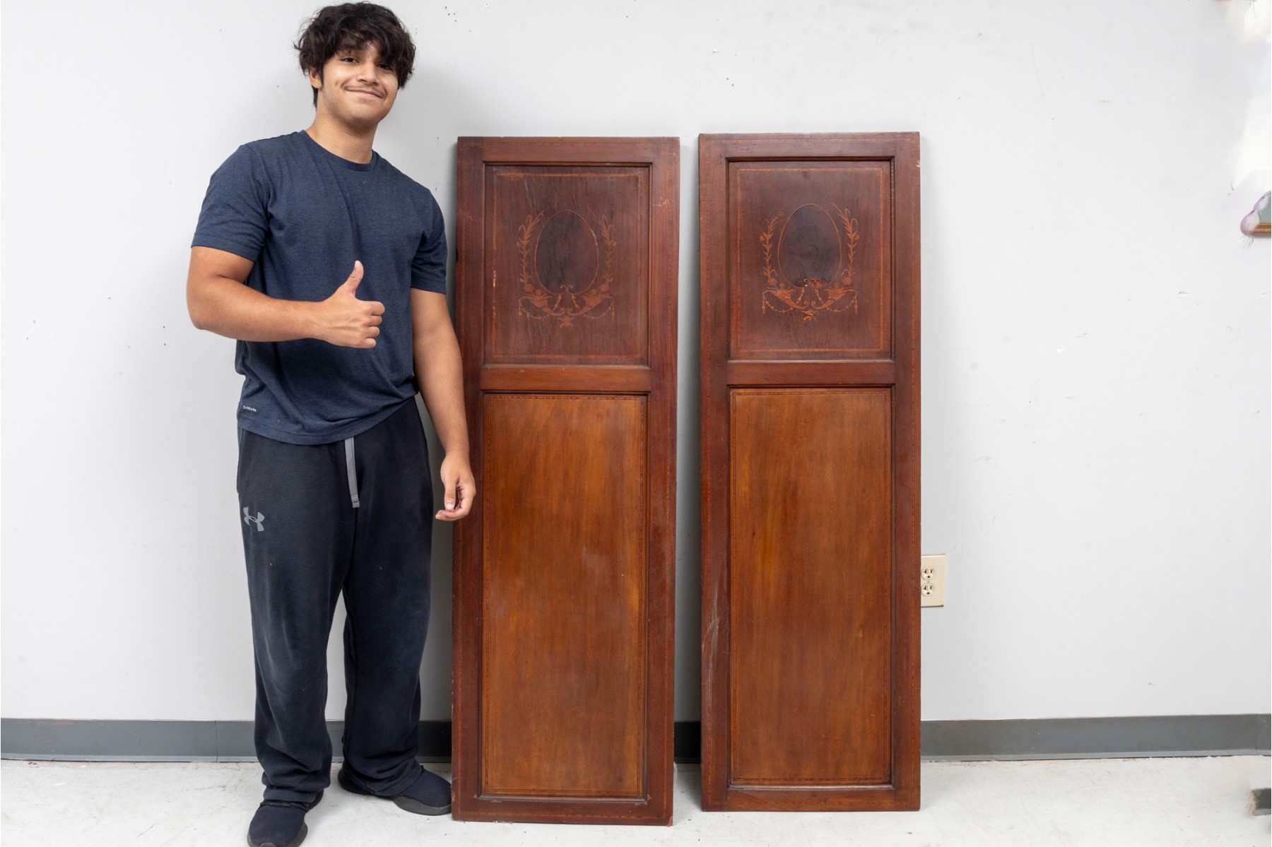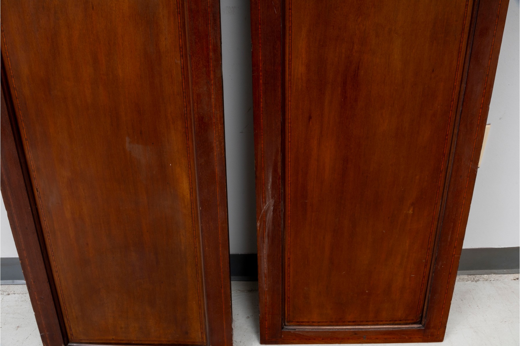 A pair of reclaimed vintage cabinet doors with marquetry details inlaid into solid wood finished in mahogany.