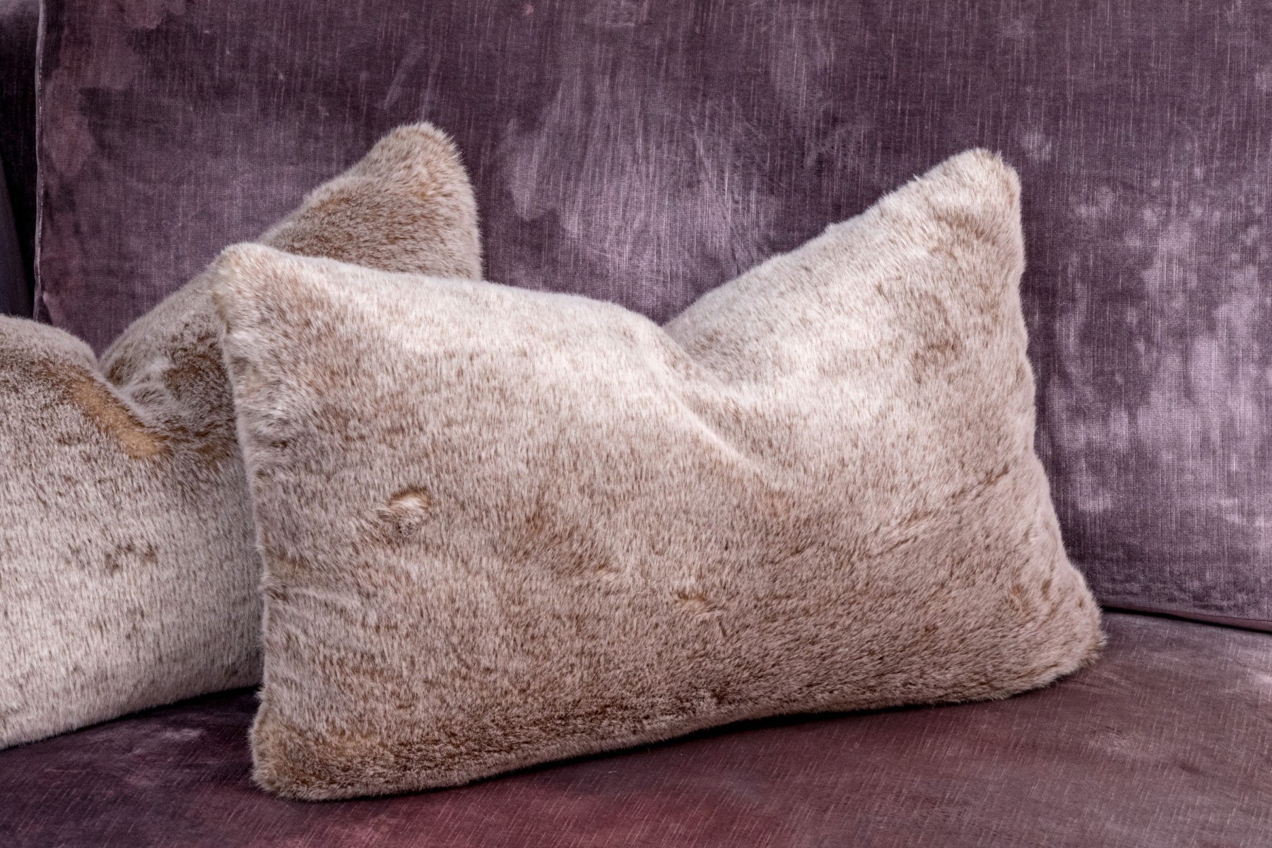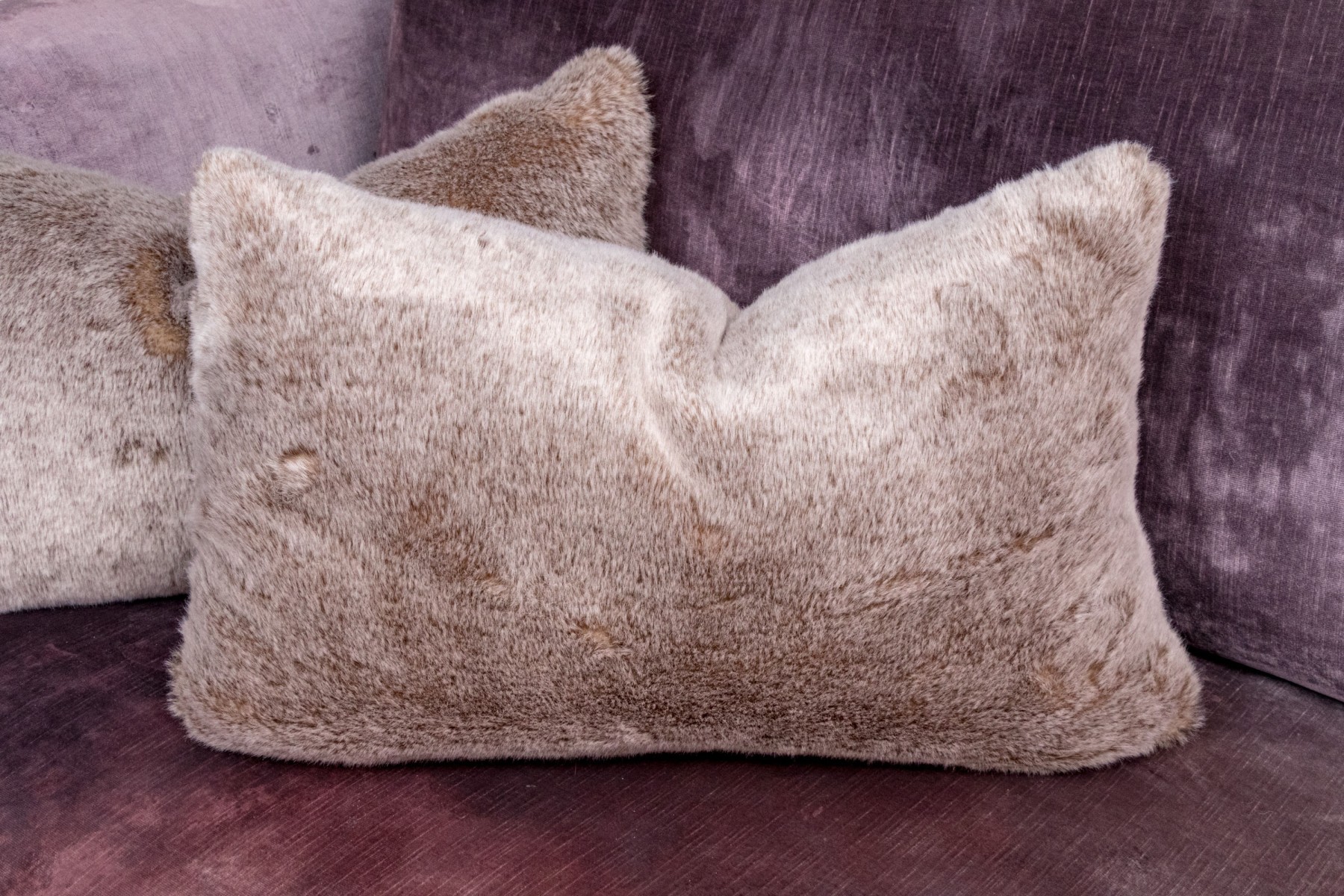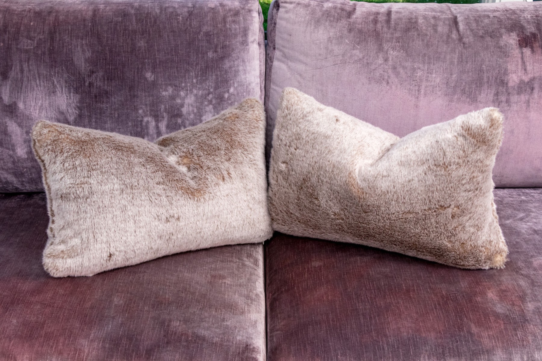 Soft grey faux fur Restoration Hardware bolster shams with zipper closures.