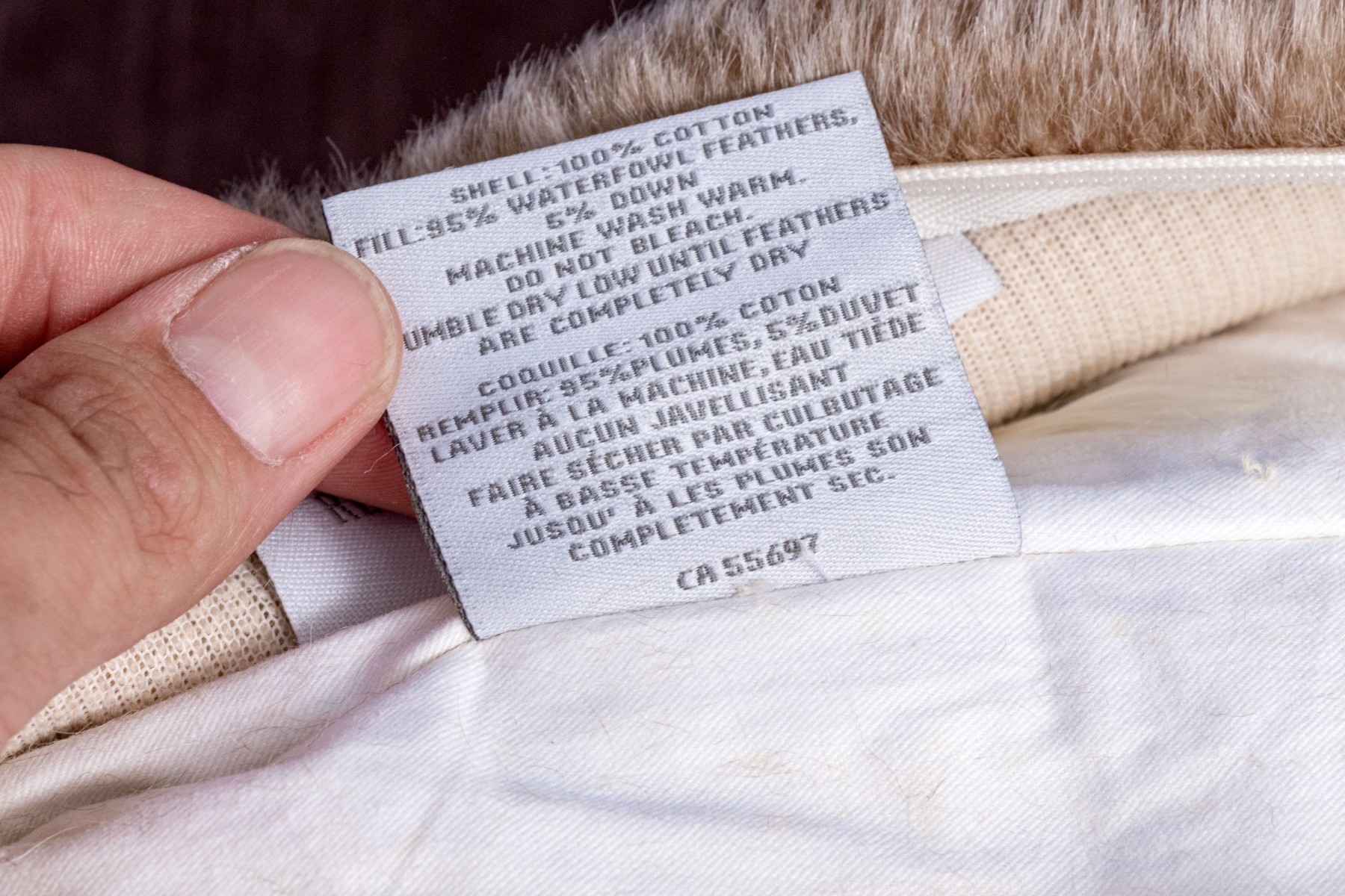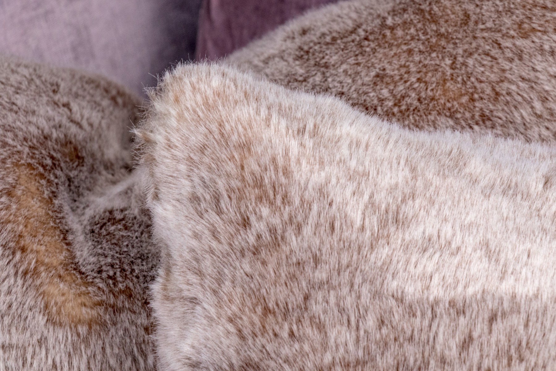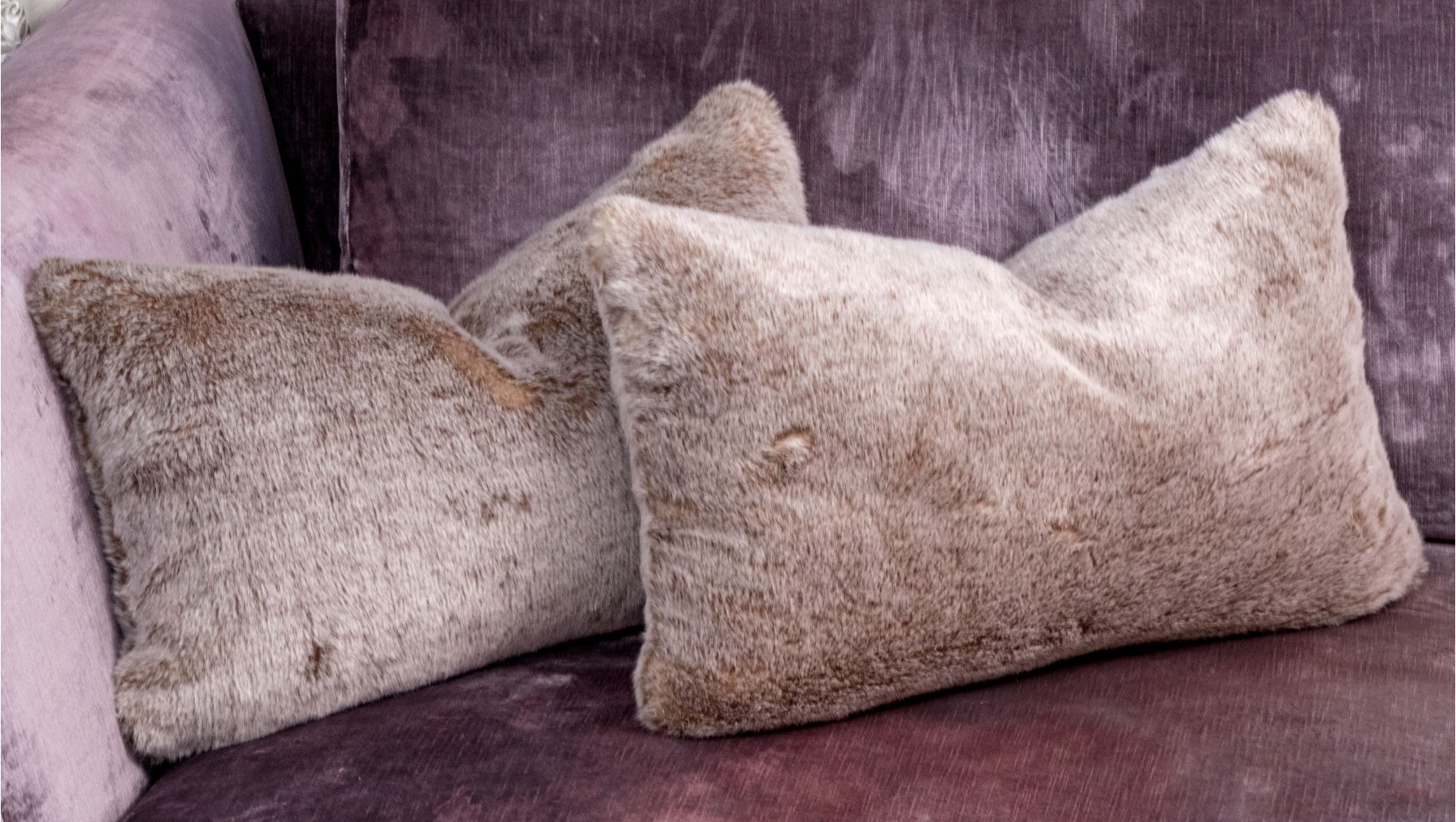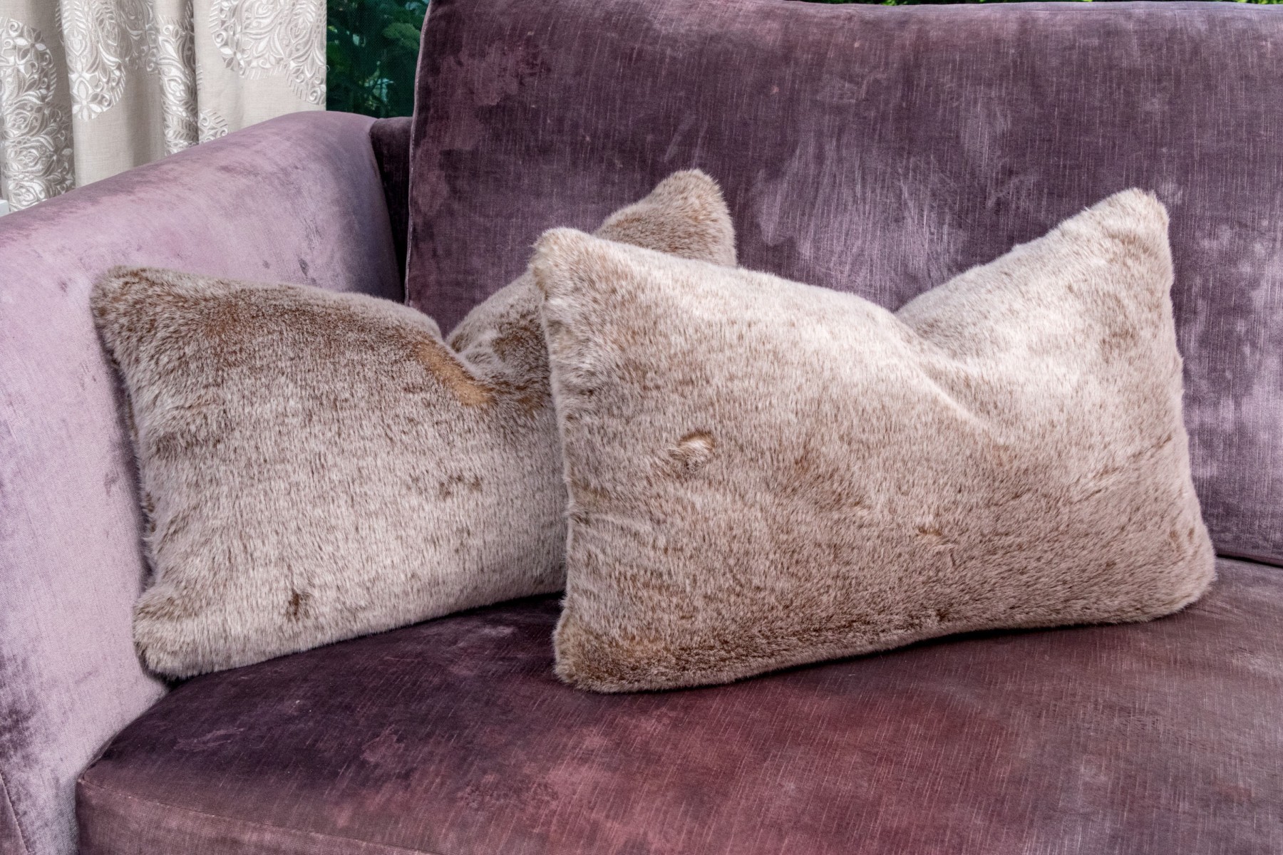 Soft grey faux fur Restoration Hardware bolster shams with zipper closures.
