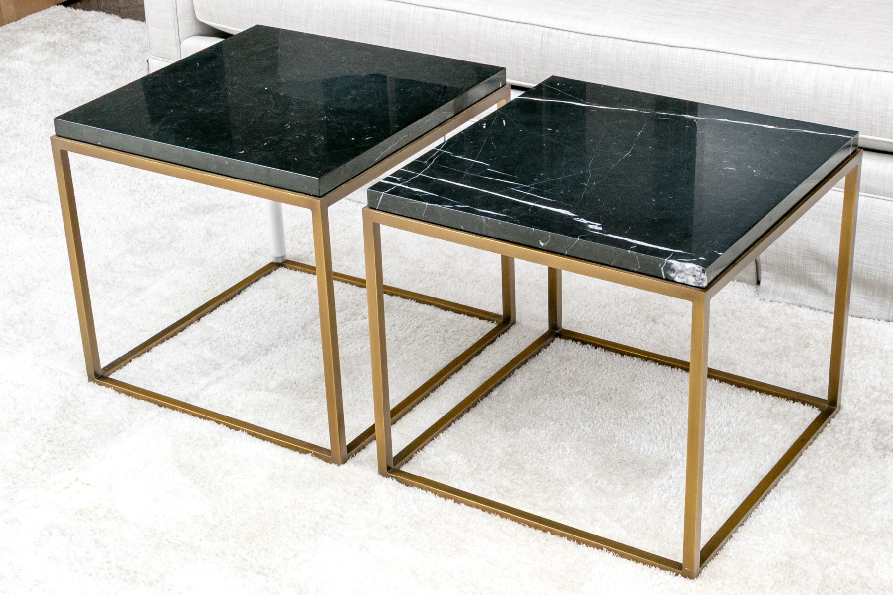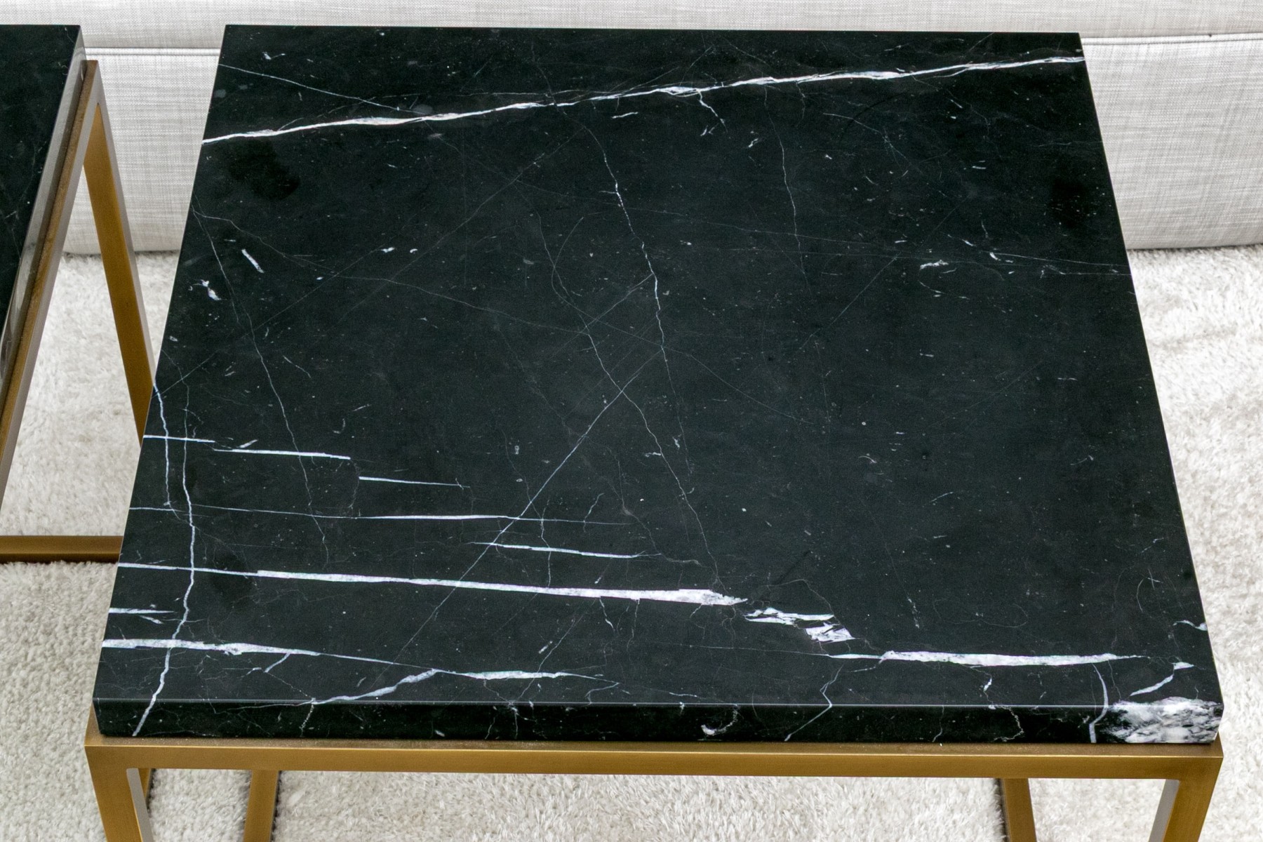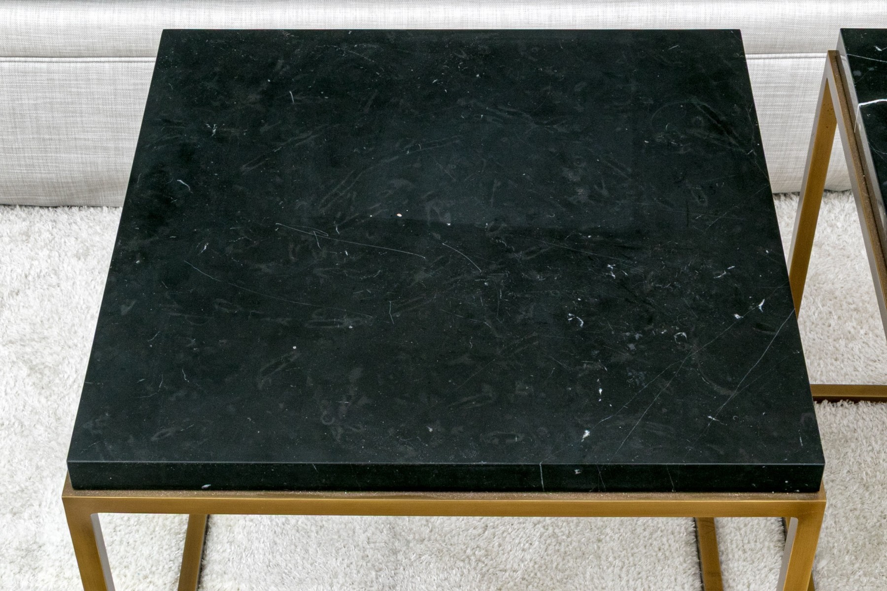 A stylish pair of Restoration Hardware end tables designed with gorgeous square black marble tops over sleek, minimalist gilt metal cube frames with box stretchers. One marble top sports eye-catching white veining, while the other is mostly solid black.