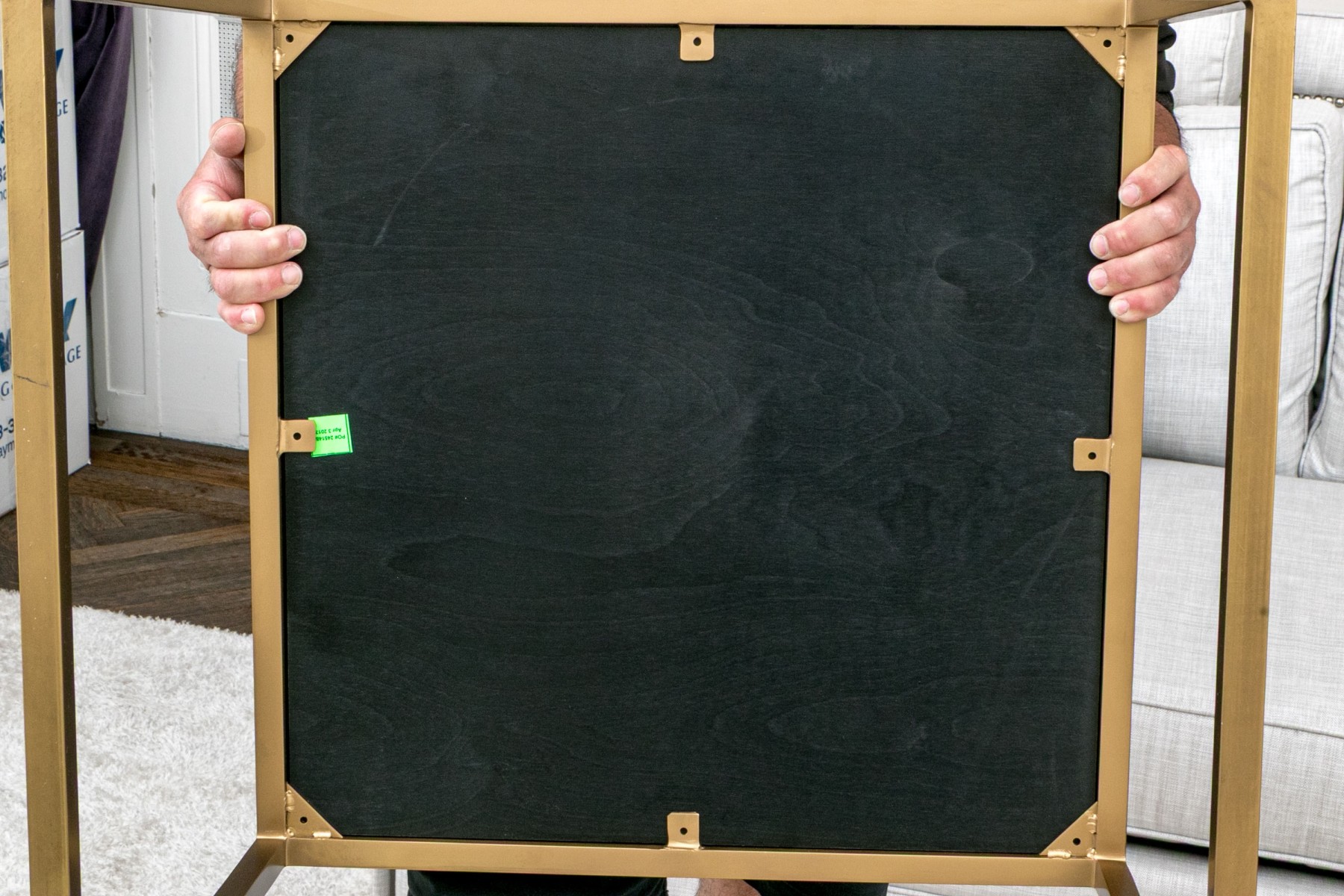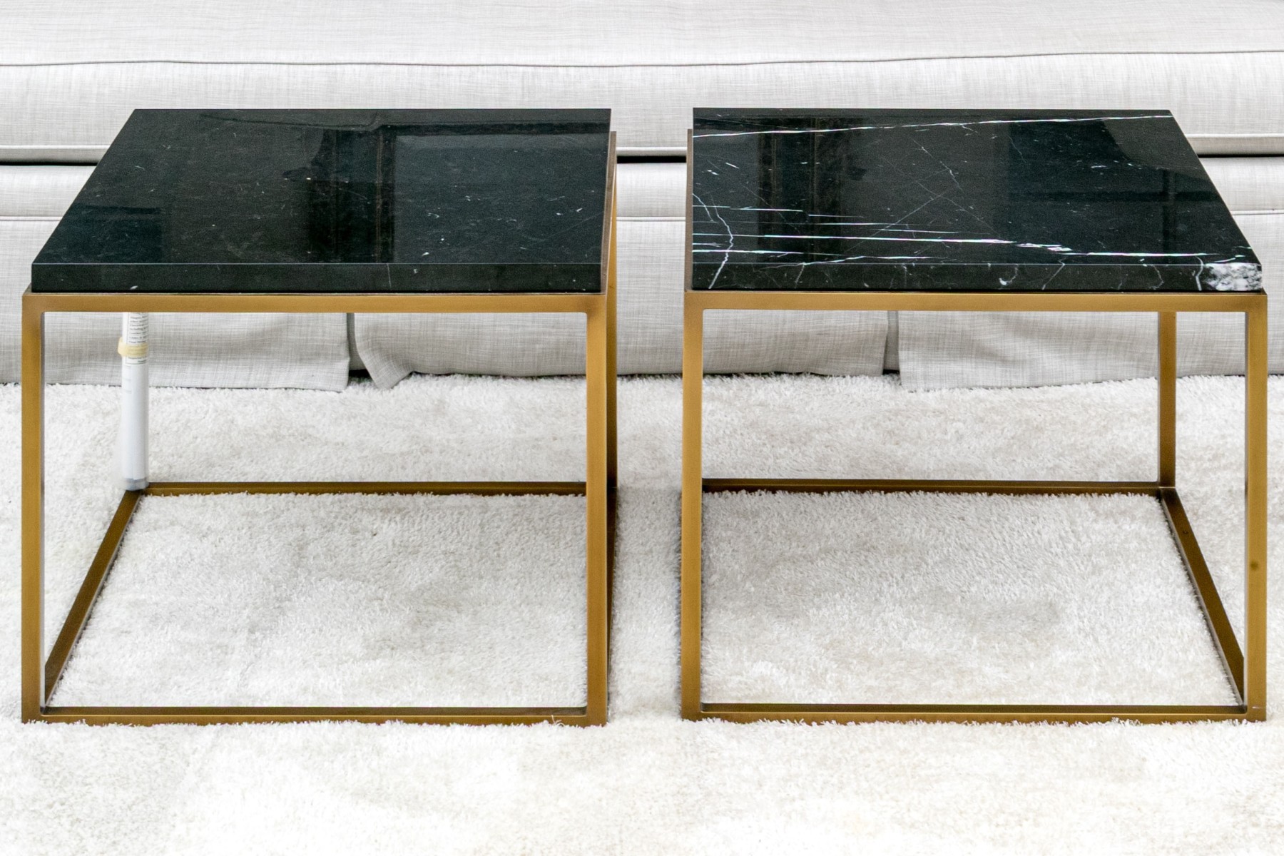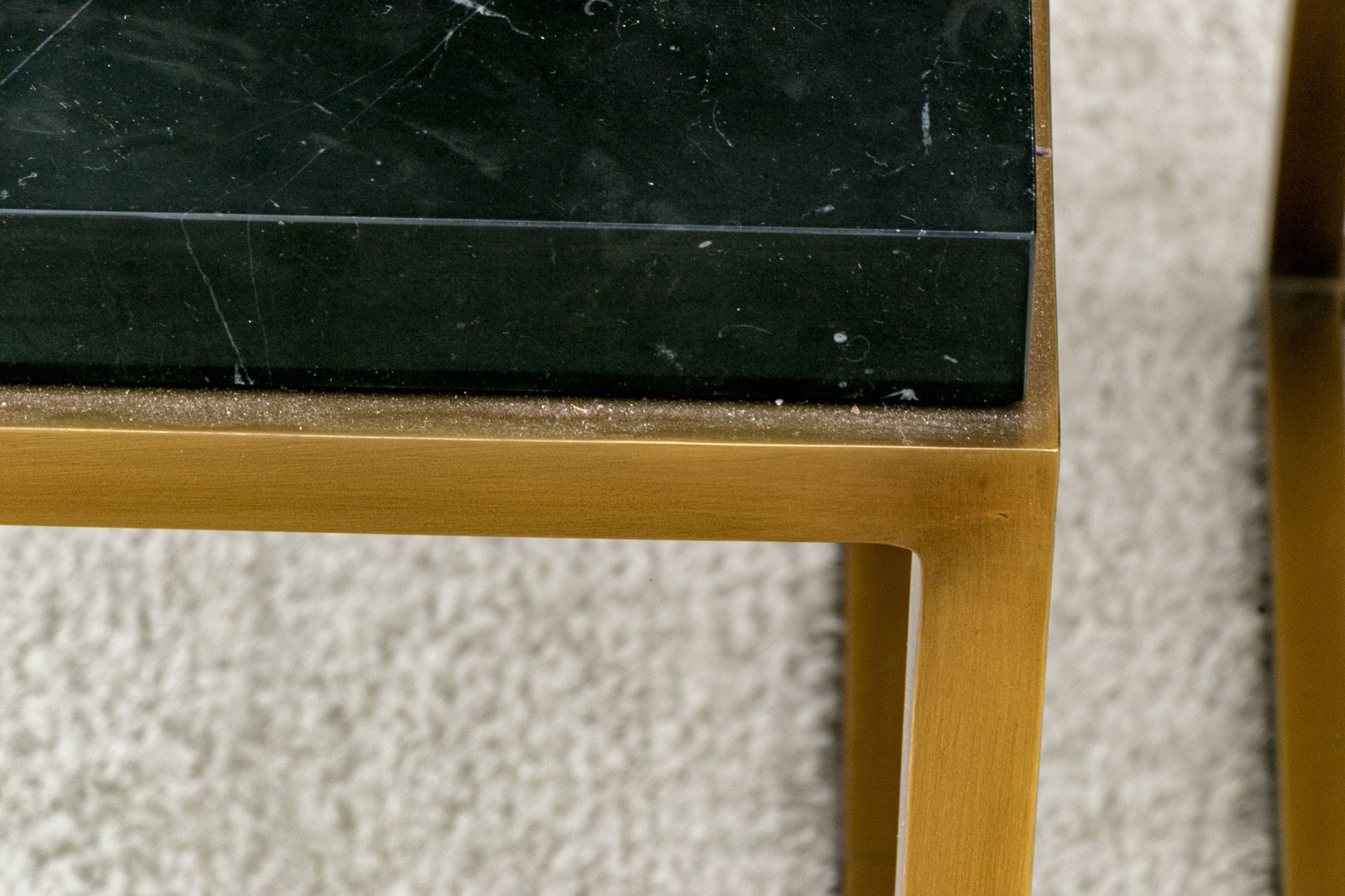 A stylish pair of Restoration Hardware end tables designed with gorgeous square black marble tops over sleek, minimalist gilt metal cube frames with box stretchers. One marble top sports eye-catching white veining, while the other is mostly solid black.