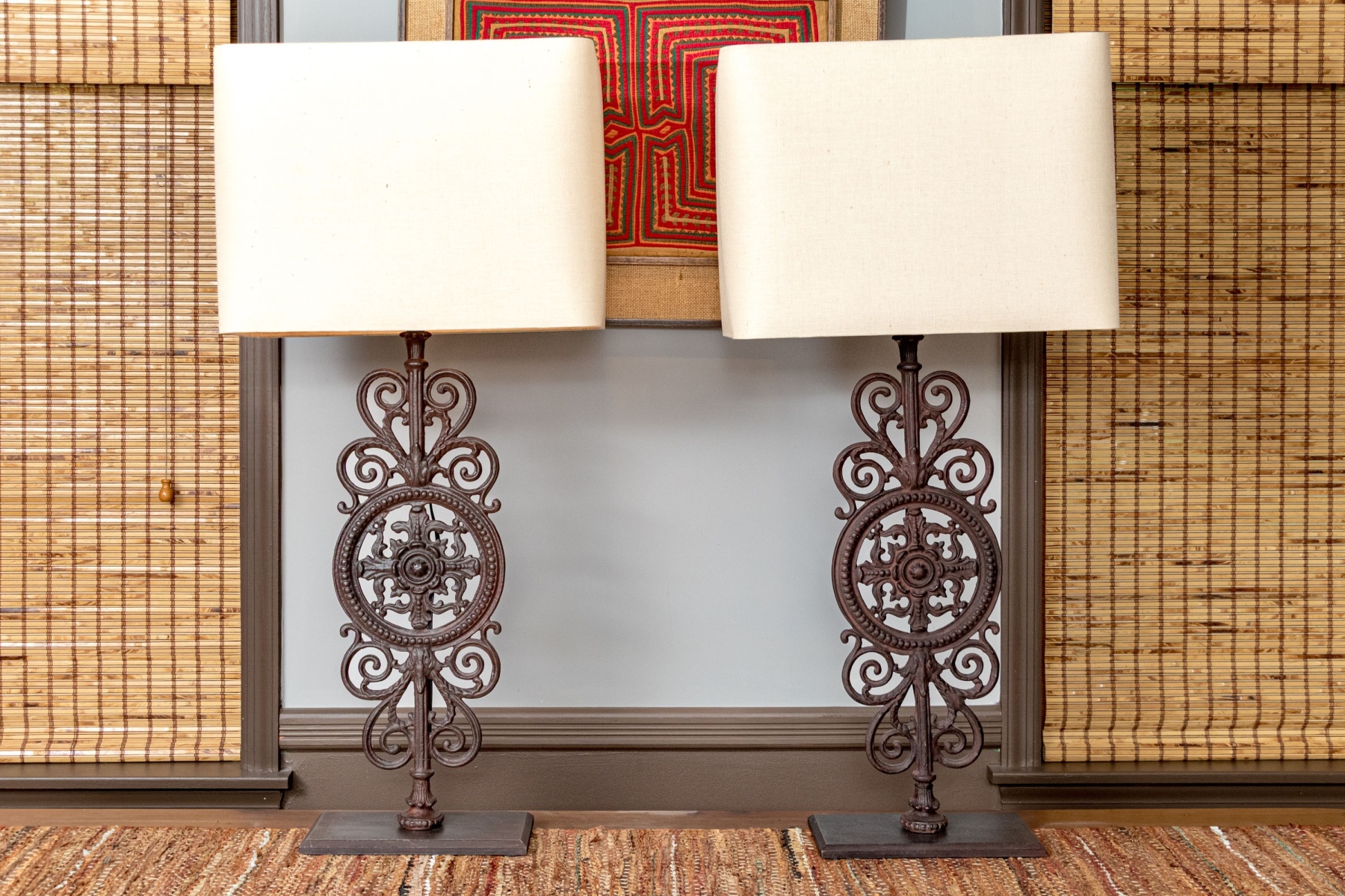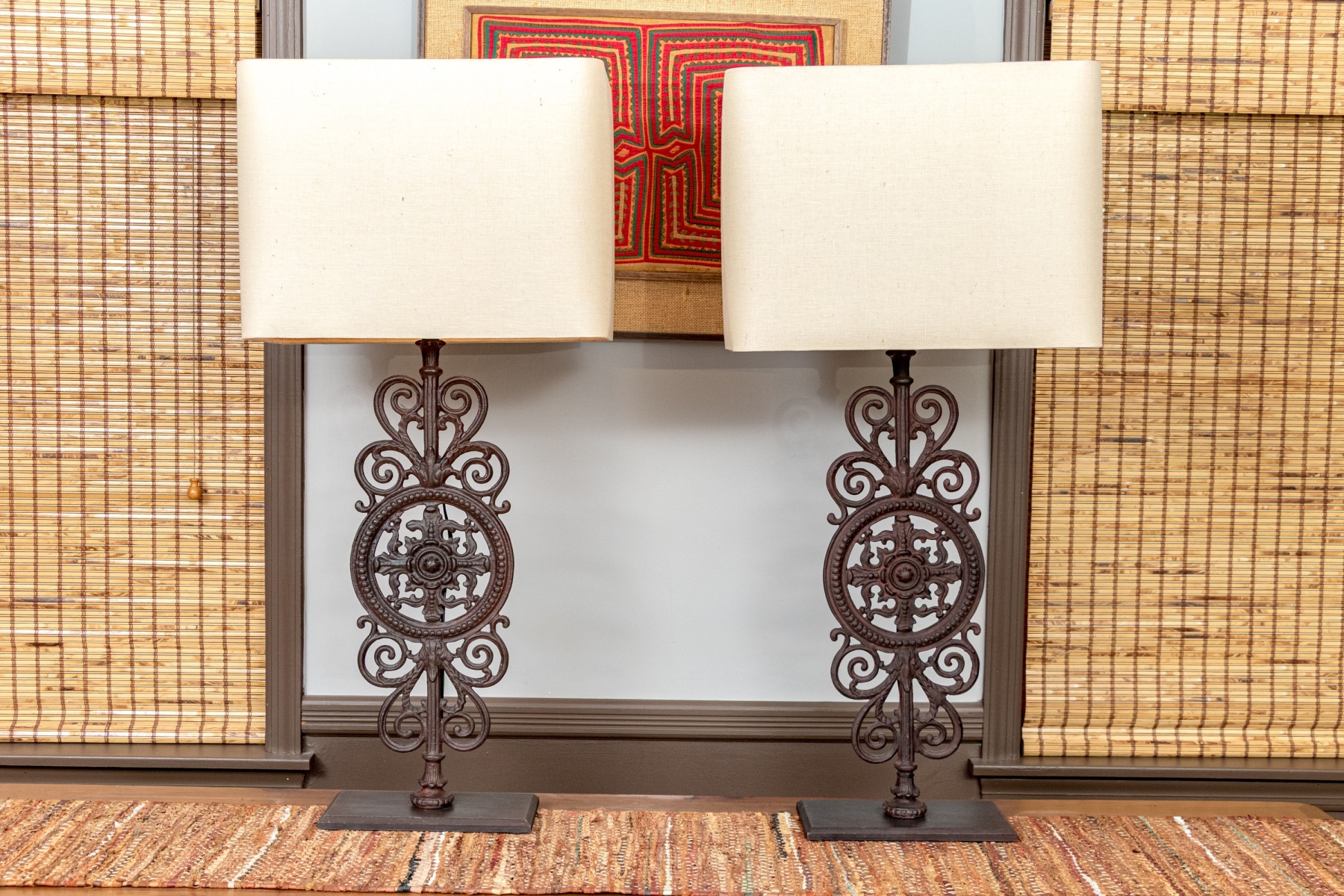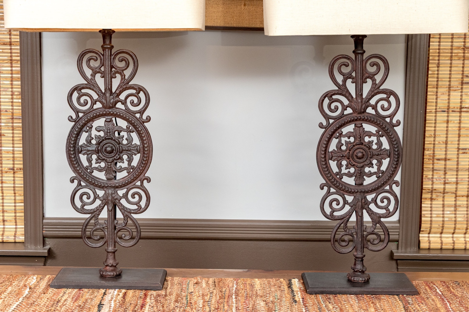 A gorgeous pair of Restoration Hardware "Parisian Iron Gate" table lamps with stunning antiqued cast iron columns showcasing crosses in circular medallions surrounded by scrolled crests at the top and bottom along cylindrical columns mounted to rectangular bases. Surmounted by cream rectangular shades.