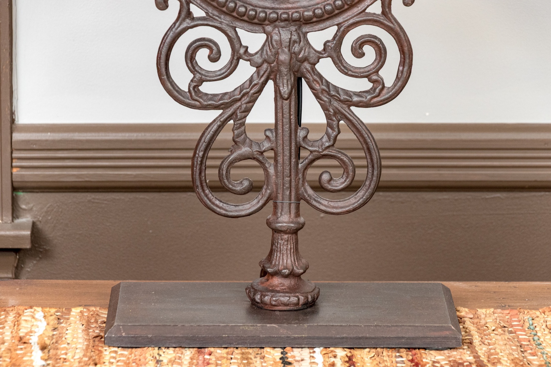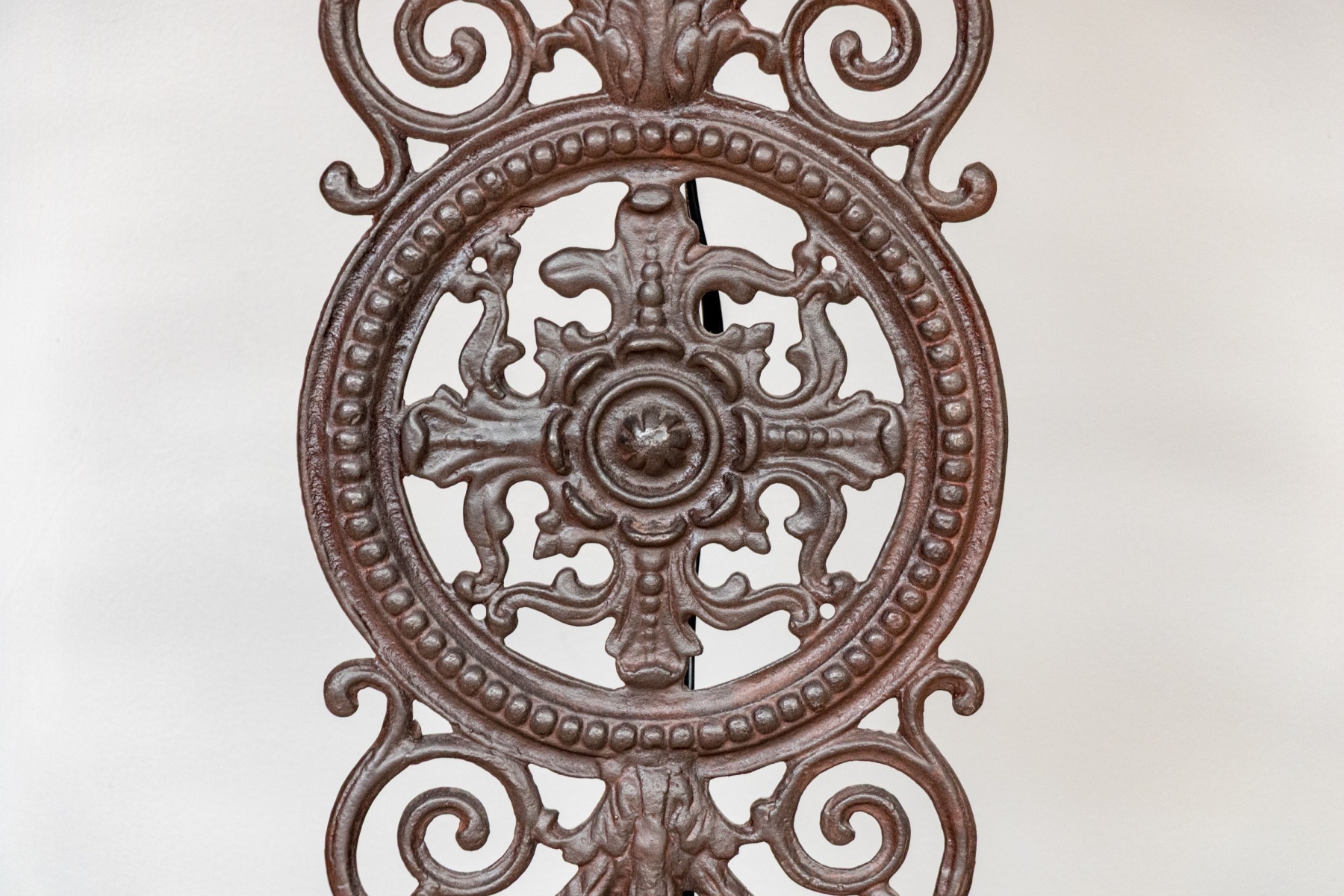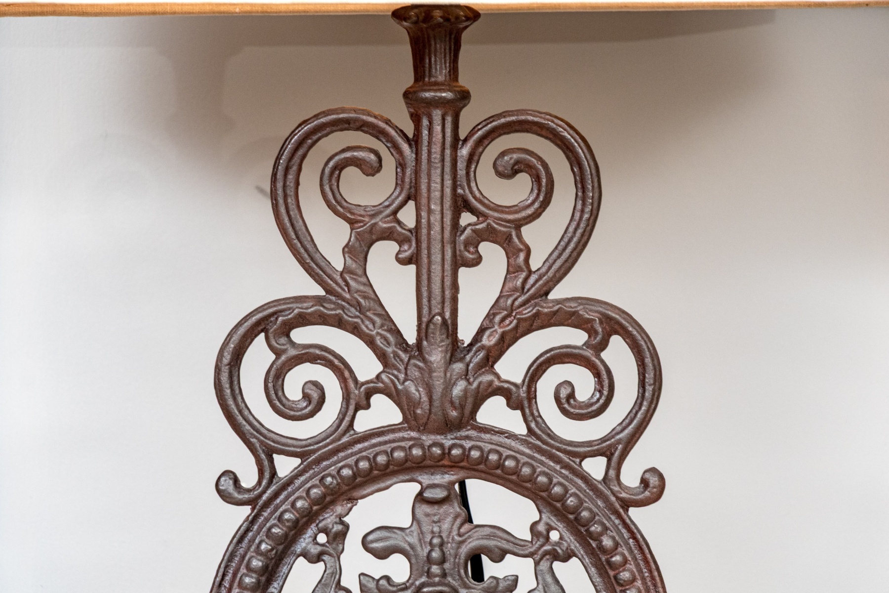A gorgeous pair of Restoration Hardware "Parisian Iron Gate" table lamps with stunning antiqued cast iron columns showcasing crosses in circular medallions surrounded by scrolled crests at the top and bottom along cylindrical columns mounted to rectangular bases. Surmounted by cream rectangular shades.