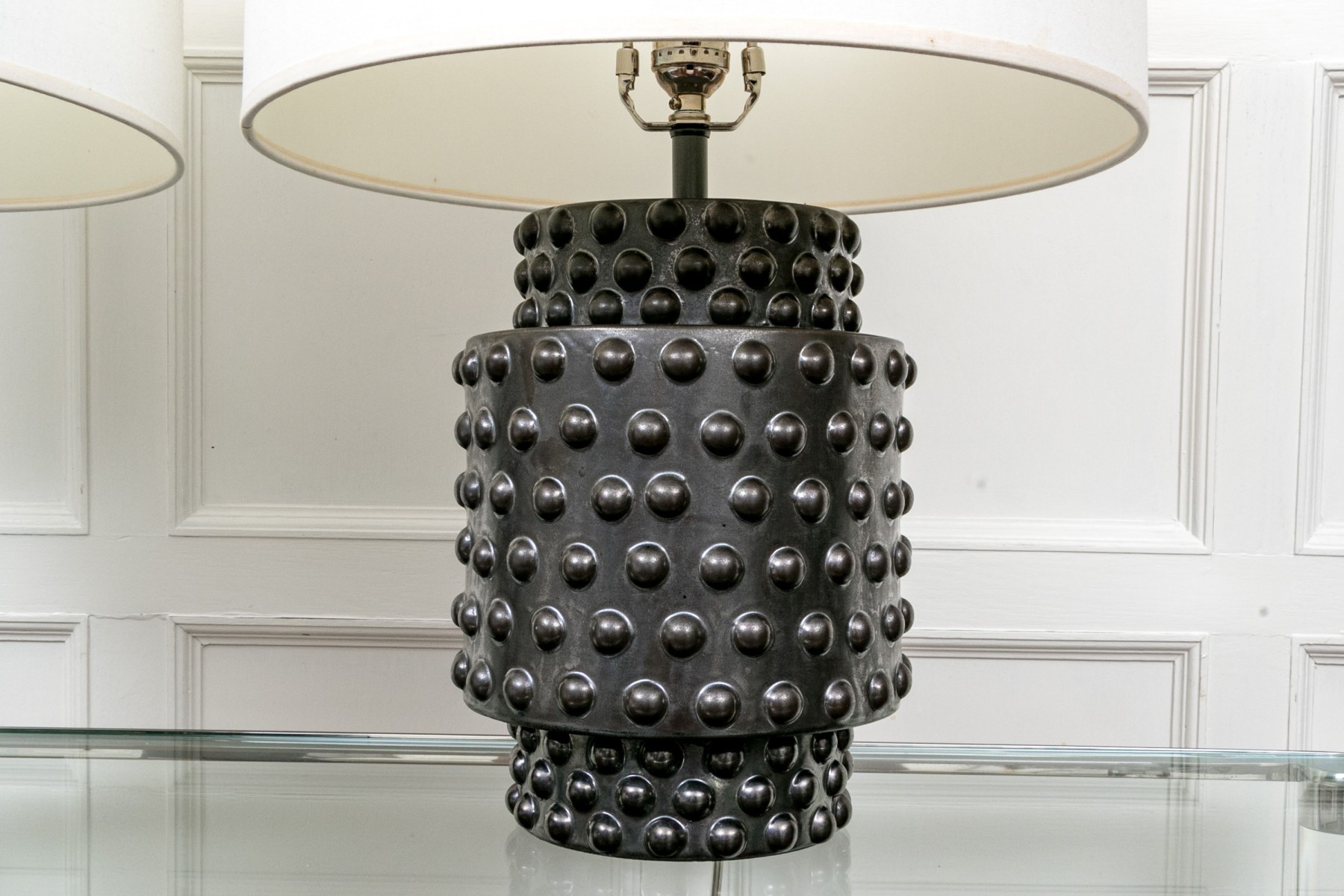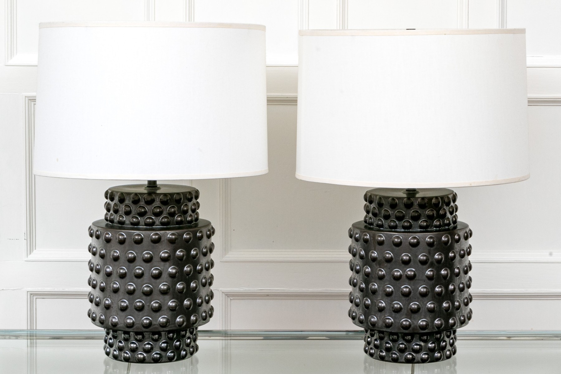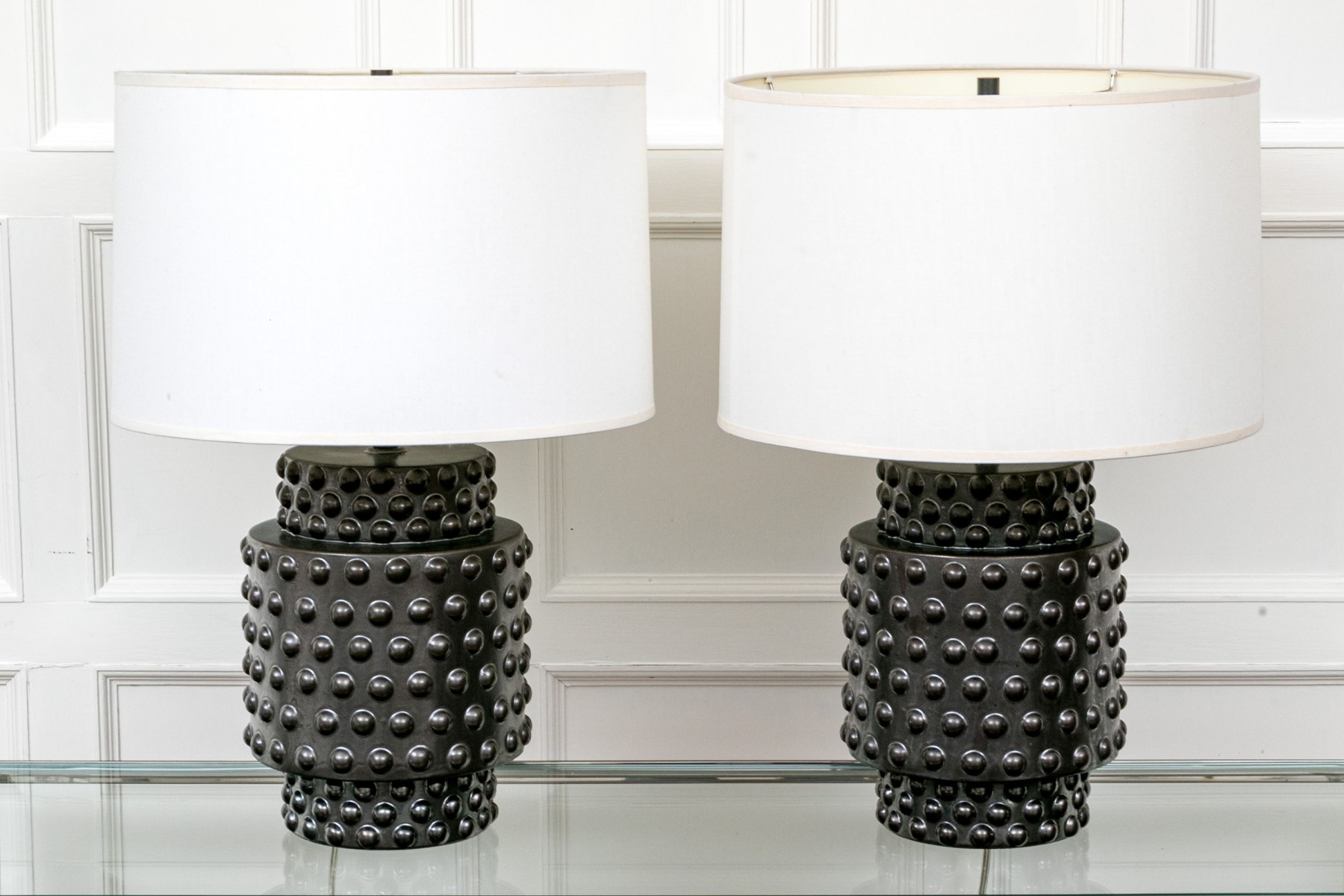 A delightful pair of Robert Abbey Dolly table lamps showcasing sculptural cylindrical ceramic bodies glazed black over impactful hobnail textures. Surmounted by white drum shades.