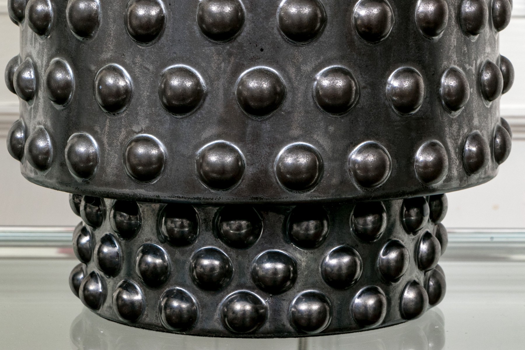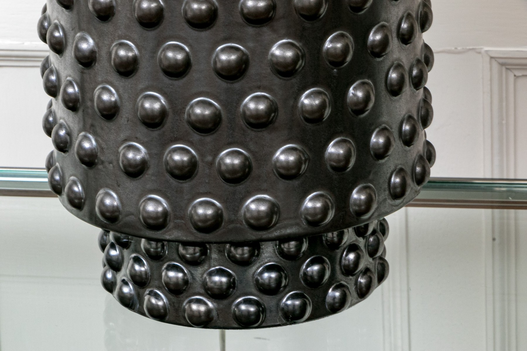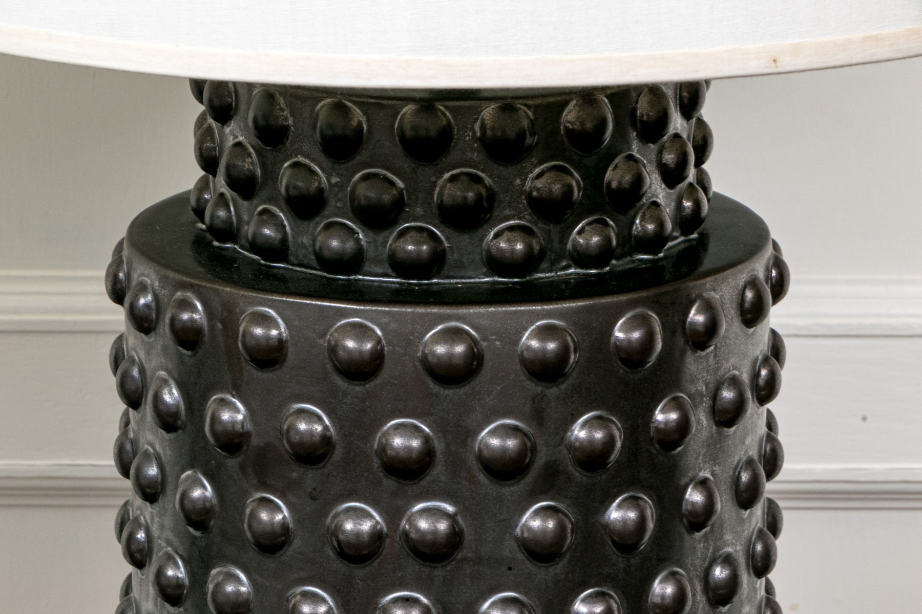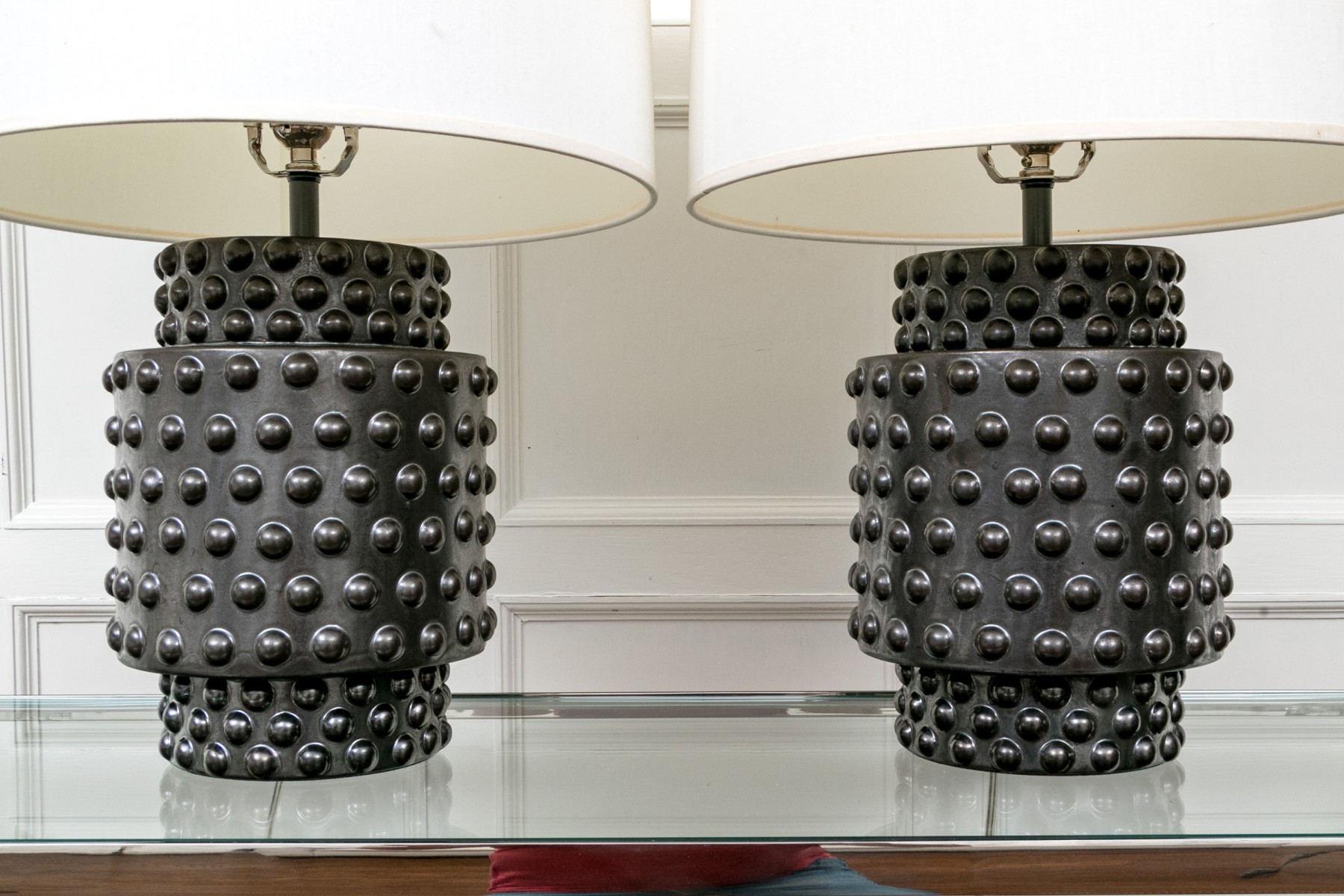 A delightful pair of Robert Abbey Dolly table lamps showcasing sculptural cylindrical ceramic bodies glazed black over impactful hobnail textures. Surmounted by white drum shades.