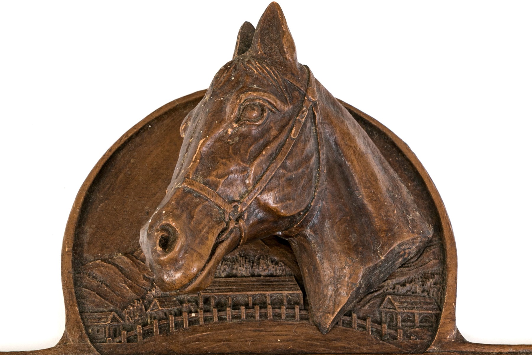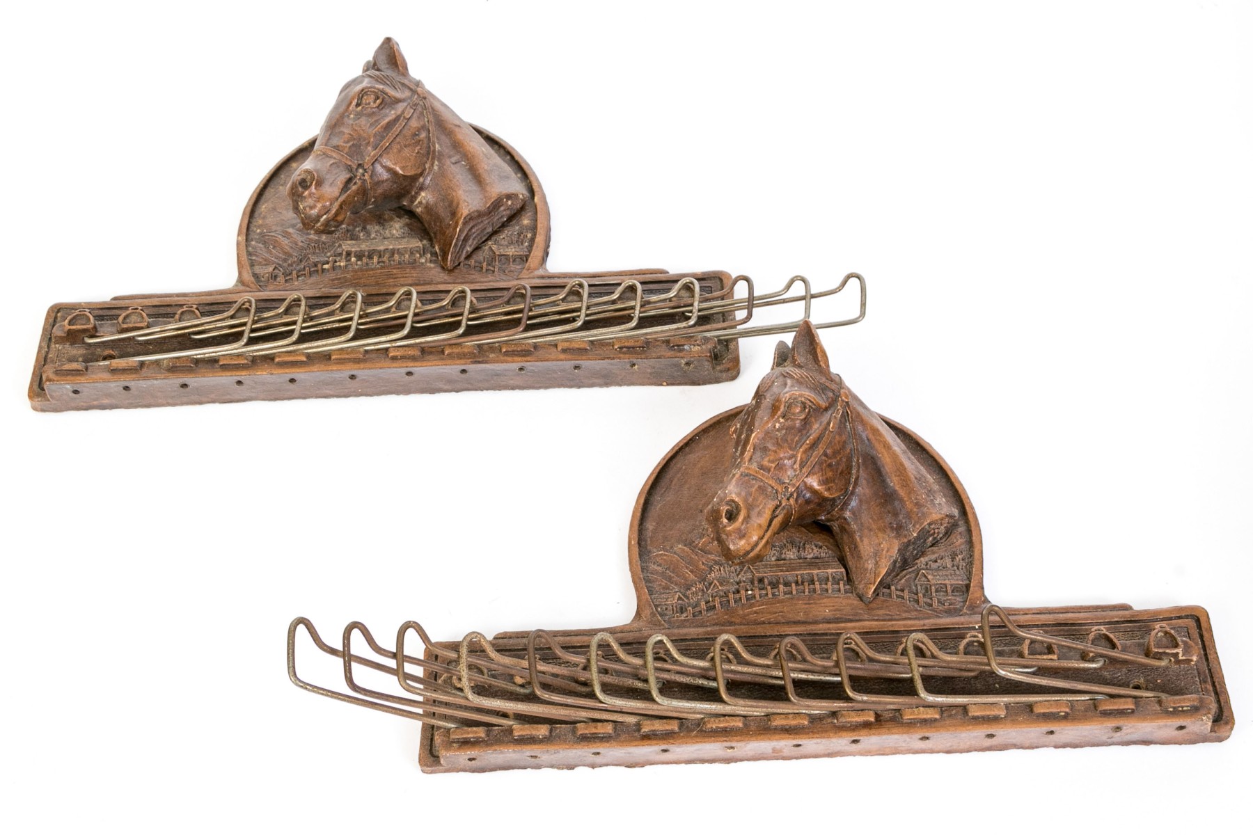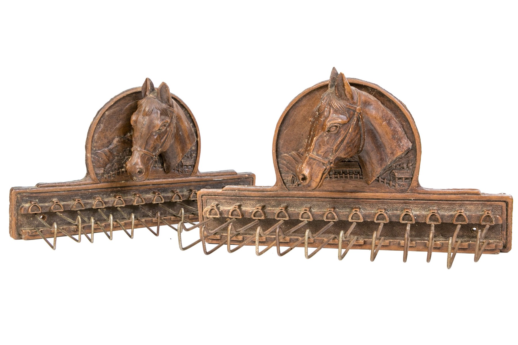 12 metallic hangers with bust of horse in relief above. A unique and rustic pair!