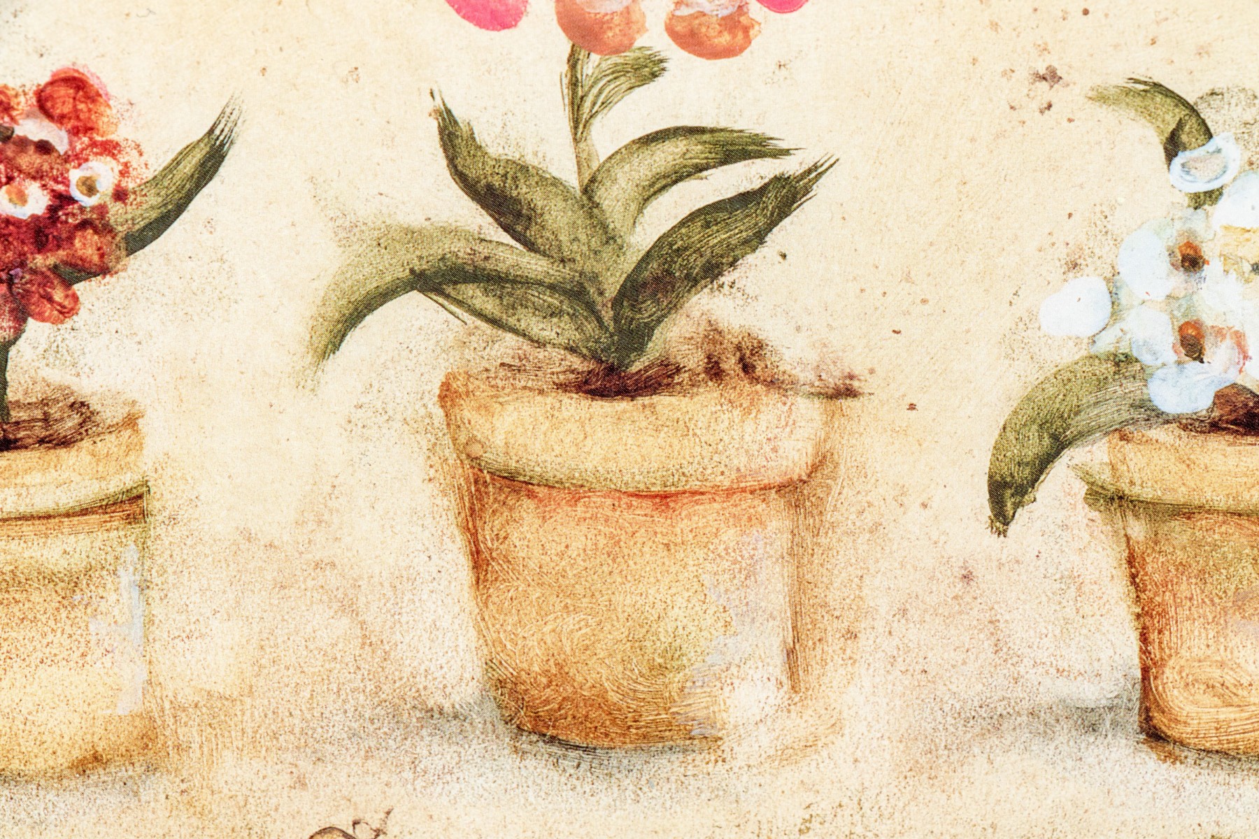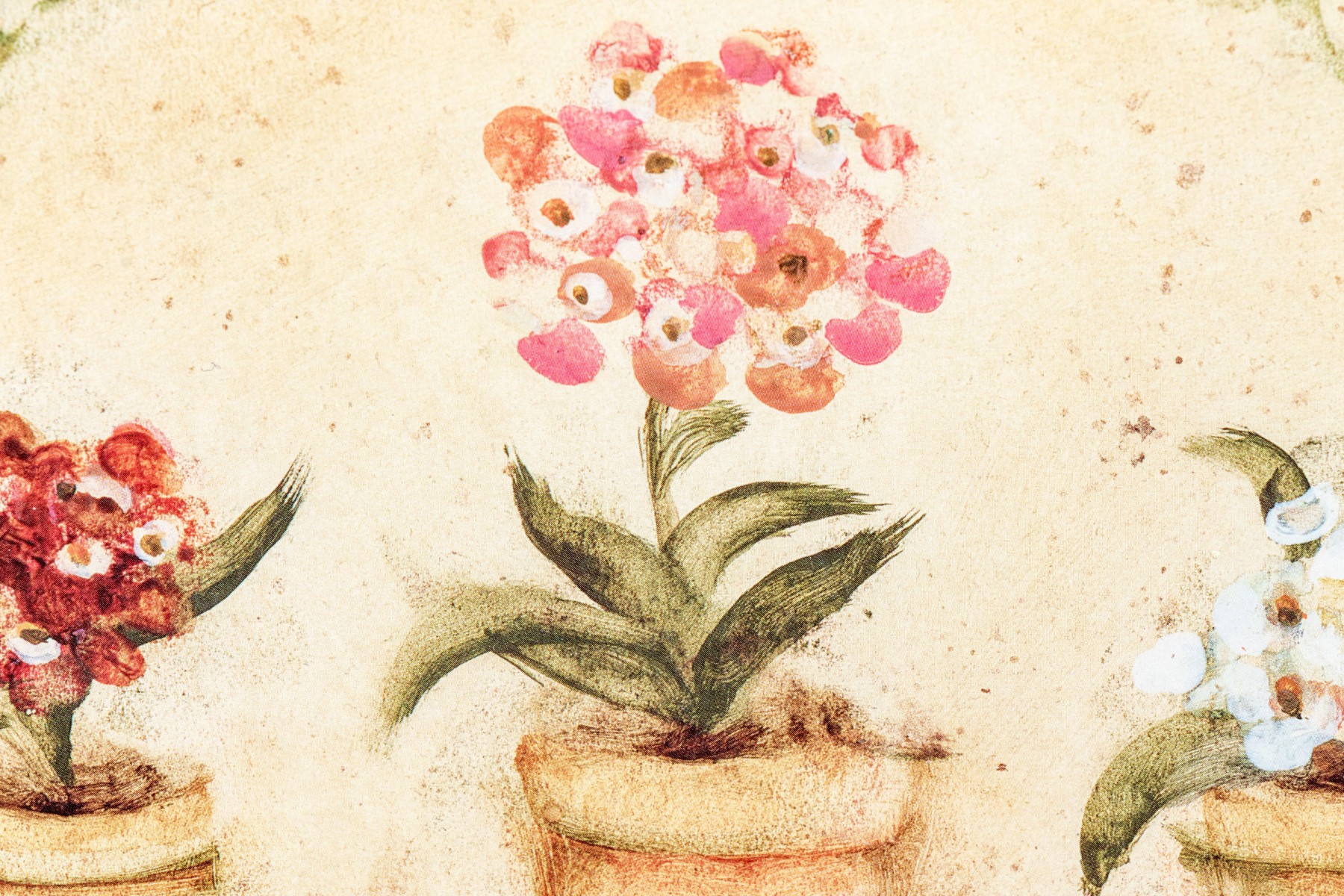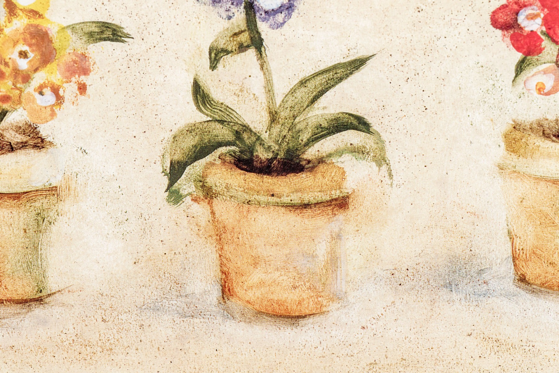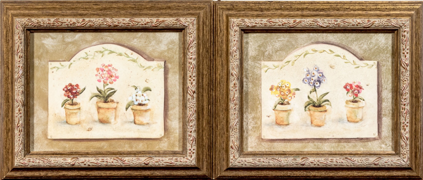 A wonderful pair of S. Brown & Co. giclees of of potted plates in red, pink, white, yellow, and blue lined up within arched cream centers surrounded by mottled olive brown backgrounds.