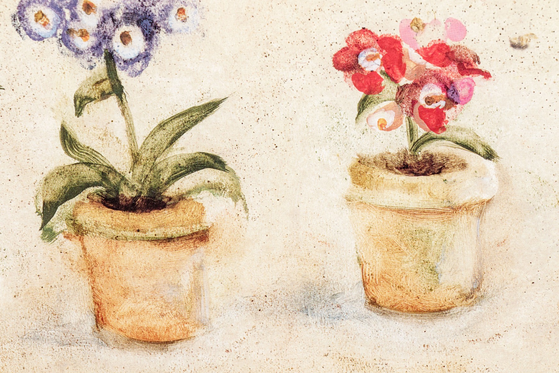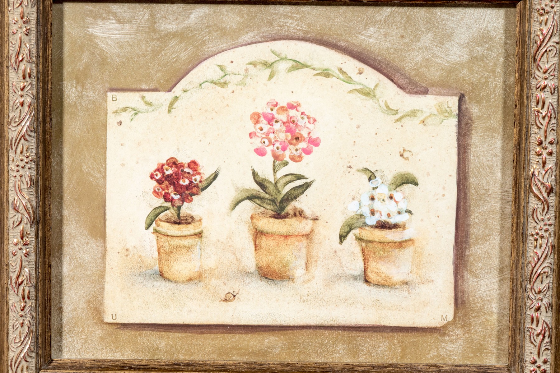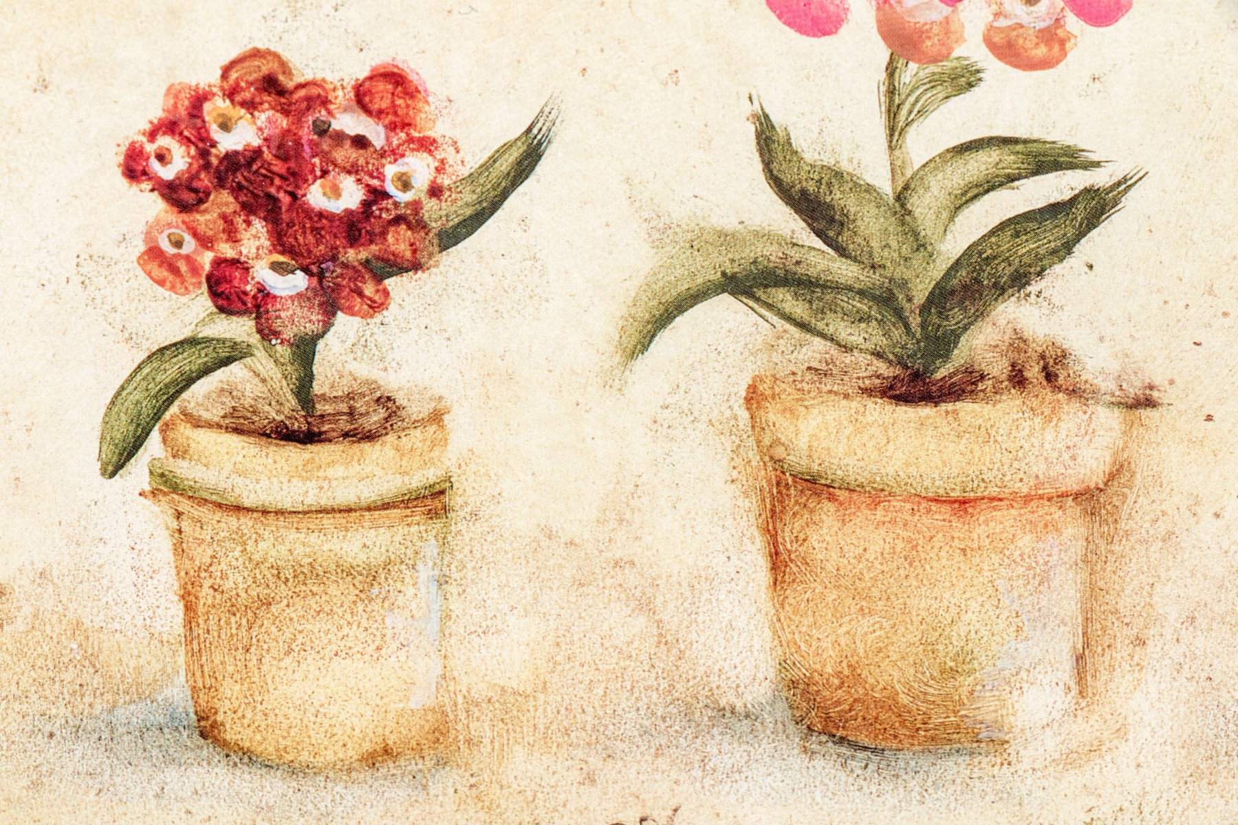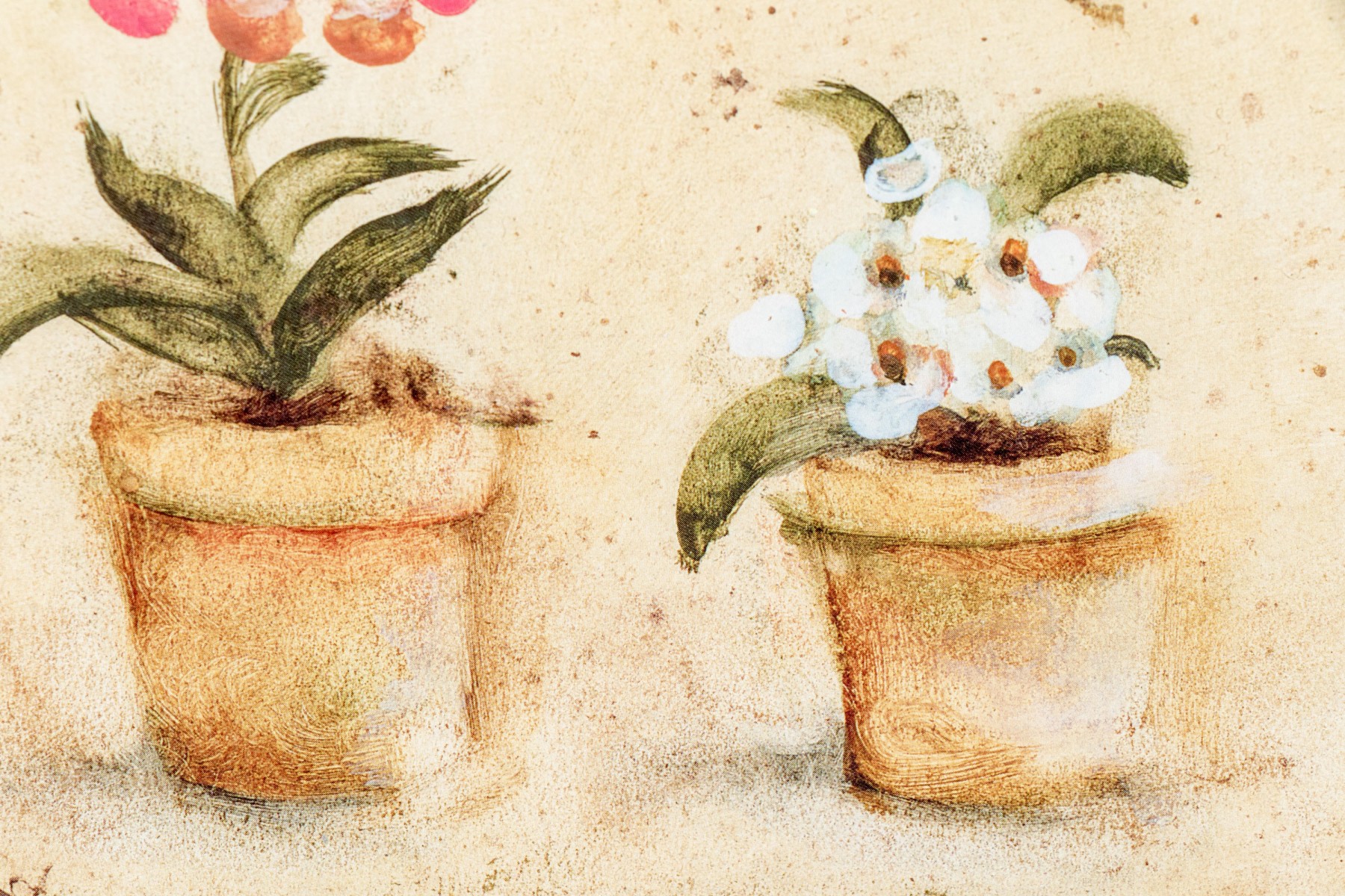 A wonderful pair of S. Brown & Co. giclees of of potted plates in red, pink, white, yellow, and blue lined up within arched cream centers surrounded by mottled olive brown backgrounds.