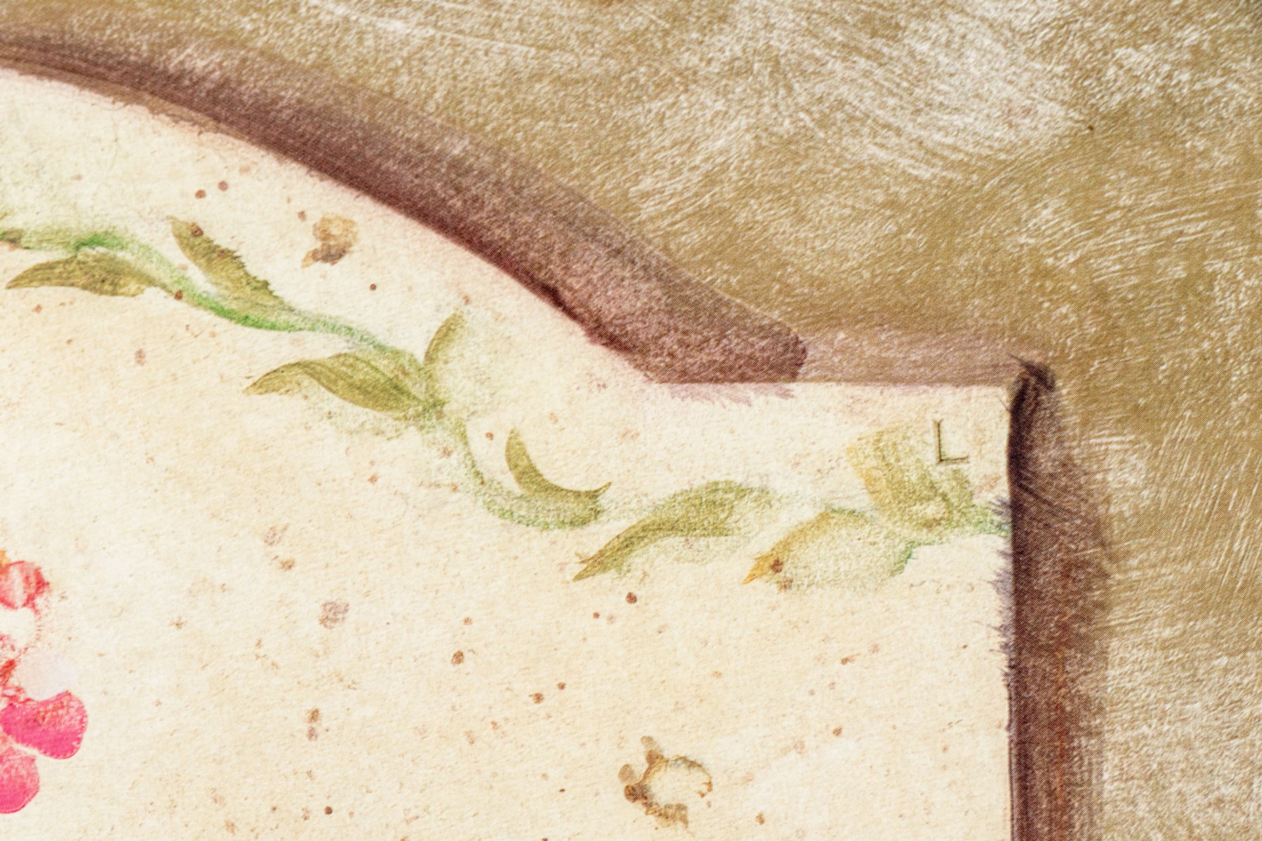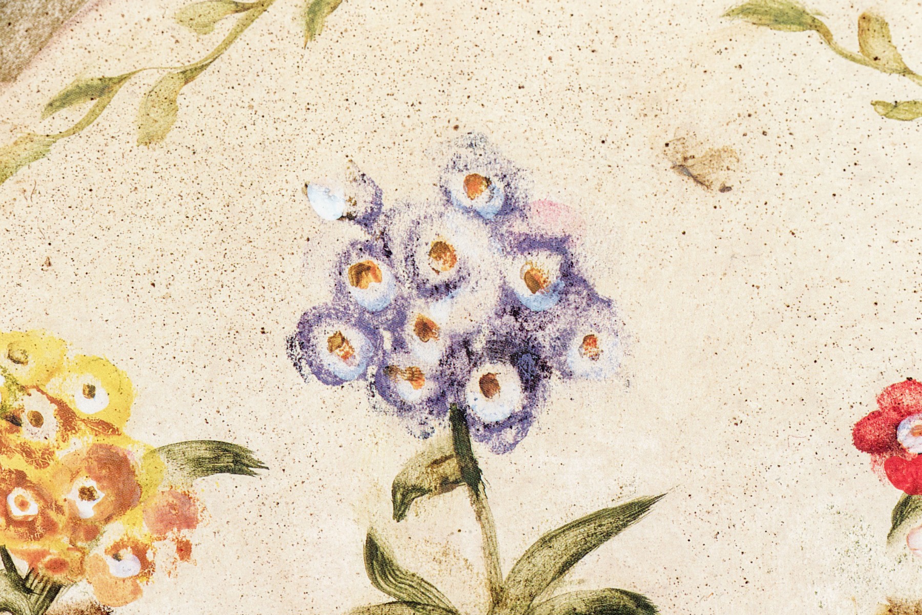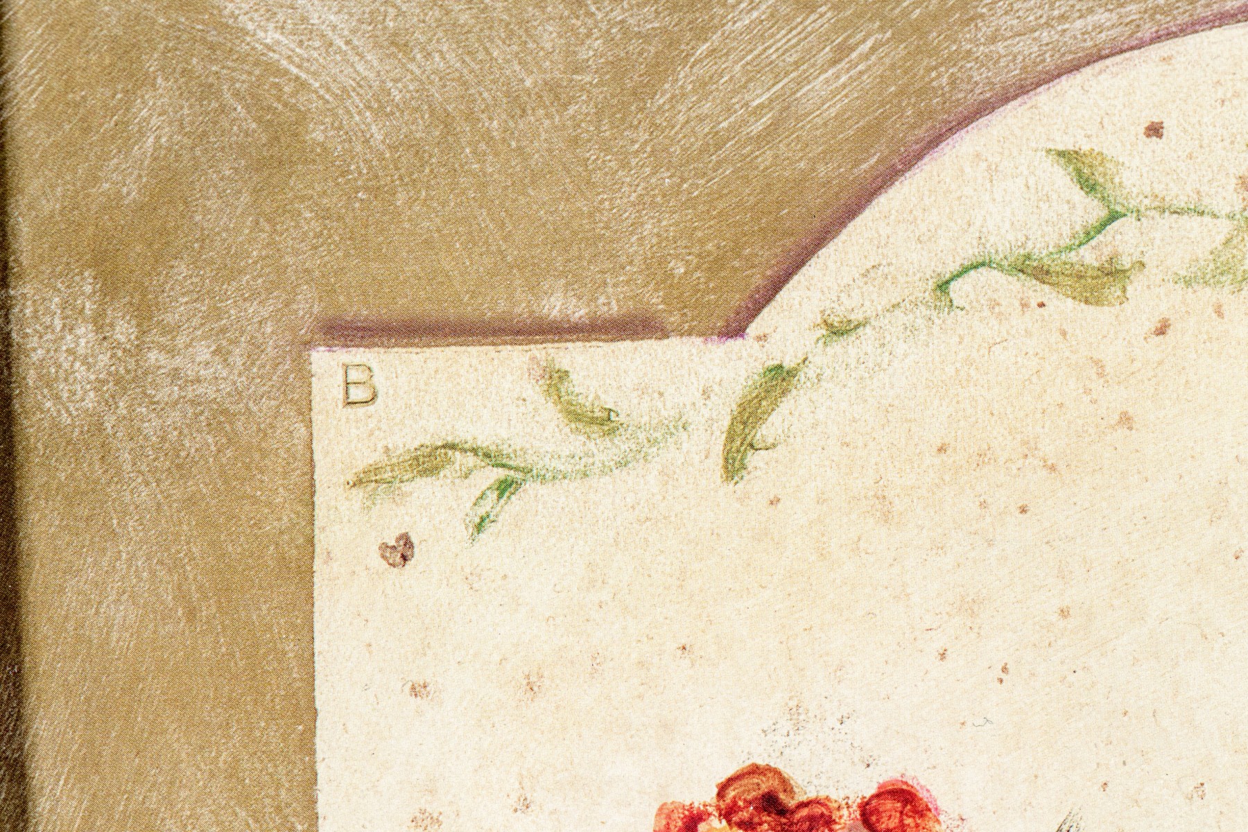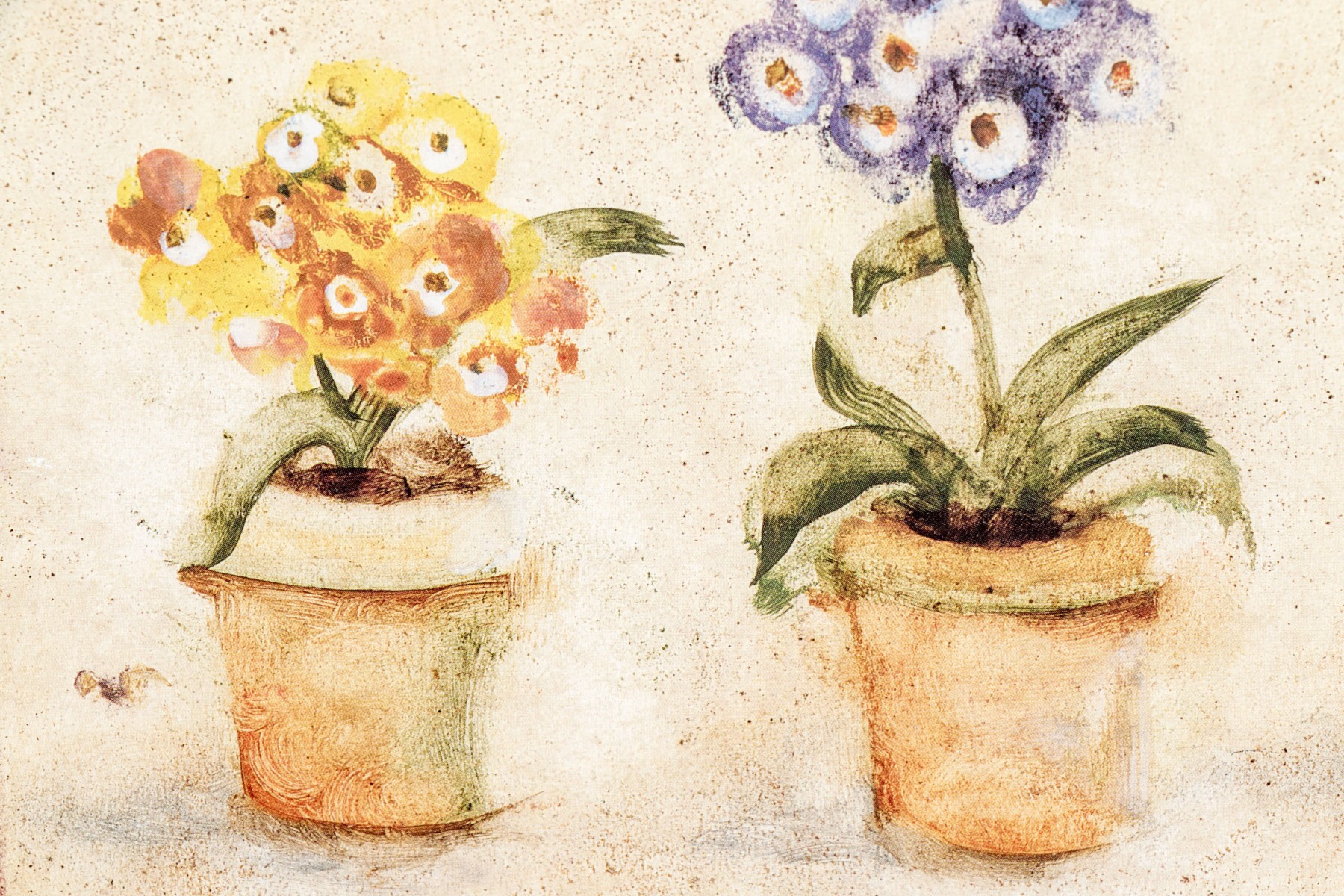 A wonderful pair of S. Brown & Co. giclees of of potted plates in red, pink, white, yellow, and blue lined up within arched cream centers surrounded by mottled olive brown backgrounds.