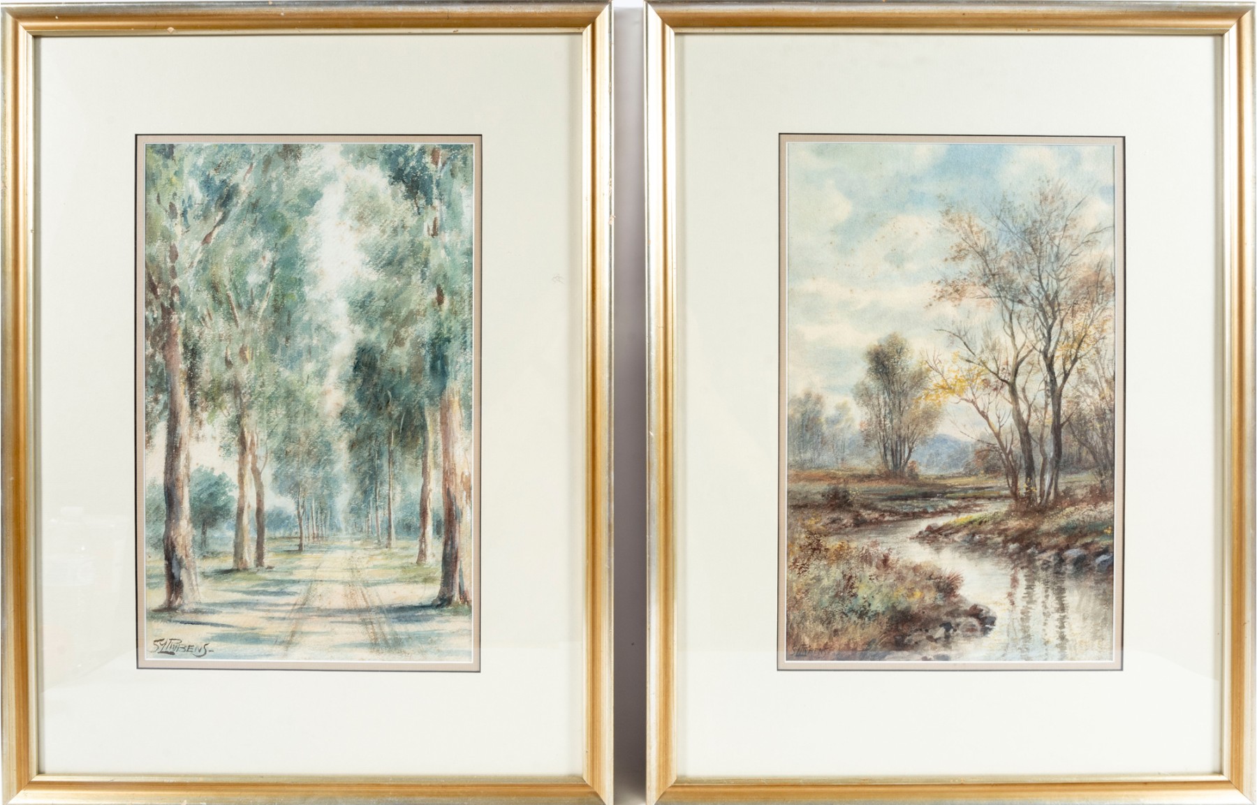 Two coordinating marsh/forest watercolor landscape paintings -- signed. Each example is presented in a two-tone silver/gold finished wood frames, those of which are faced with glass and accented by khaki & beige mat borders. See photos for signature details.
