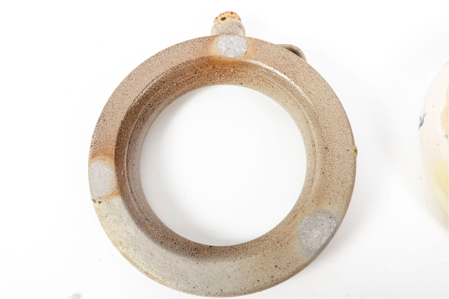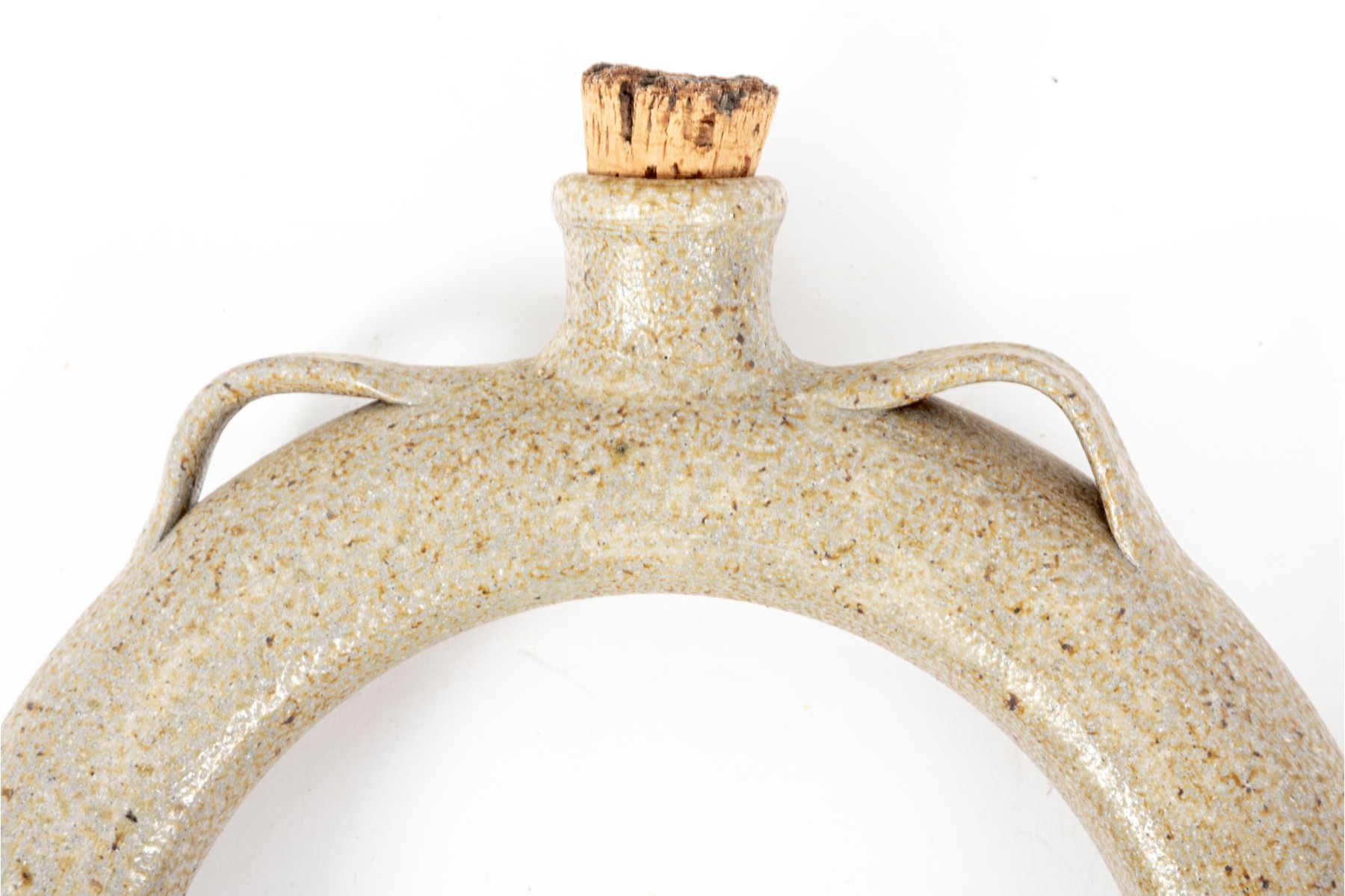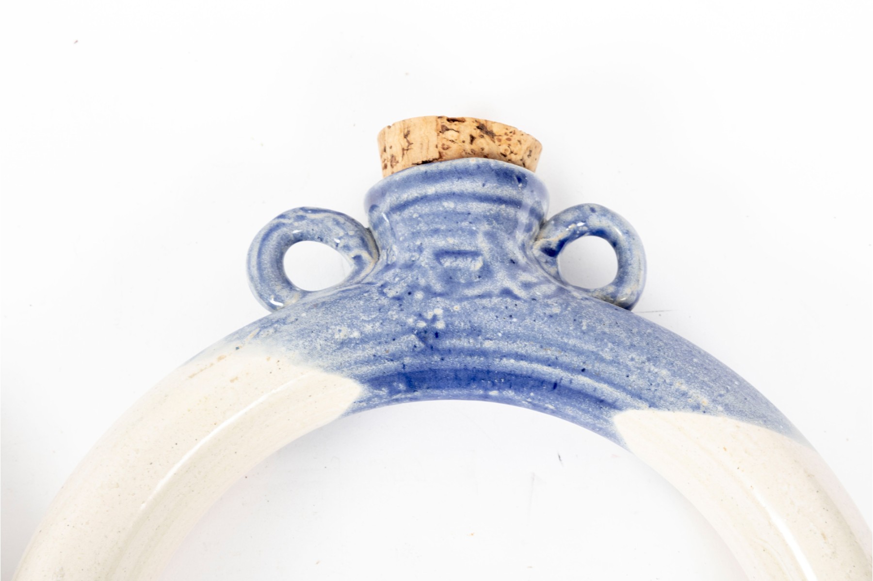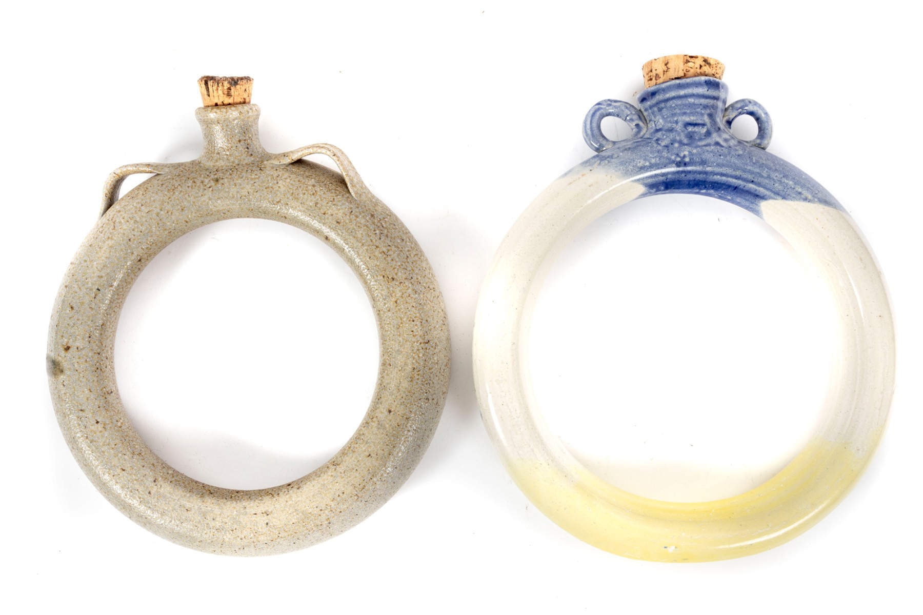 These 21st century flask pottery rings mimic the original 19th century versions meant to hold water for farmers working in fields far from a stream. Crafted from fine earthernware, this examples are both signed and corked with the original stoppers. One example is attributed to Sid Luck, dated 2007.