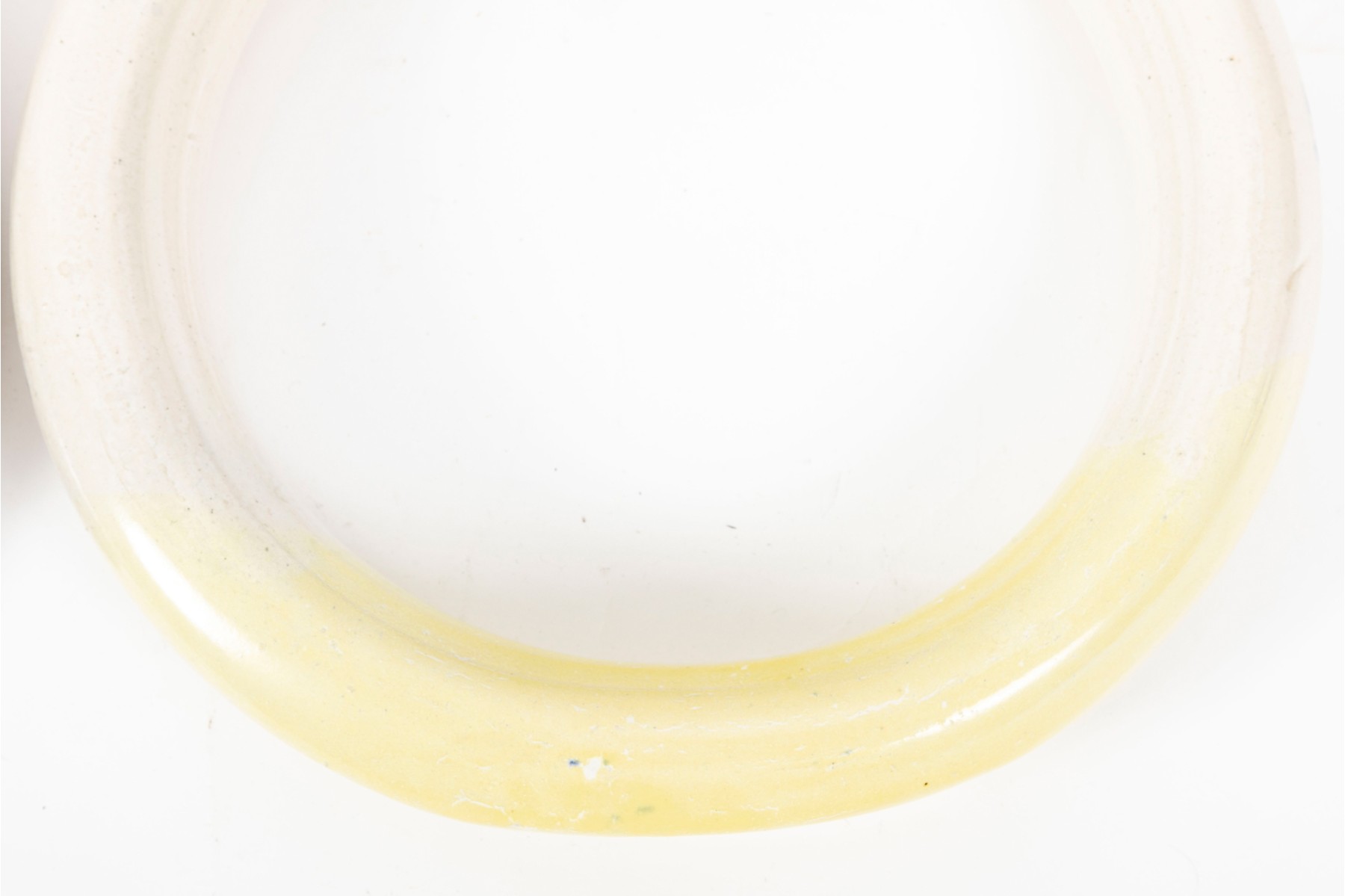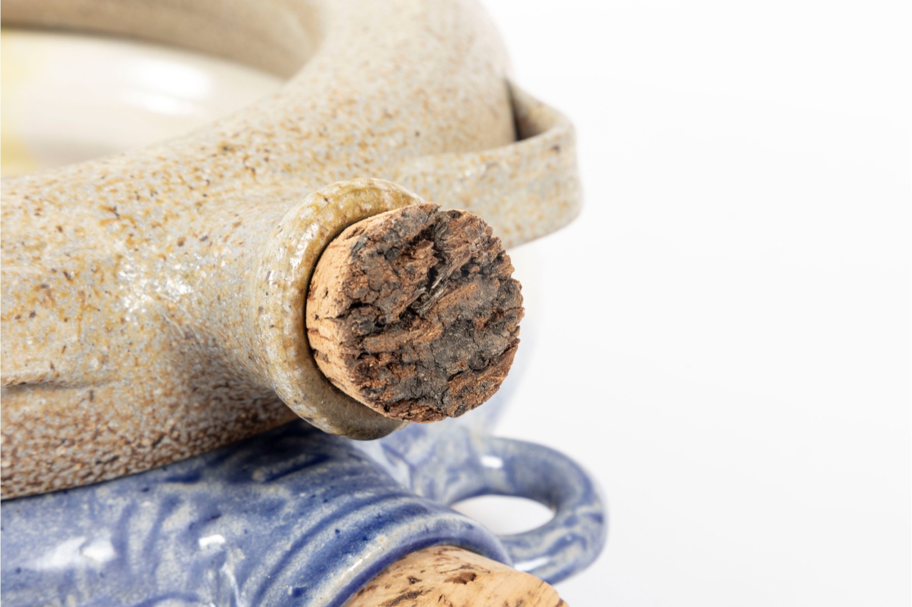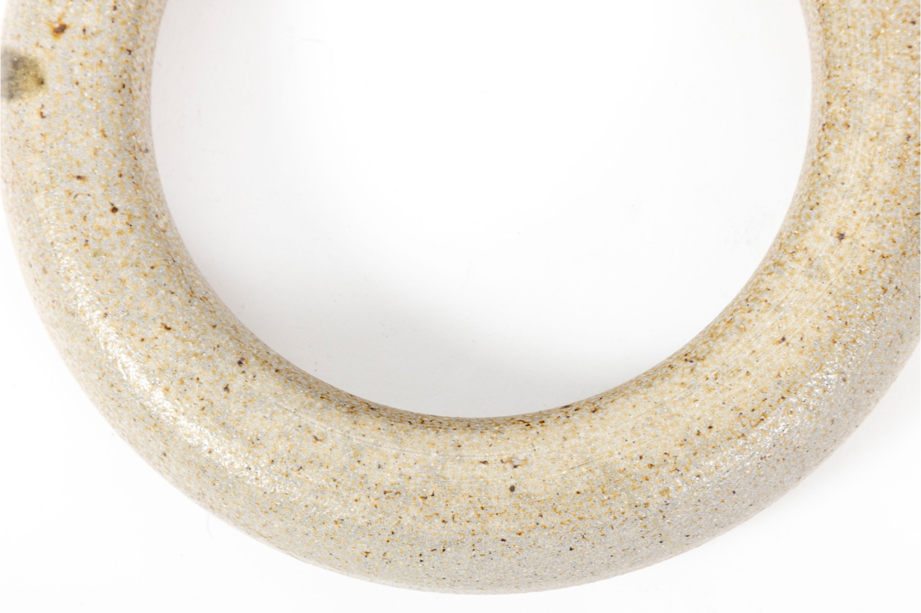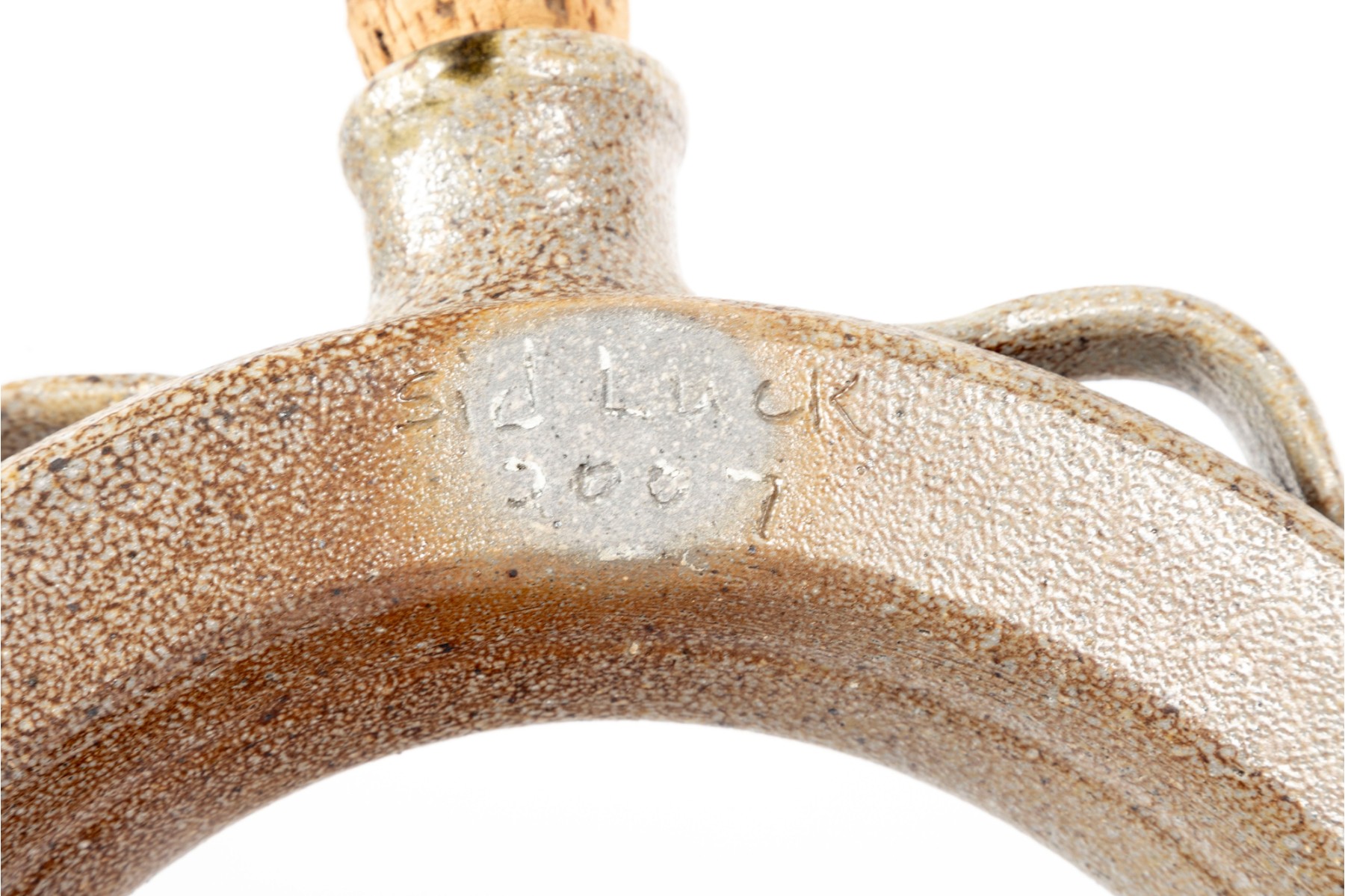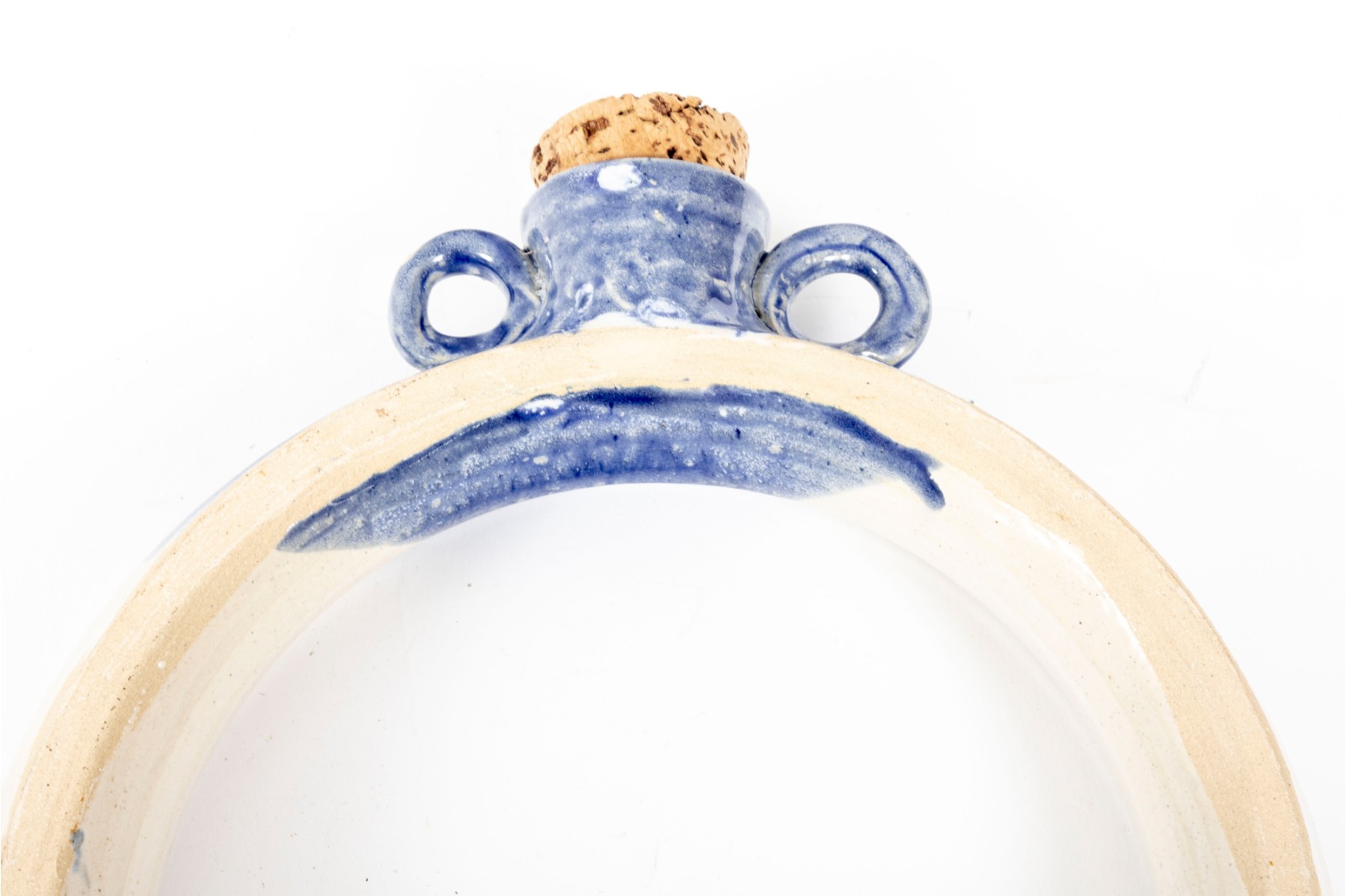 These 21st century flask pottery rings mimic the original 19th century versions meant to hold water for farmers working in fields far from a stream. Crafted from fine earthernware, this examples are both signed and corked with the original stoppers. One example is attributed to Sid Luck, dated 2007.