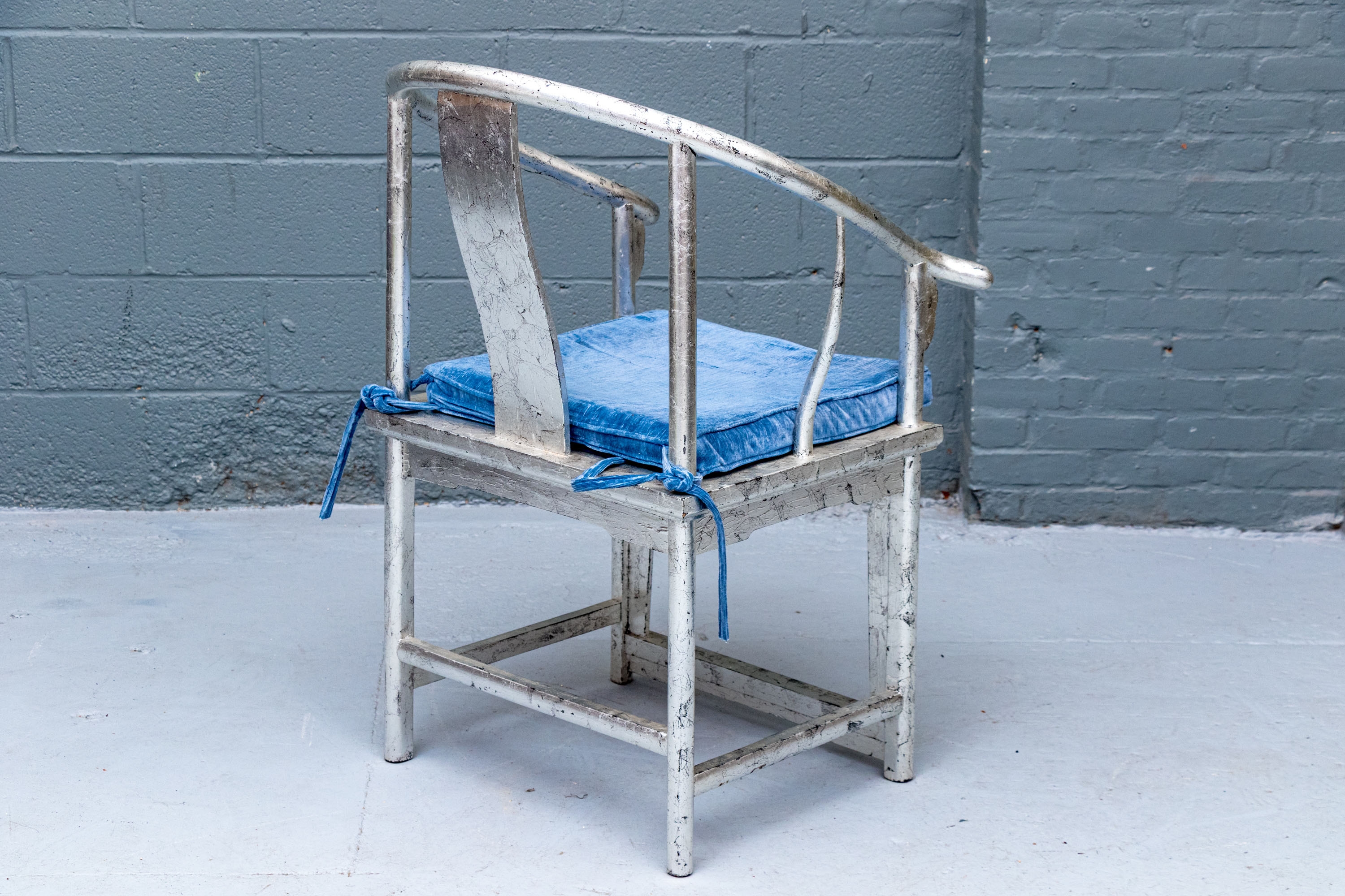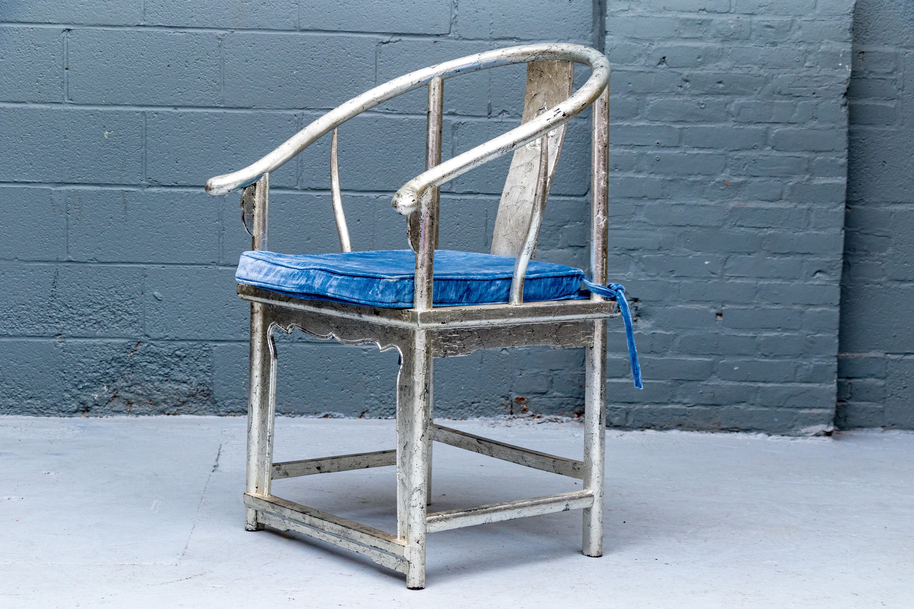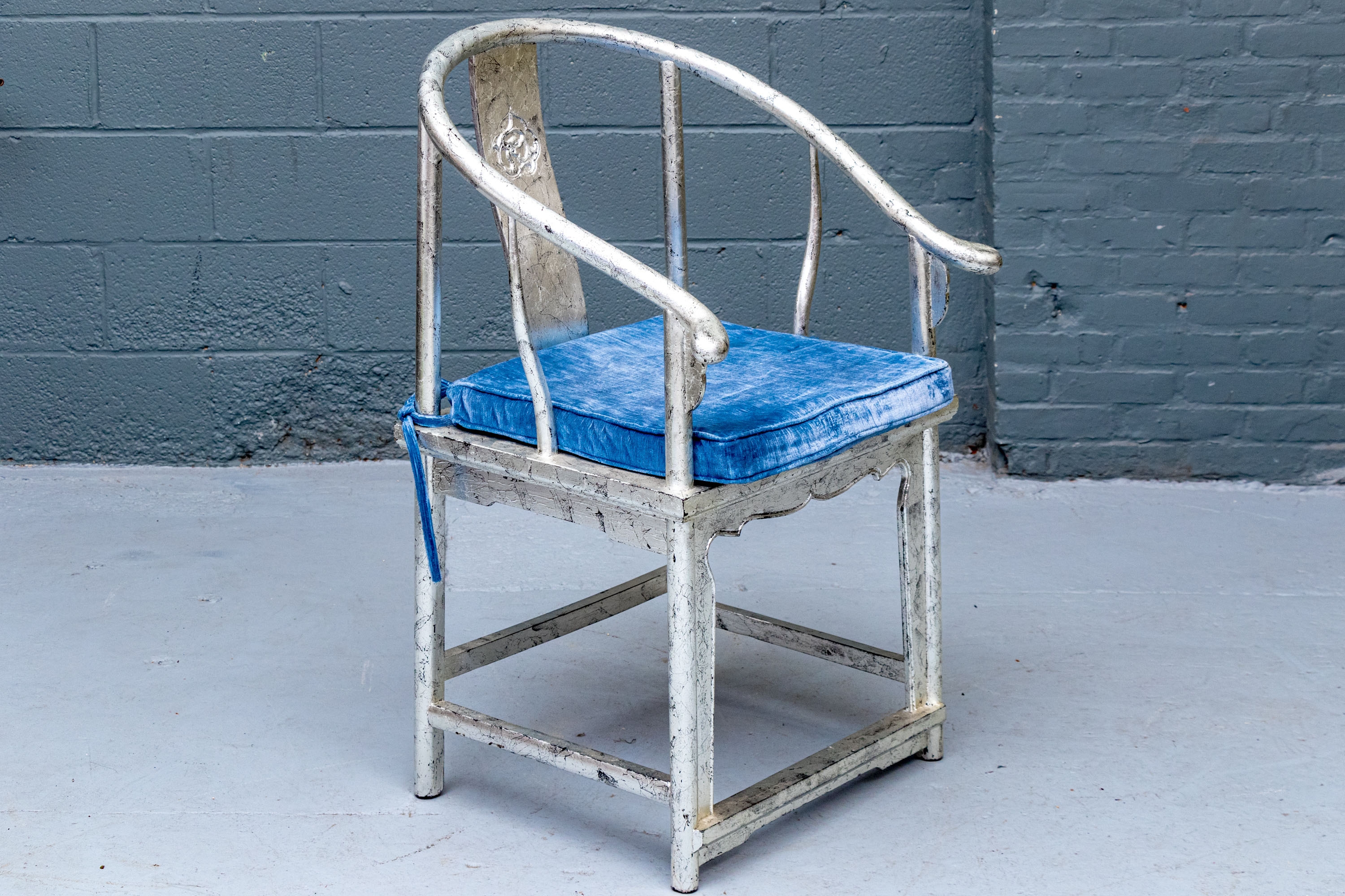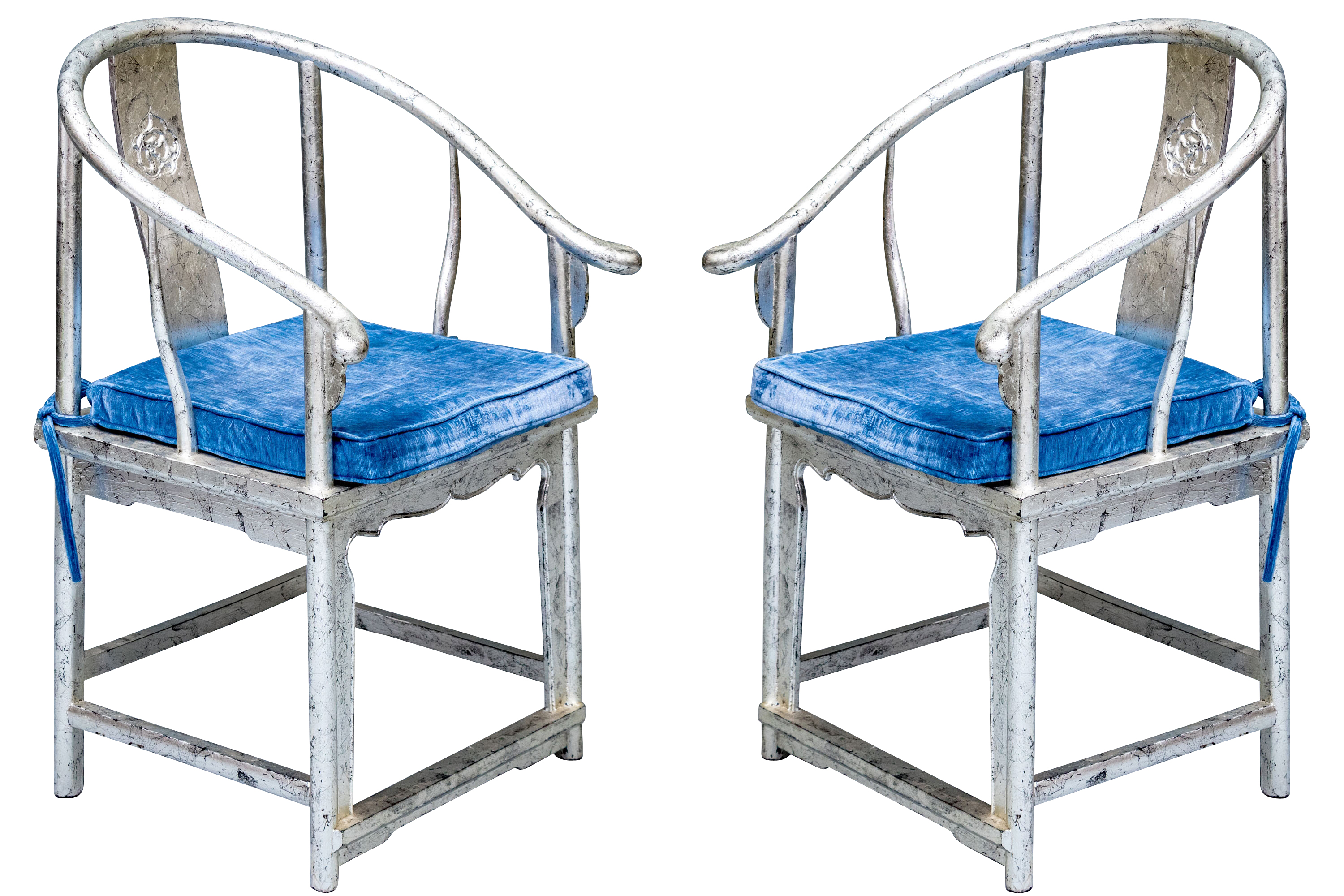 Pair of Chinese round back horseshoe armchairs with carved center back splat, the base with a box form stretcher and in a silver gilt finish. The chairs are accompanied by blue fine wale corduroy covered seat cushions with ties.