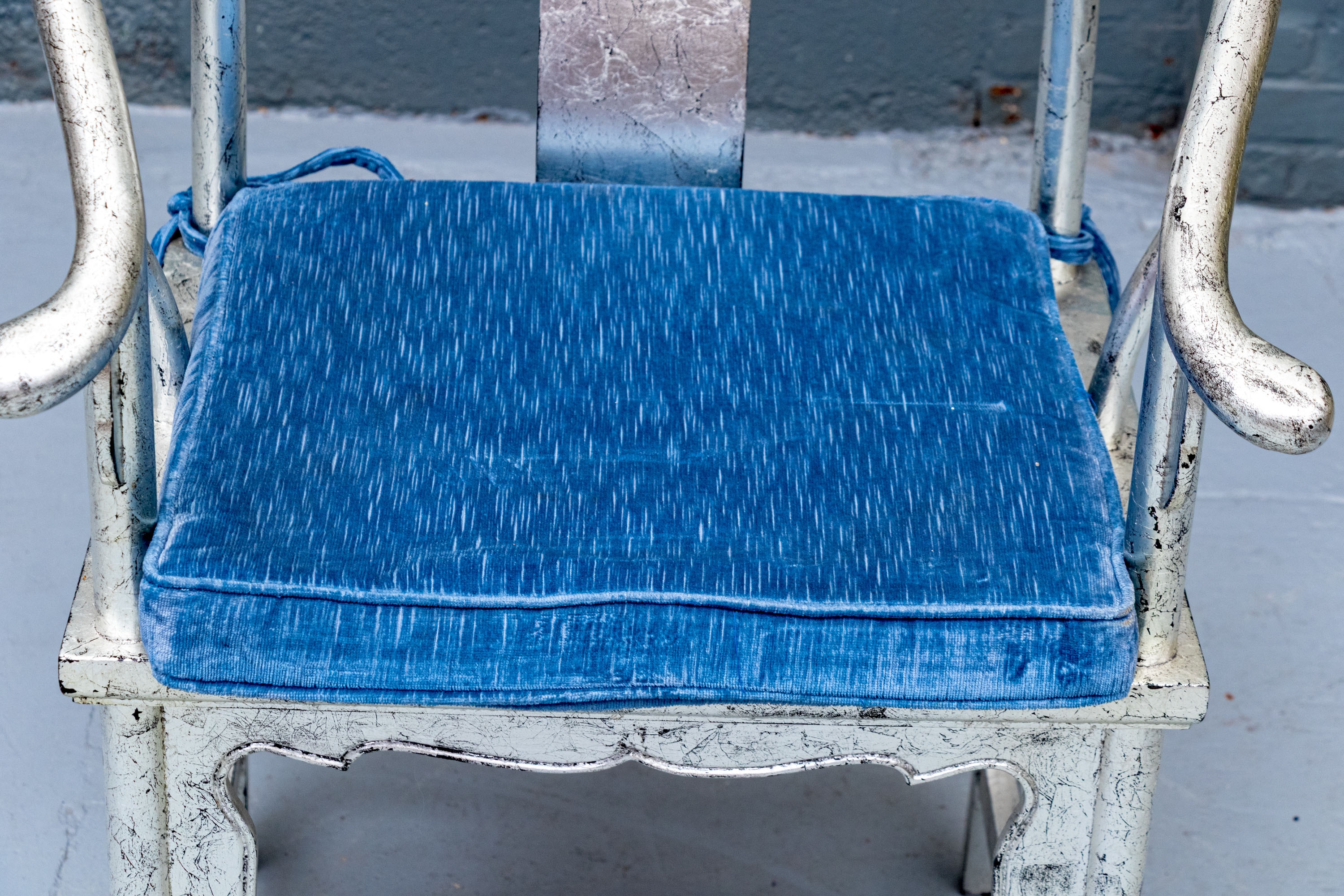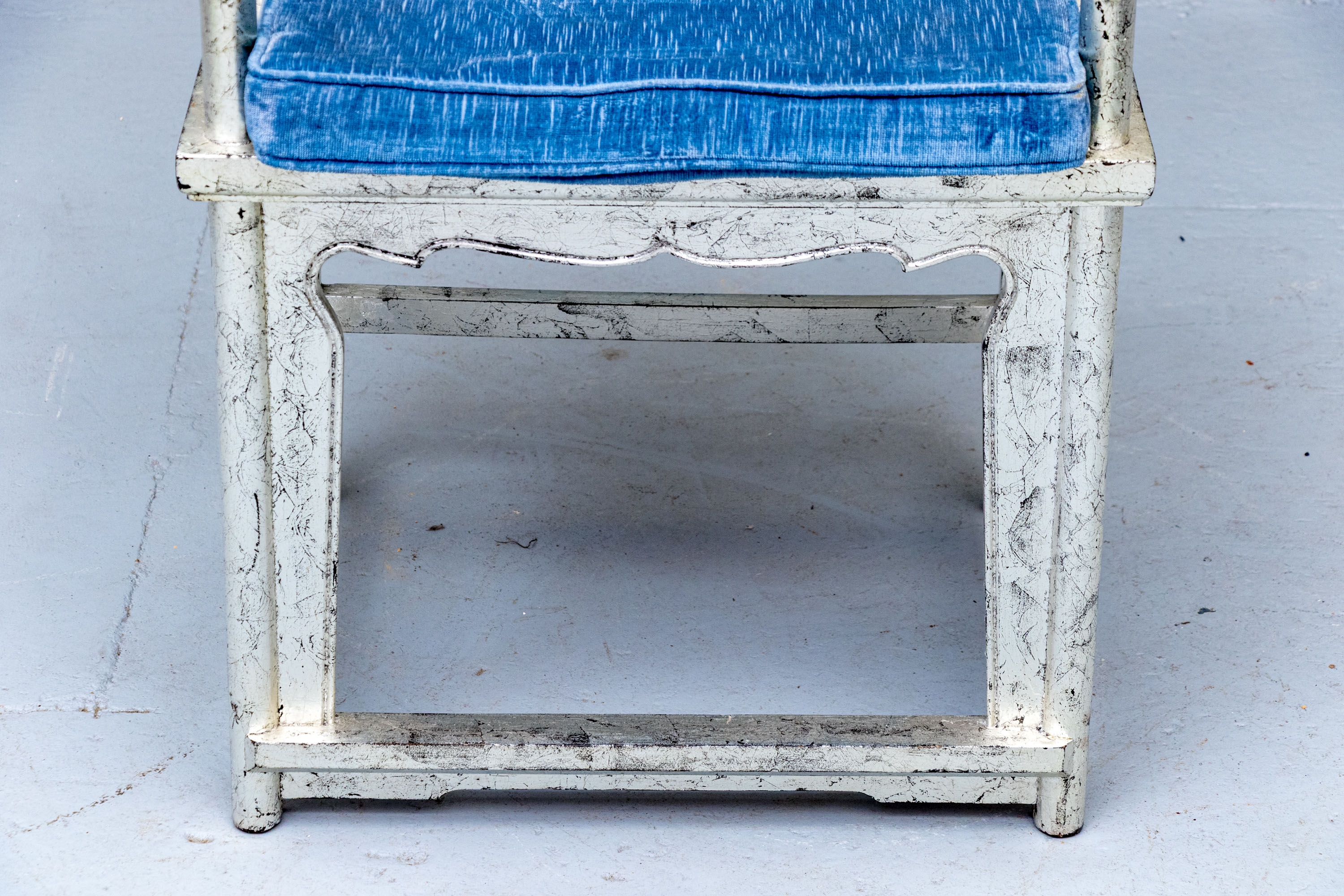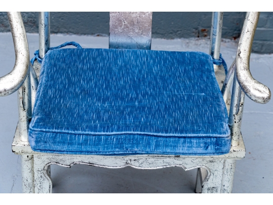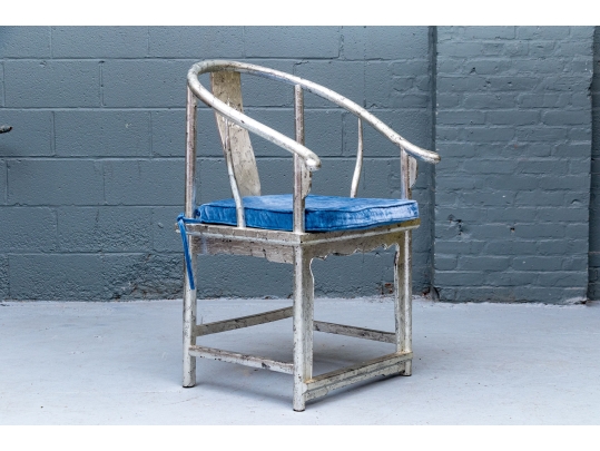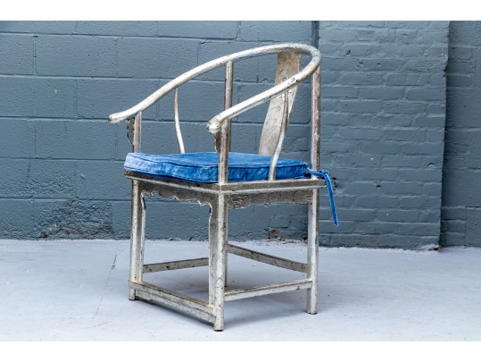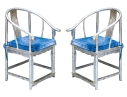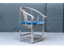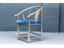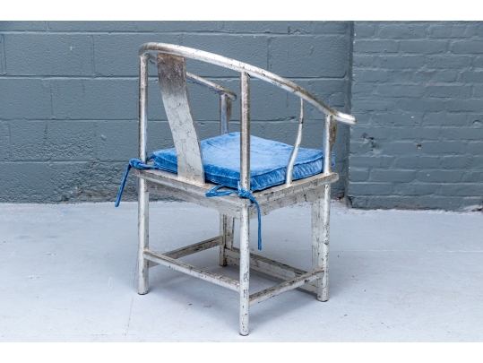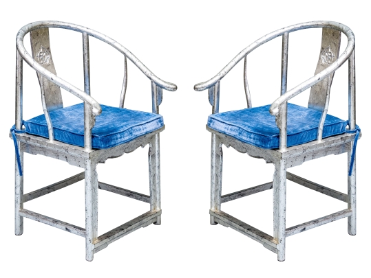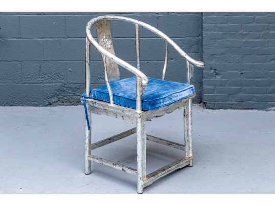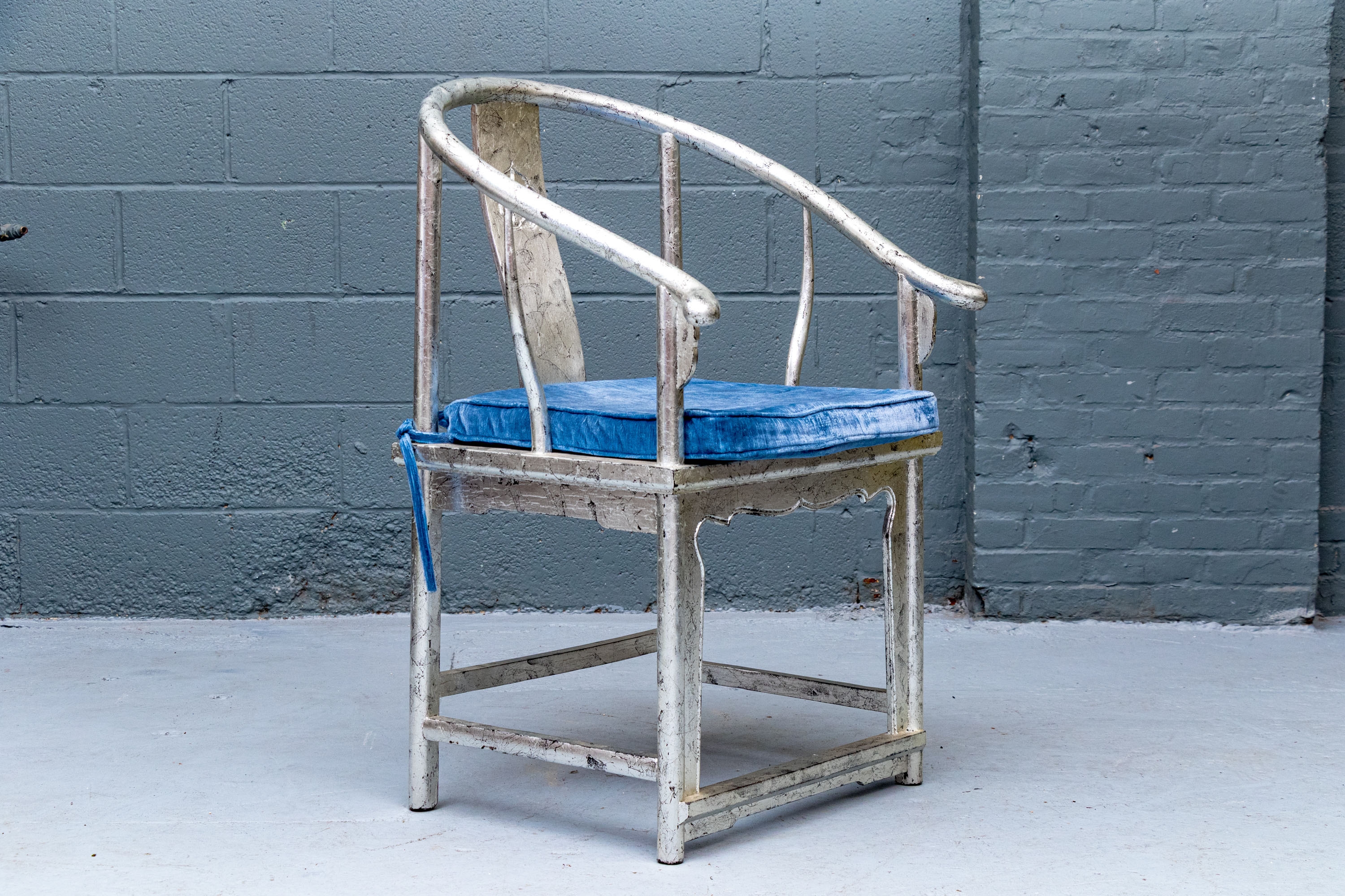 Pair of Chinese round back horseshoe armchairs with carved center back splat, the base with a box form stretcher and in a silver gilt finish. The chairs are accompanied by blue fine wale corduroy covered seat cushions with ties.
