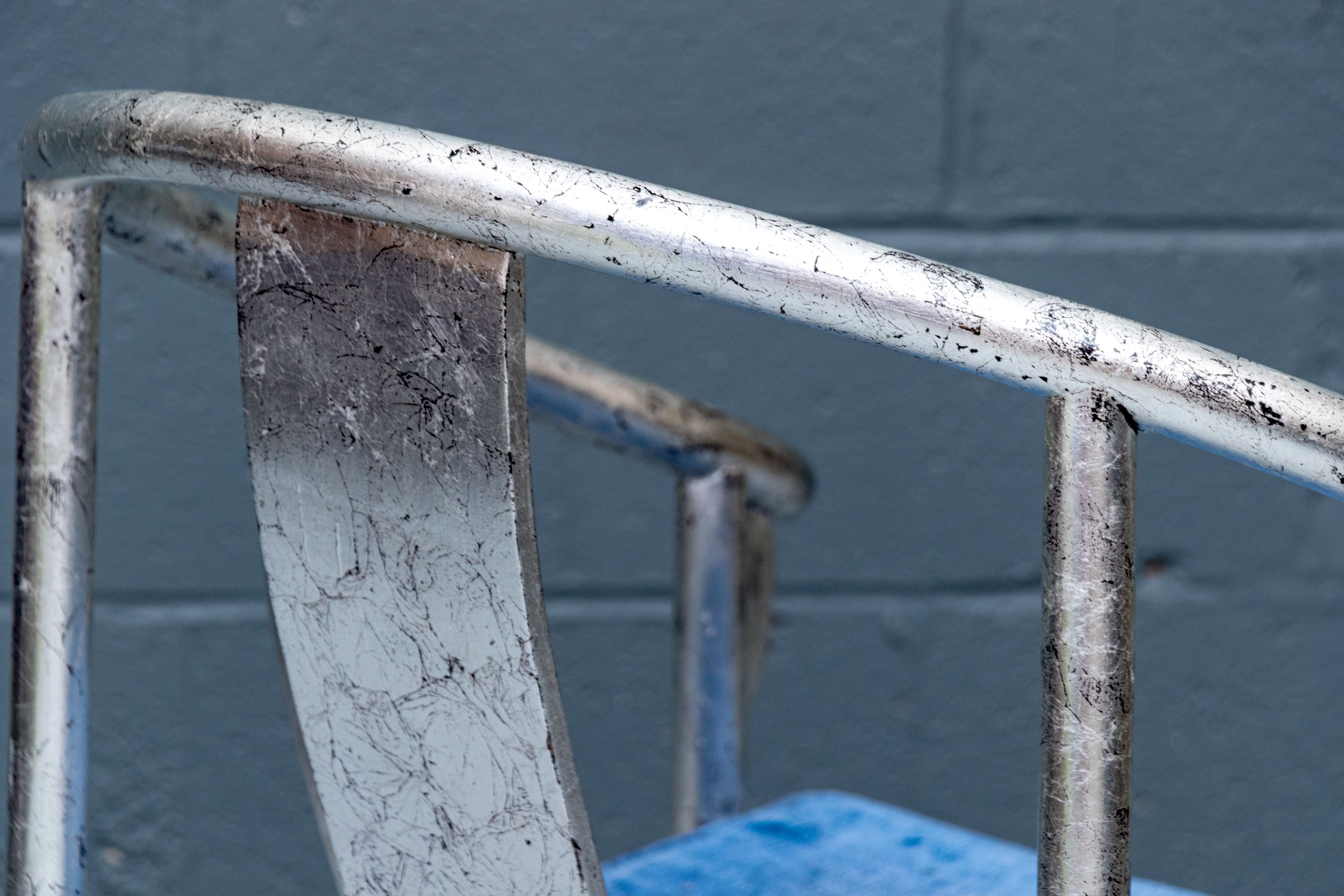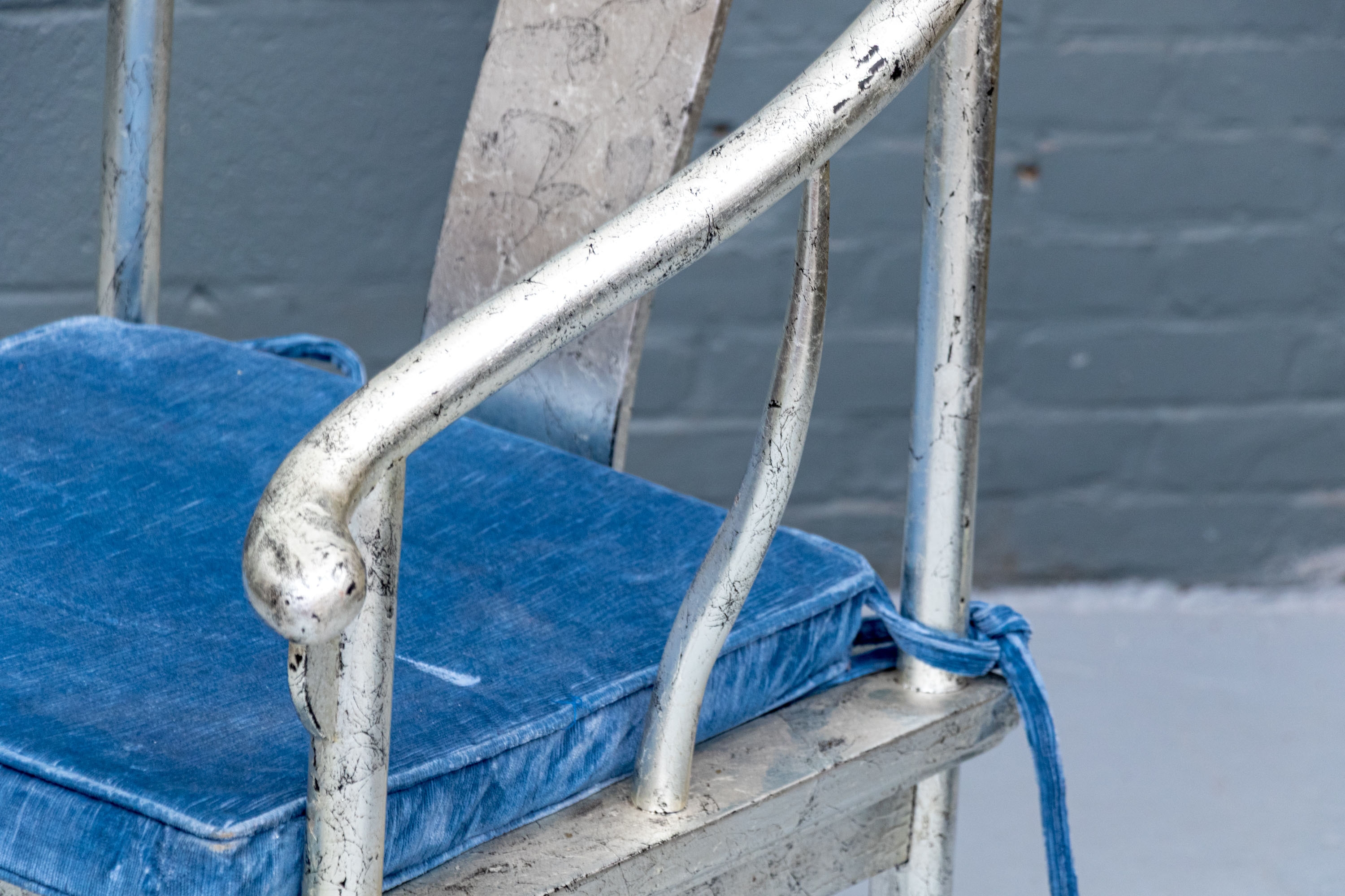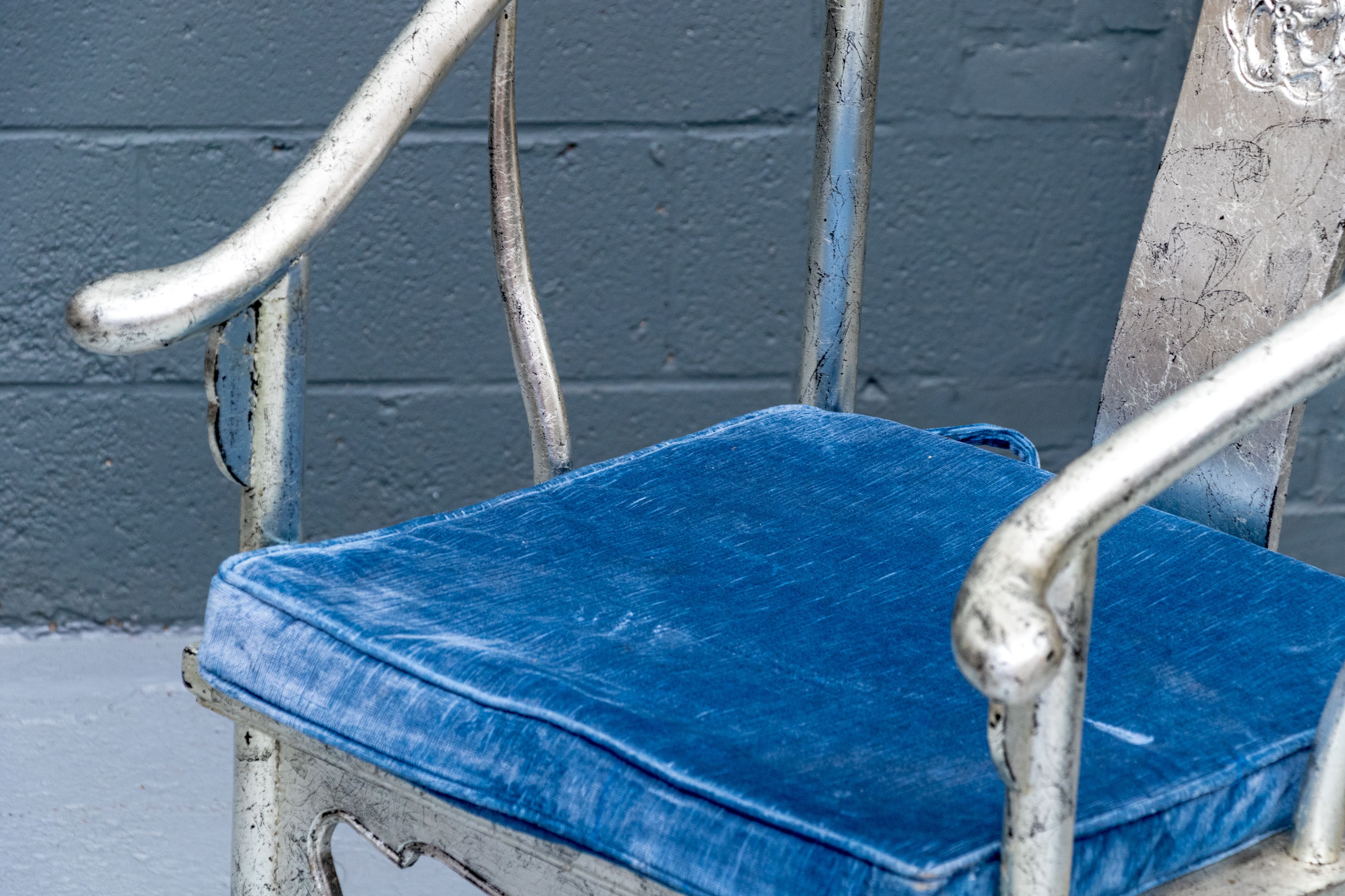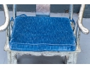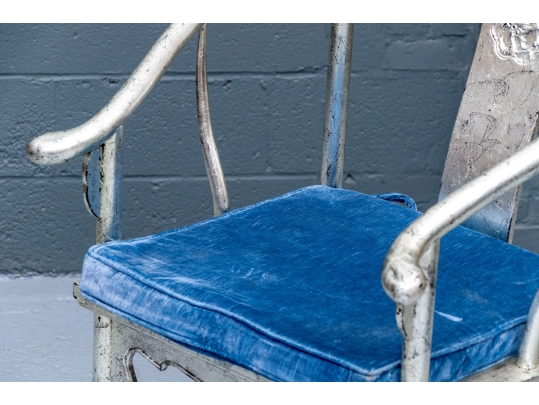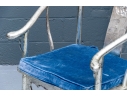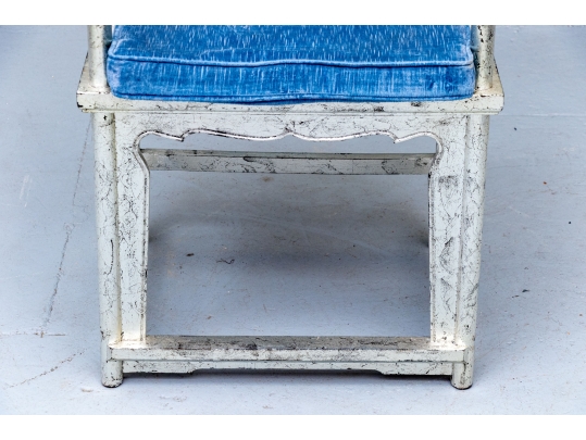 Pair of Chinese round back horseshoe armchairs with carved center back splat, the base with a box form stretcher and in a silver gilt finish. The chairs are accompanied by blue fine wale corduroy covered seat cushions with ties.